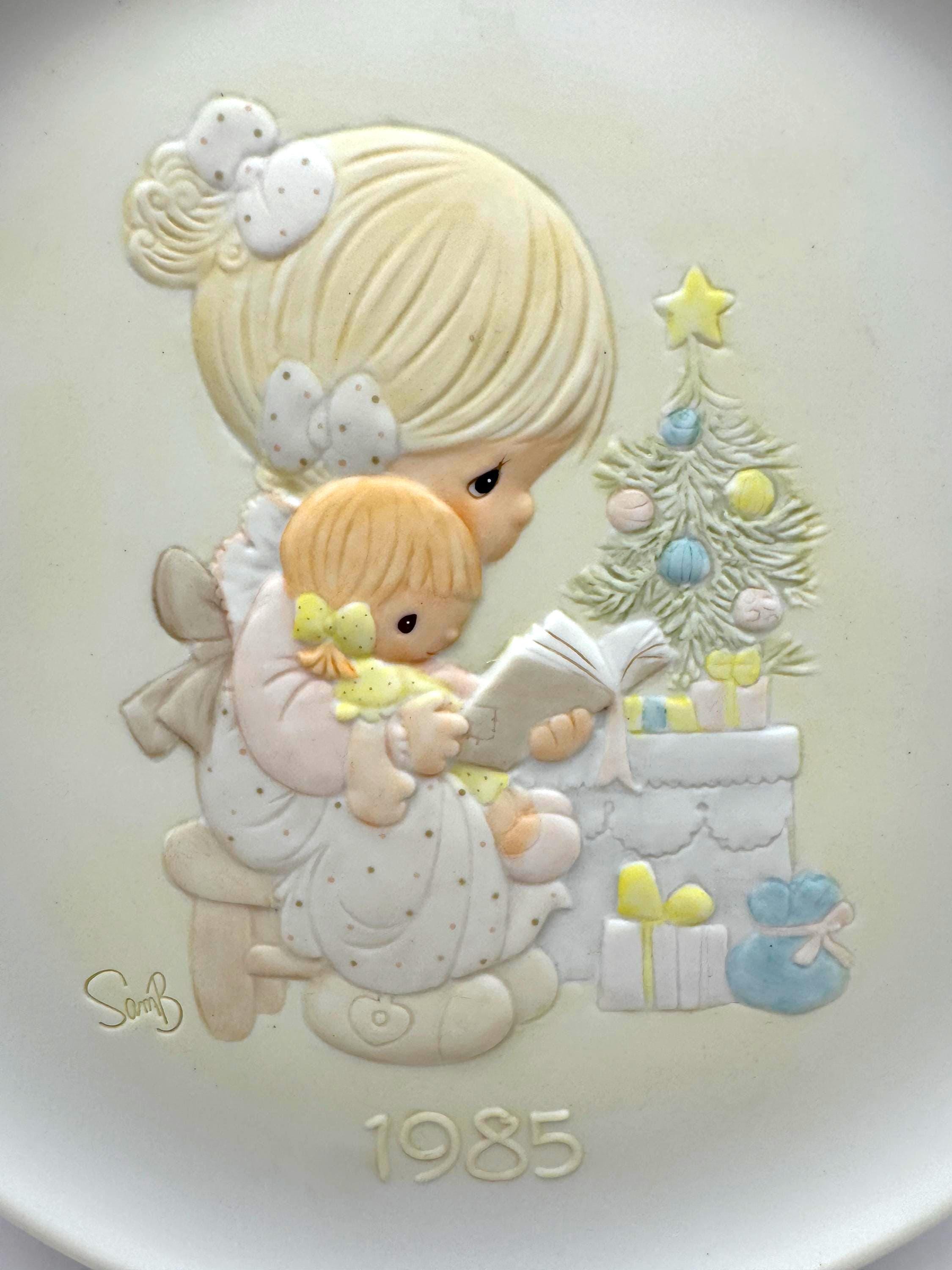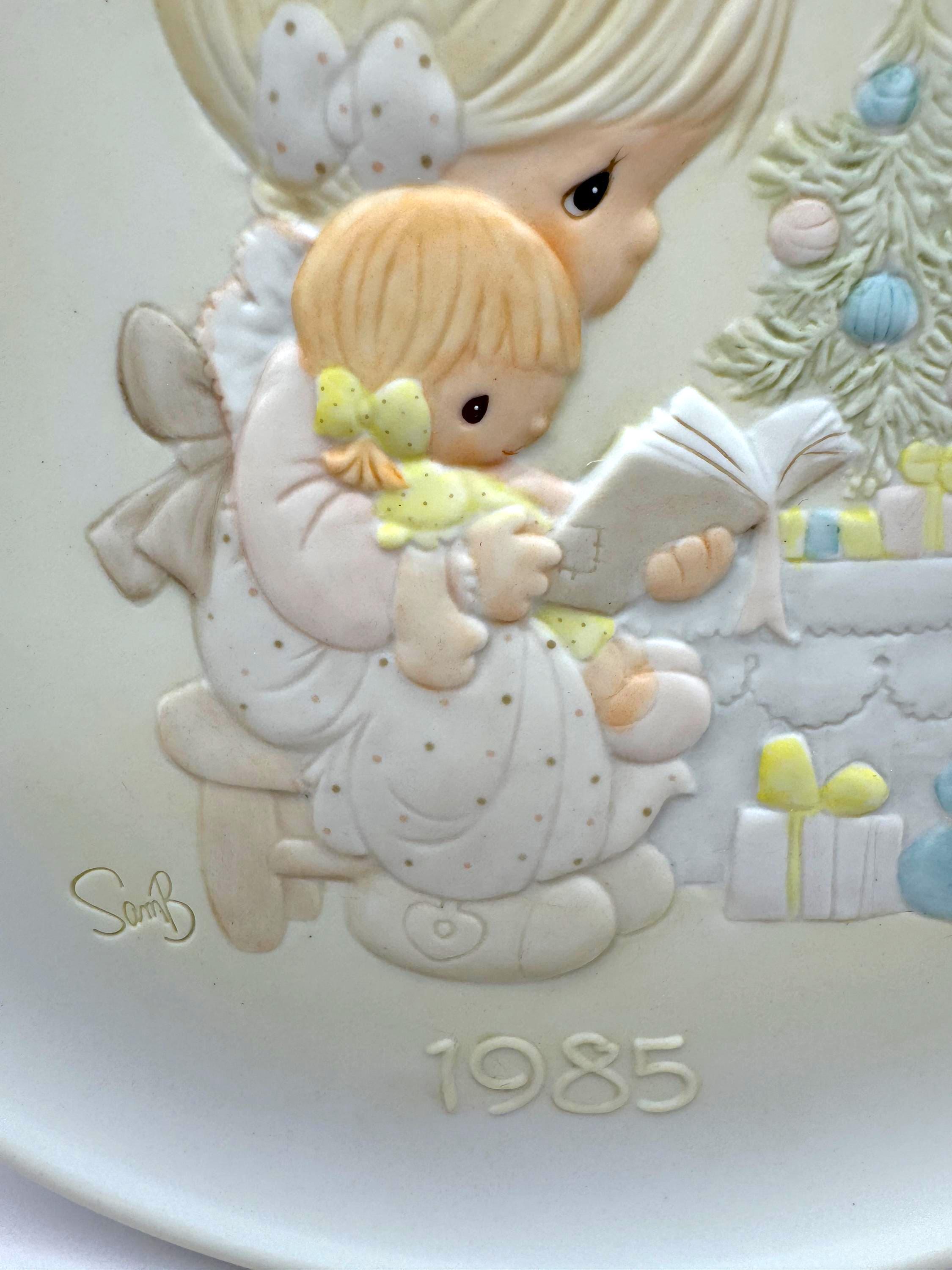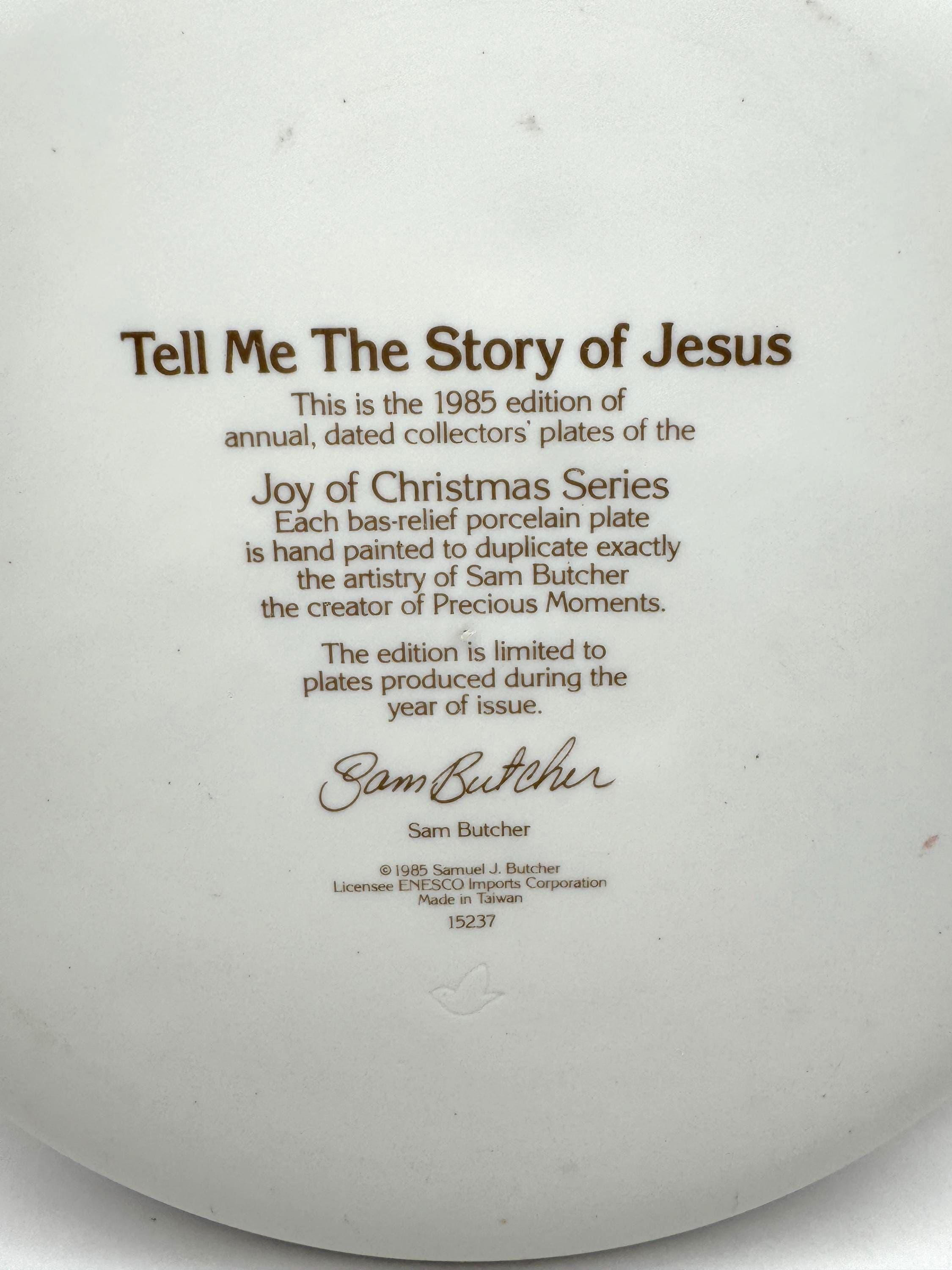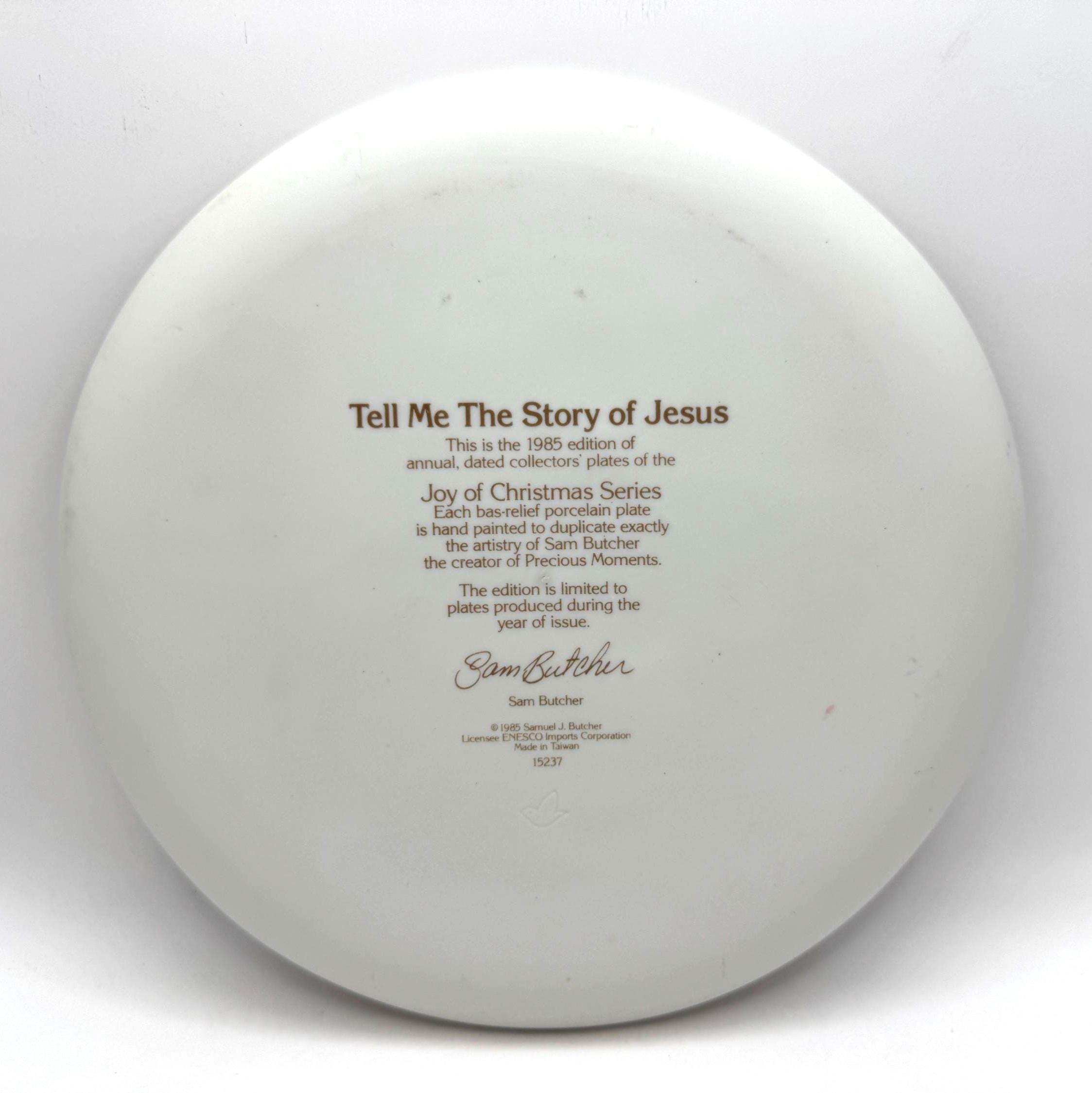 Celebrate the true meaning of Christmas with this 1985 Precious Moments collector plate, "Tell Me the Story of Jesus." Designed by Sam Butcher, this bas-relief porcelain plate captures a tender scene of reading besides a small Christmas tree.