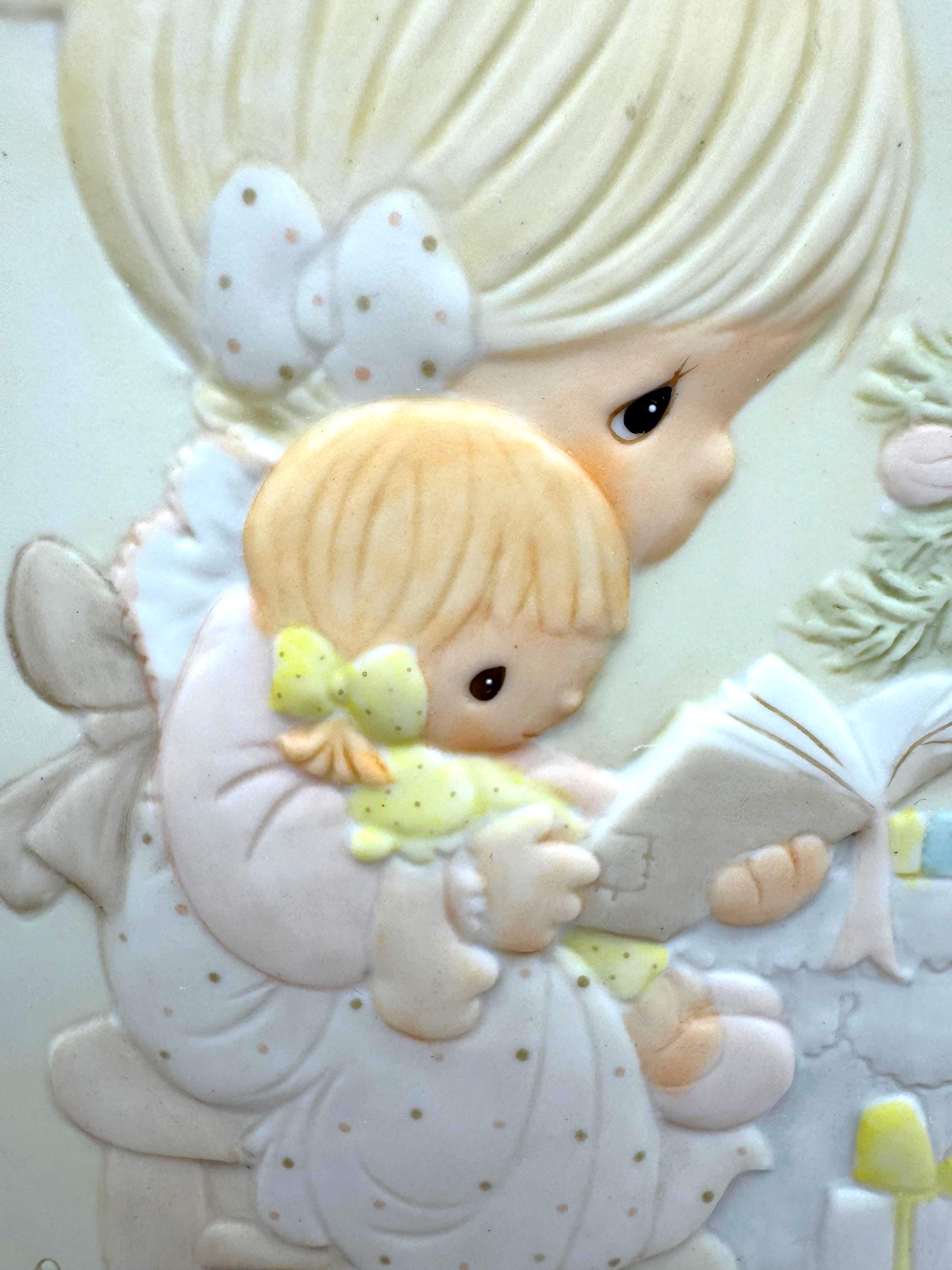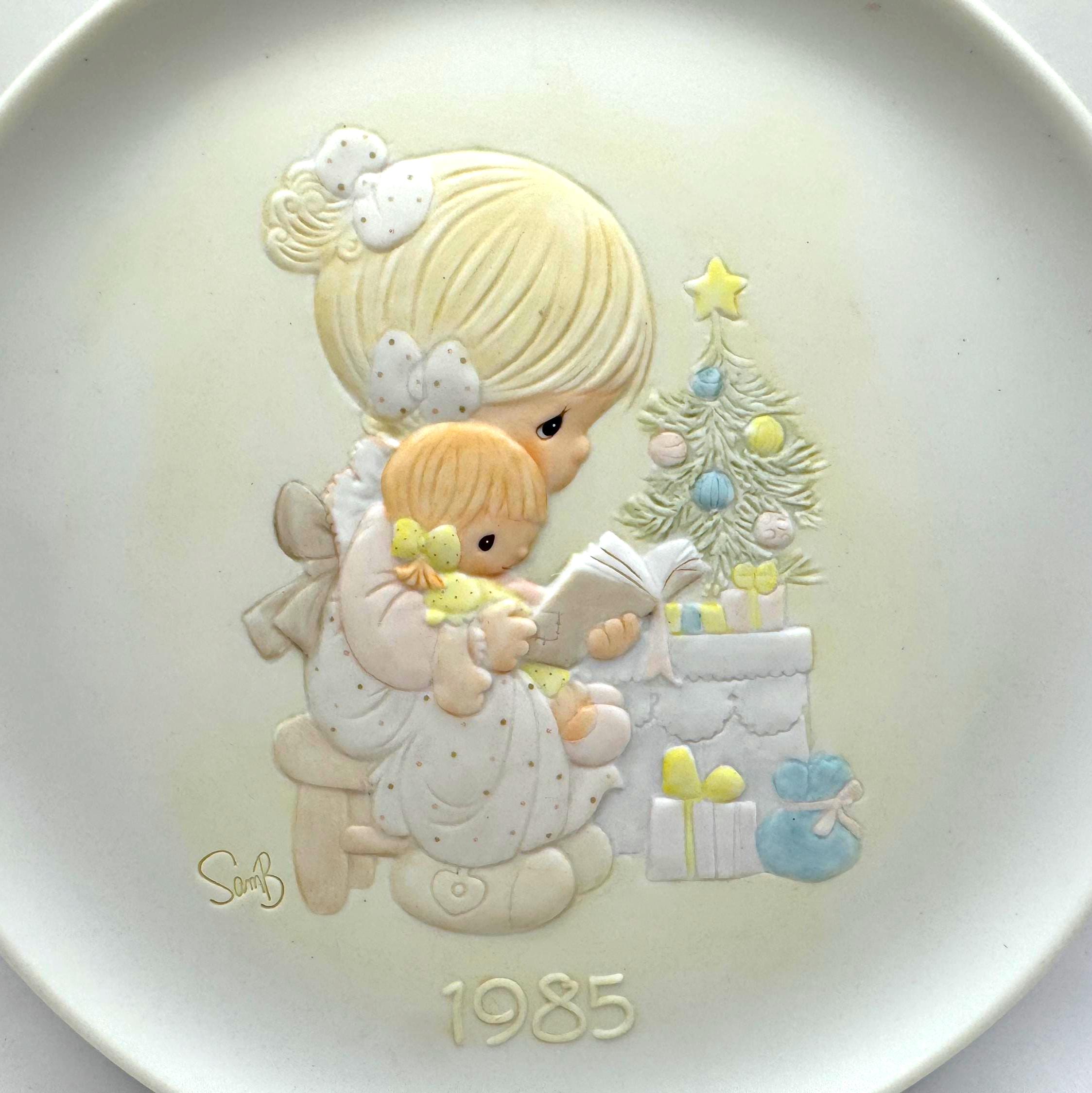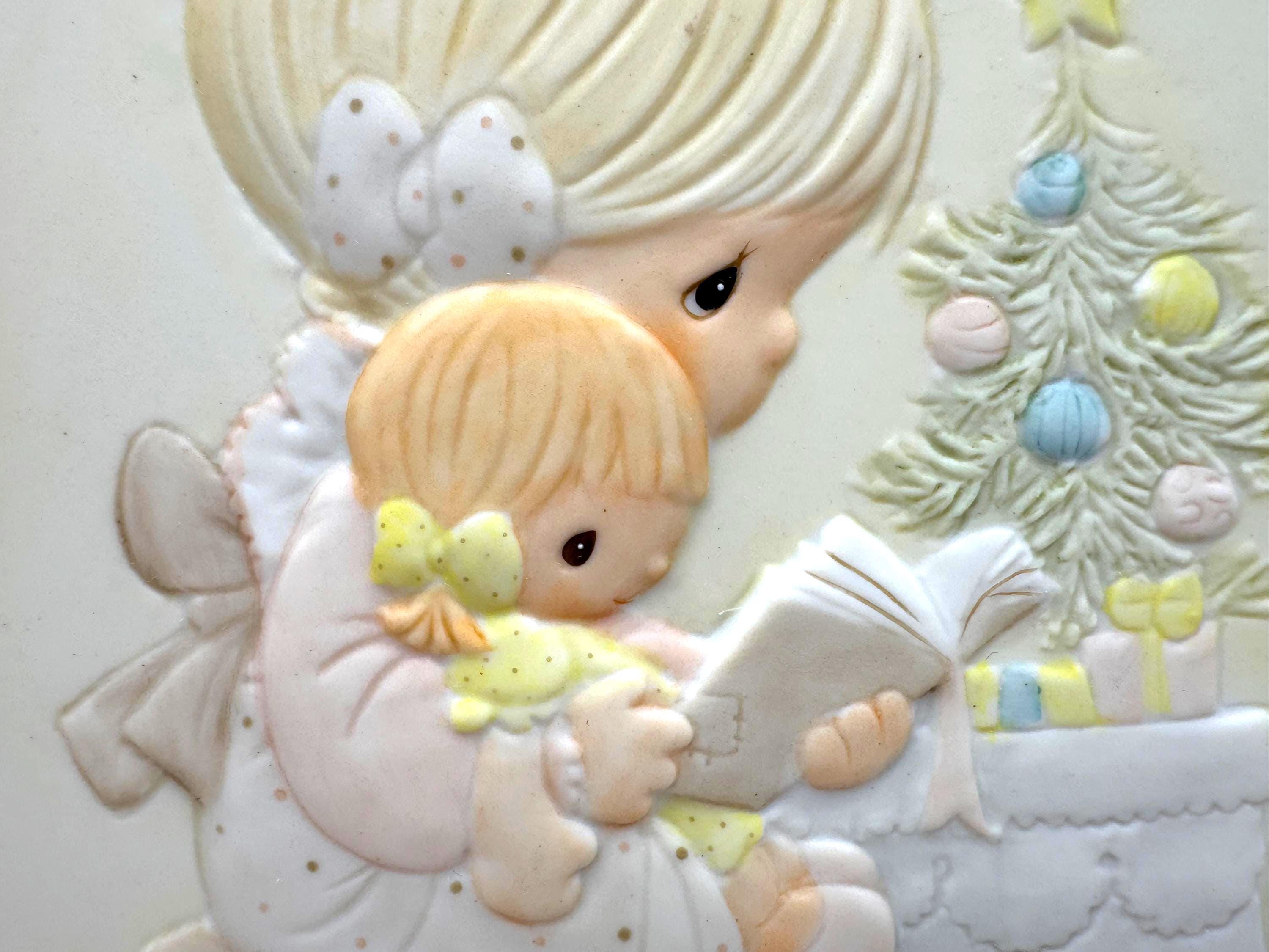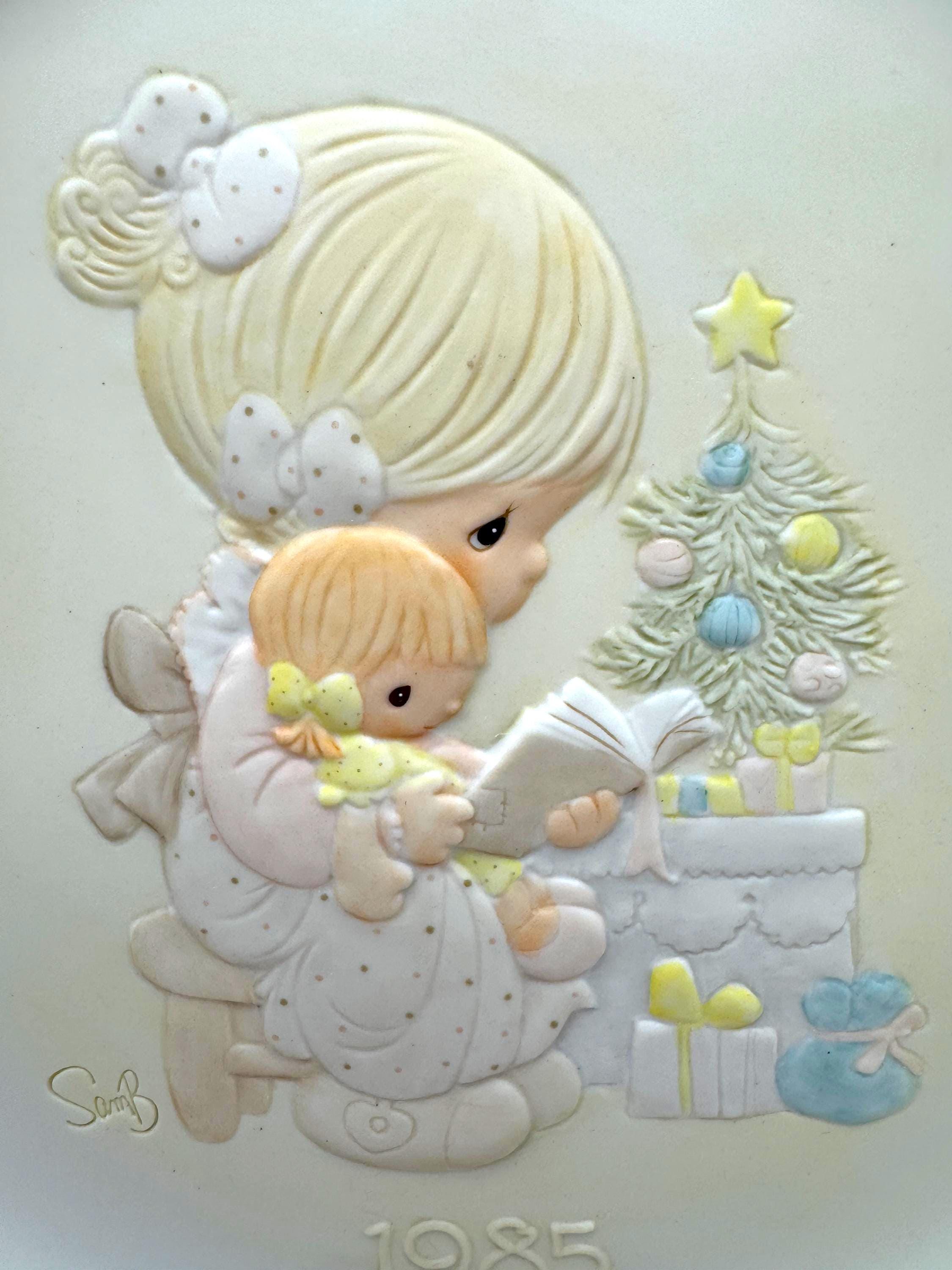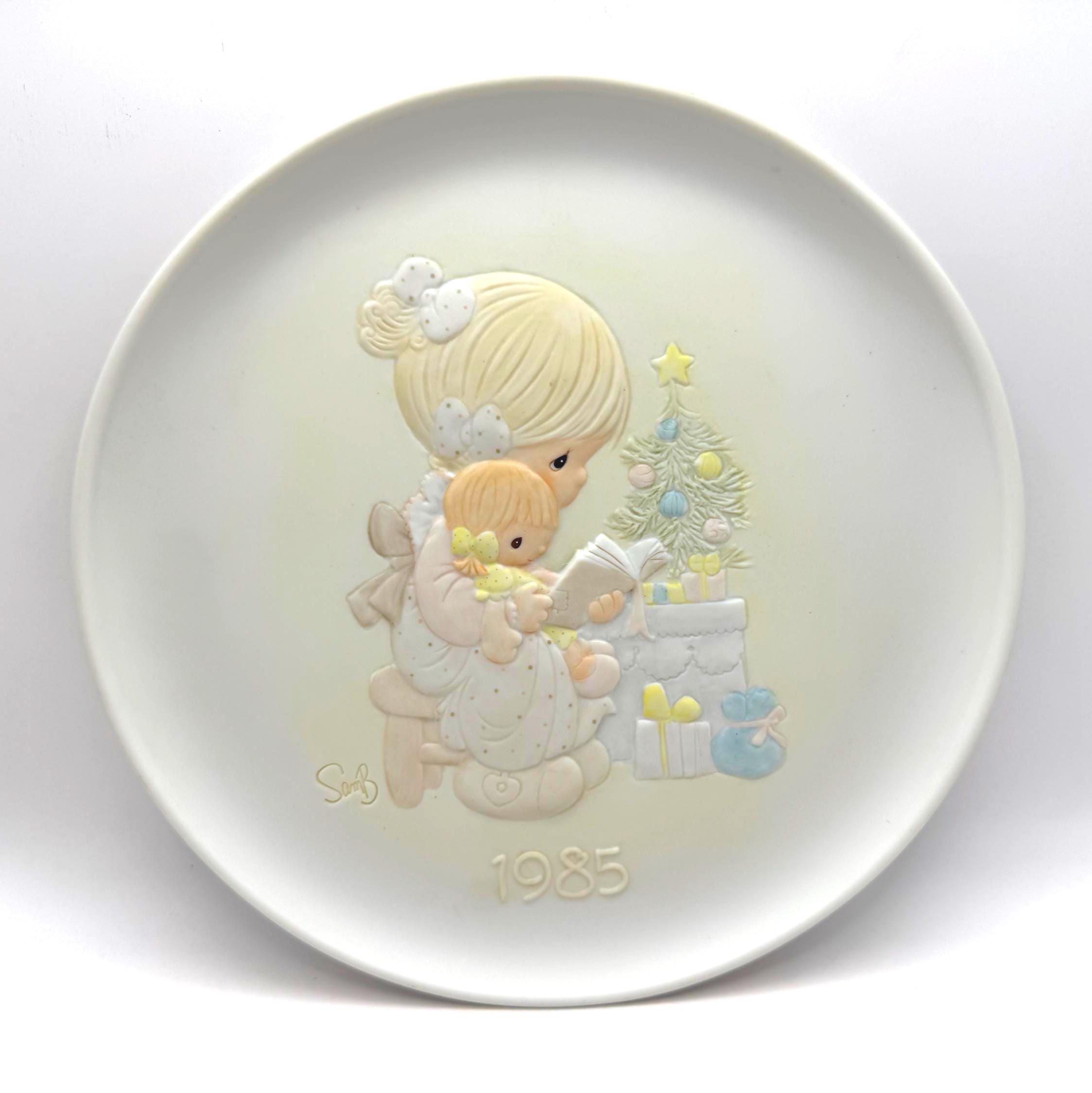 Celebrate the true meaning of Christmas with this 1985 Precious Moments collector plate, "Tell Me the Story of Jesus." Designed by Sam Butcher, this bas-relief porcelain plate captures a tender scene of reading besides a small Christmas tree.