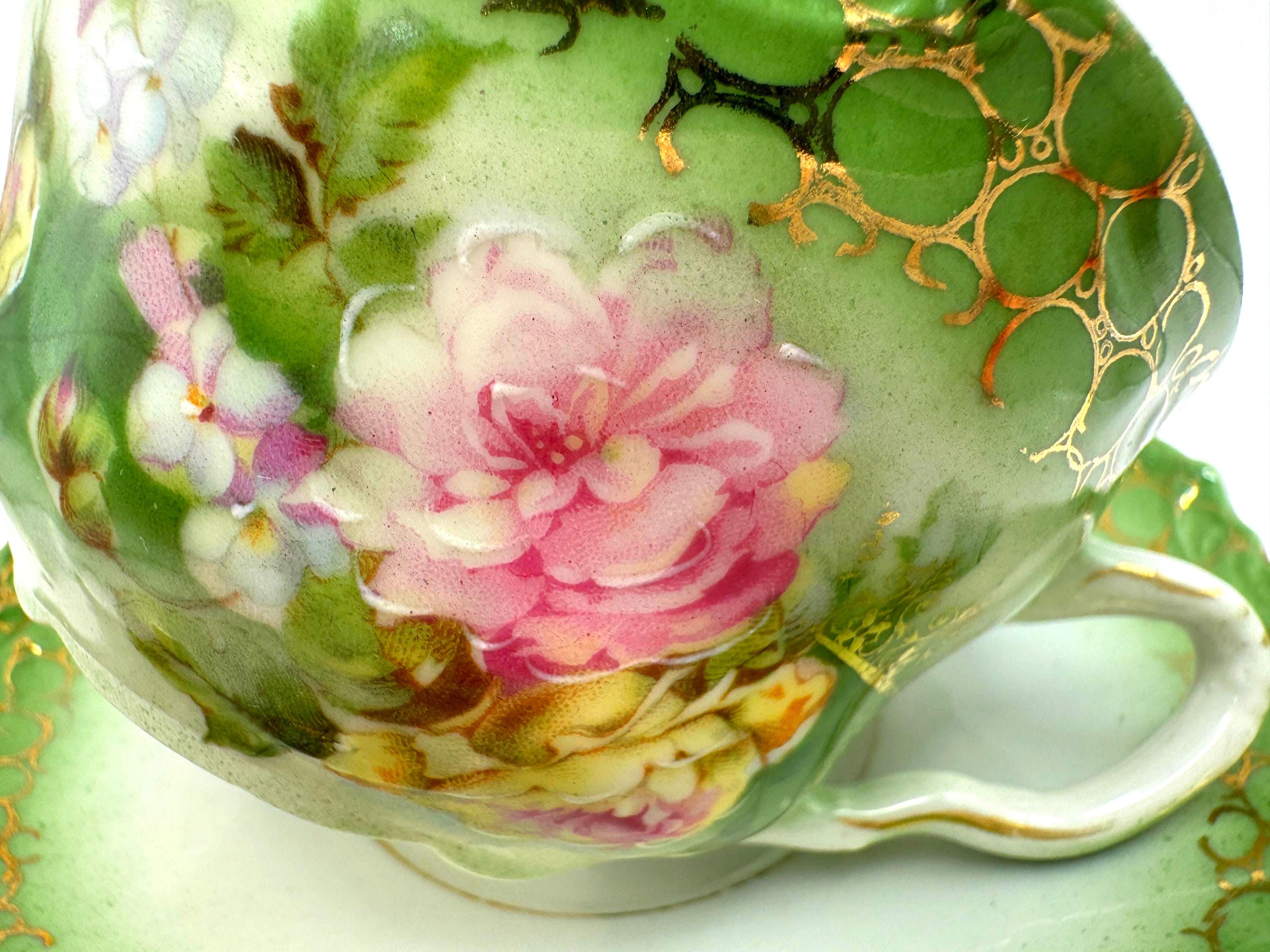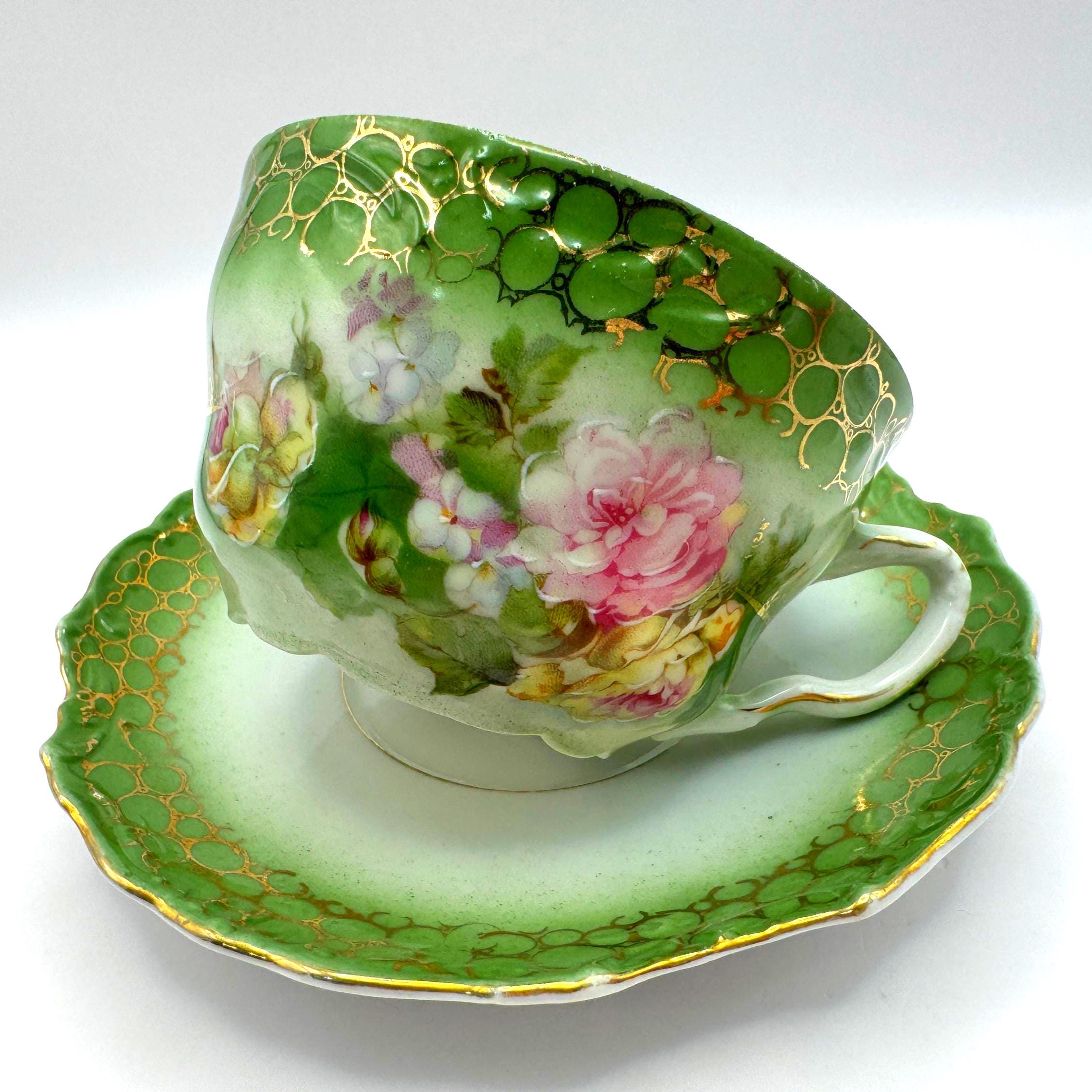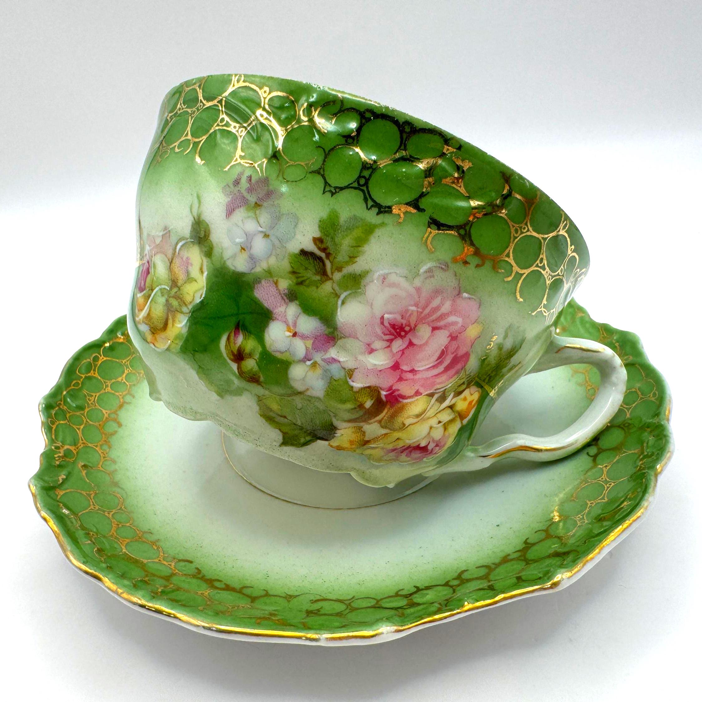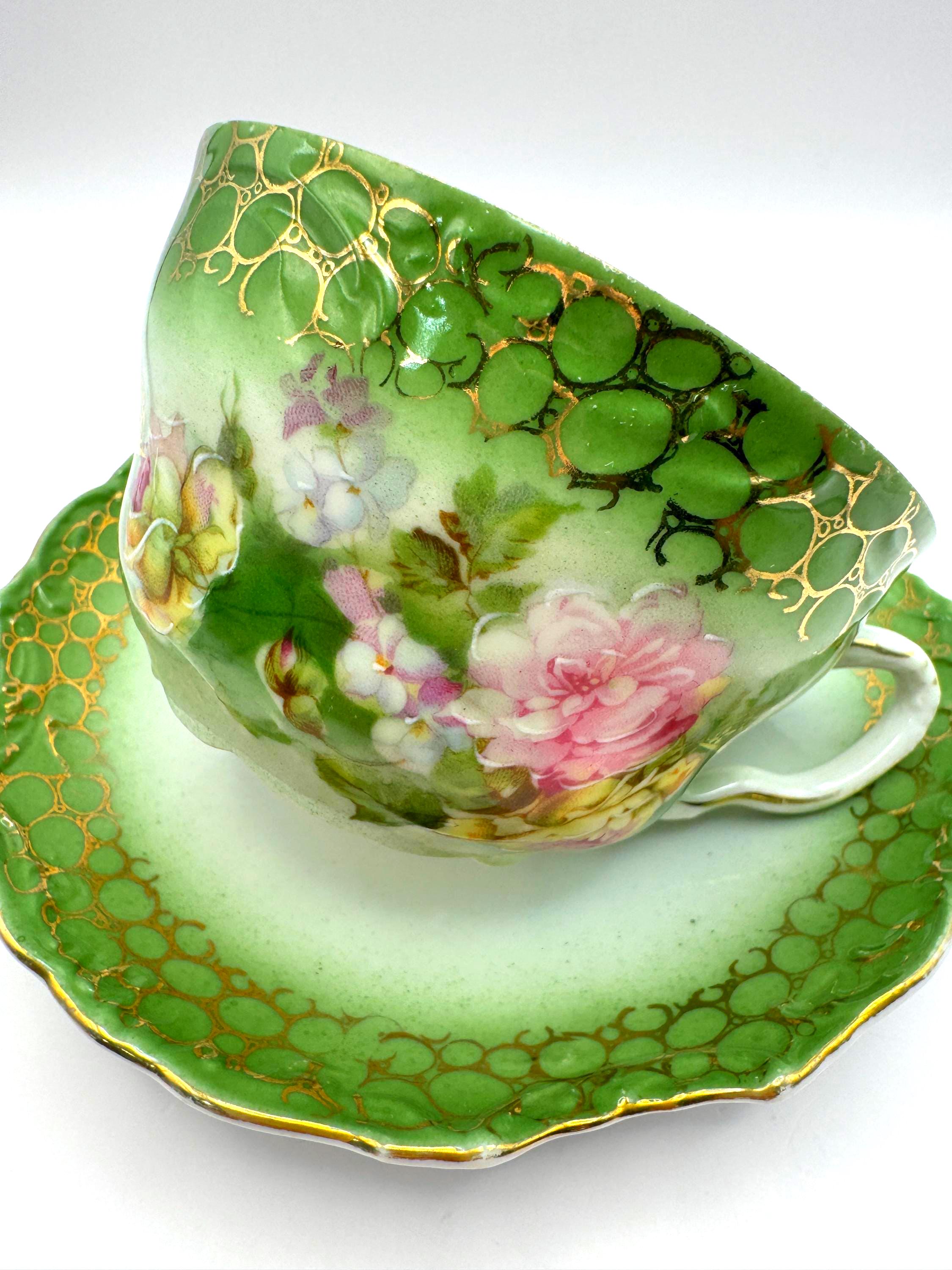 This stunning antique porcelain teacup and saucer features soft hand-painted roses against a shaded green ombre background with intricate gold scroll and bubble-chain detailing. A fine example of 1900s Austrian artistry, the piece reflects the graceful Art Nouveau style---romantic, fluid, and richly decorated.