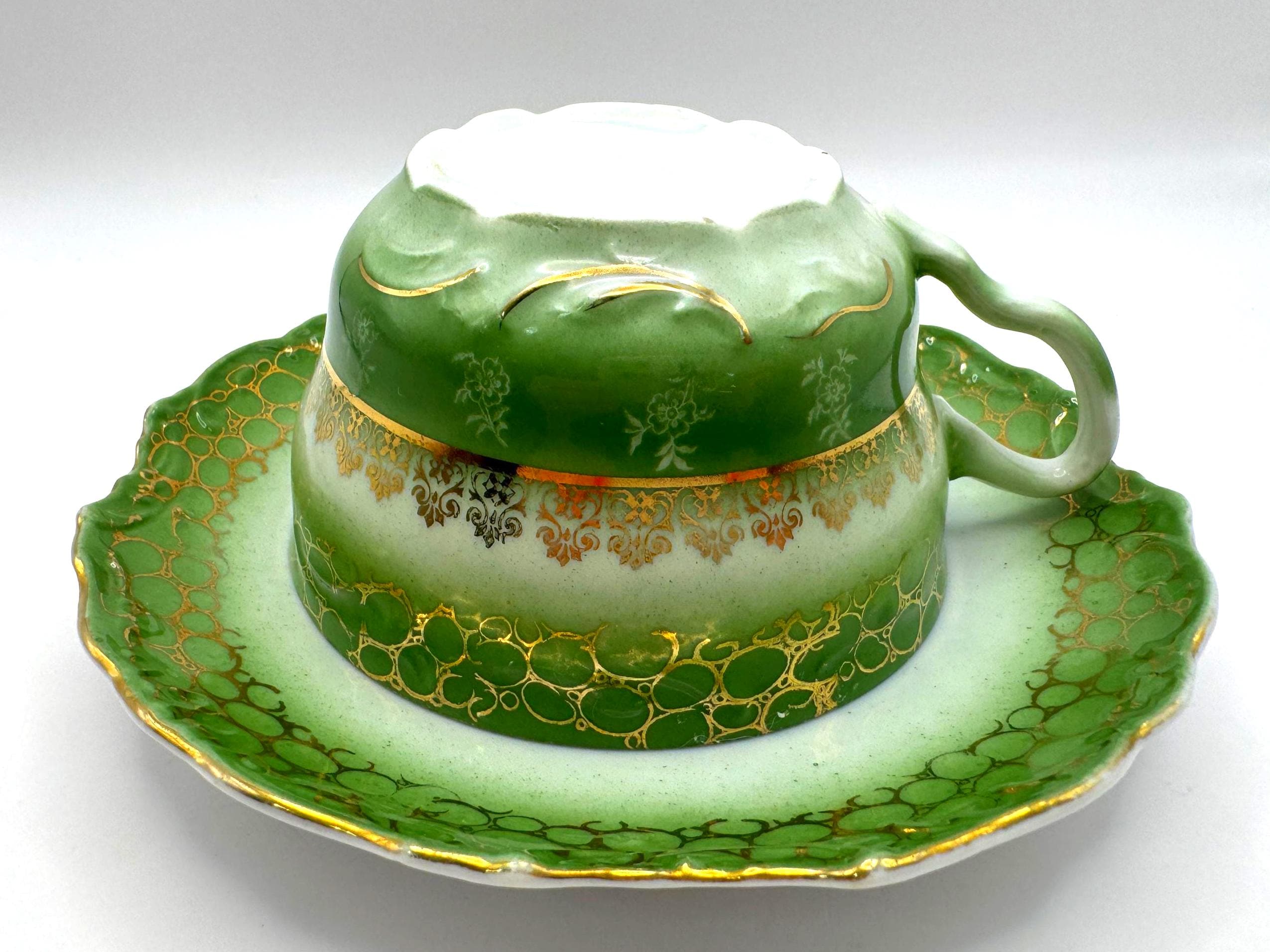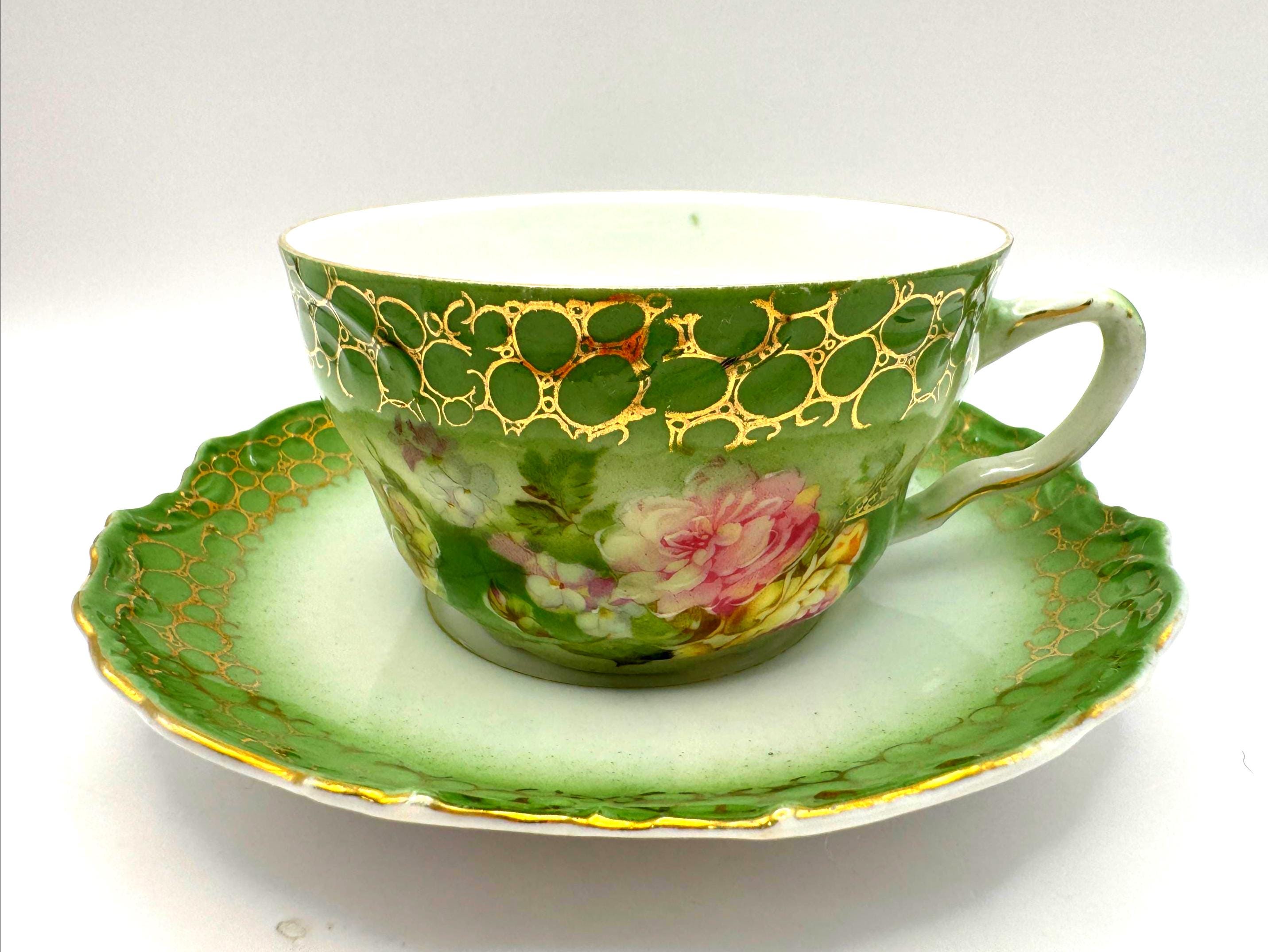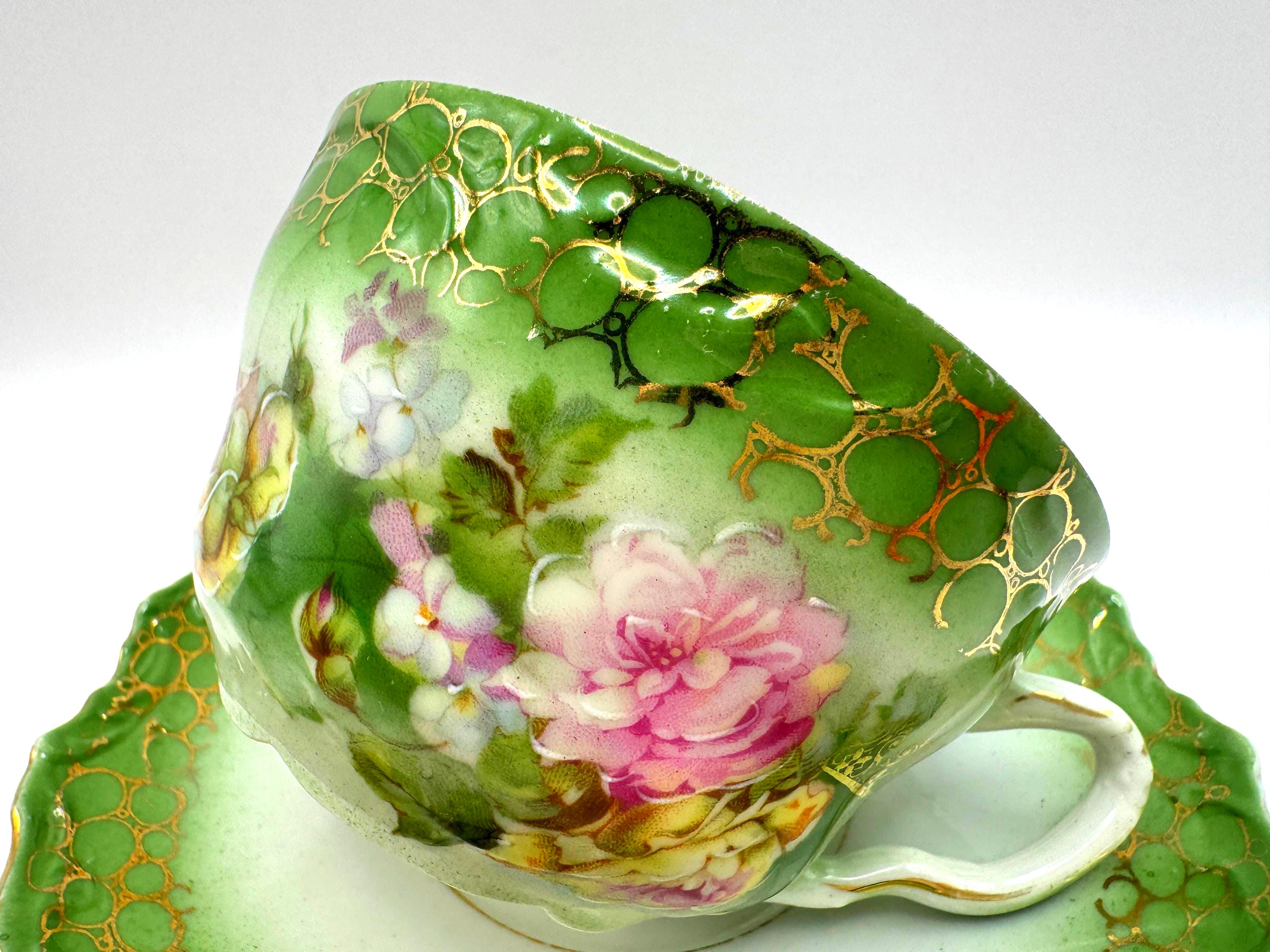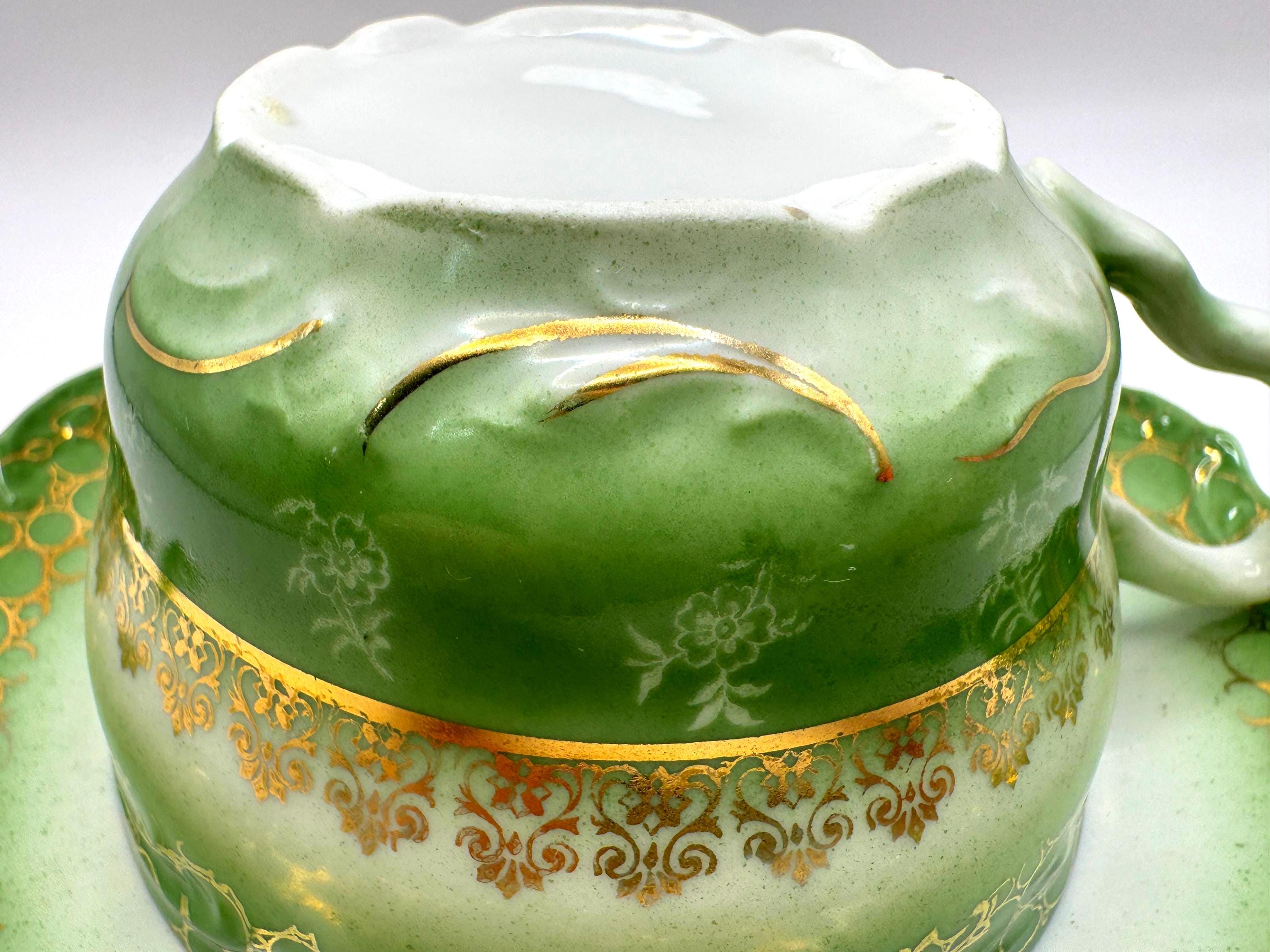 This stunning antique porcelain teacup and saucer features soft hand-painted roses against a shaded green ombre background with intricate gold scroll and bubble-chain detailing. A fine example of 1900s Austrian artistry, the piece reflects the graceful Art Nouveau style---romantic, fluid, and richly decorated.
