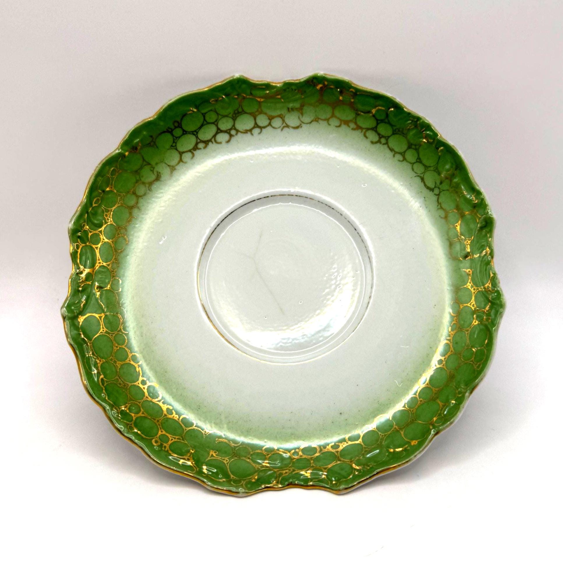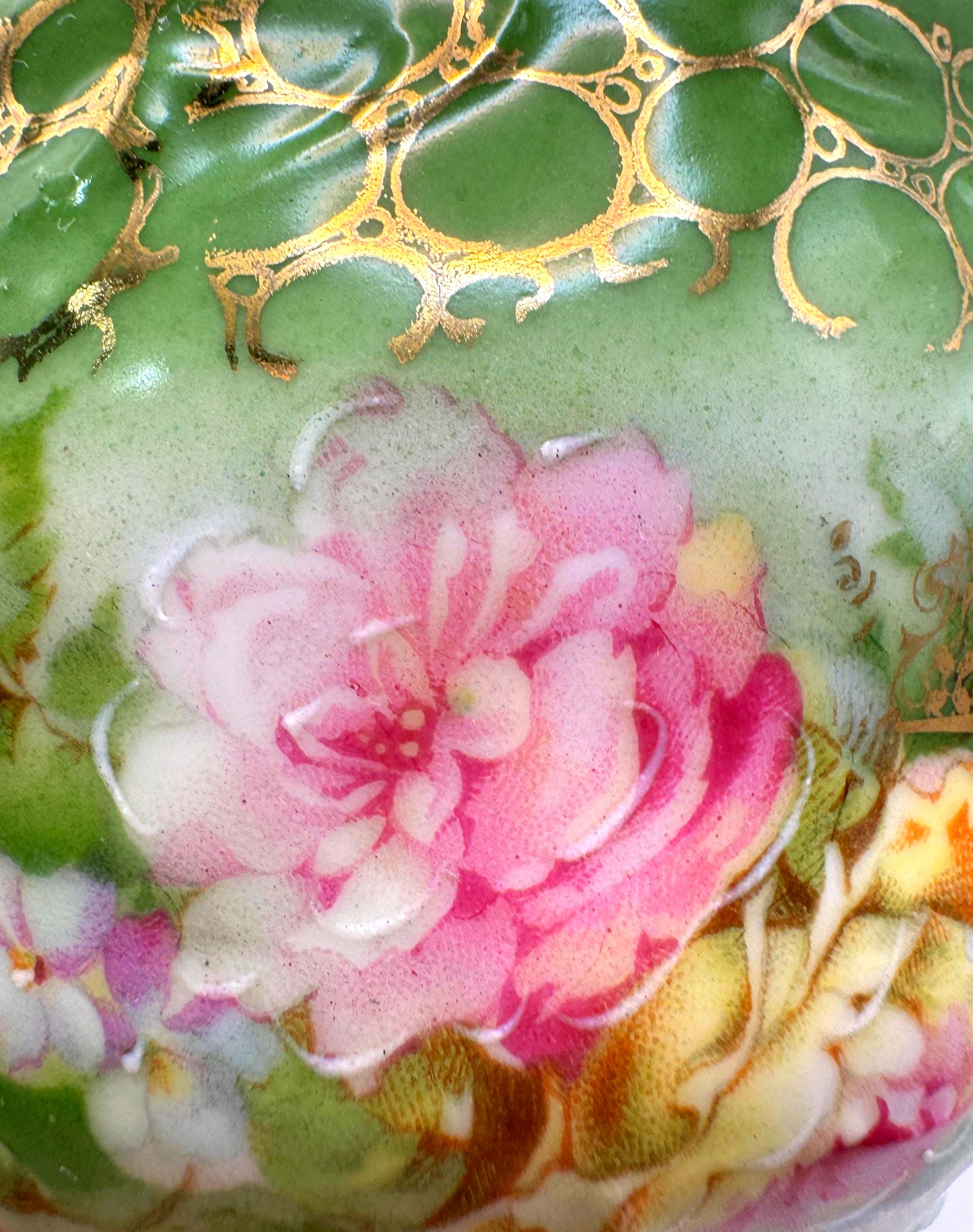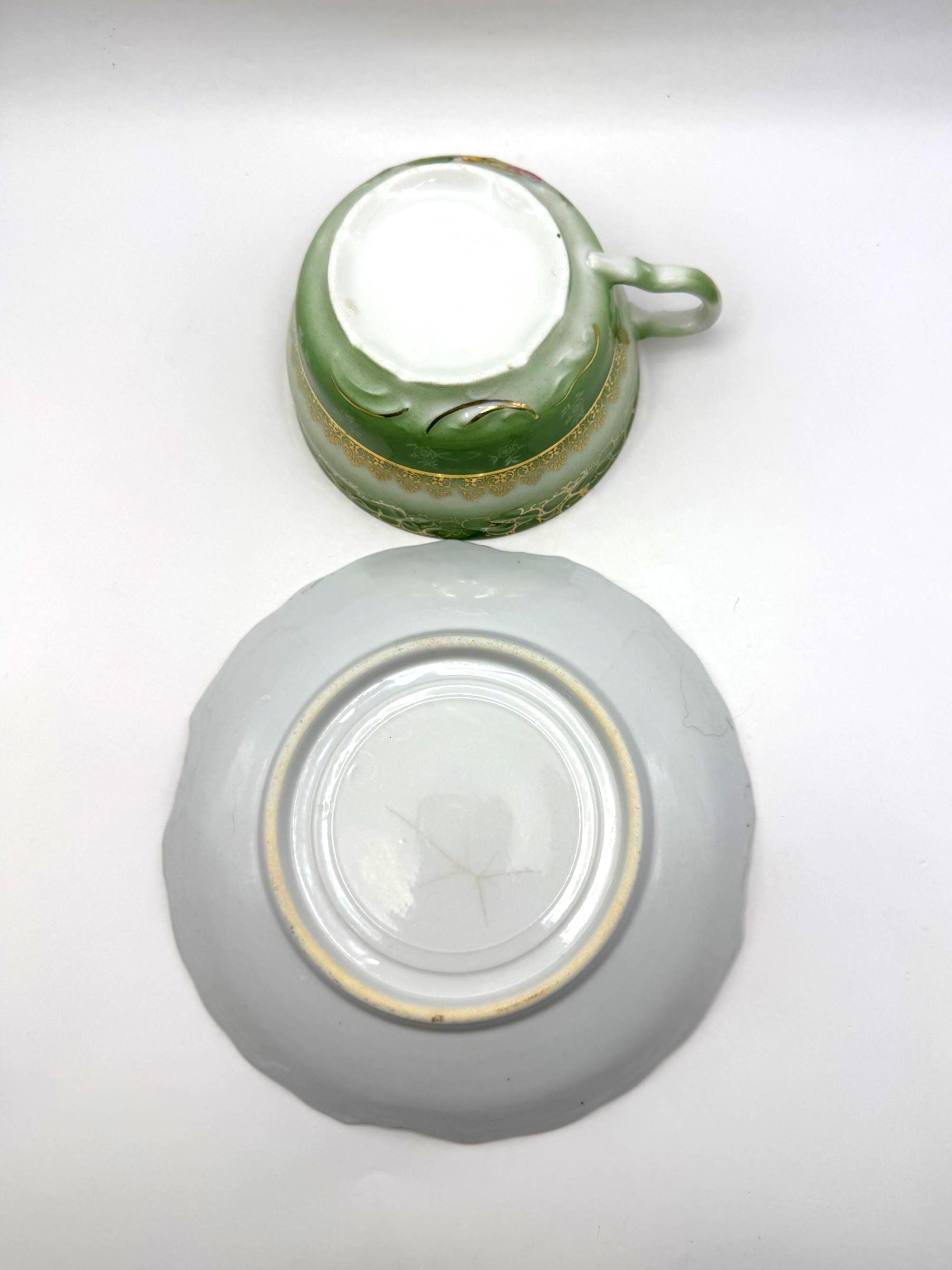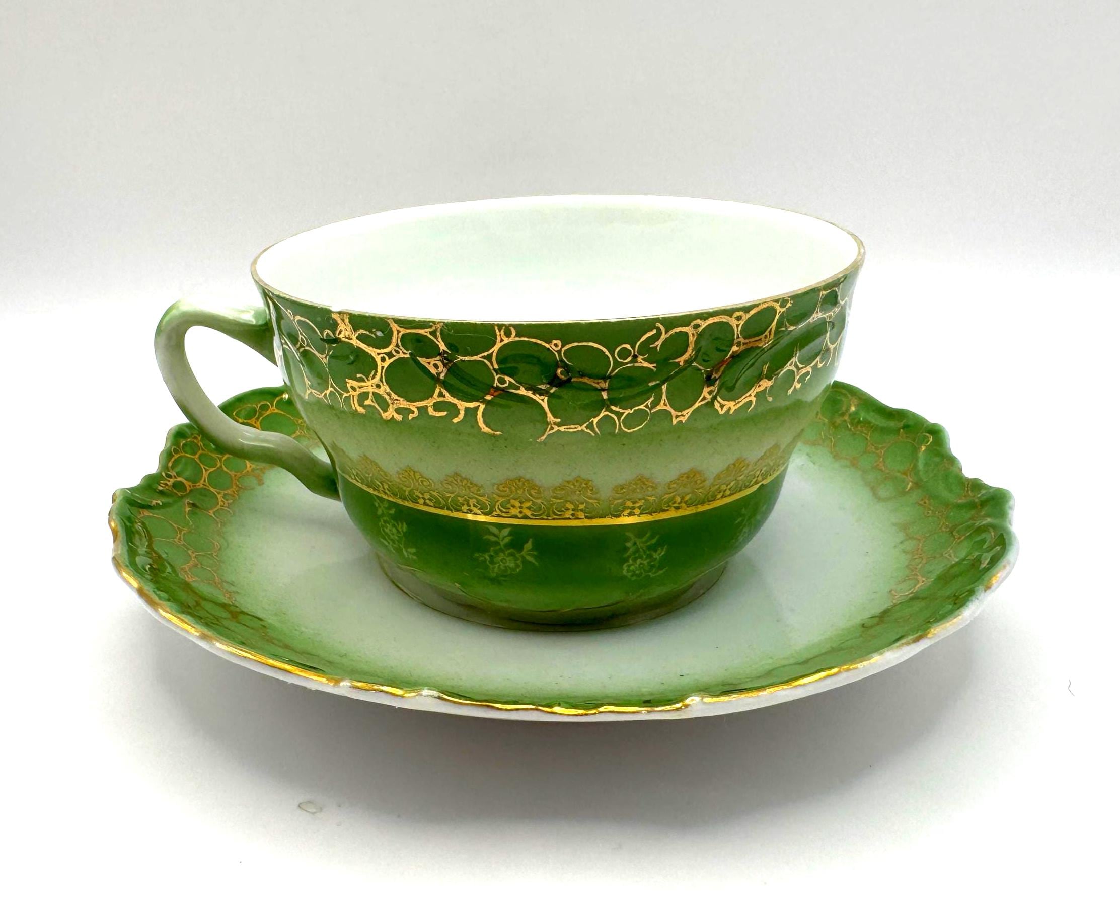 This stunning antique porcelain teacup and saucer features soft hand-painted roses against a shaded green ombre background with intricate gold scroll and bubble-chain detailing. A fine example of 1900s Austrian artistry, the piece reflects the graceful Art Nouveau style---romantic, fluid, and richly decorated.