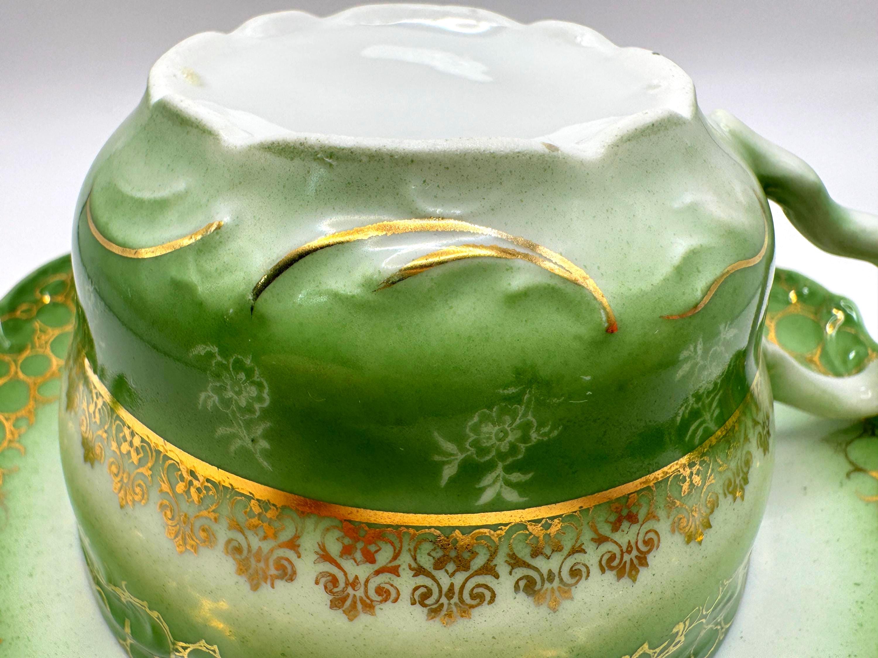 Excellent antique condition. One very tiny chip on the cup rim (see close up photo), light wear to gold, and fine age-related crazing on the saucer. No cracks or repairs. (See pictures for more detail)