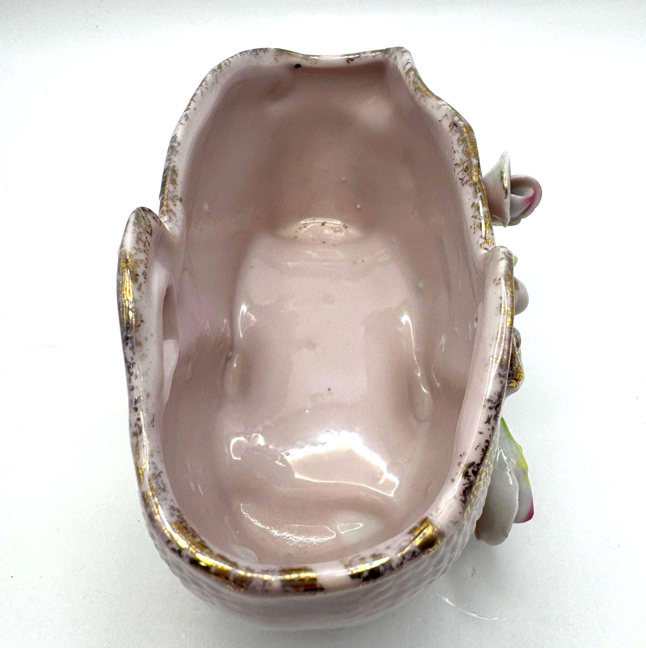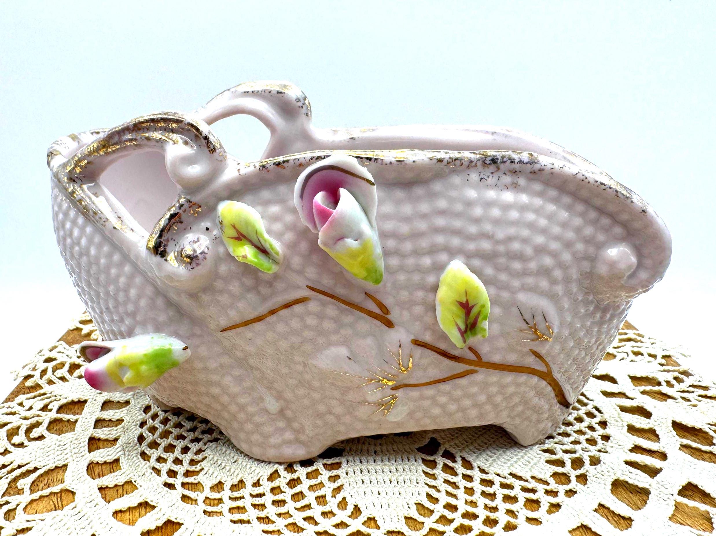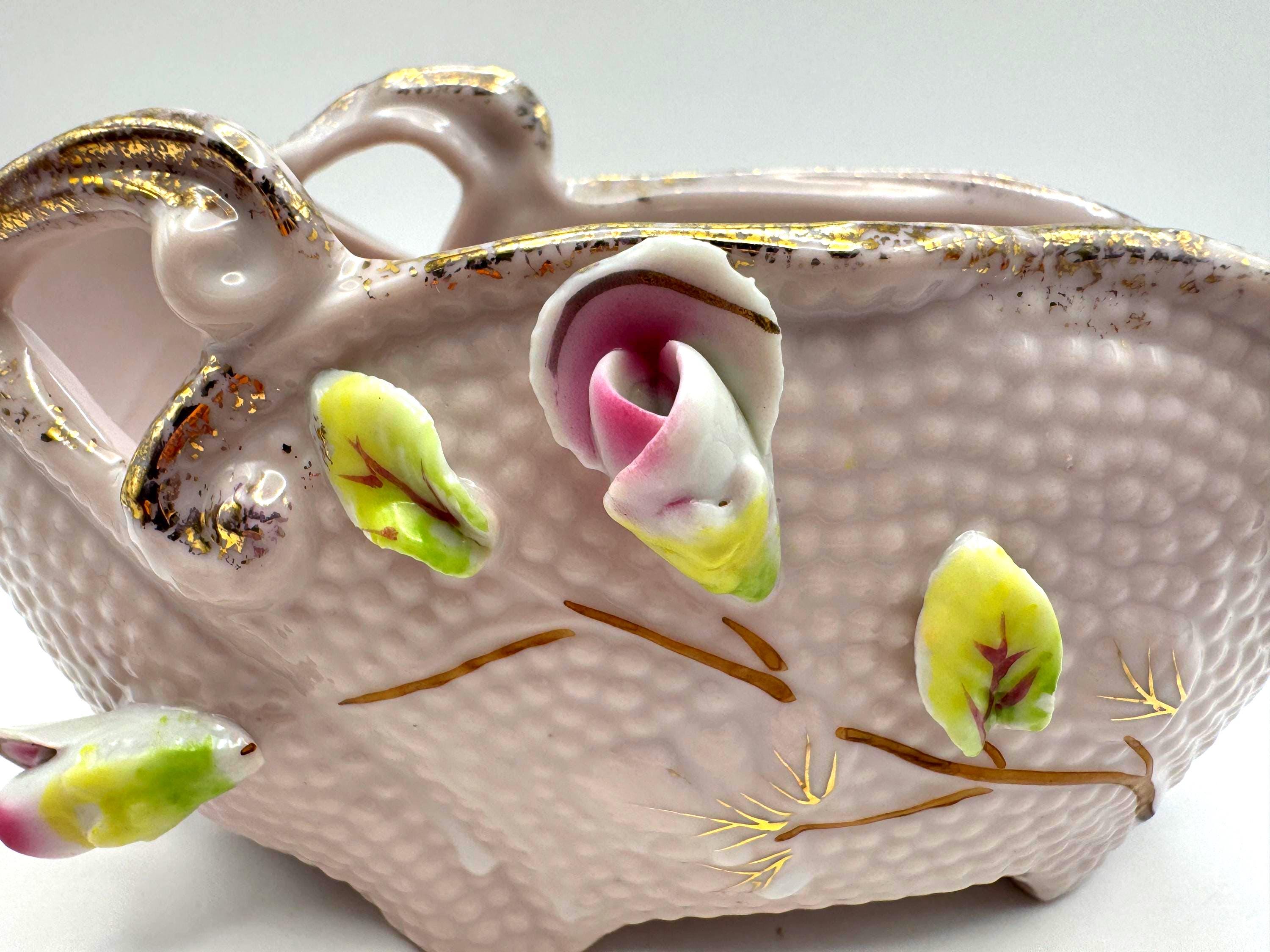 The Capodimonte-style piece was likely made in Japan during the 1950s, inspired by the Italian Capodimonte floral ceramics of the era. Perfect for displaying small flowers, vintage vanity decor, or as a romantic centerpiece.