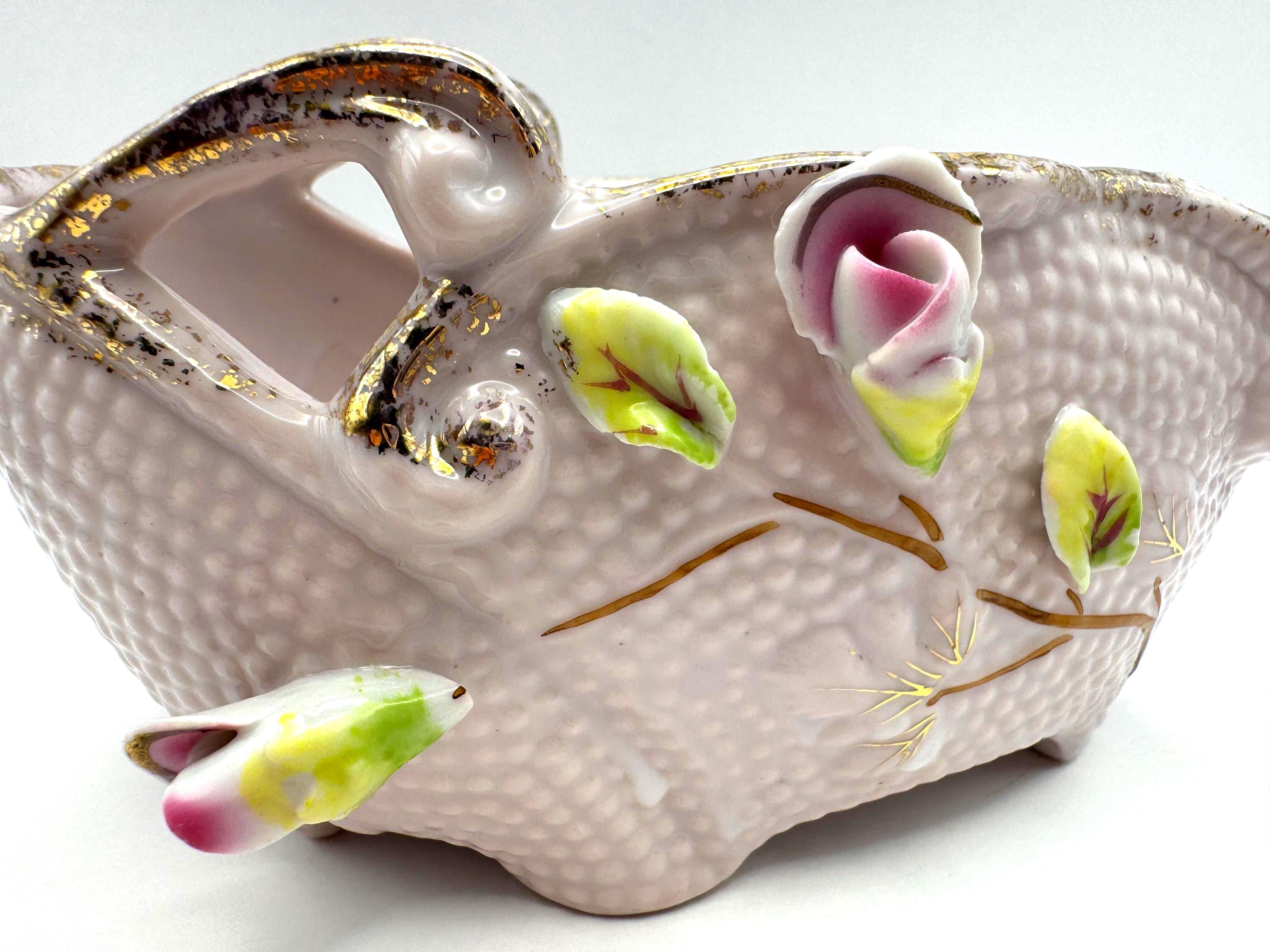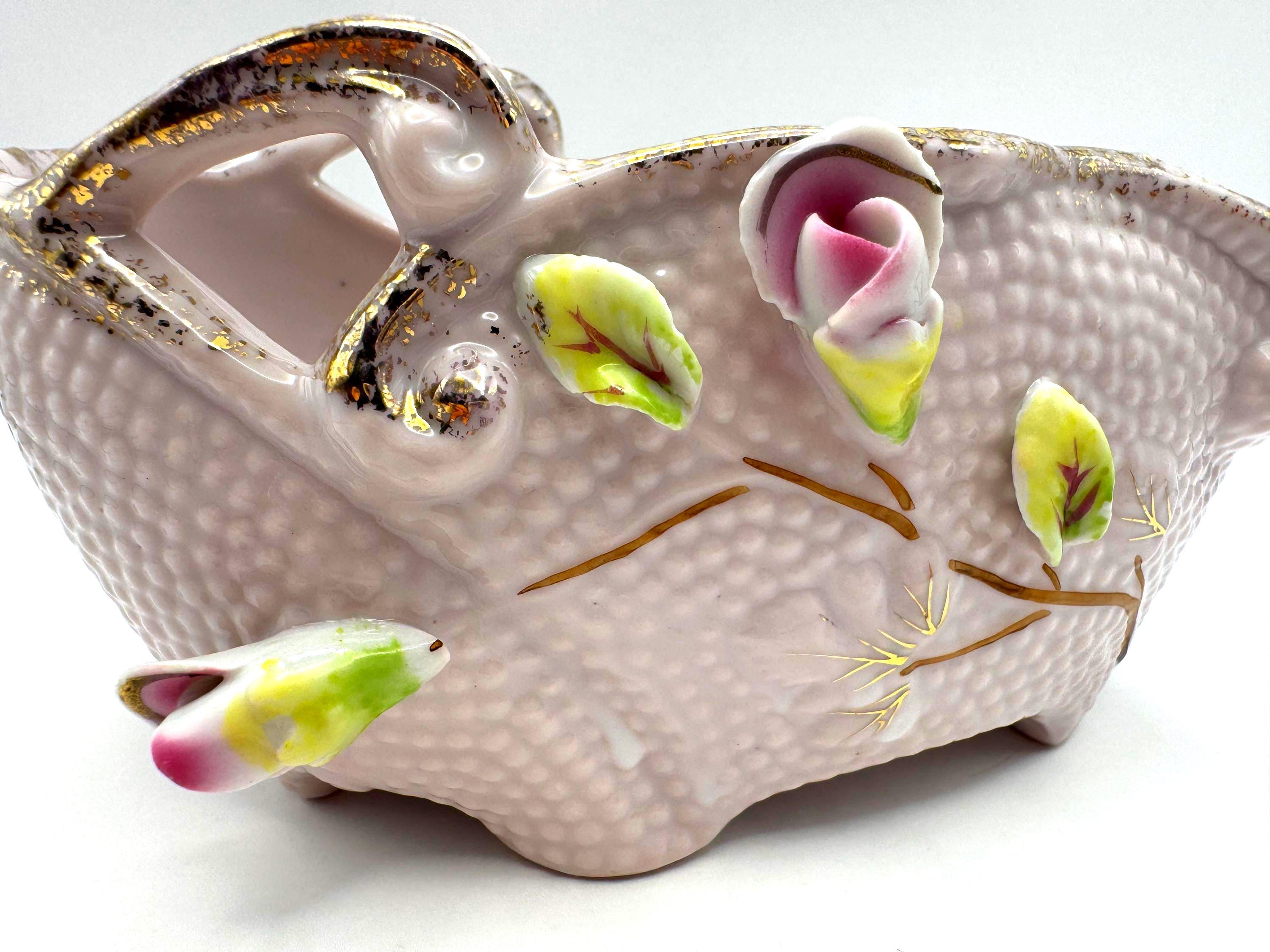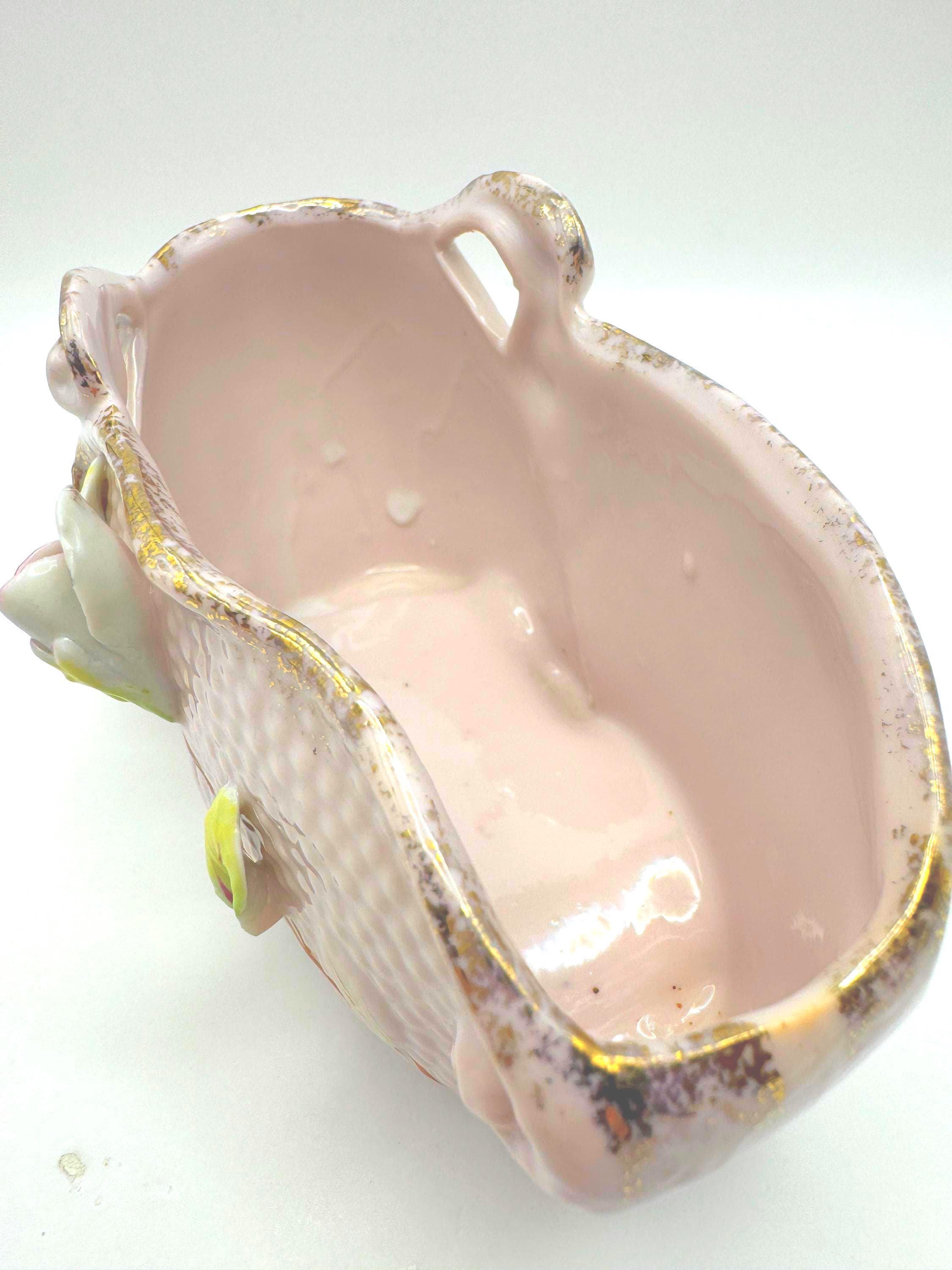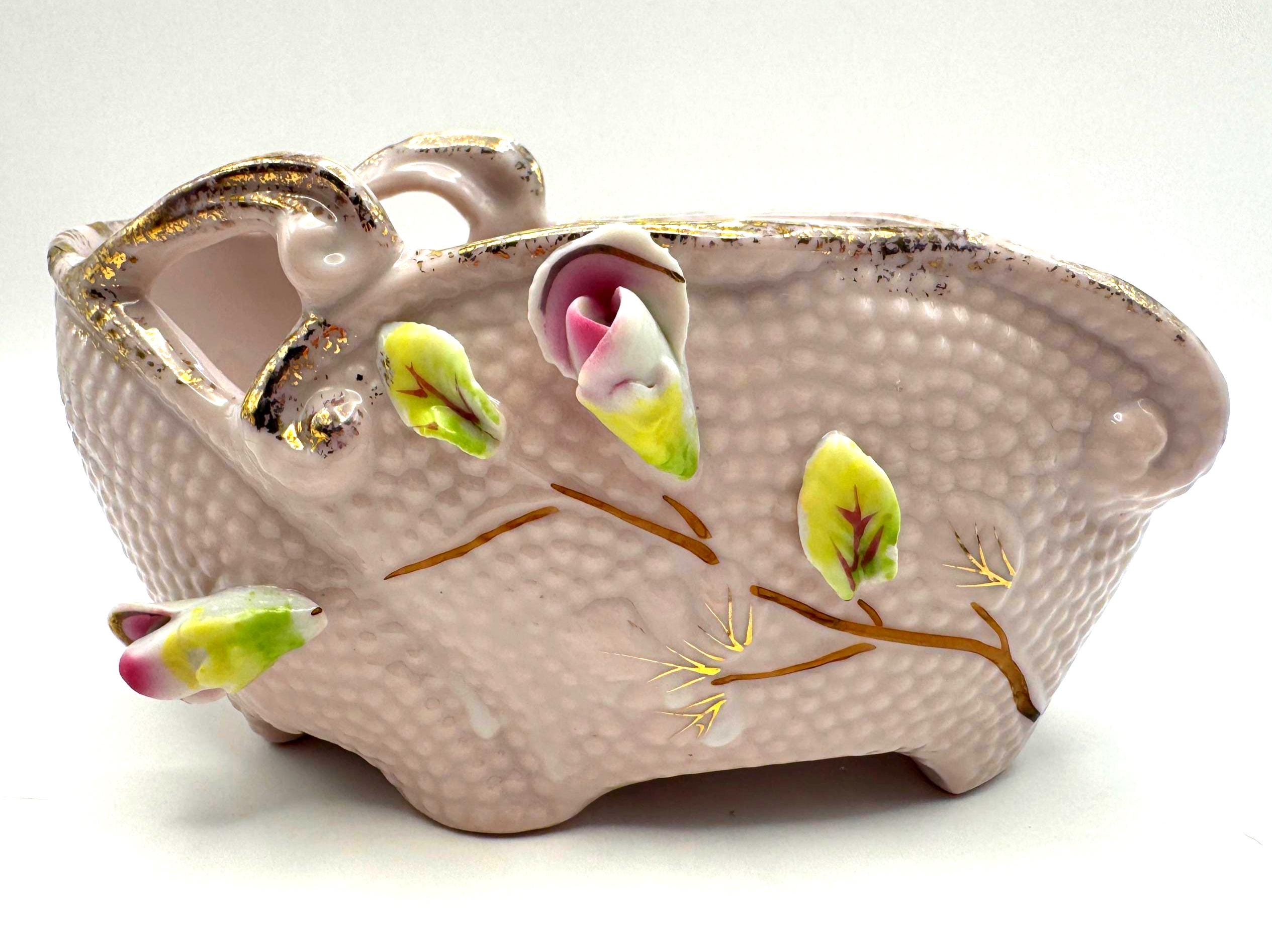 Add a touch of romantic vintage charm to your home with this pink porcelain basket planter featuring hand-applied roses and leaves in soft pink, green, and white hues. The piece has a beautiful textured body with ornate double scroll handles and gold gilt accents.
