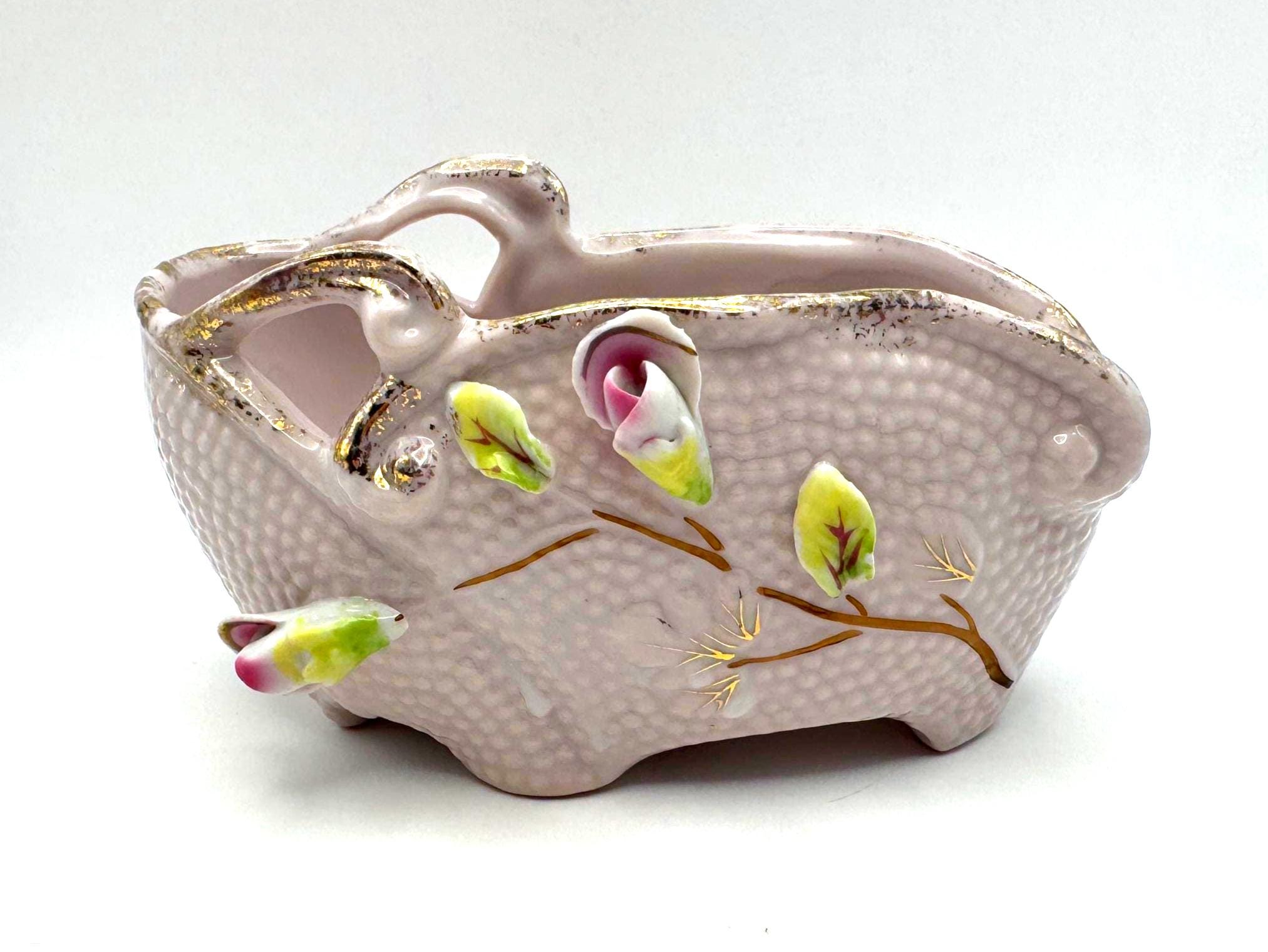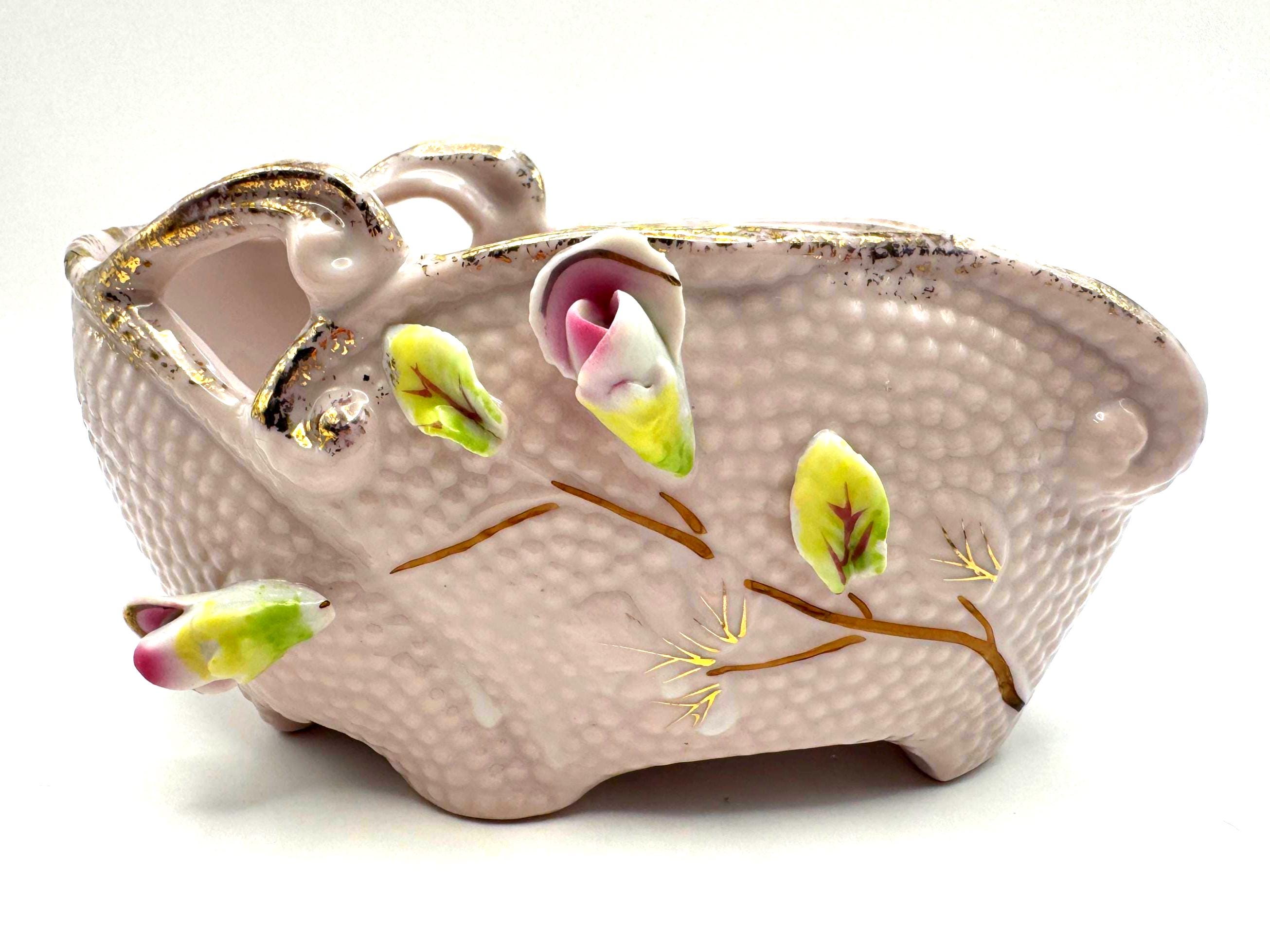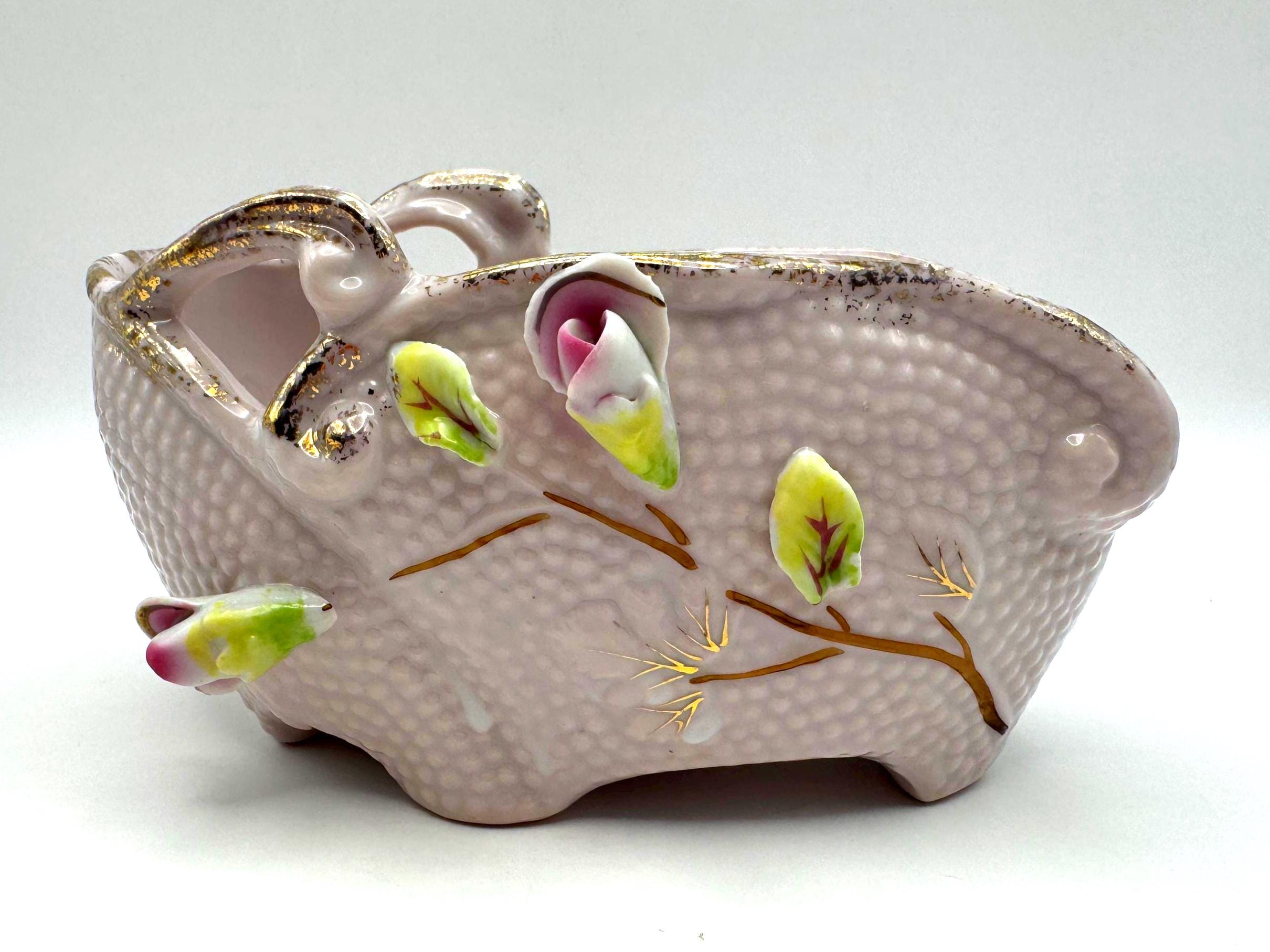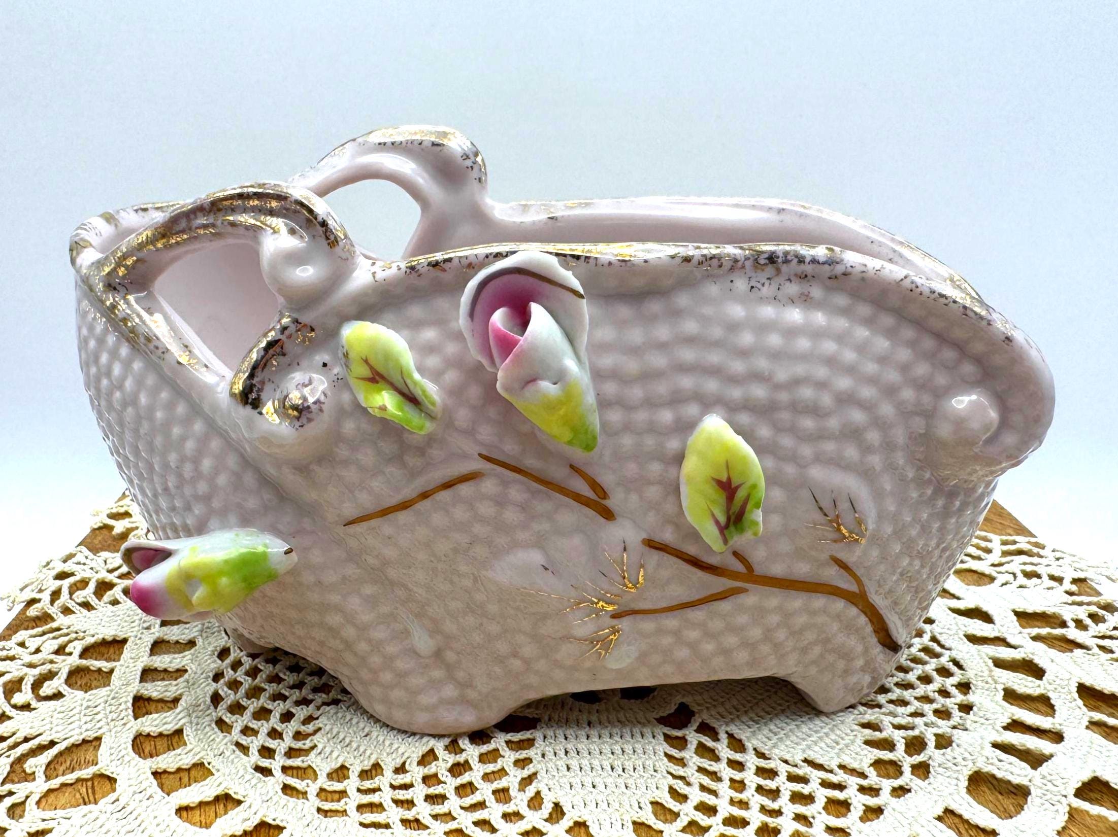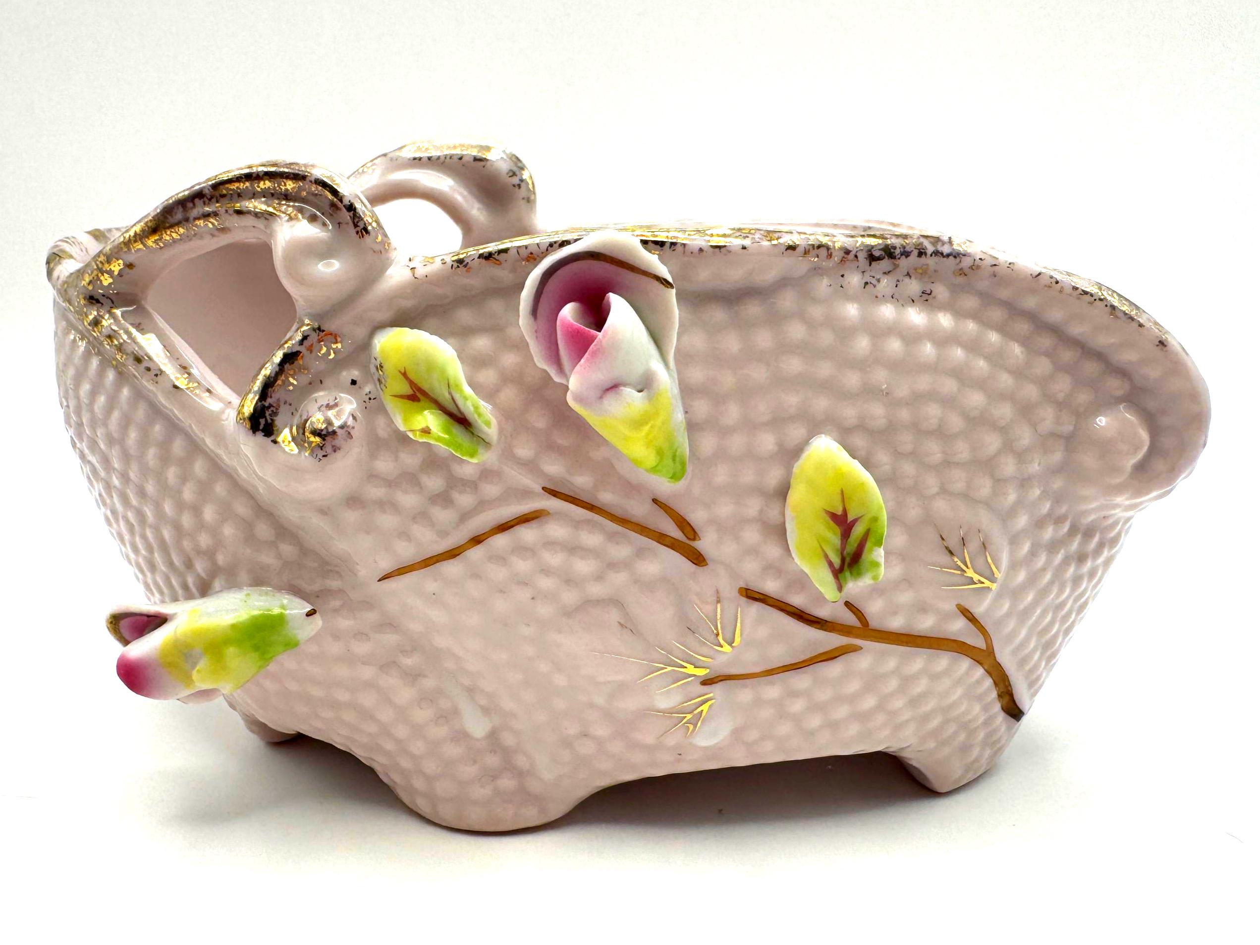 Add a touch of romantic vintage charm to your home with this pink porcelain basket planter featuring hand-applied roses and leaves in soft pink, green, and white hues. The piece has a beautiful textured body with ornate double scroll handles and gold gilt accents.