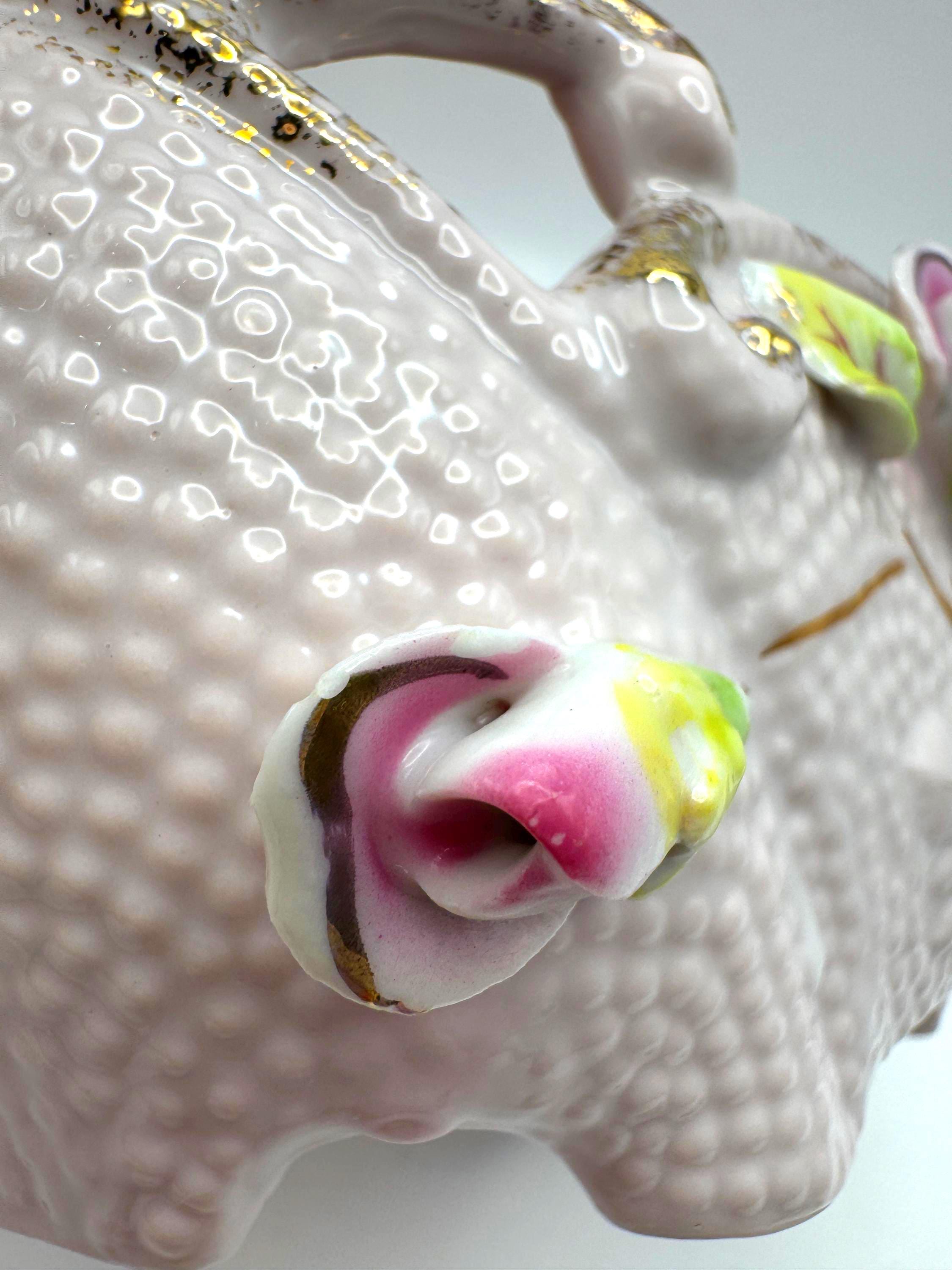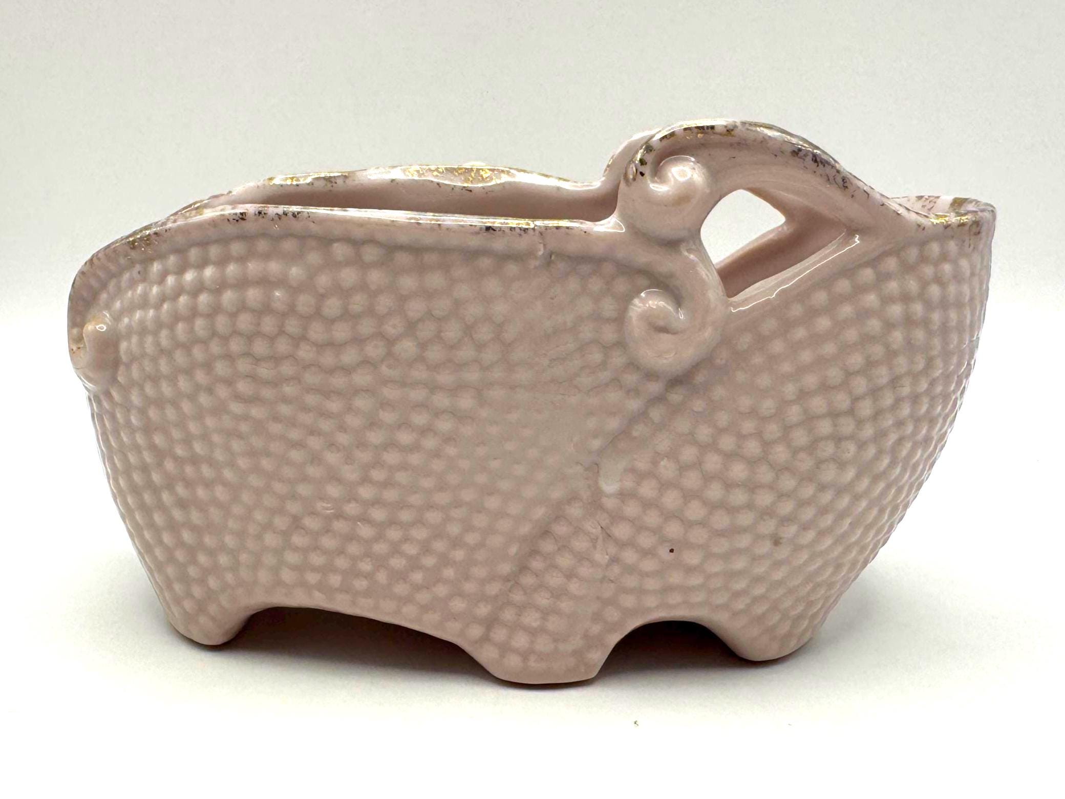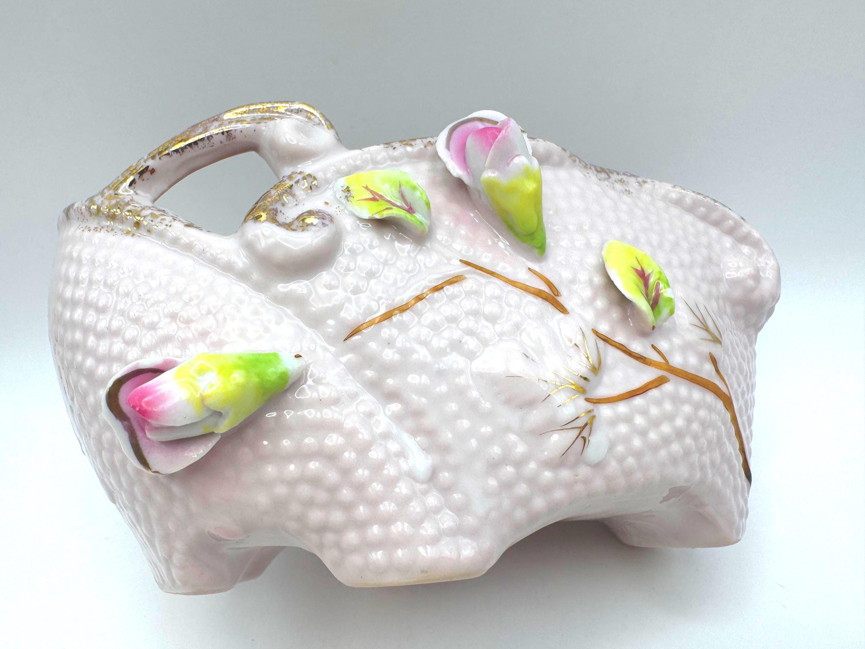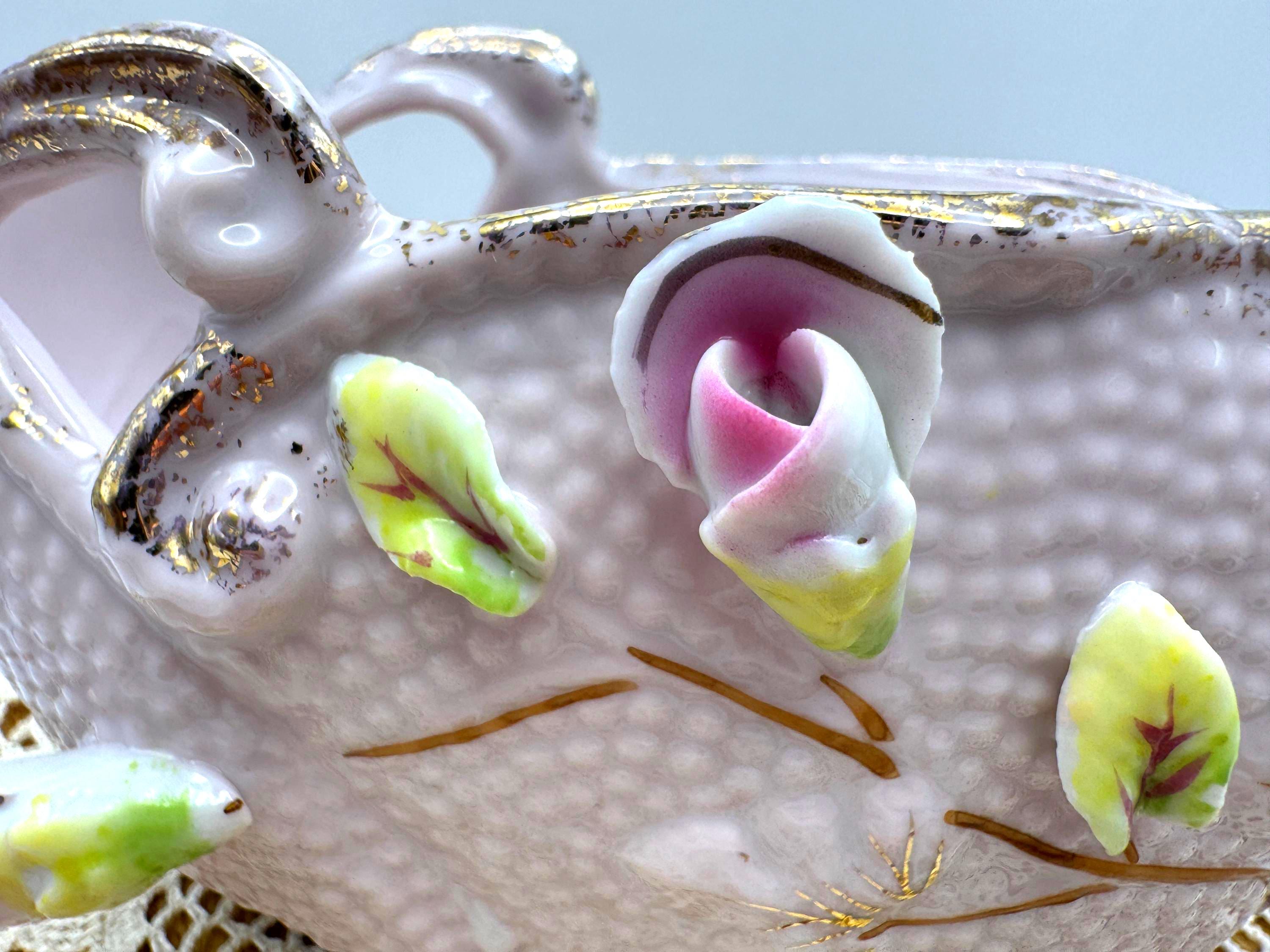 Add a touch of romantic vintage charm to your home with this pink porcelain basket planter featuring hand-applied roses and leaves in soft pink, green, and white hues. The piece has a beautiful textured body with ornate double scroll handles and gold gilt accents.