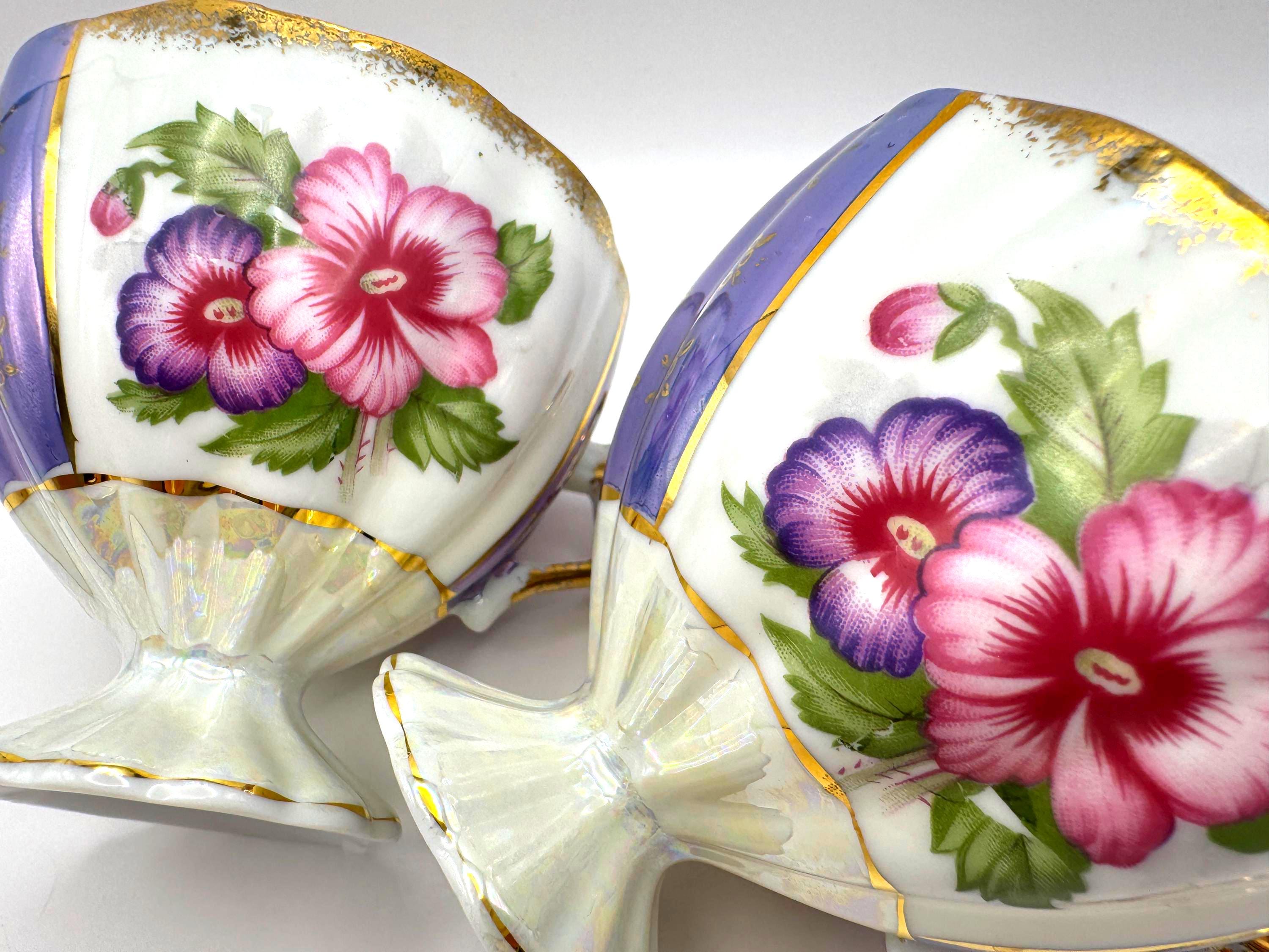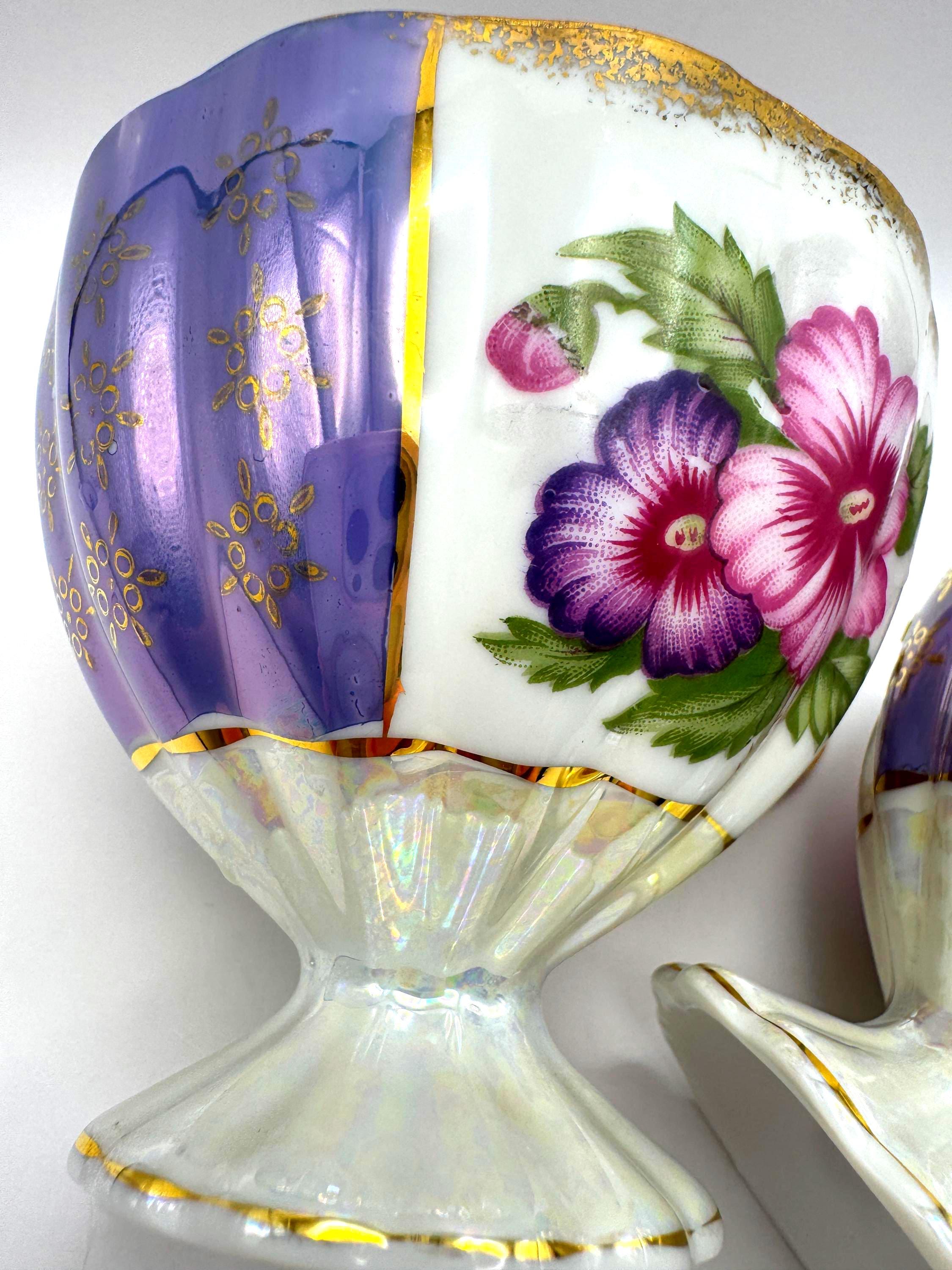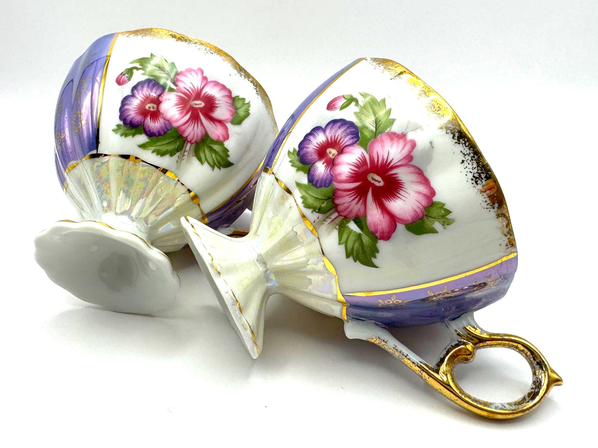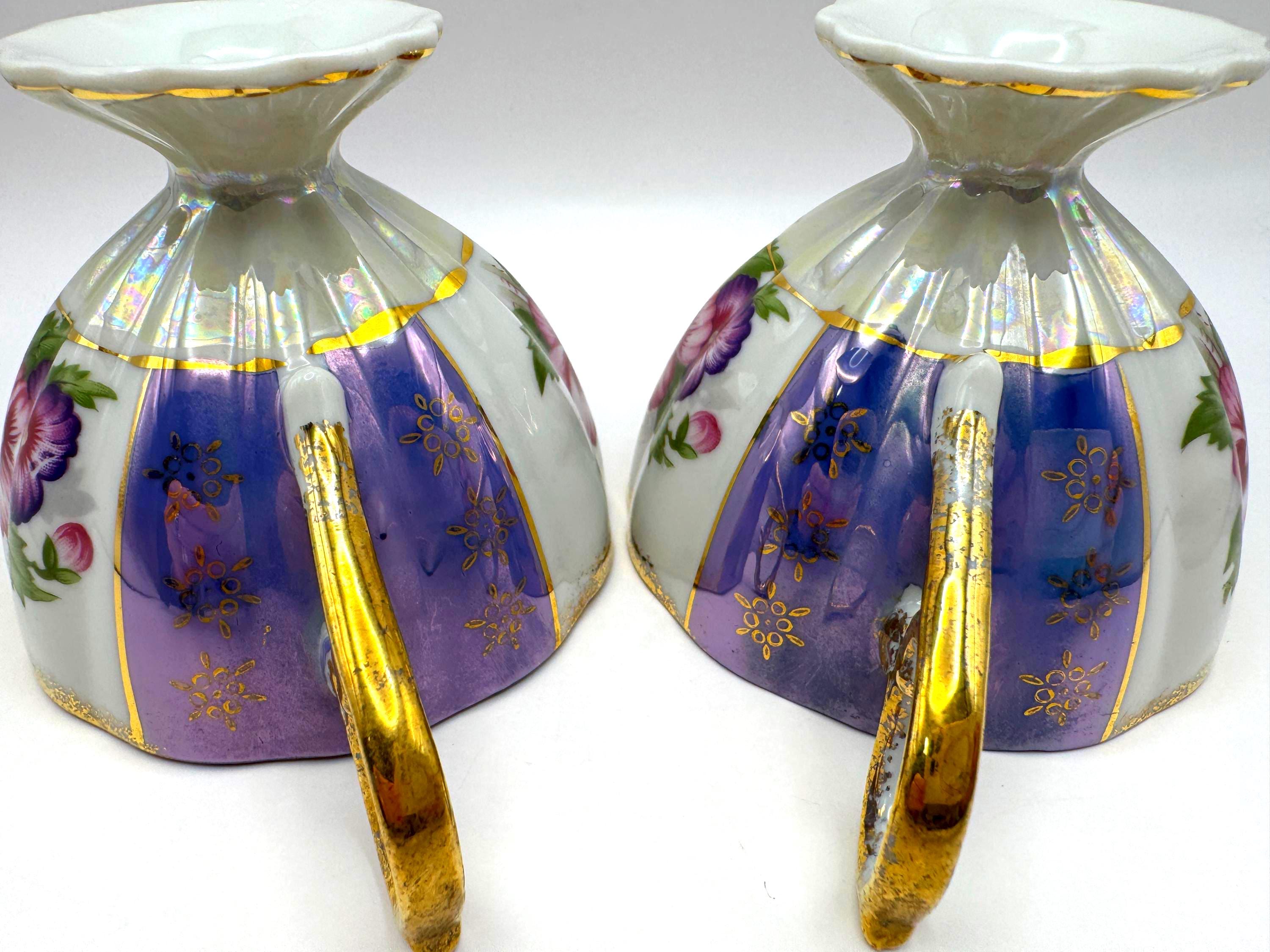 This lovely pair of vintage porcelain teacups features a stunning iridescent luster finish with alternating lavender and white panels, hand-painted gold accents, and vibrant floral motifs in pink and purple tones. The elegant pedestal base and ornate gold handles give these cups a refined, mid-century European style.