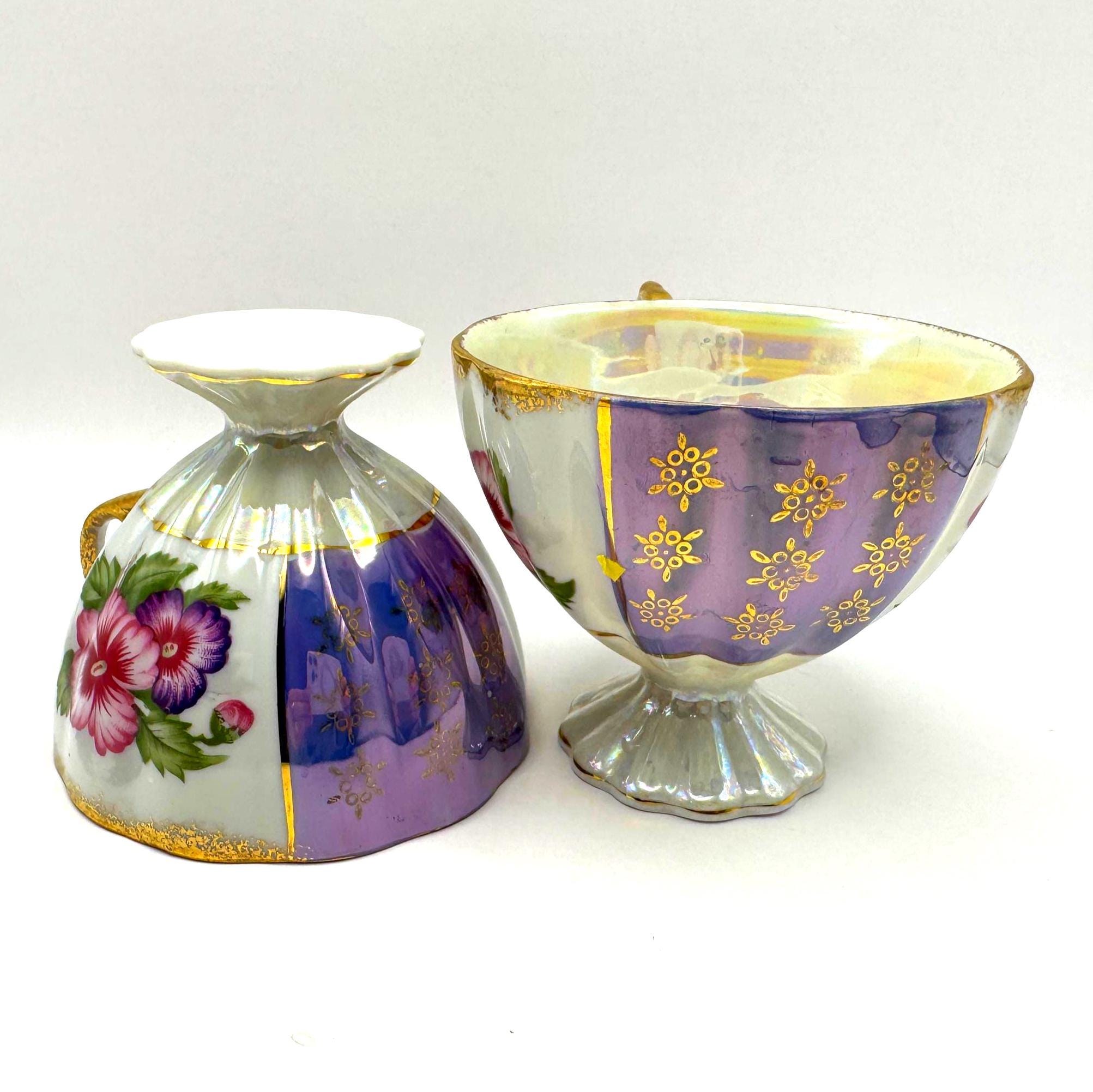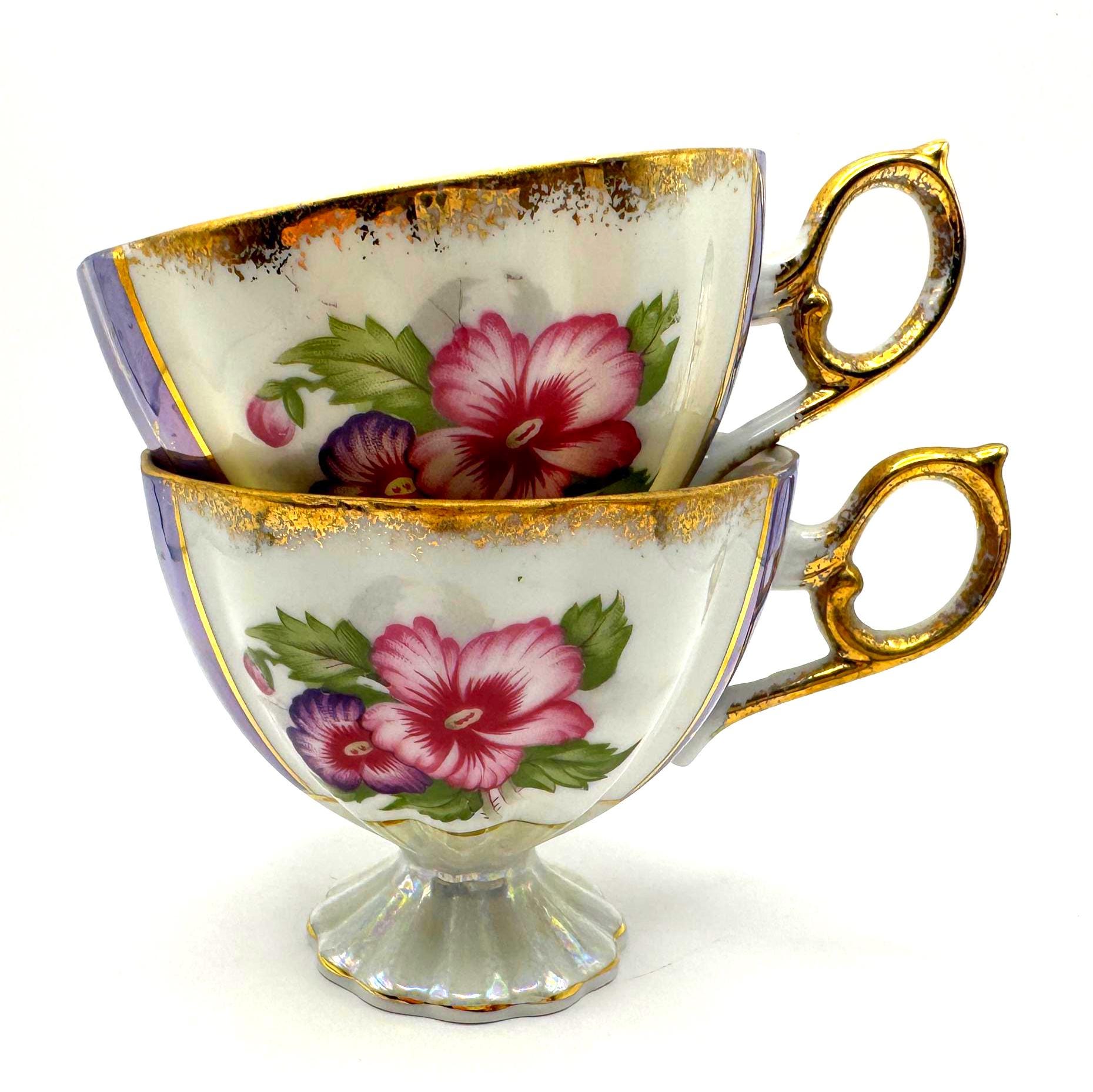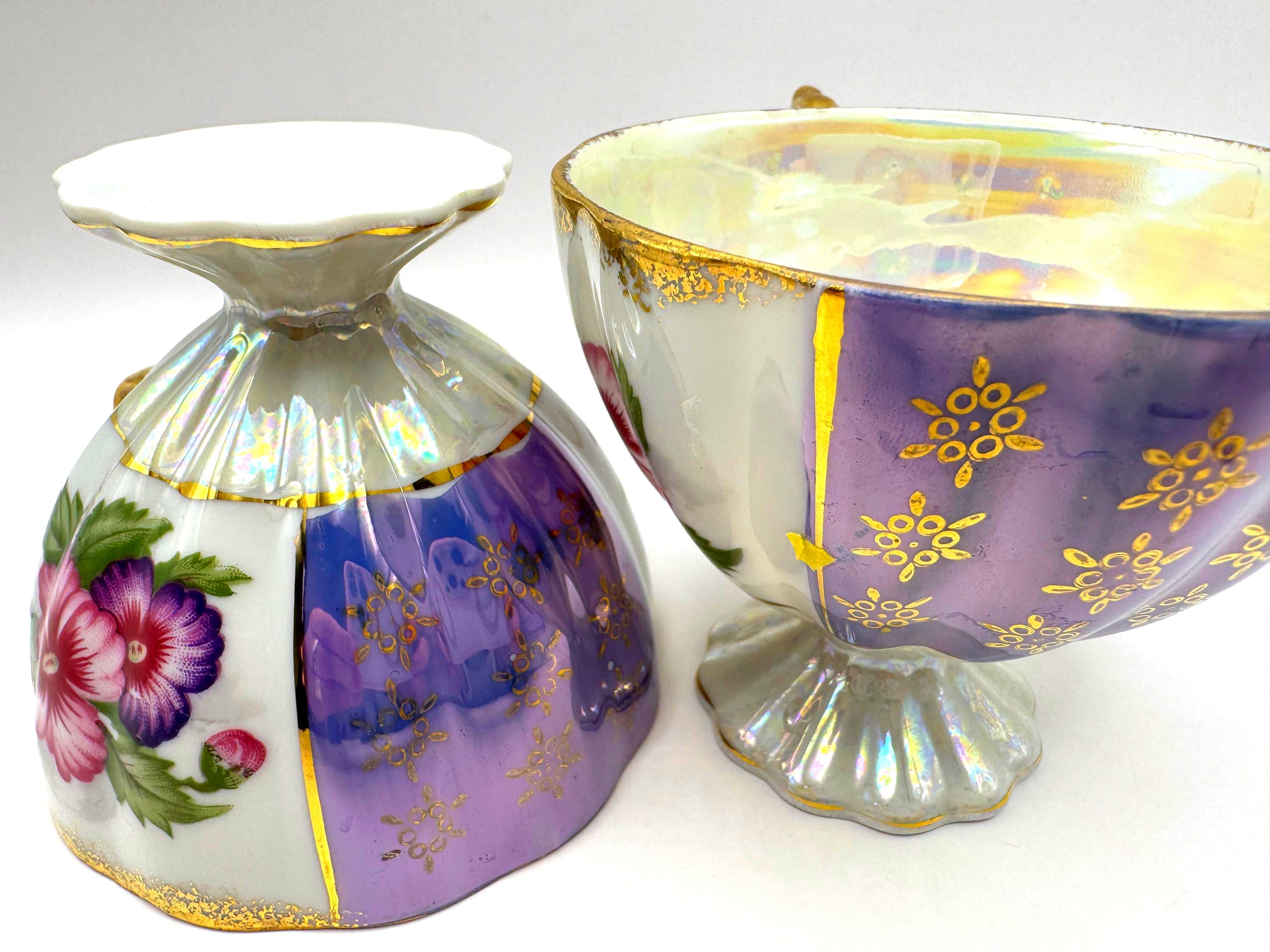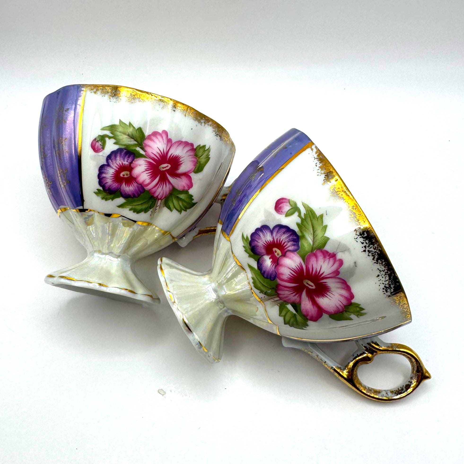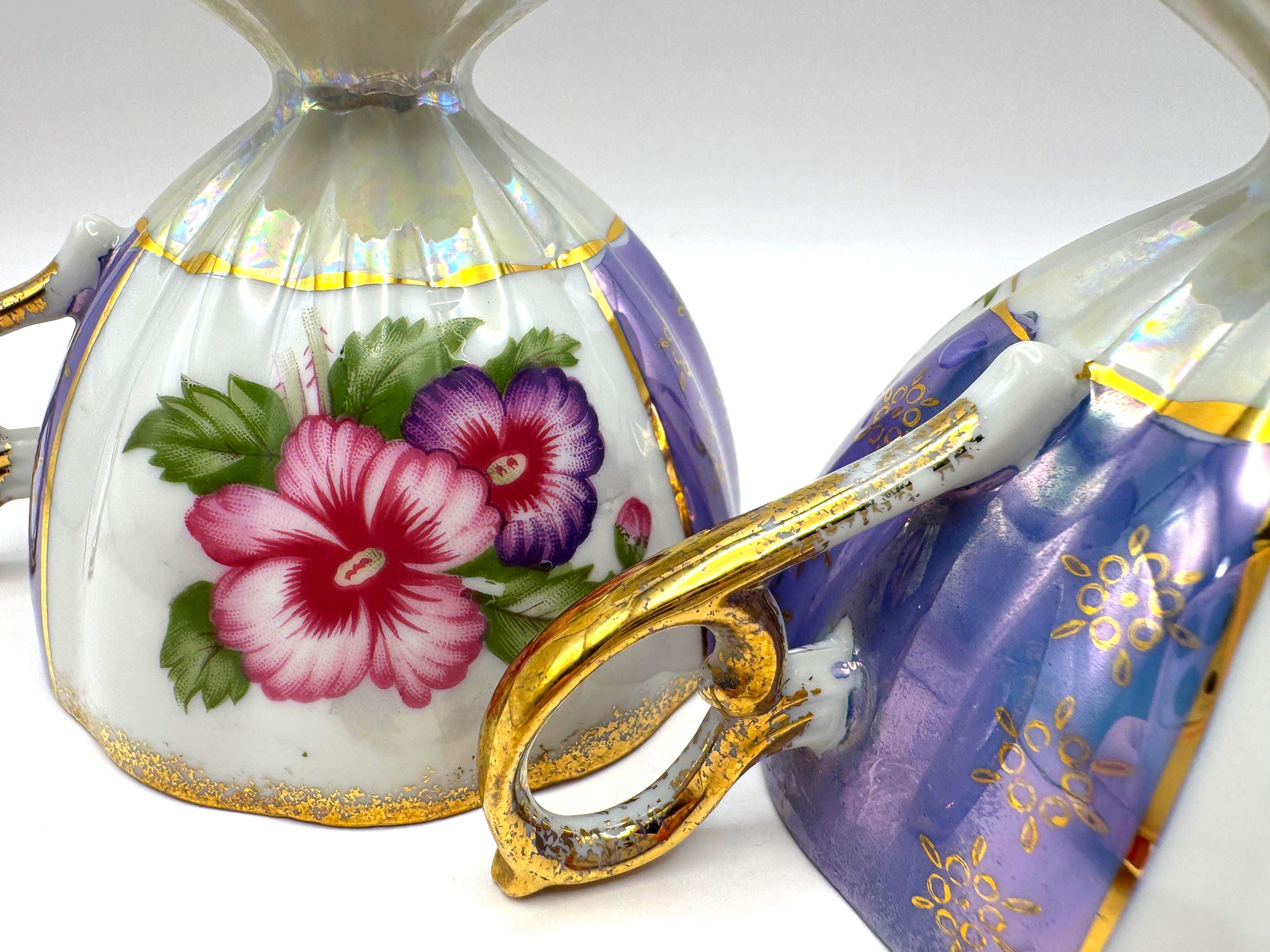 This lovely pair of vintage porcelain teacups features a stunning iridescent luster finish with alternating lavender and white panels, hand-painted gold accents, and vibrant floral motifs in pink and purple tones. The elegant pedestal base and ornate gold handles give these cups a refined, mid-century European style.