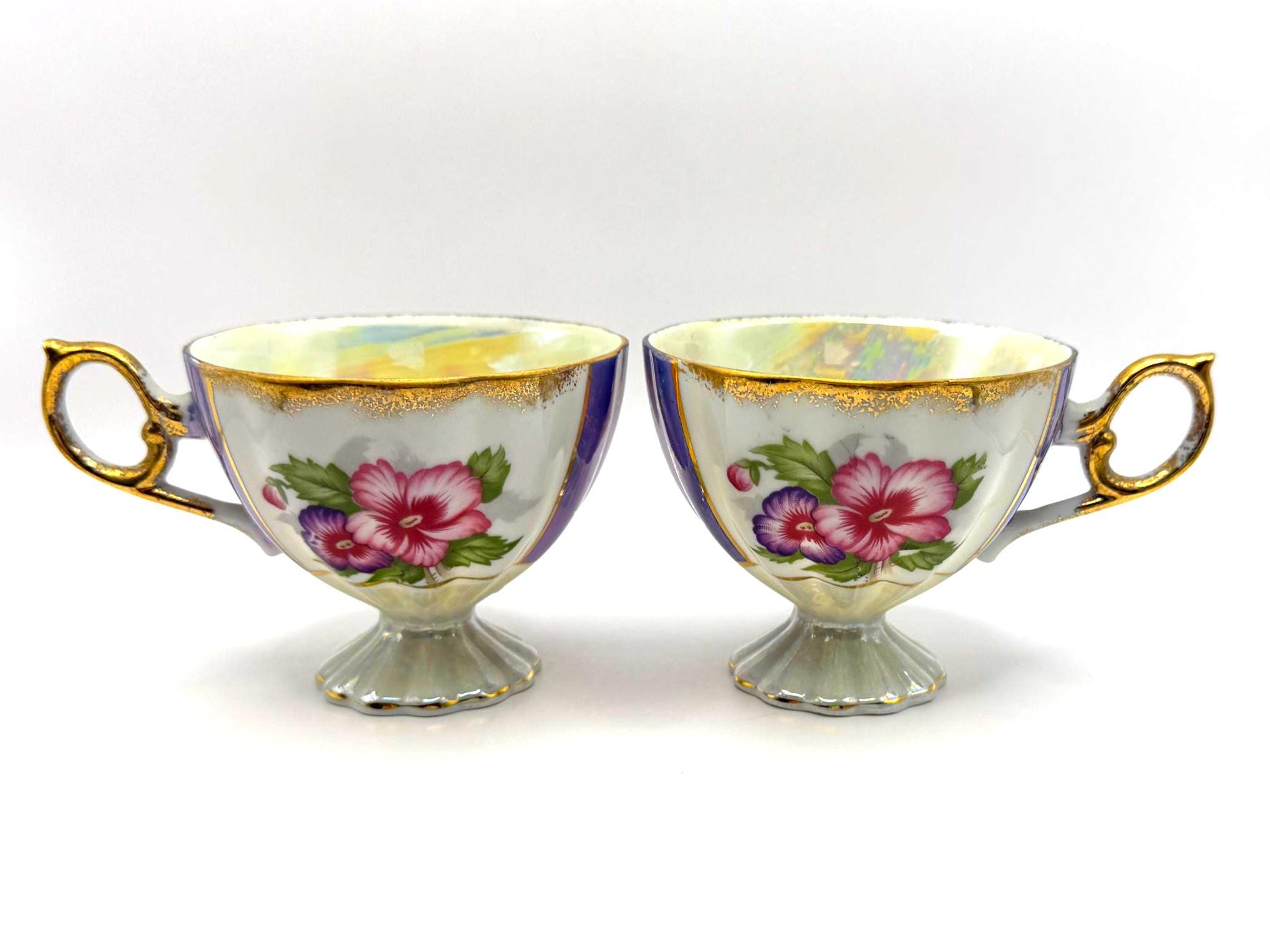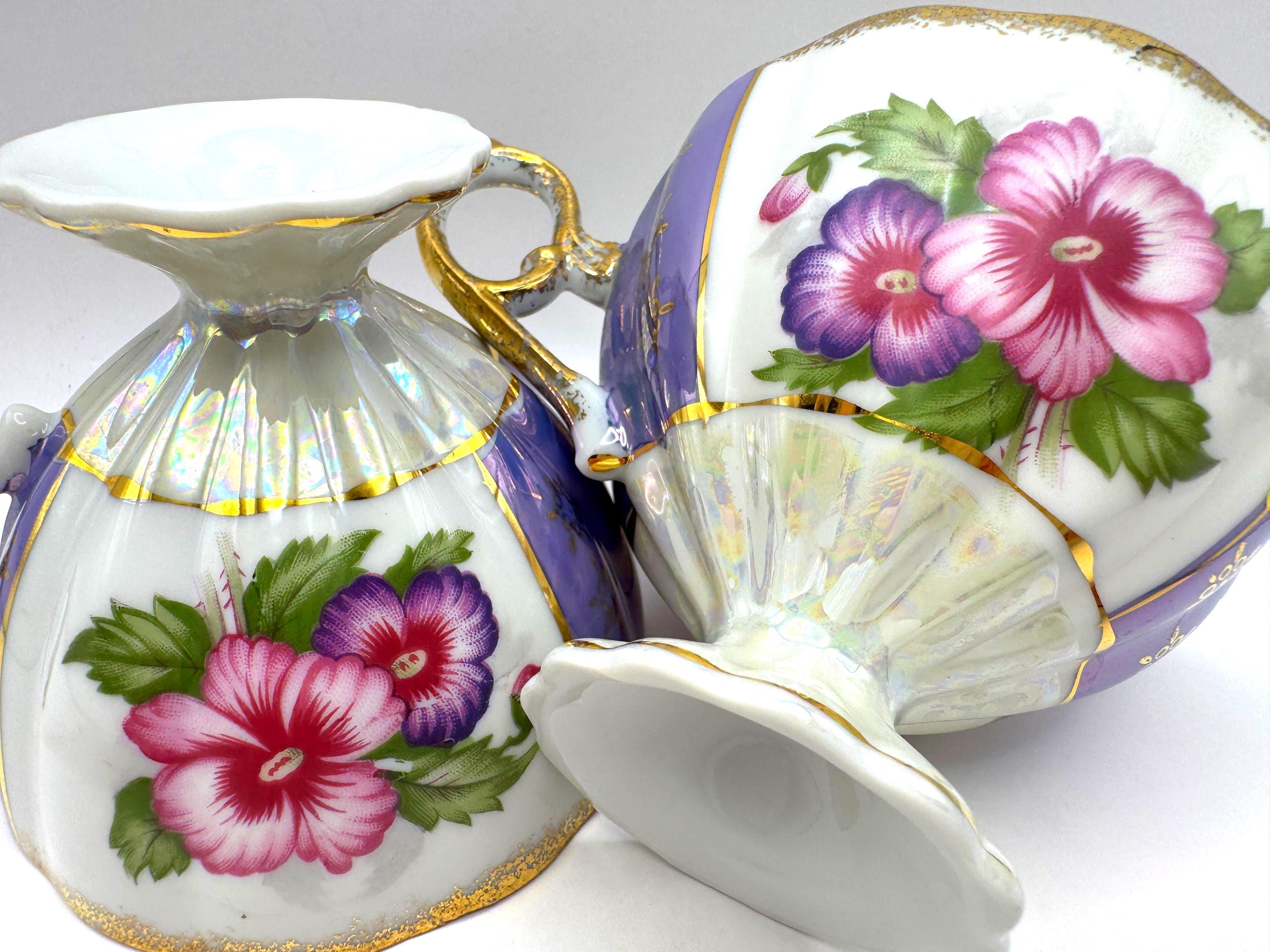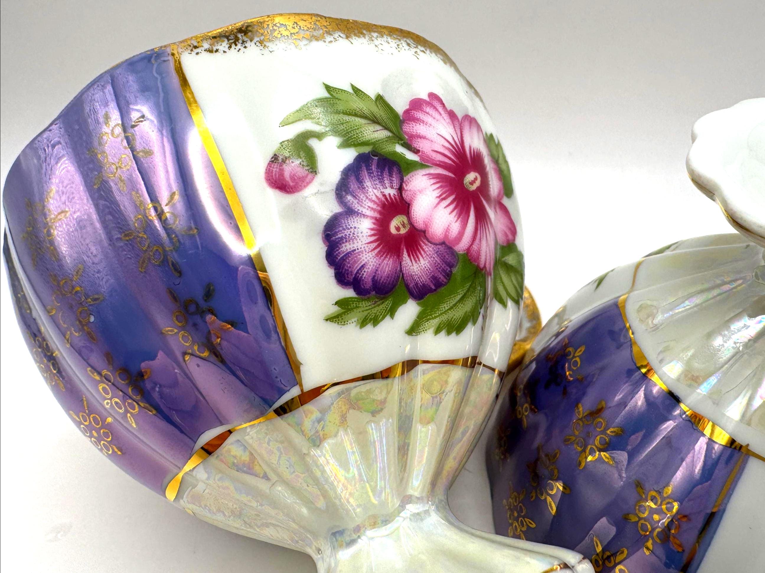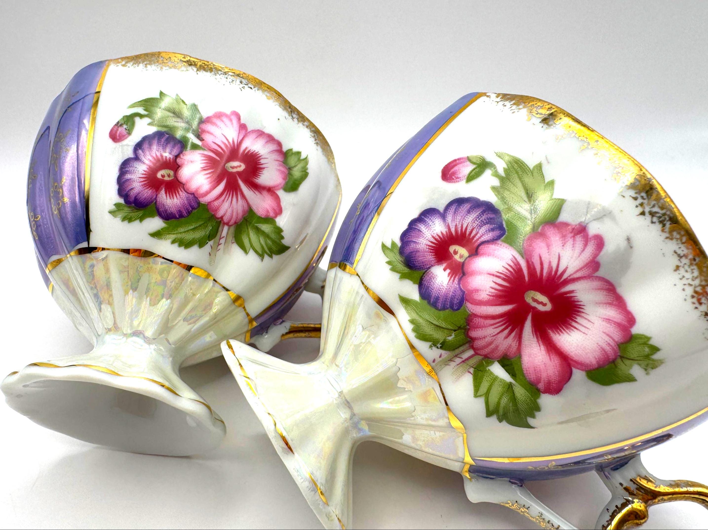 This lovely pair of vintage porcelain teacups features a stunning iridescent luster finish with alternating lavender and white panels, hand-painted gold accents, and vibrant floral motifs in pink and purple tones. The elegant pedestal base and ornate gold handles give these cups a refined, mid-century European style.