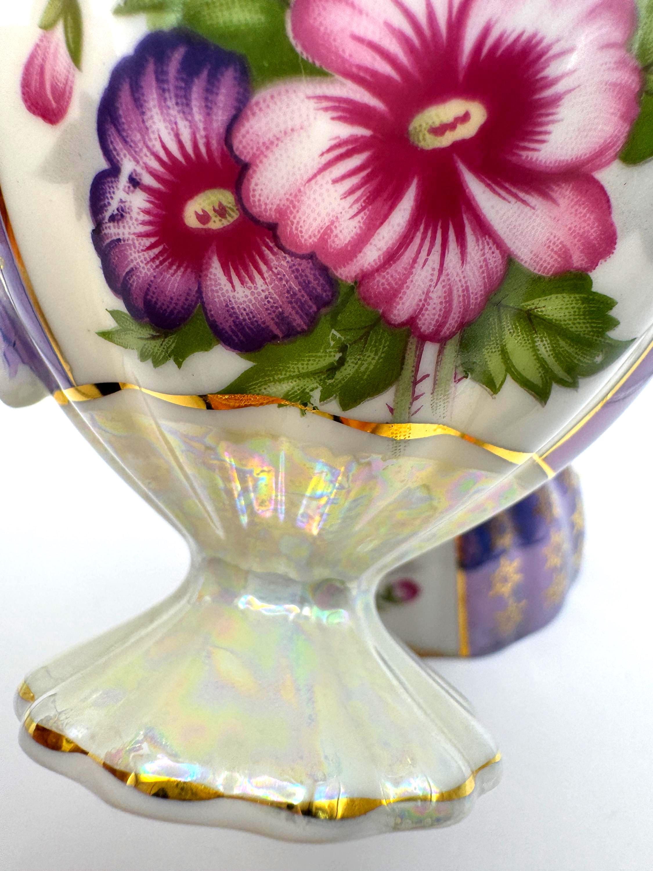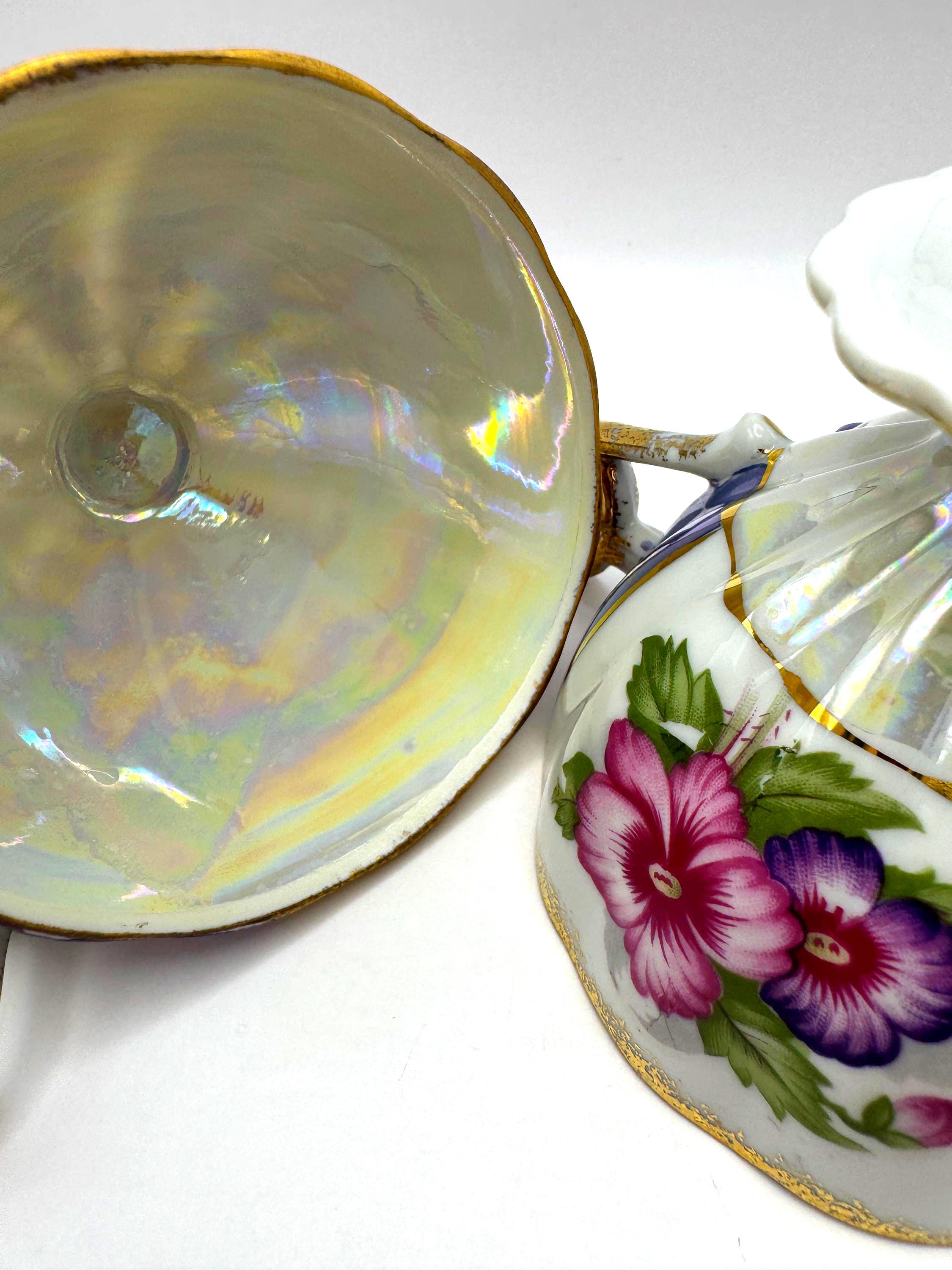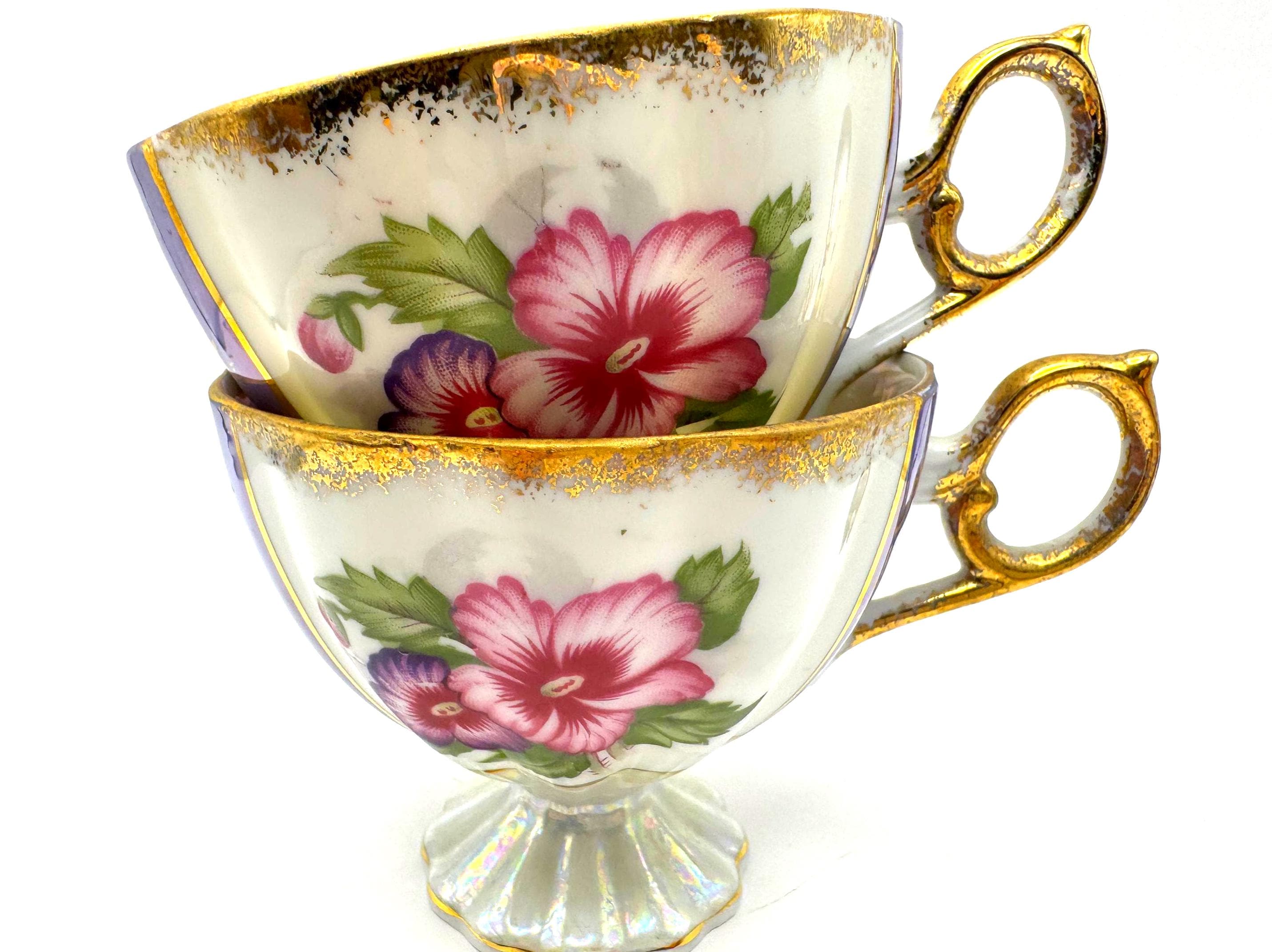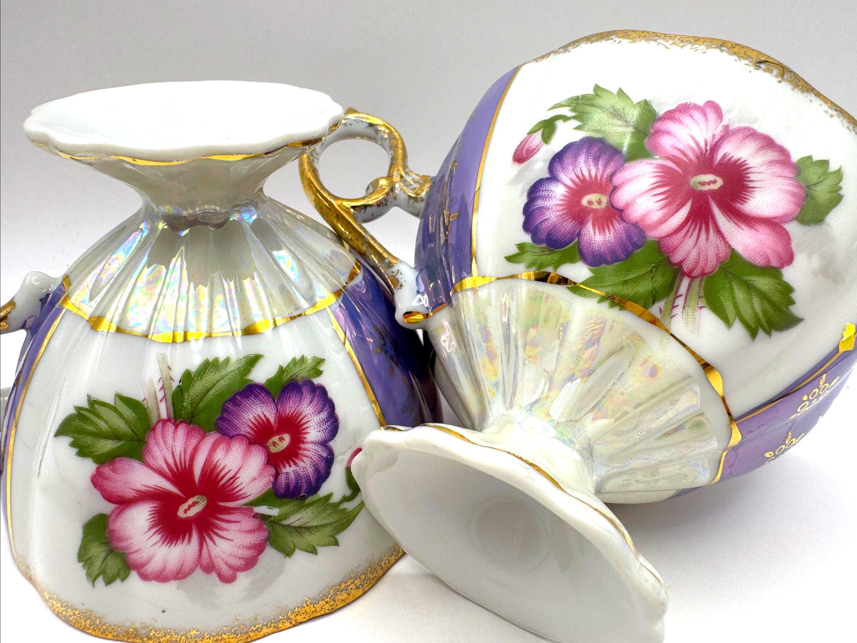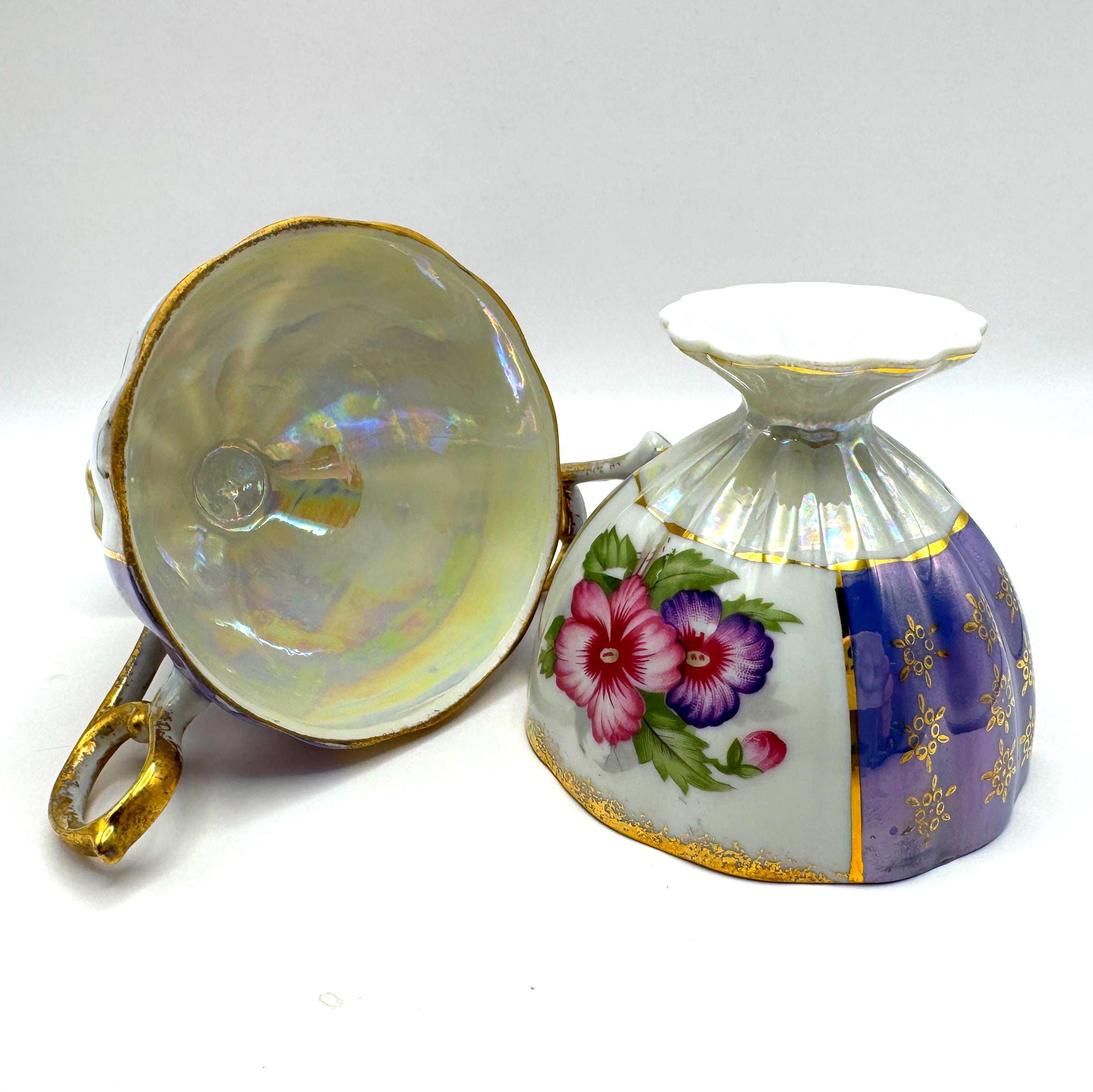 This lovely pair of vintage porcelain teacups features a stunning iridescent luster finish with alternating lavender and white panels, hand-painted gold accents, and vibrant floral motifs in pink and purple tones. The elegant pedestal base and ornate gold handles give these cups a refined, mid-century European style.