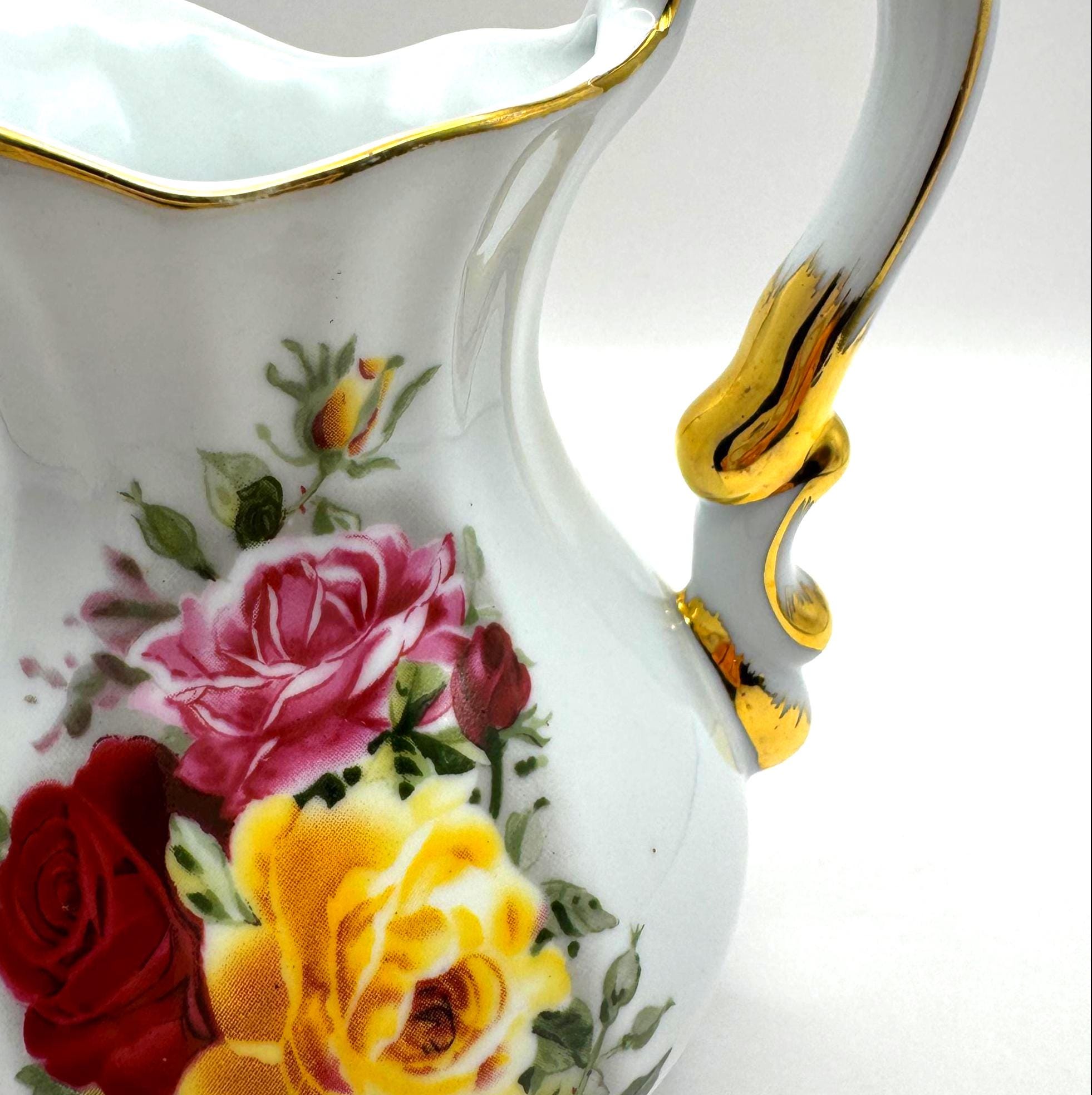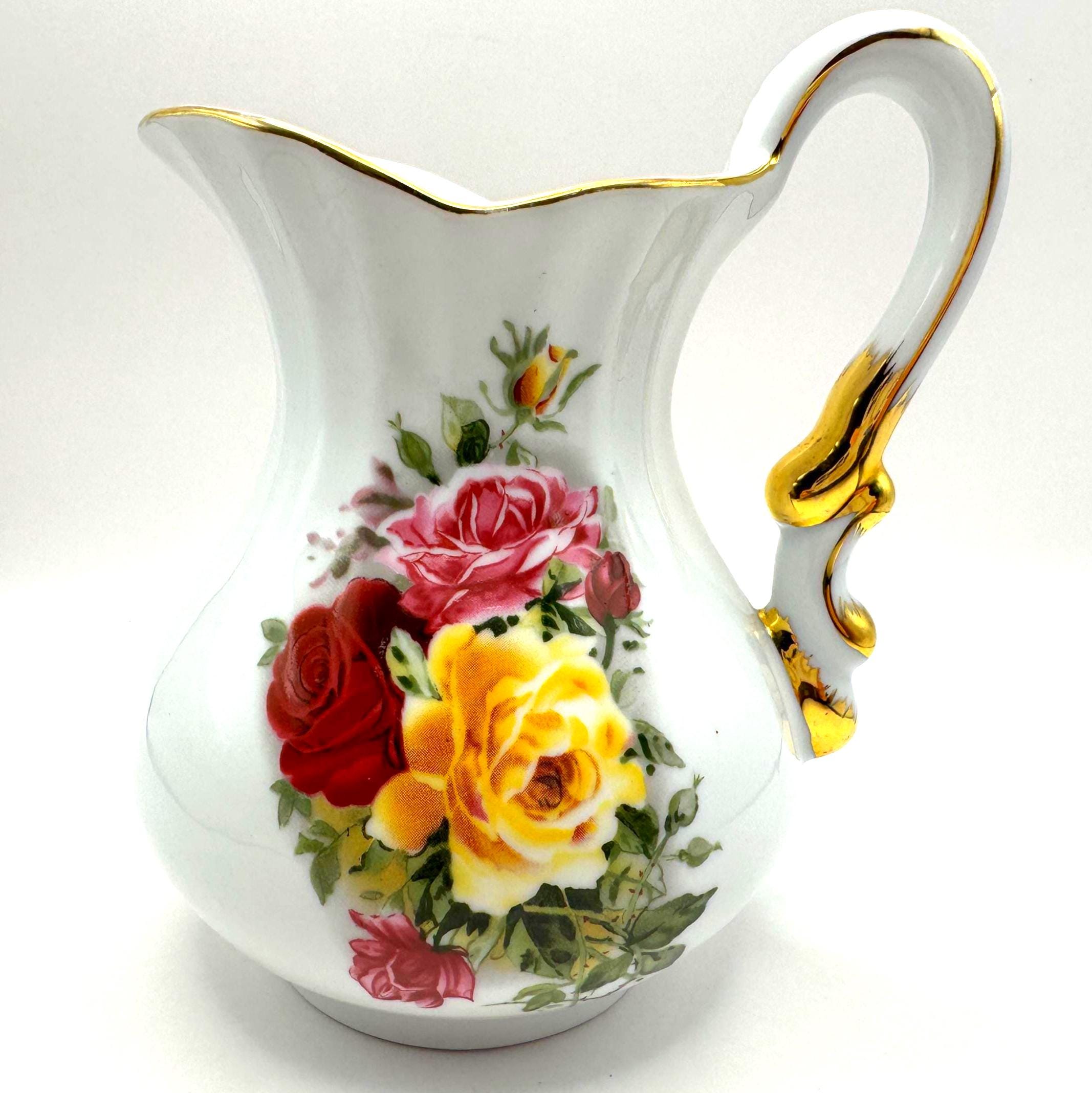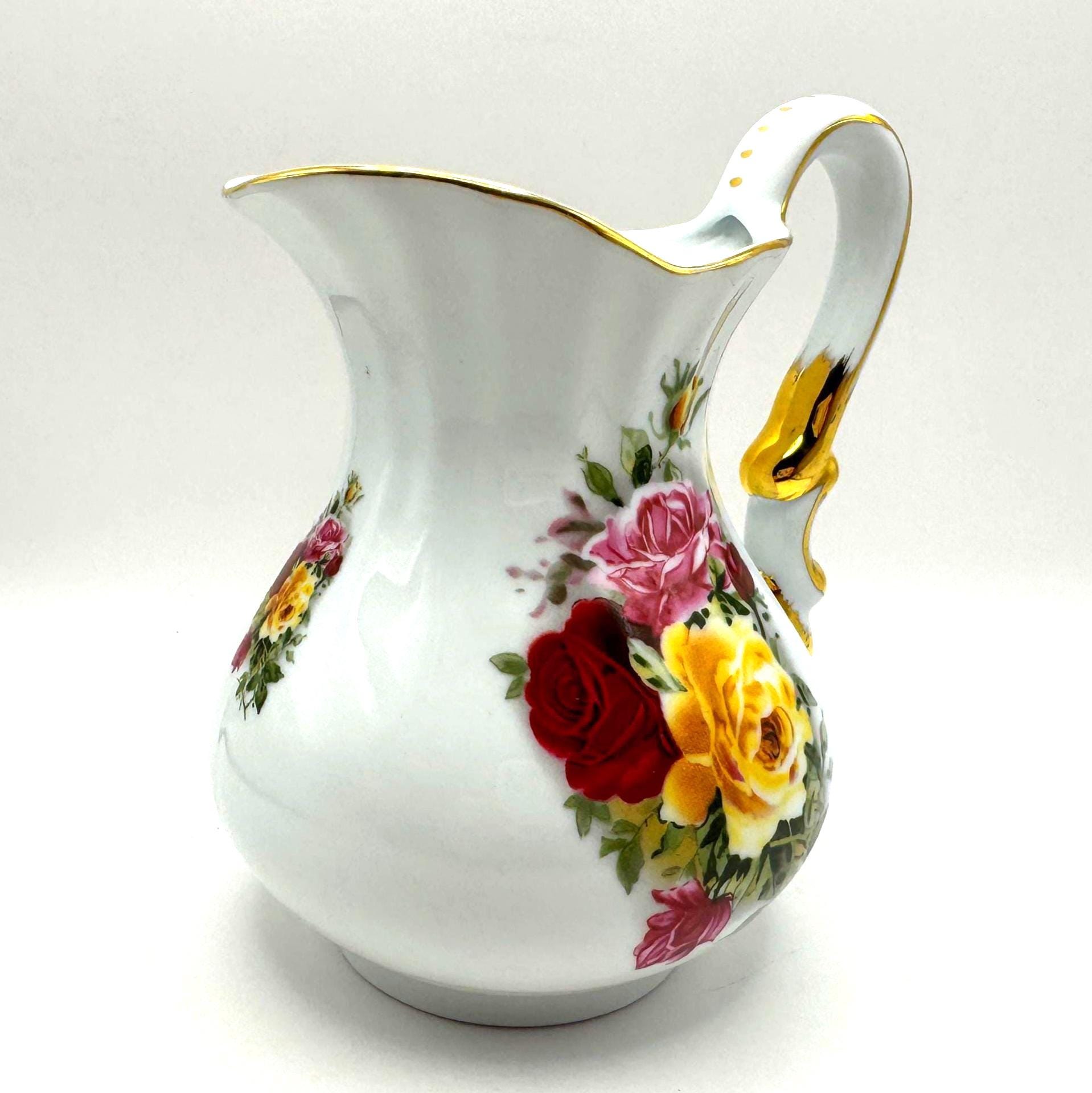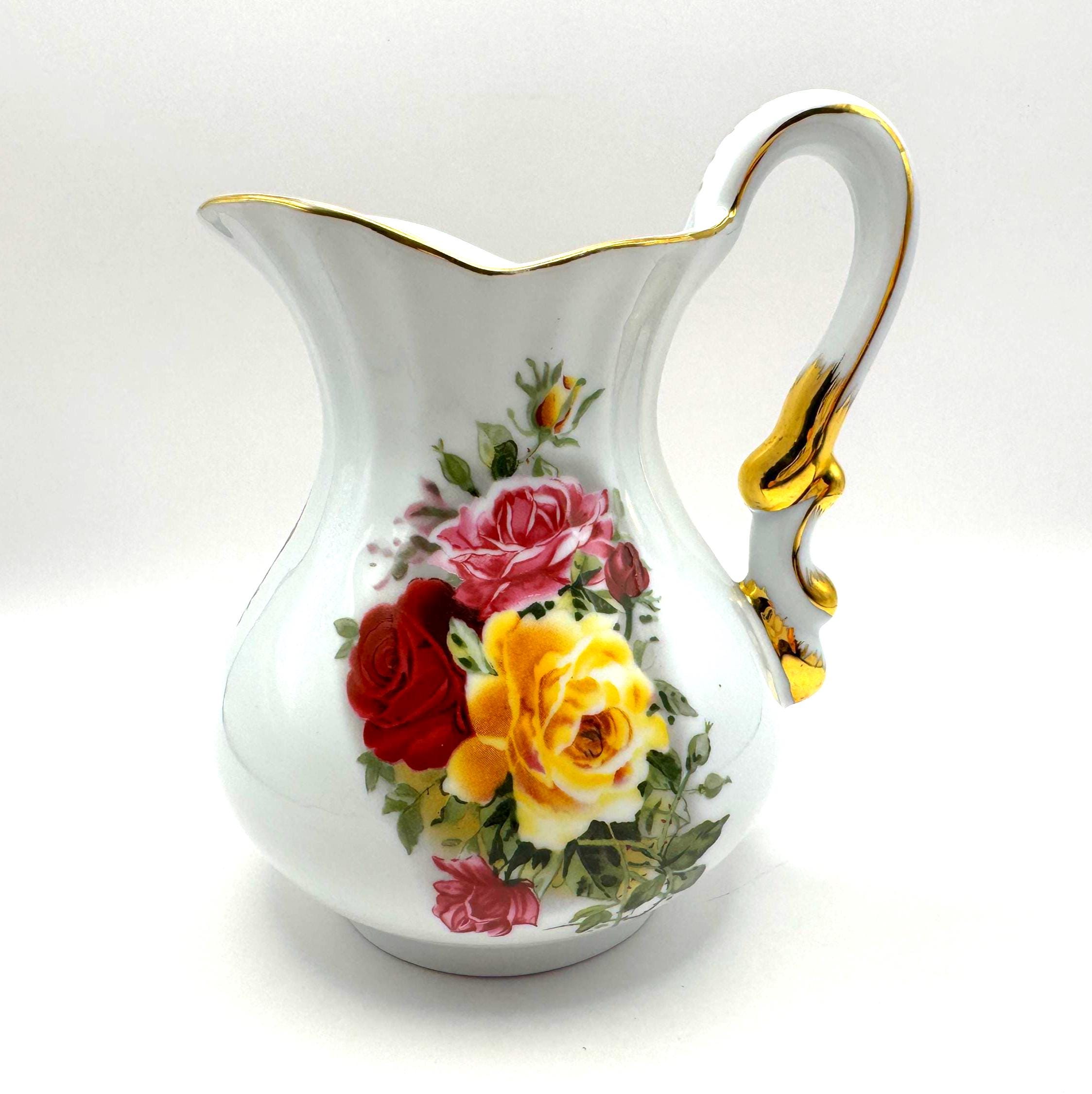 A charming porcelain pitcher from the Victoria's Garden collection, featuring a classic bouquet of red, pink, and yellow roses on Hoth sides and elegant gold-trim detailing along the rim and ornate handle. This piece gives all the vintage cottage charm---perfect for display, holding faux stems, or adding a romantic touch to your vanity, dresser, or dining room.
