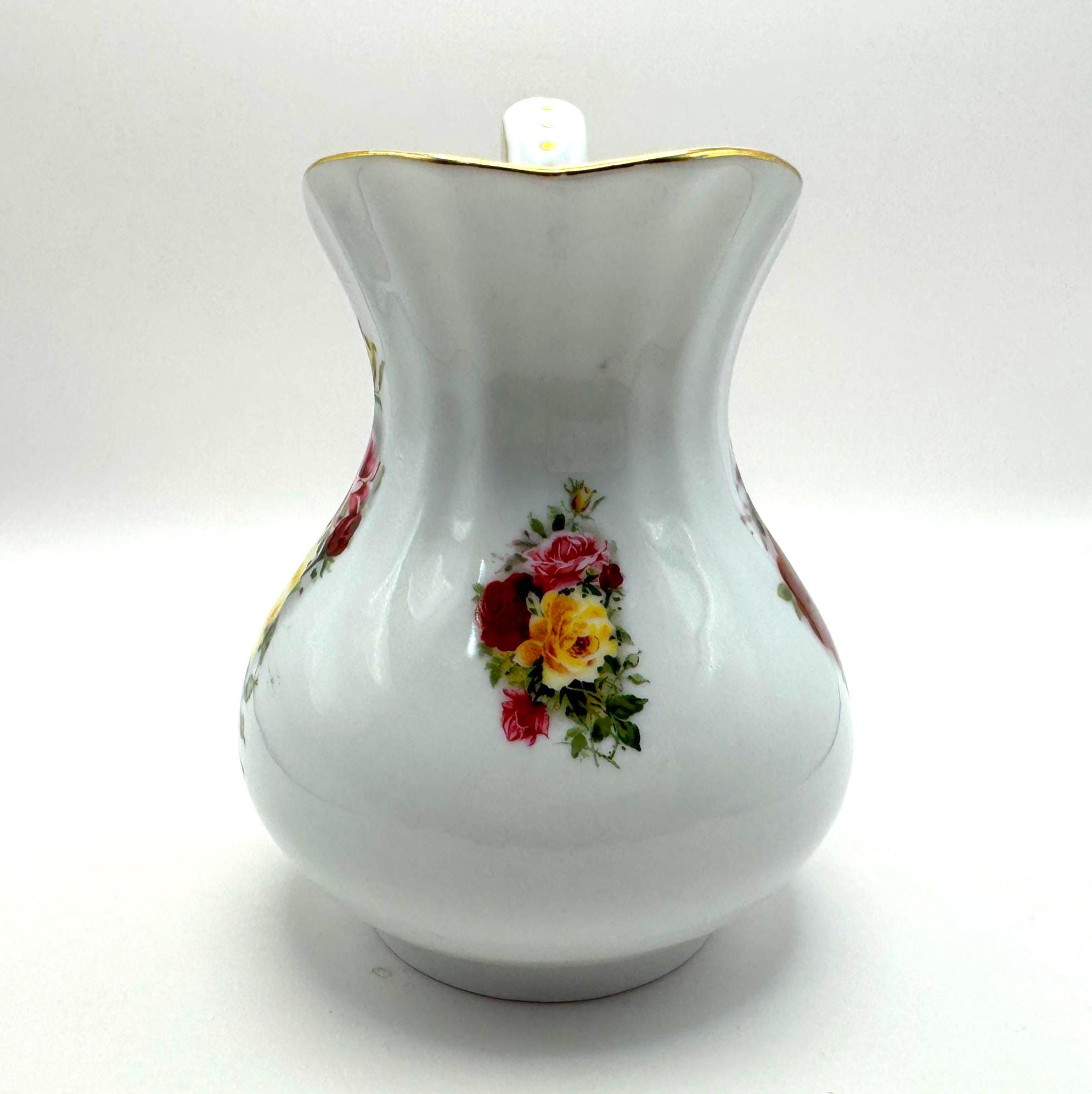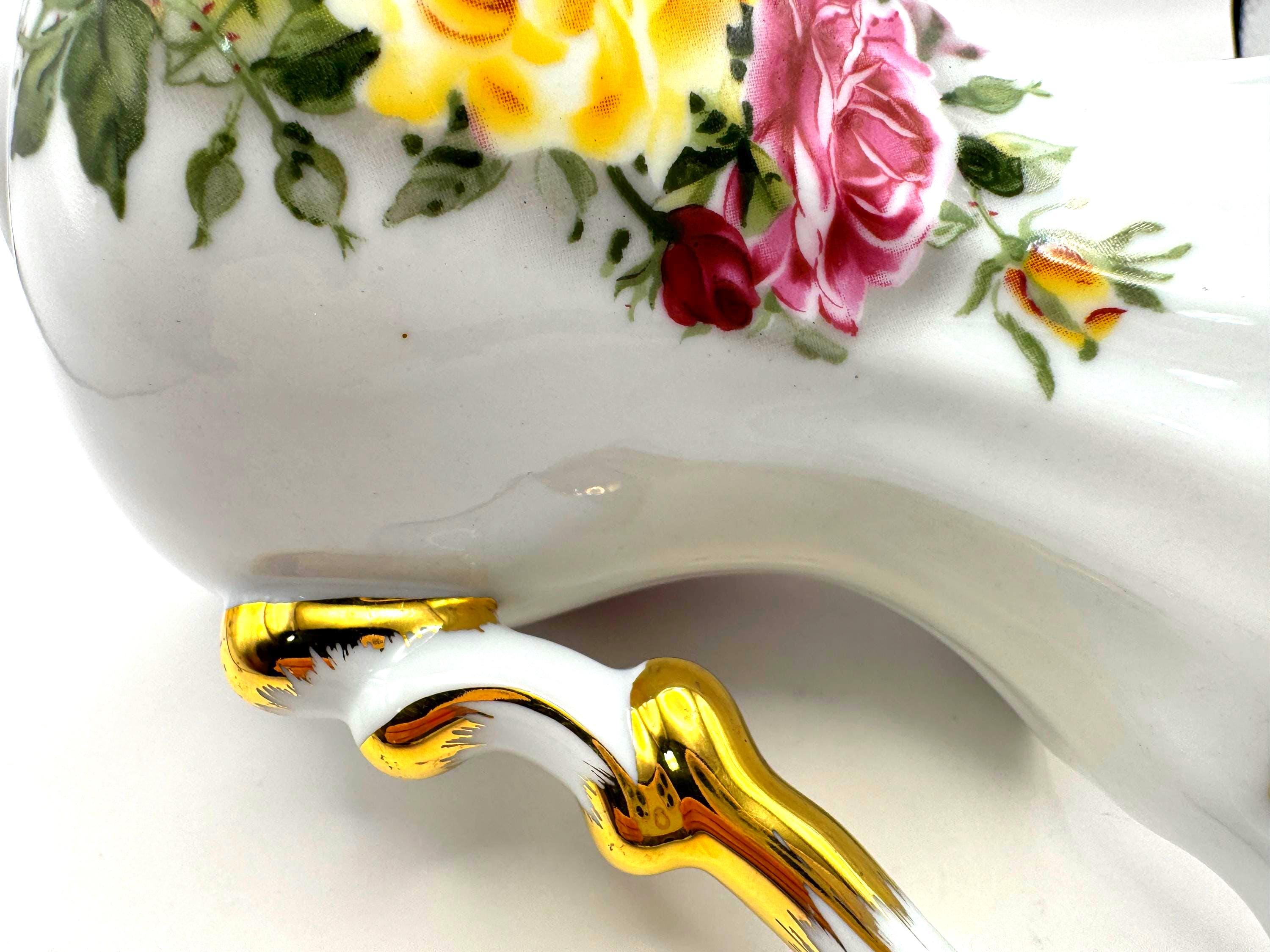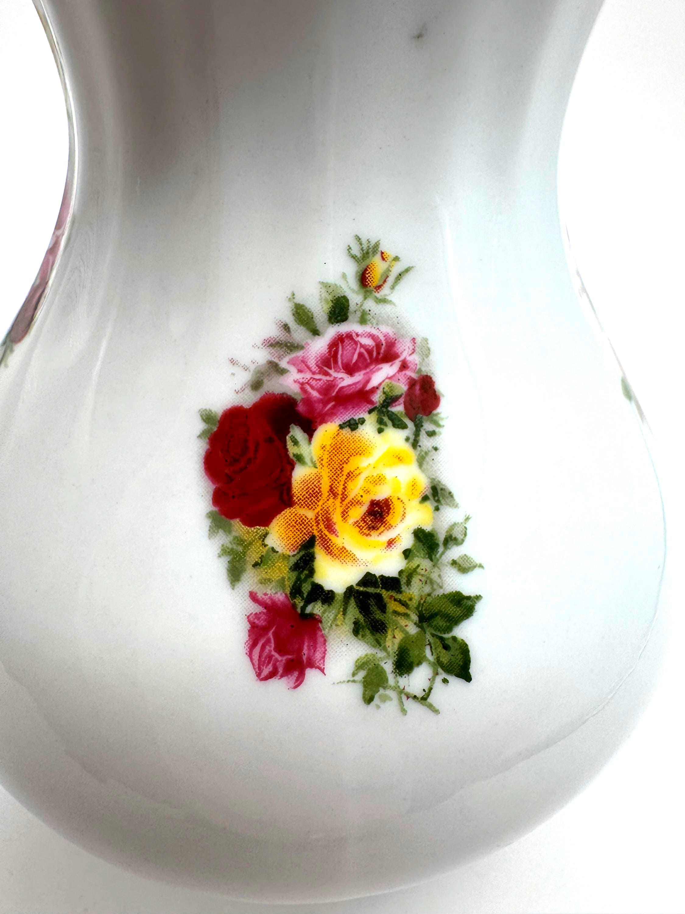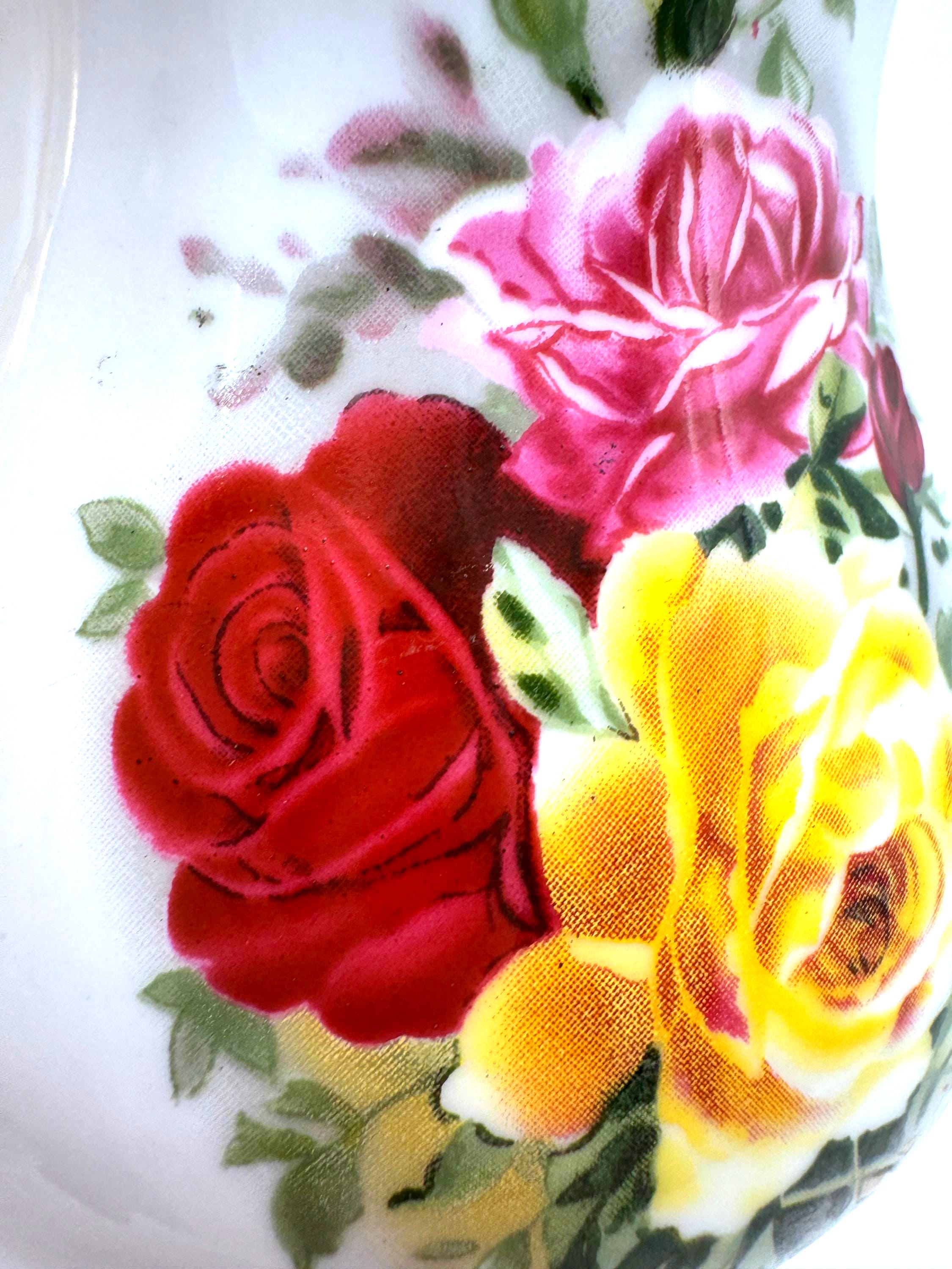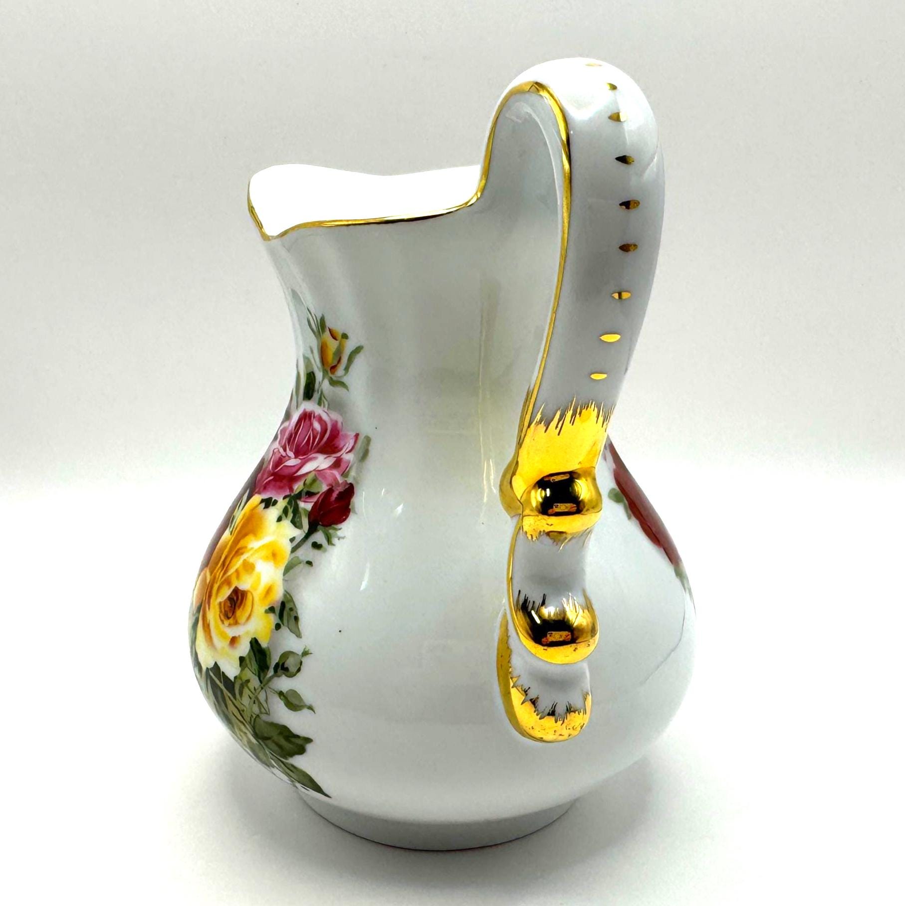 A charming porcelain pitcher from the Victoria's Garden collection, featuring a classic bouquet of red, pink, and yellow roses on Hoth sides and elegant gold-trim detailing along the rim and ornate handle. This piece gives all the vintage cottage charm---perfect for display, holding faux stems, or adding a romantic touch to your vanity, dresser, or dining room.