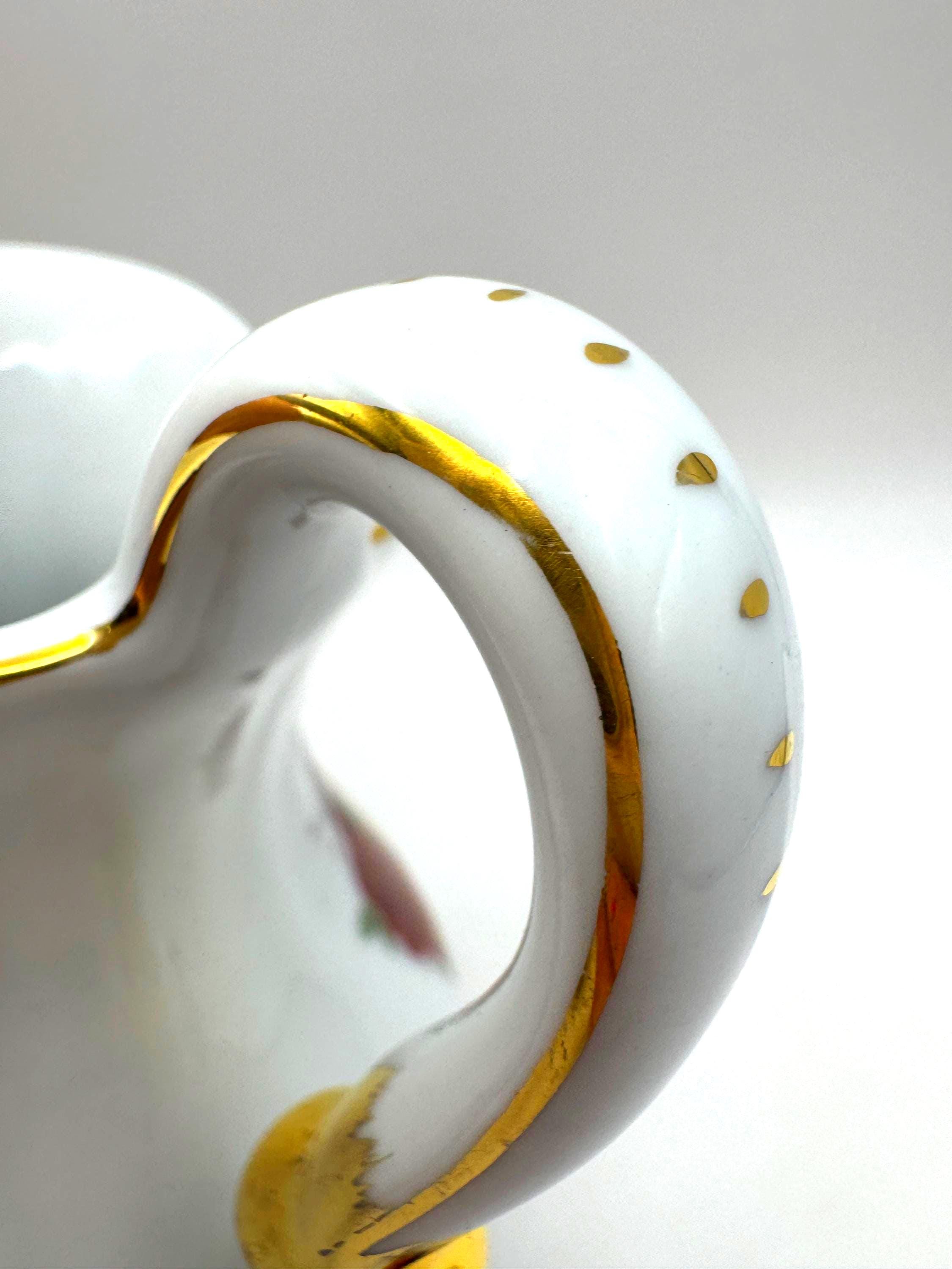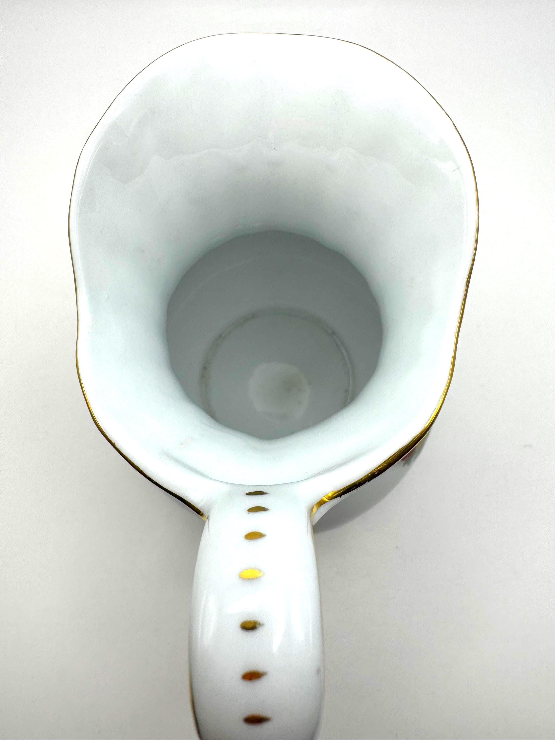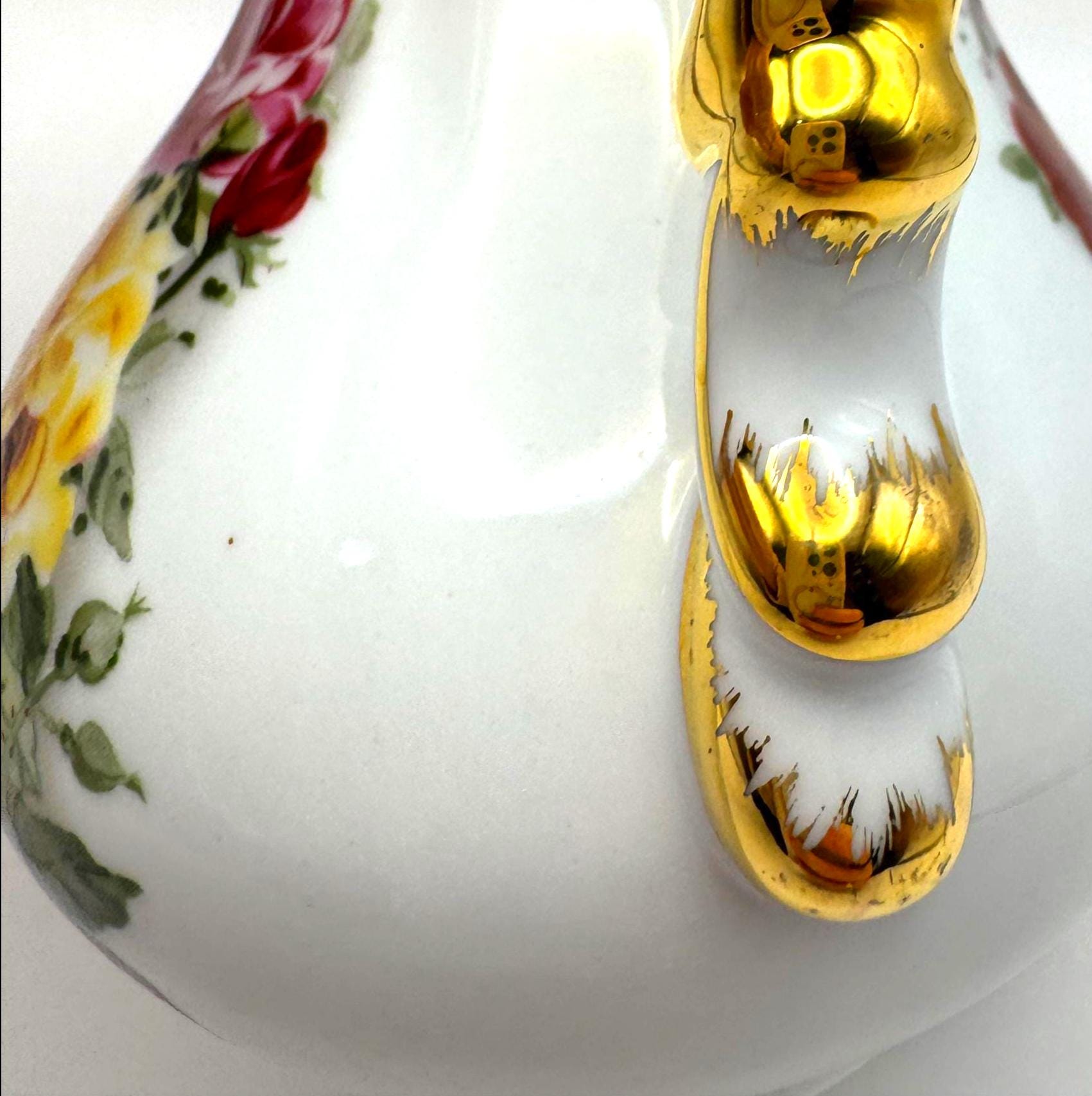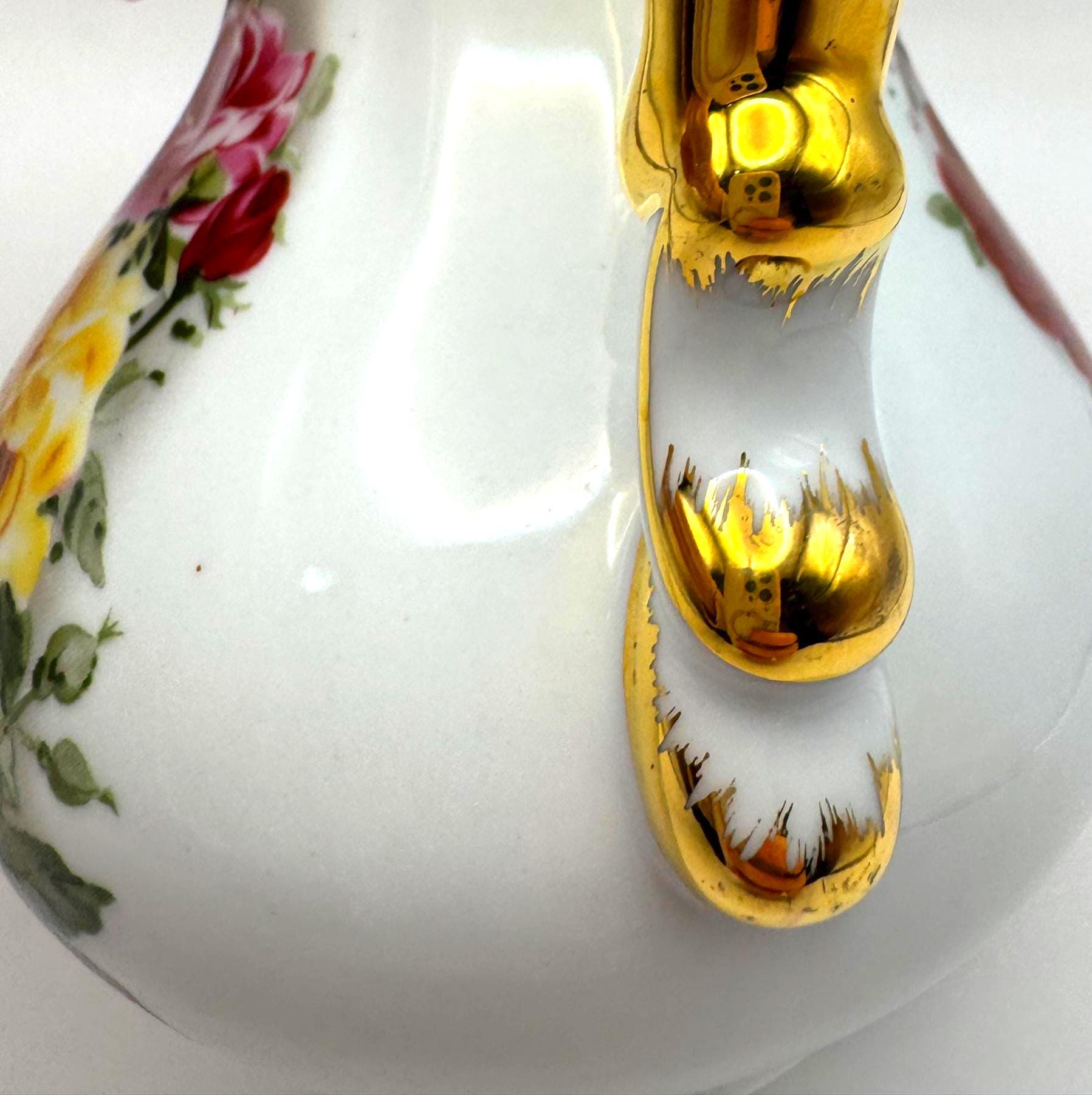 A charming porcelain pitcher from the Victoria's Garden collection, featuring a classic bouquet of red, pink, and yellow roses on Hoth sides and elegant gold-trim detailing along the rim and ornate handle. This piece gives all the vintage cottage charm---perfect for display, holding faux stems, or adding a romantic touch to your vanity, dresser, or dining room.