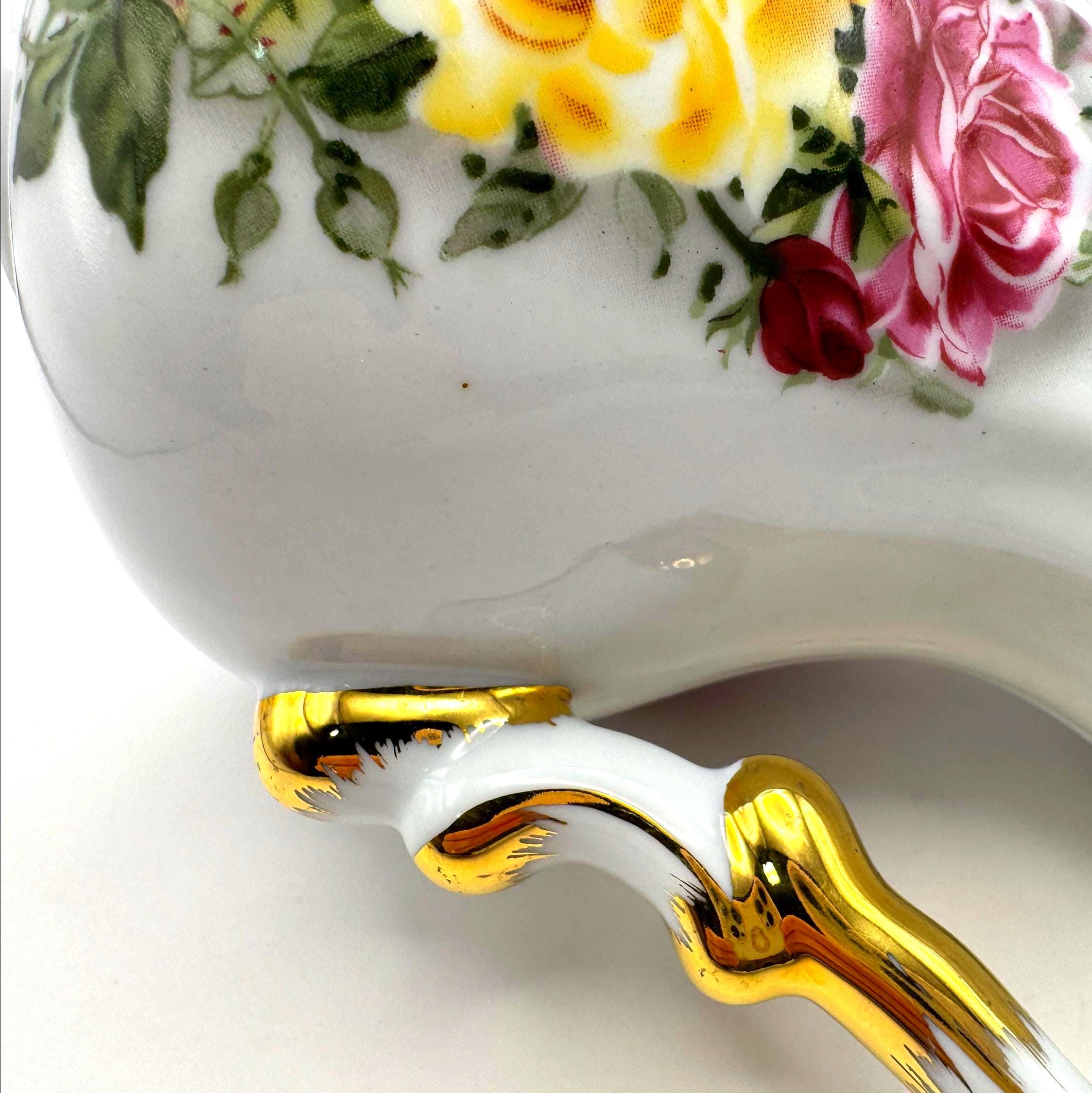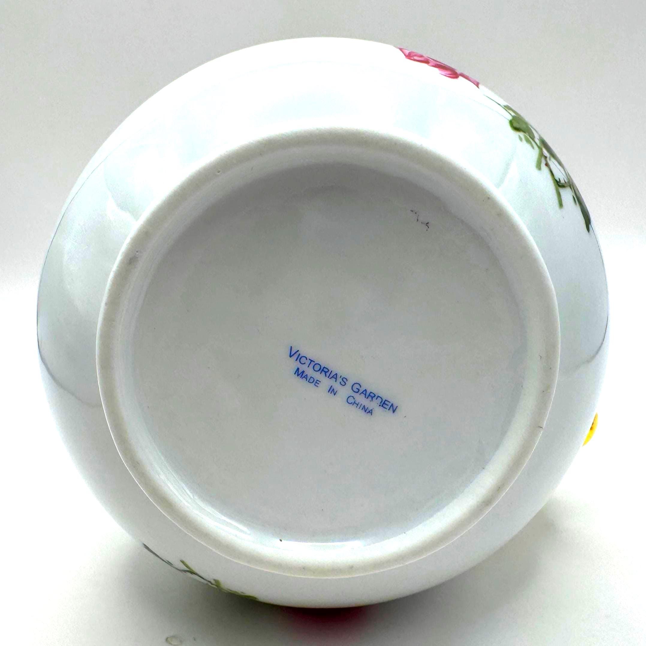Made in China, late 1990s--early 2000 error import decor. The floral design is applied using transfer/airbursh hybrid typical of that time, giving it a soft painterly look. Gold accents bright and intact with only minimal age-related wear.