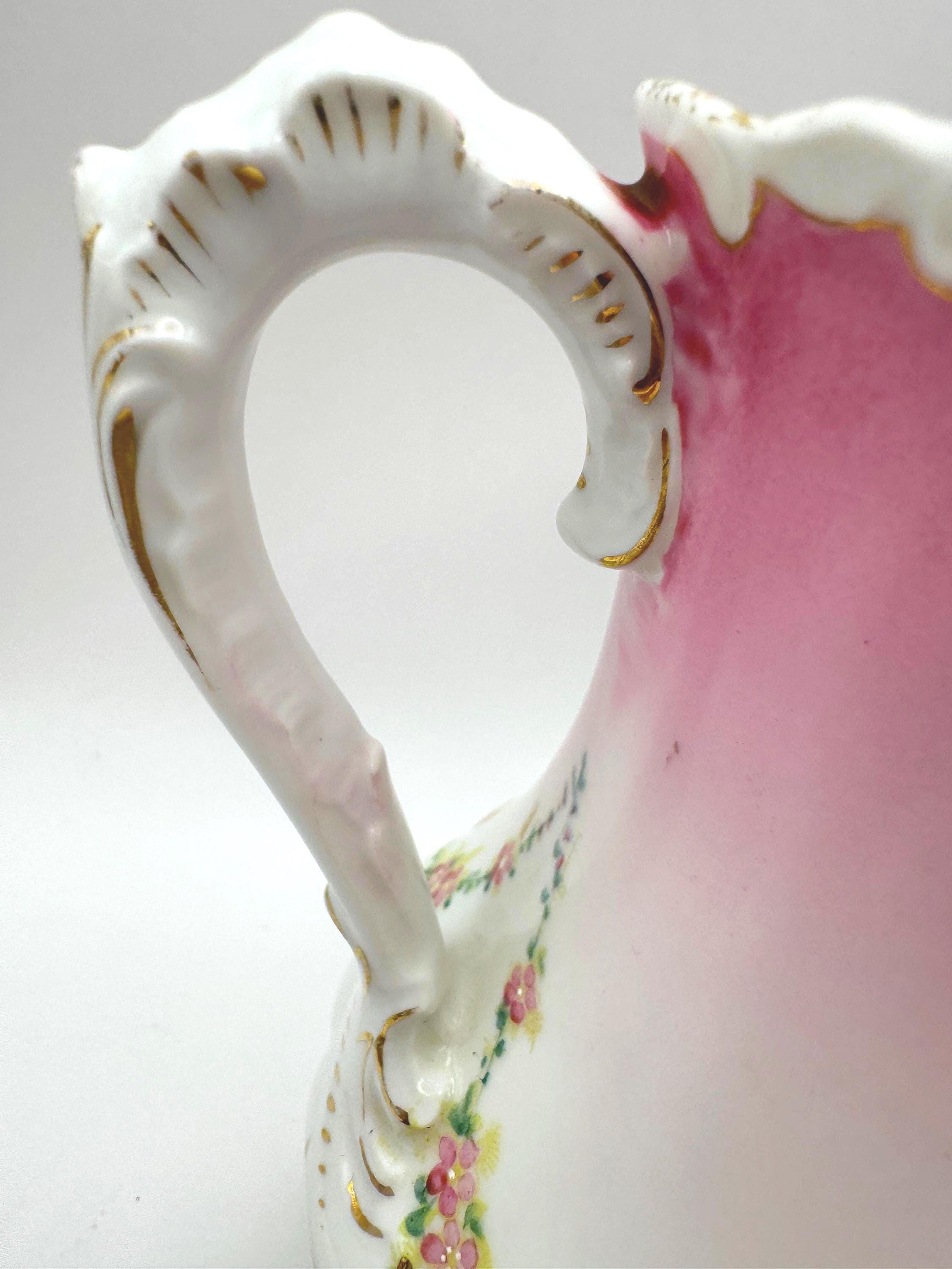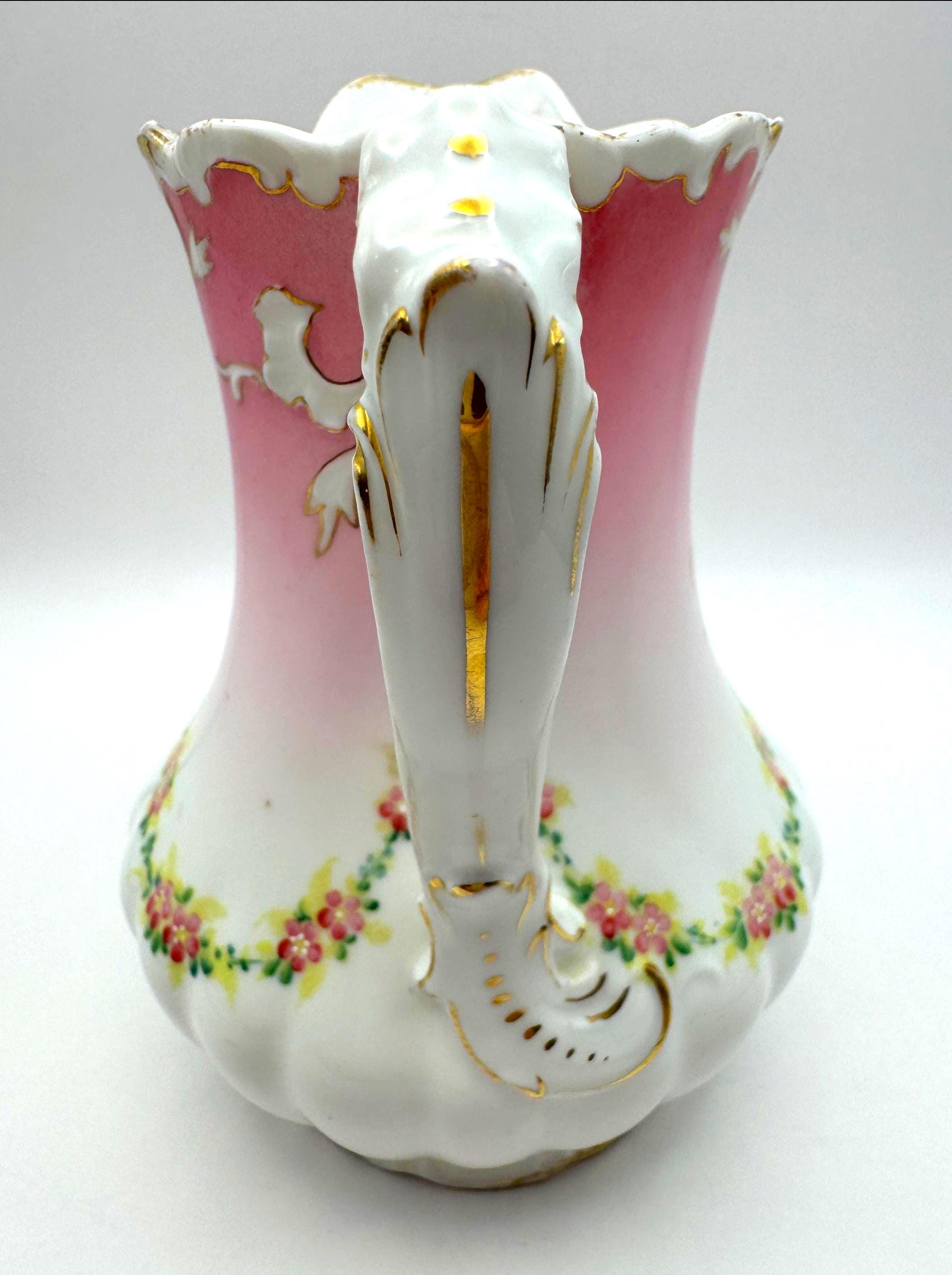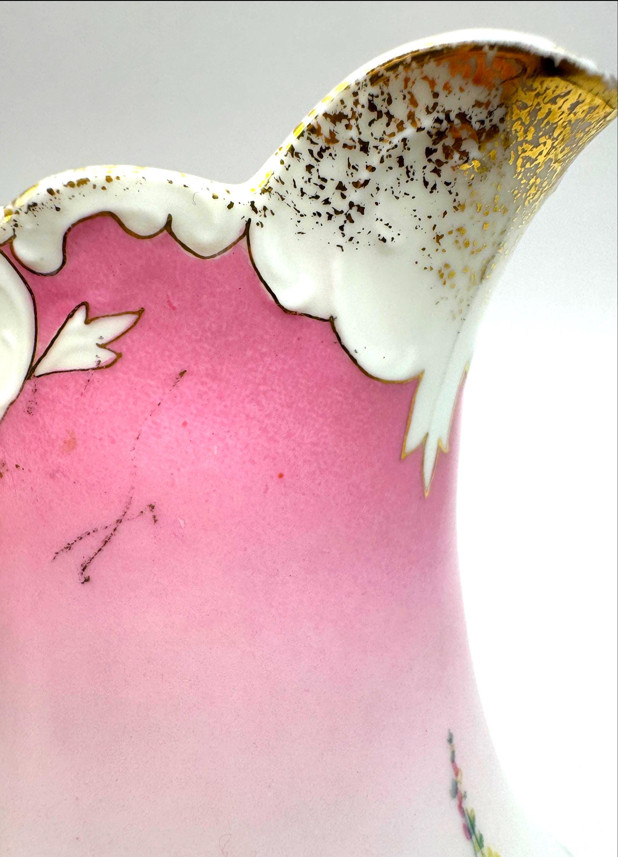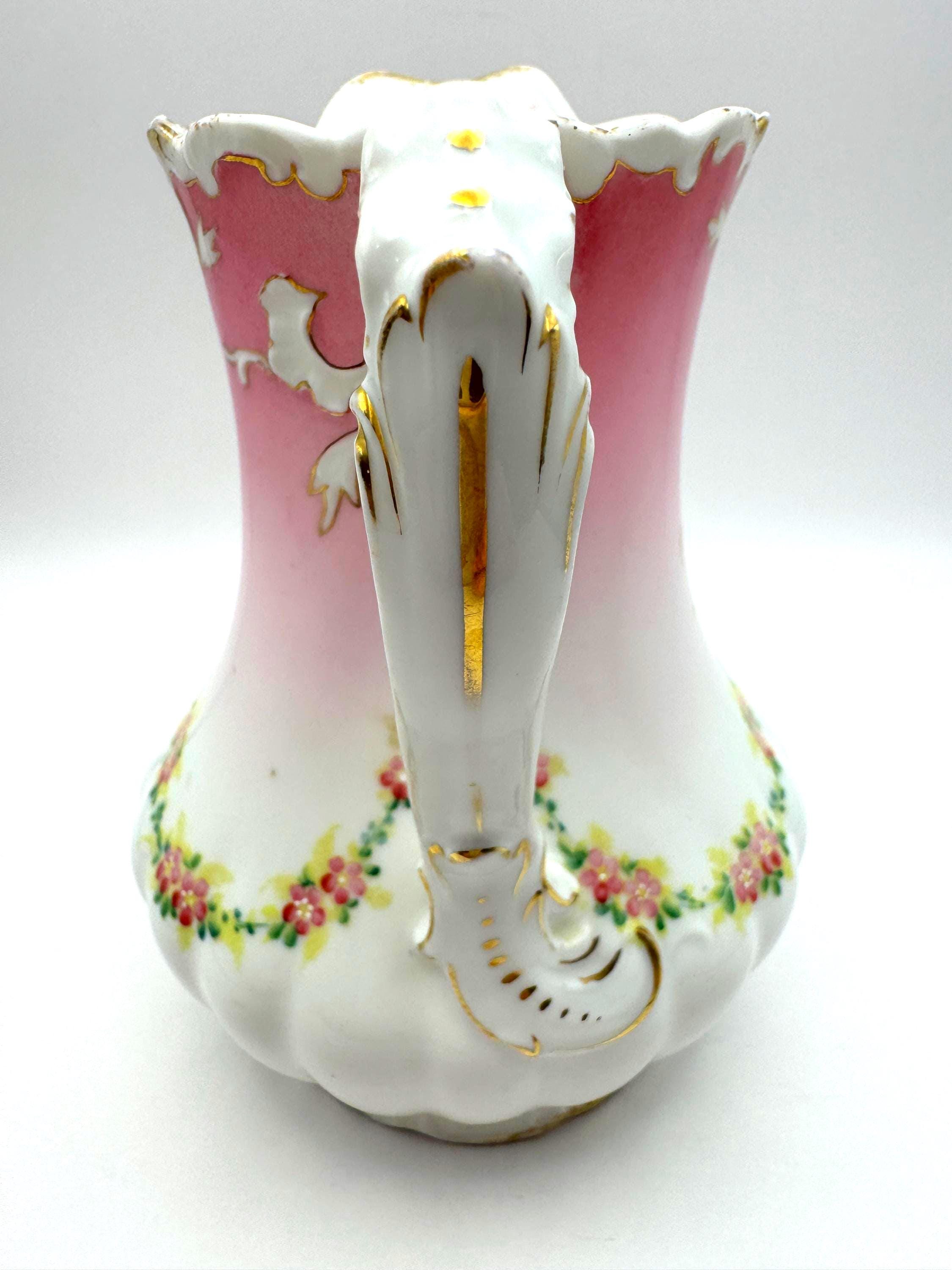 Bring a touch of true Victorian charm to your home with this beautiful antique Austrian porcelain pitcher, marked Orleans China--Made in Austria and dating from the 1890-1910 era. This piece features the classic blushware look; a soft gradient of pink fading to white, ornate molded scrollwork, and generous original gold trim.