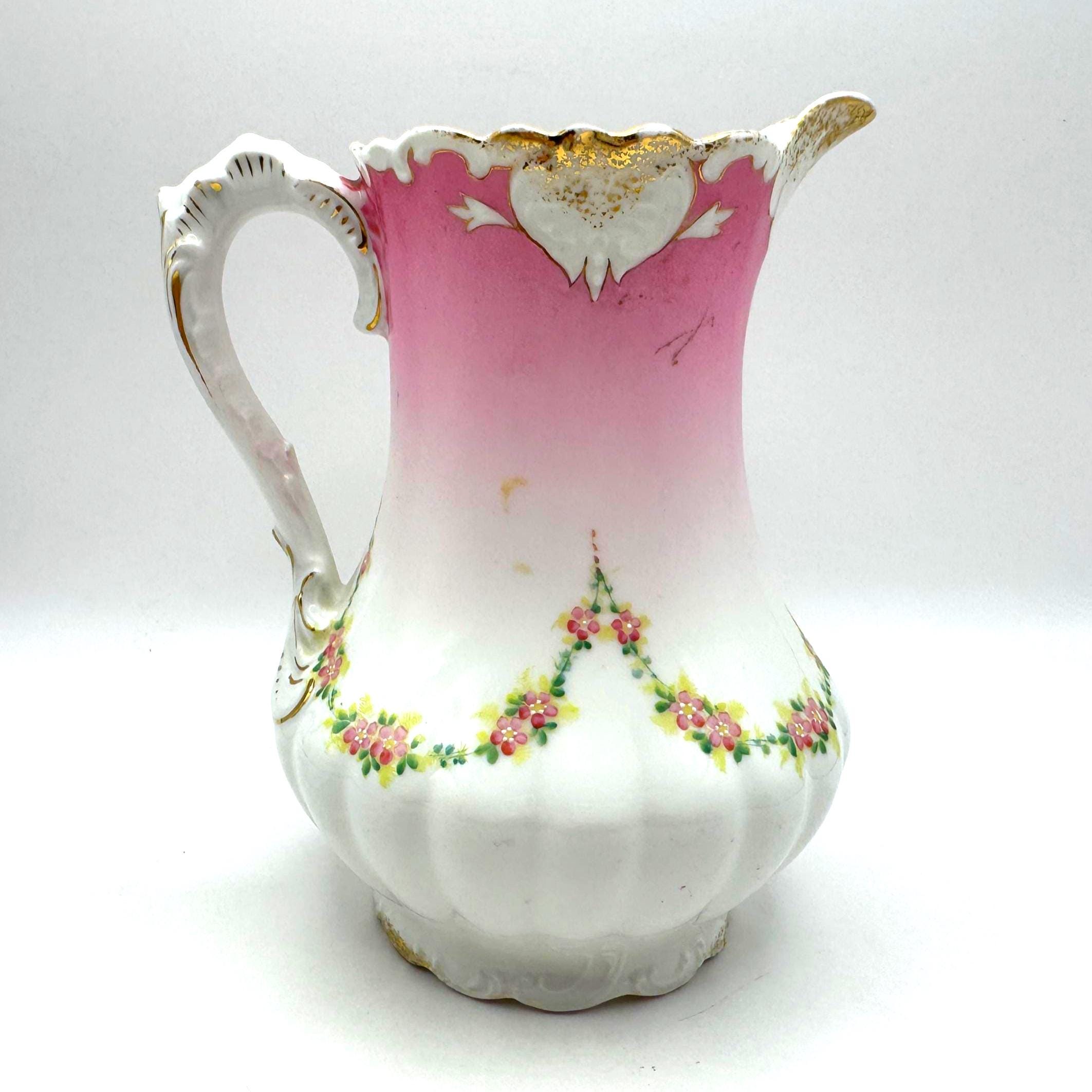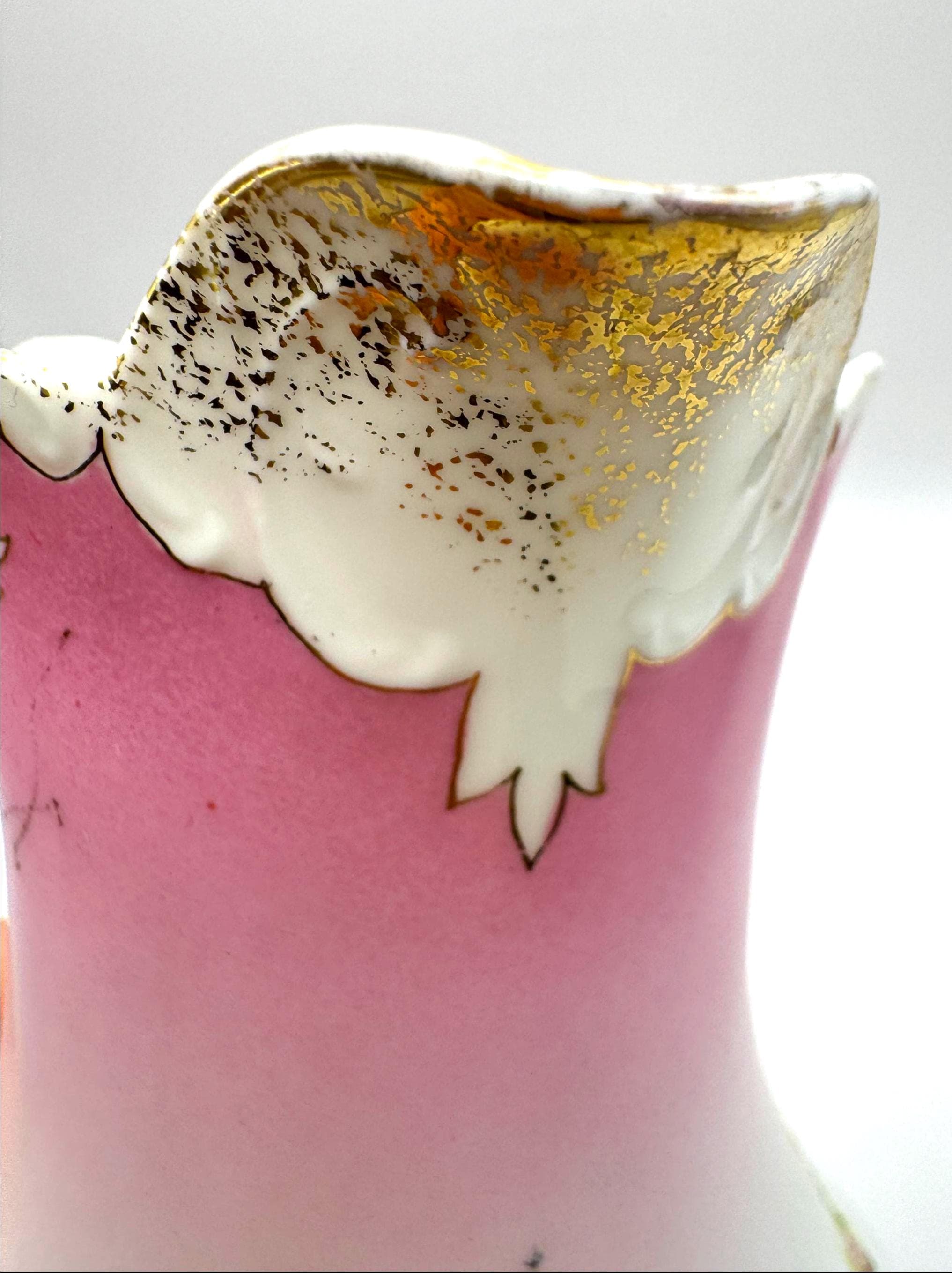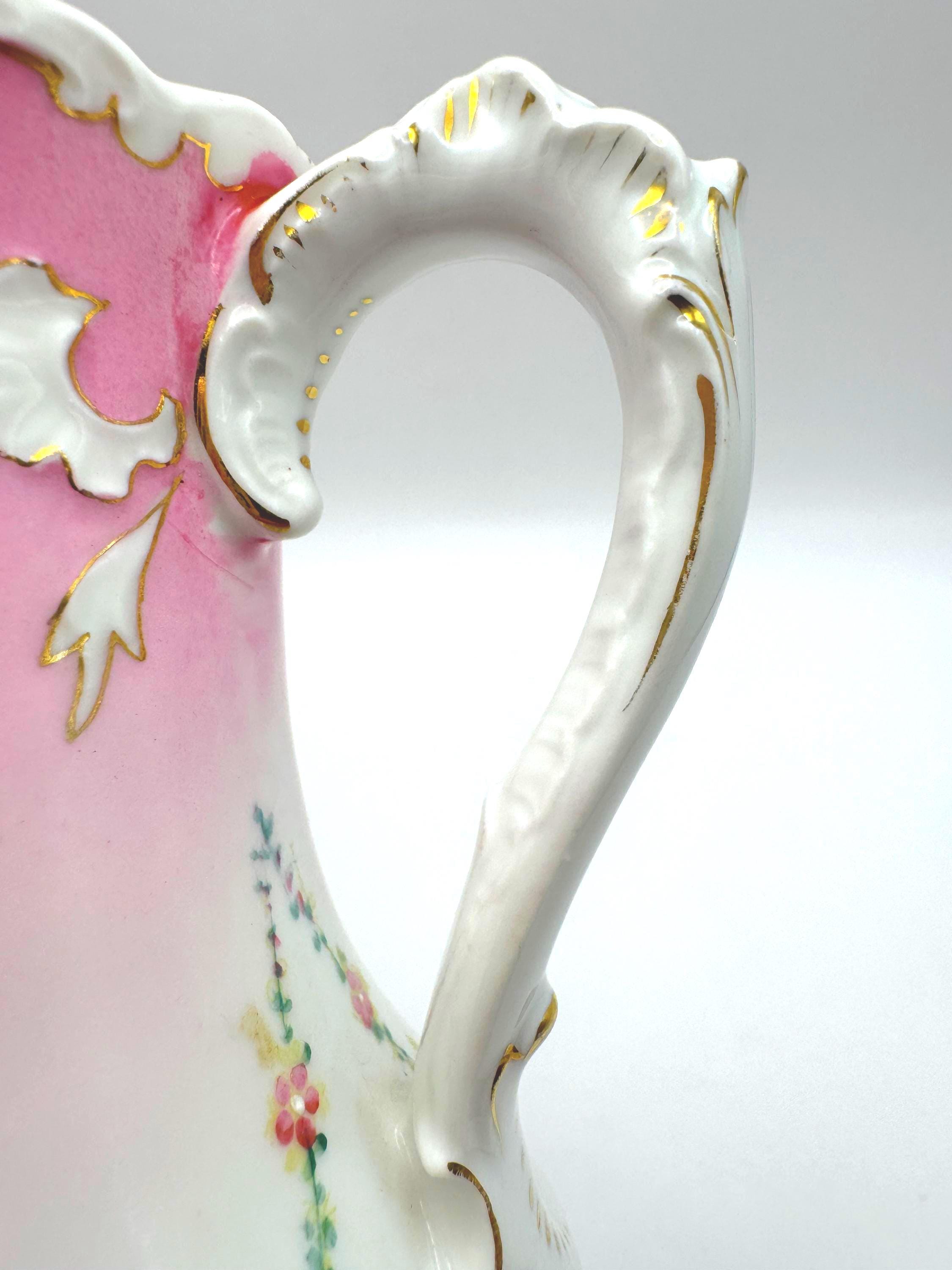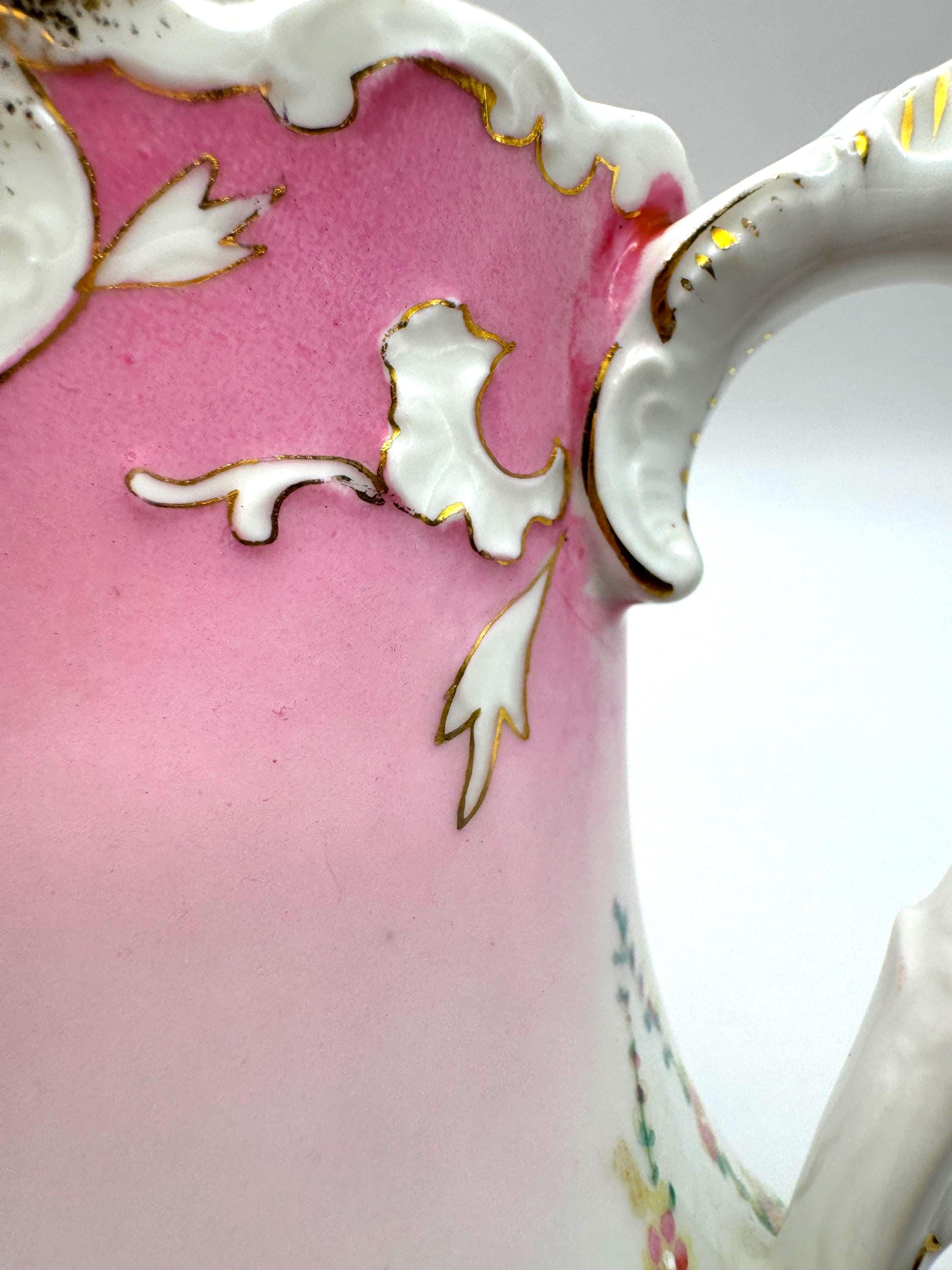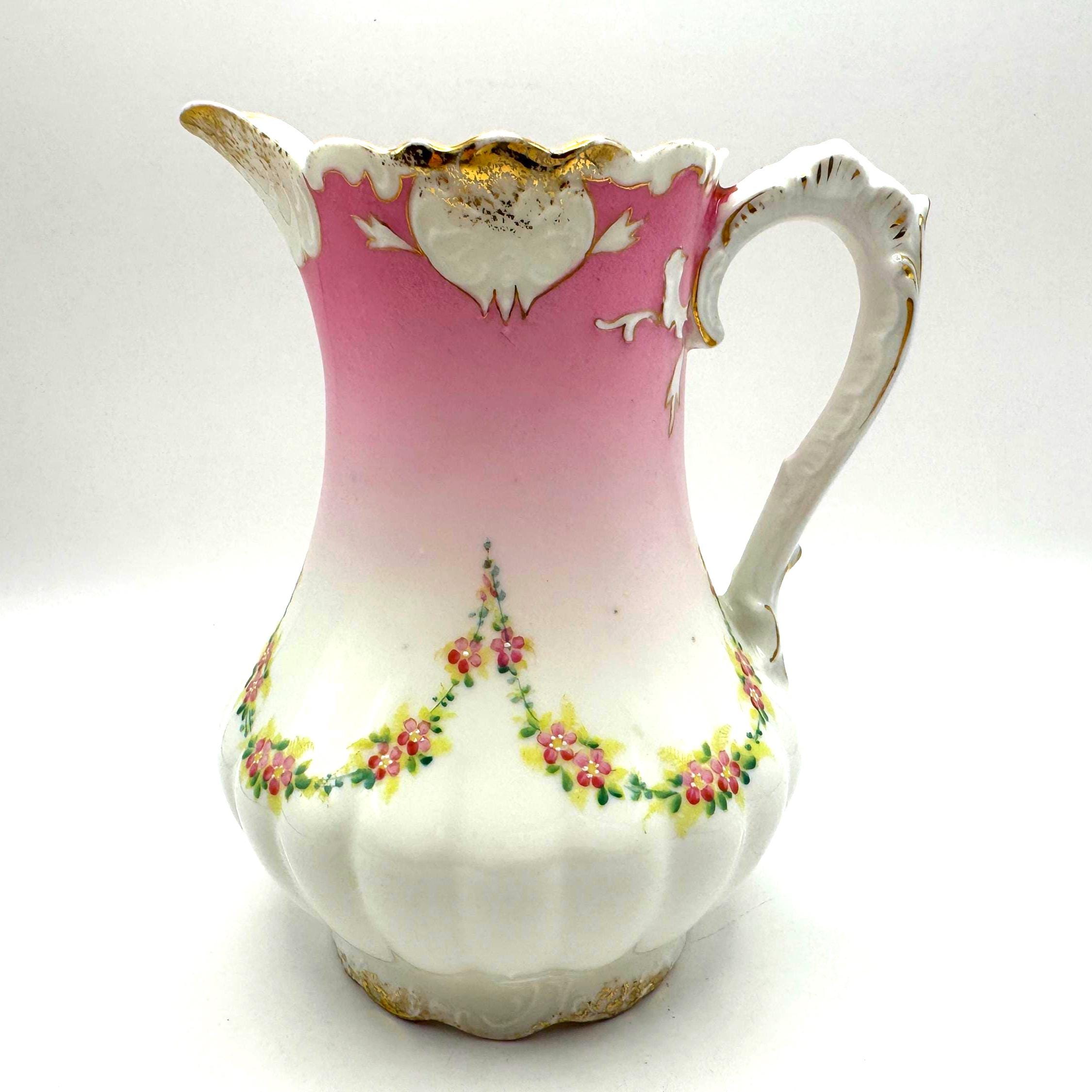 Bring a touch of true Victorian charm to your home with this beautiful antique Austrian porcelain pitcher, marked Orleans China--Made in Austria and dating from the 1890-1910 era. This piece features the classic blushware look; a soft gradient of pink fading to white, ornate molded scrollwork, and generous original gold trim.