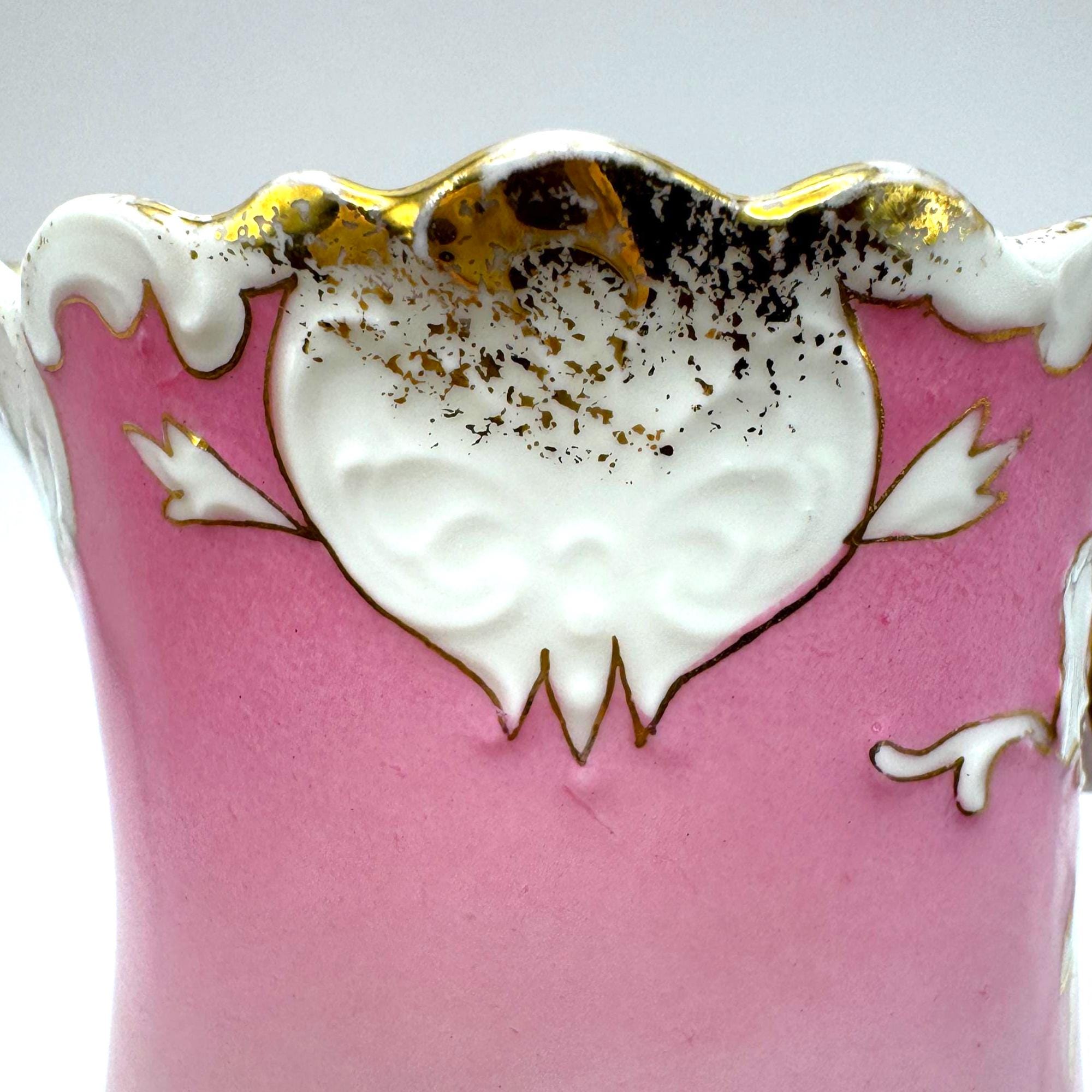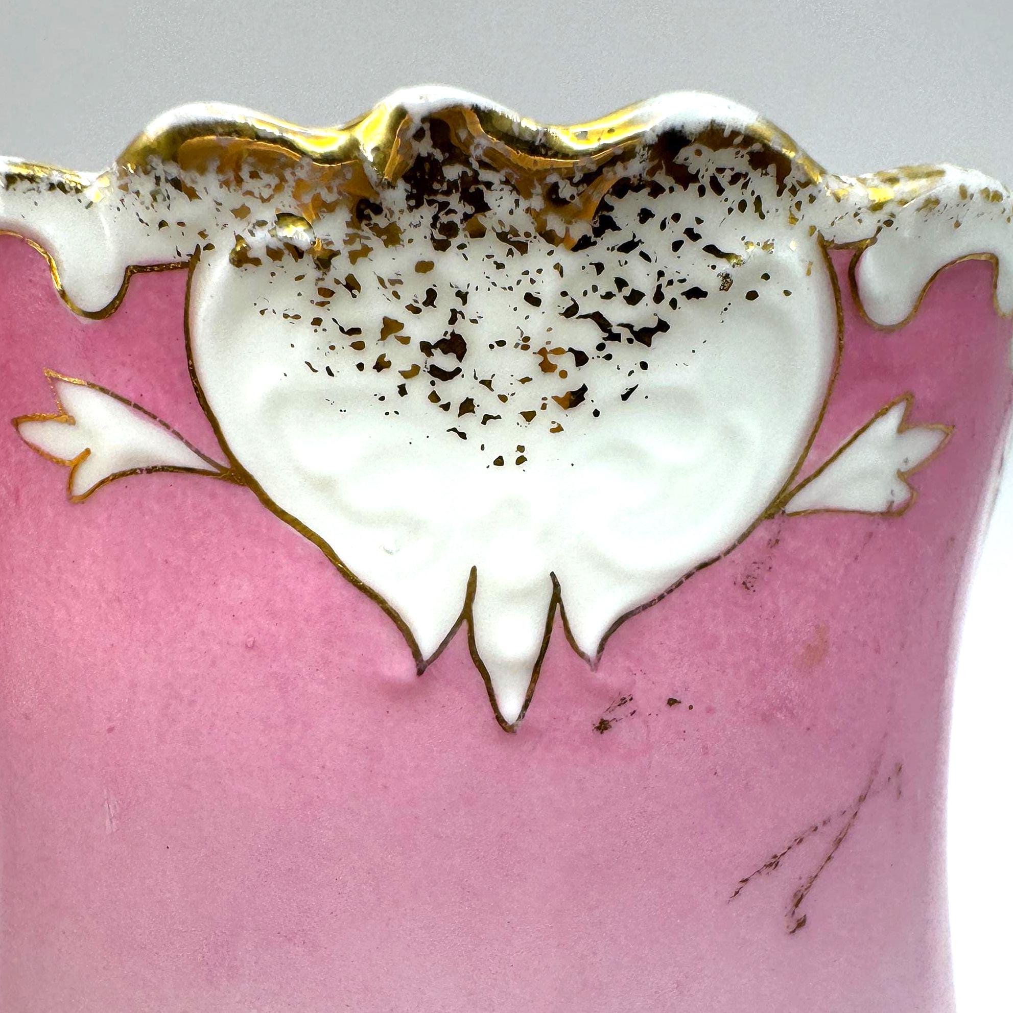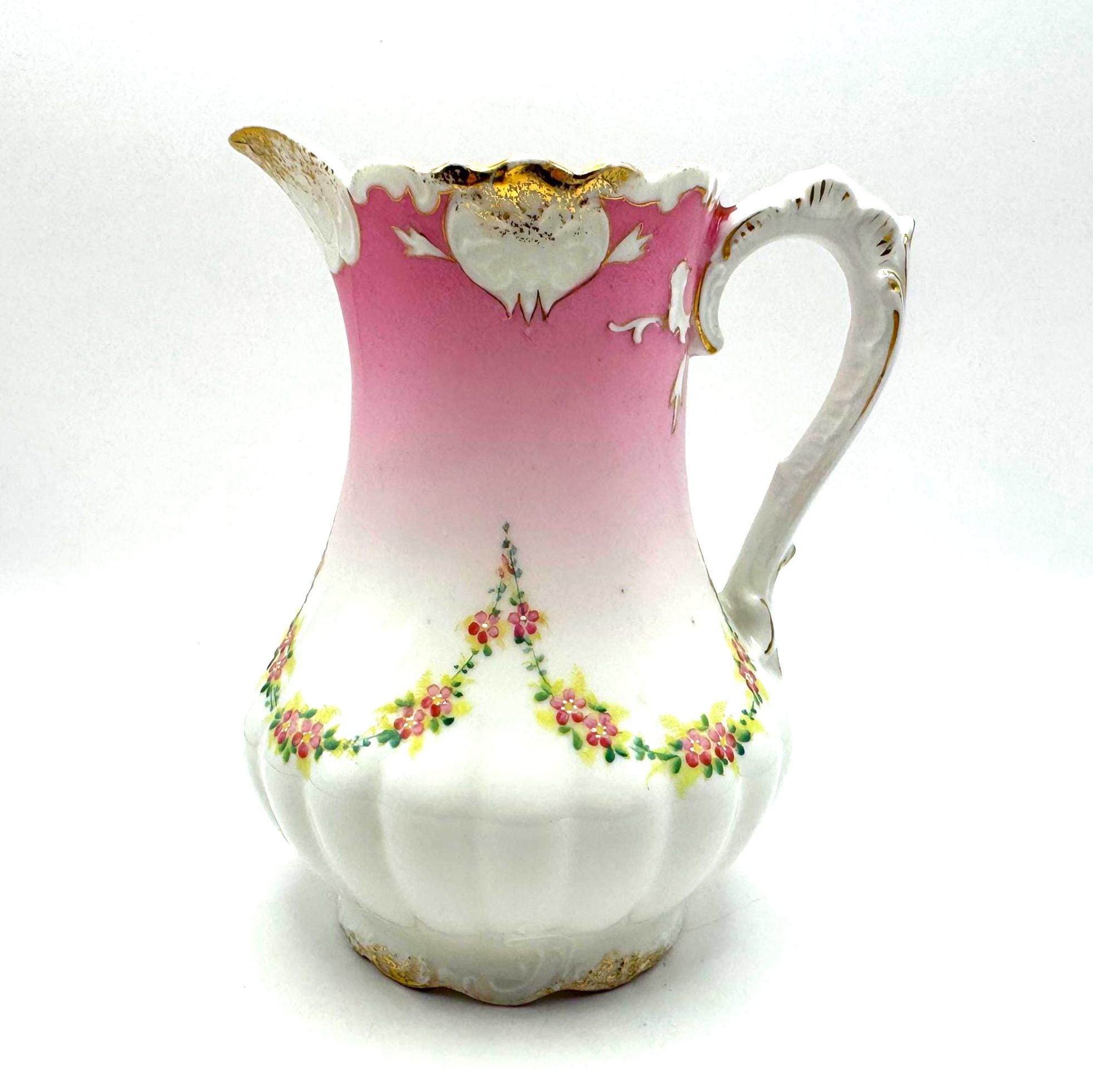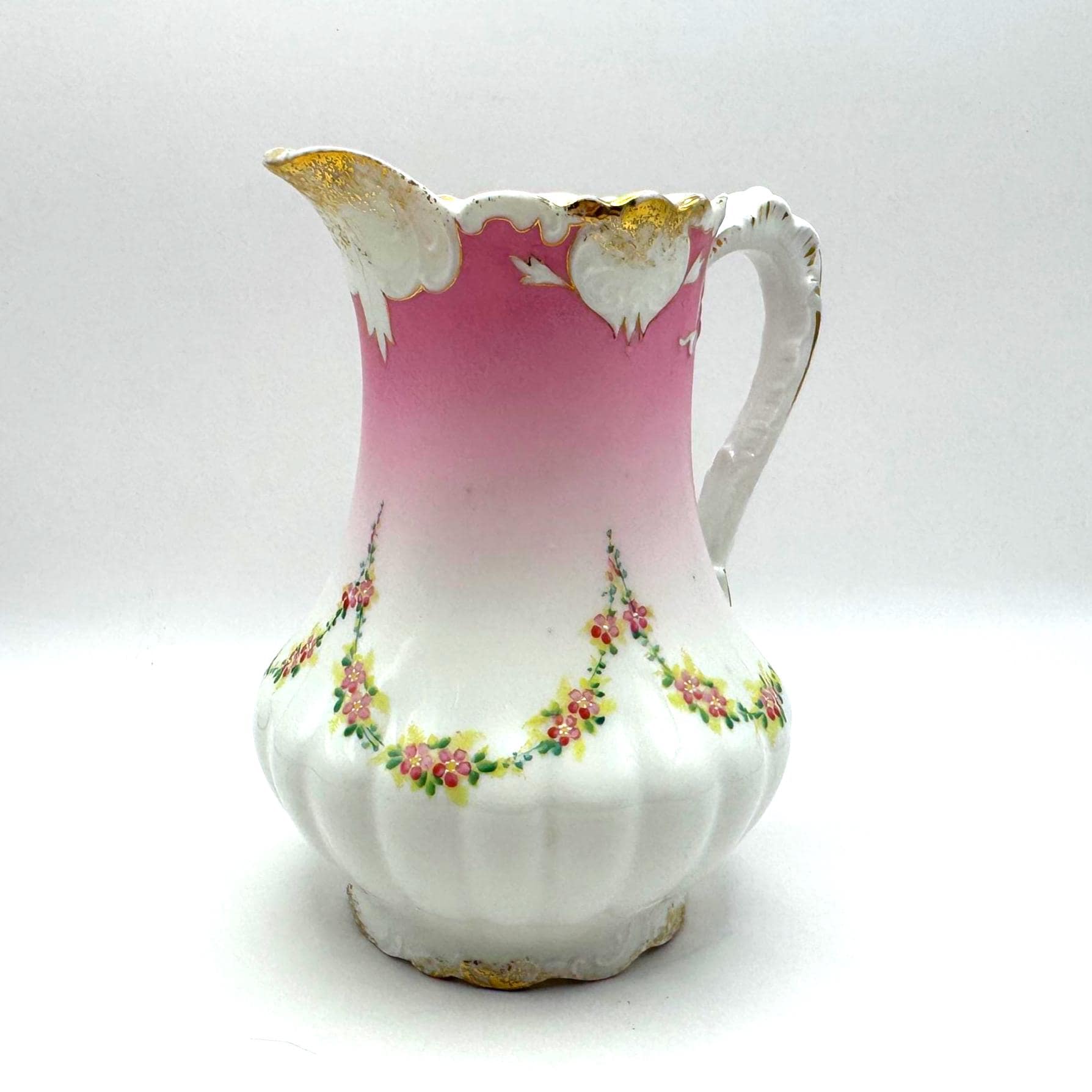 Bring a touch of true Victorian charm to your home with this beautiful antique Austrian porcelain pitcher, marked Orleans China--Made in Austria and dating from the 1890-1910 era. This piece features the classic blushware look; a soft gradient of pink fading to white, ornate molded scrollwork, and generous original gold trim.
