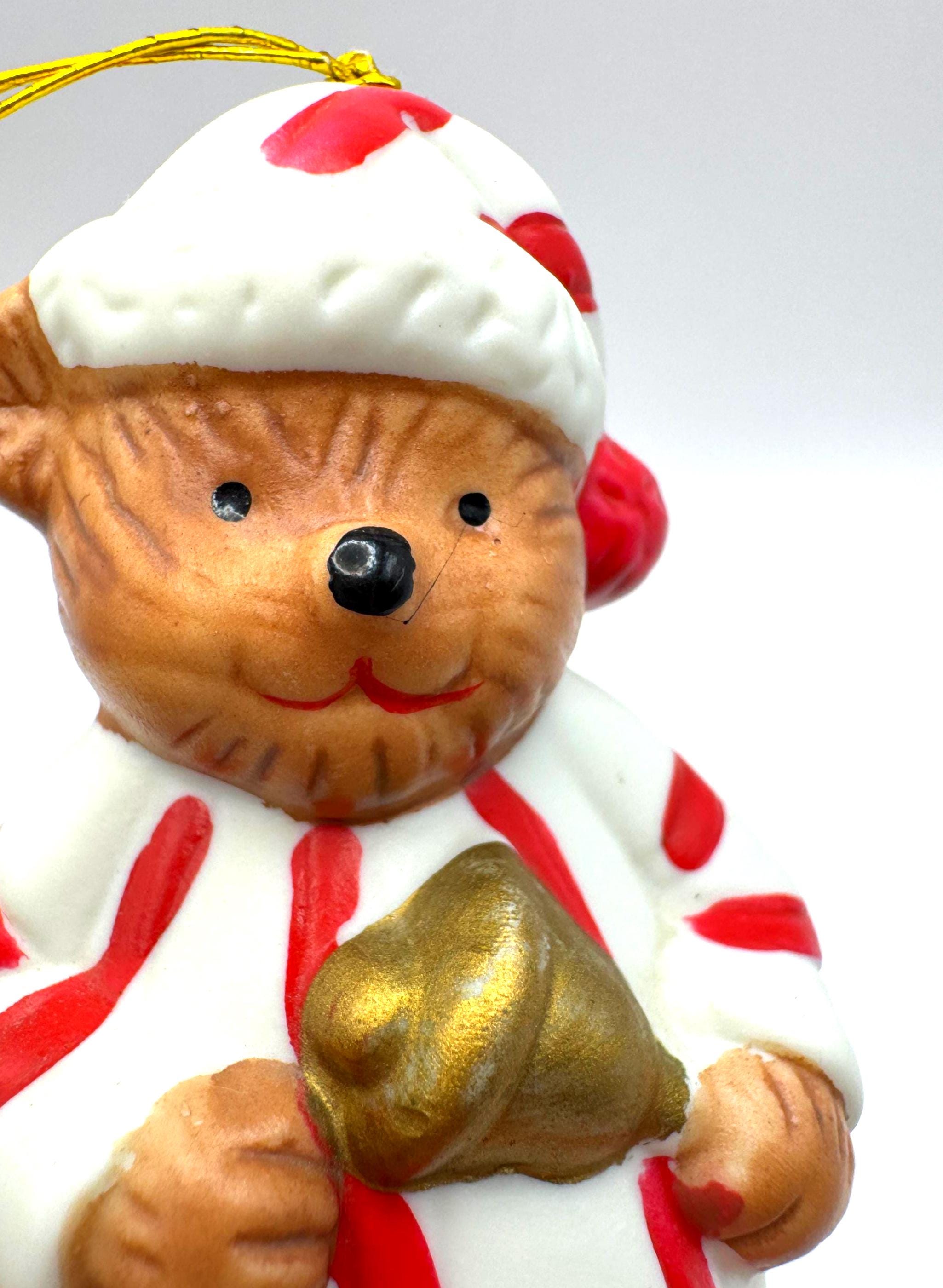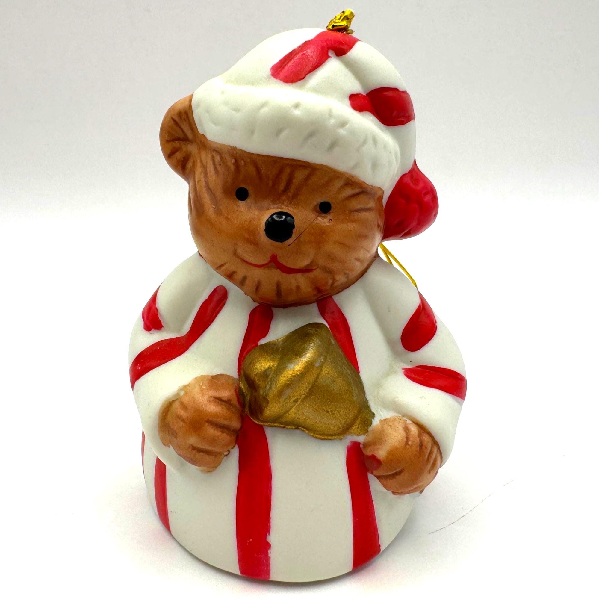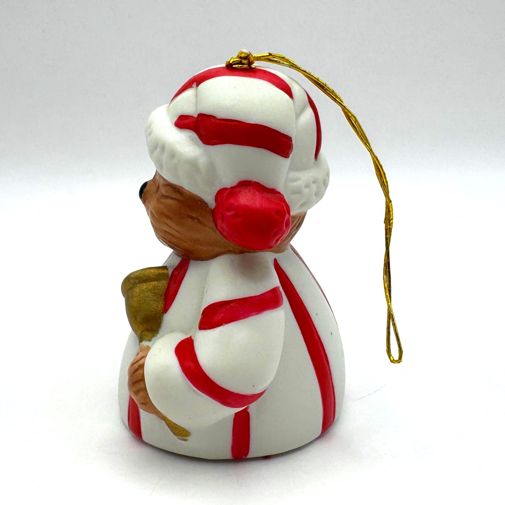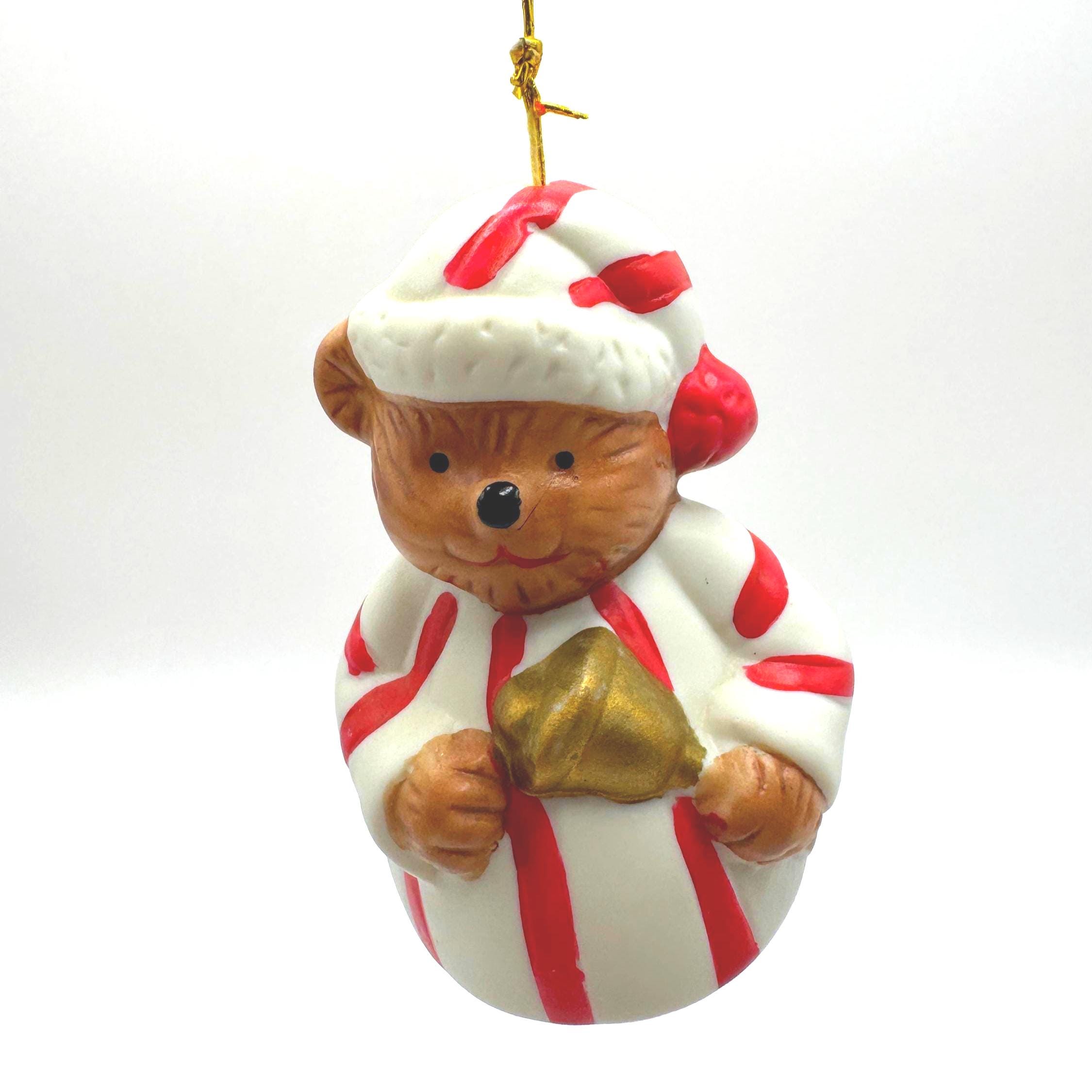 Bring a touch of nostalgic Christmas charm to your tree with this adorable 1985 Giftco Teddy bear bell ornament! This sweet little bear is hand-painted in a candy-cane striped coat with a cozy winter hat and a gold bell held close to his chest. Made in Taiwan, this mid-80s collectible features a cozy peppermint-striped nightgown, a matching nightcap, and a gold bell tucked in the bear's hands.