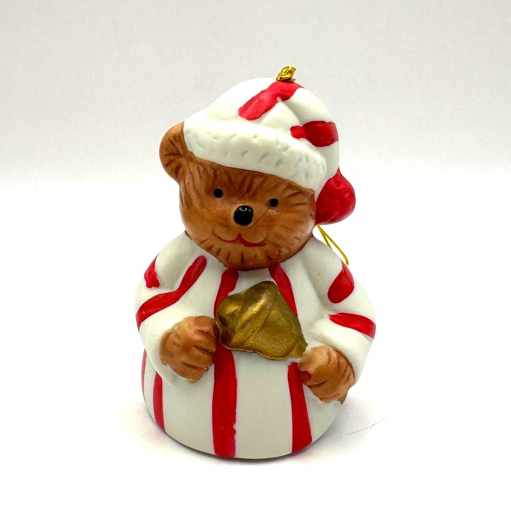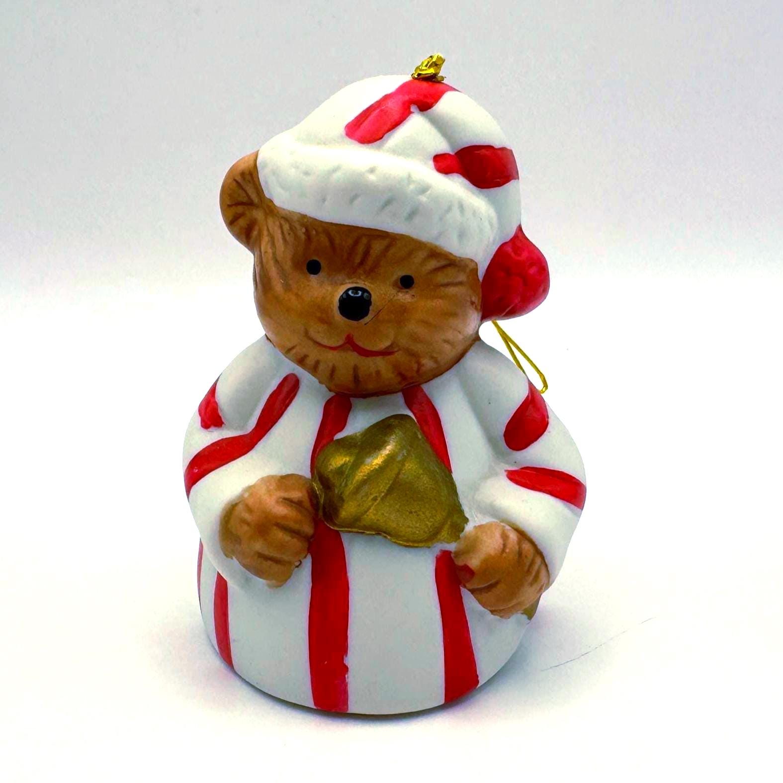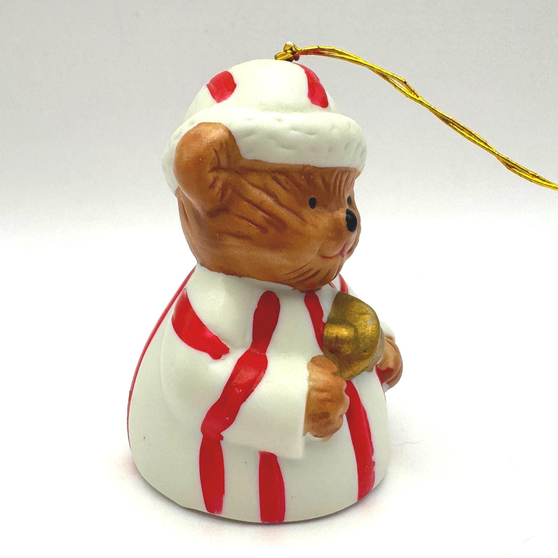 Bring a touch of nostalgic Christmas charm to your tree with this adorable 1985 Giftco Teddy bear bell ornament! This sweet little bear is hand-painted in a candy-cane striped coat with a cozy winter hat and a gold bell held close to his chest. Made in Taiwan, this mid-80s collectible features a cozy peppermint-striped nightgown, a matching nightcap, and a gold bell tucked in the bear's hands.