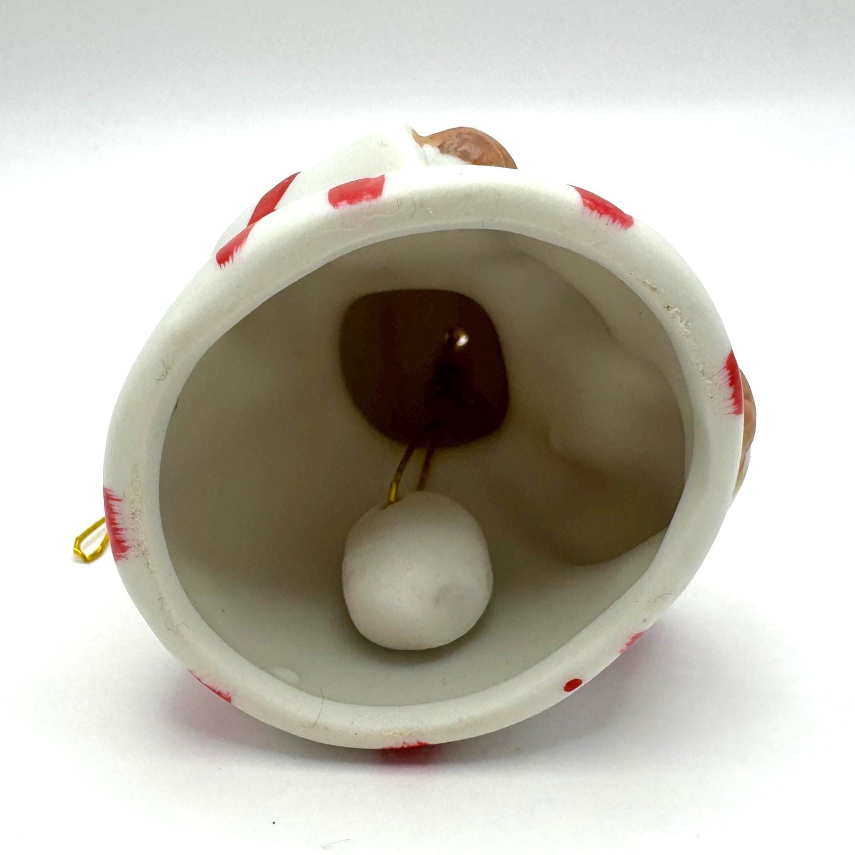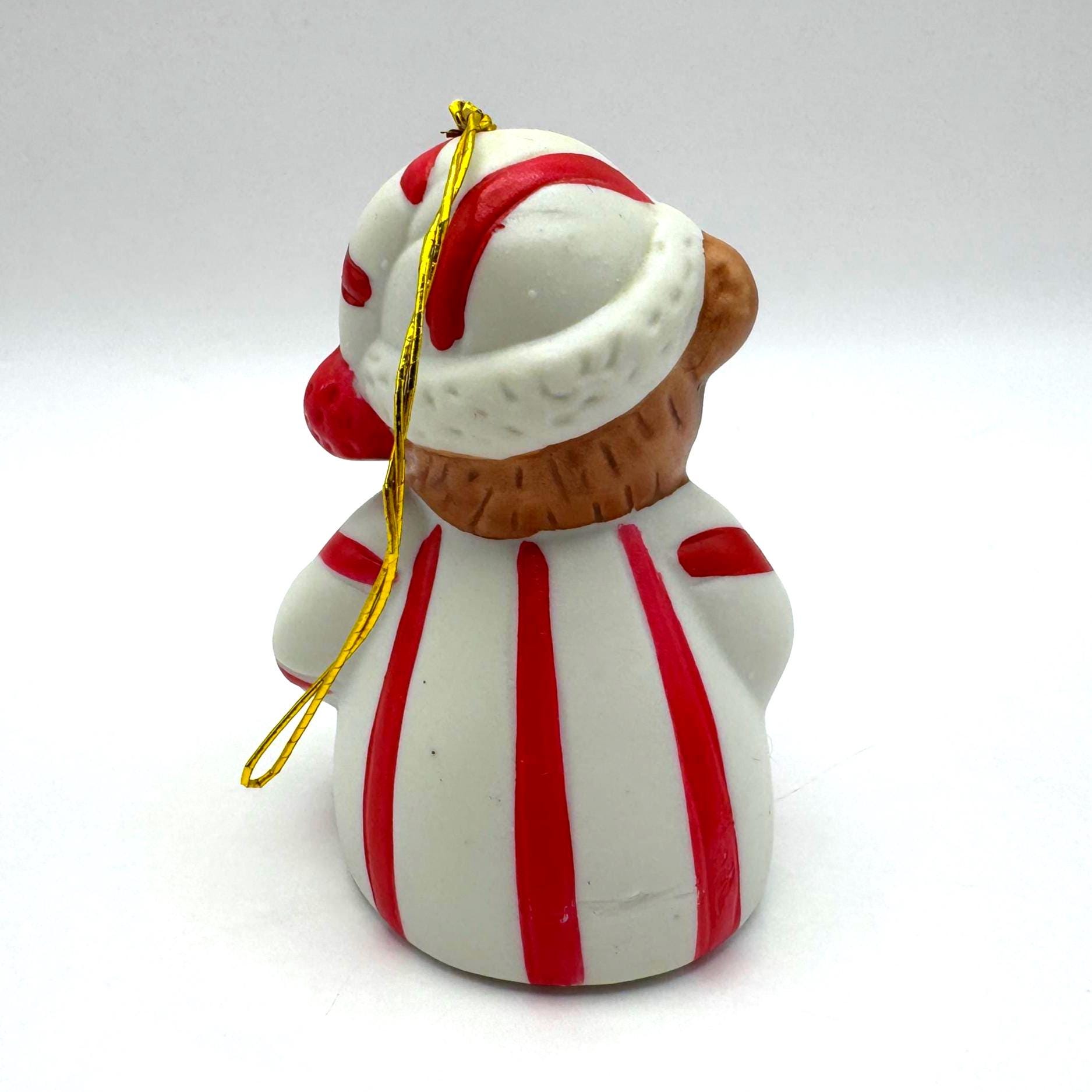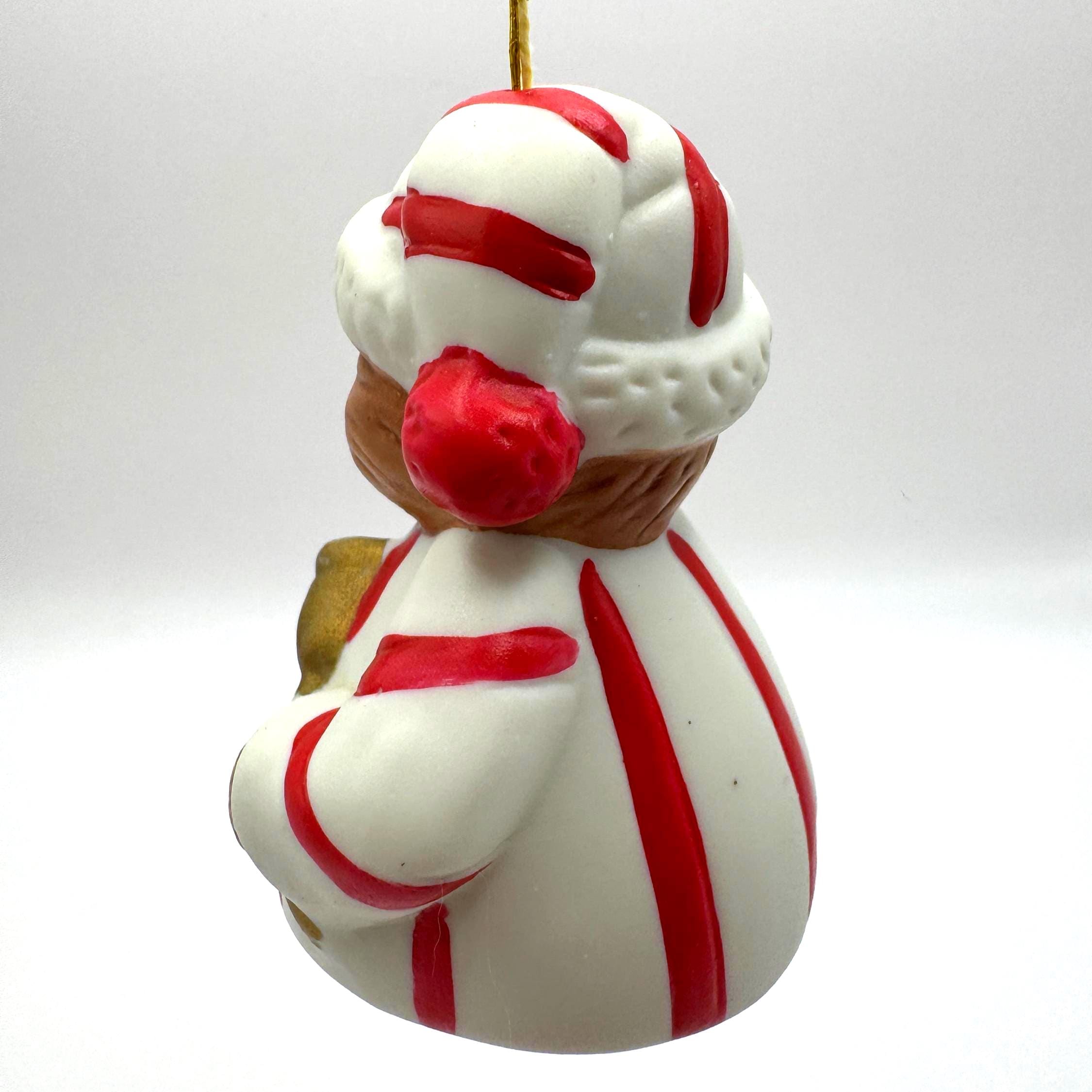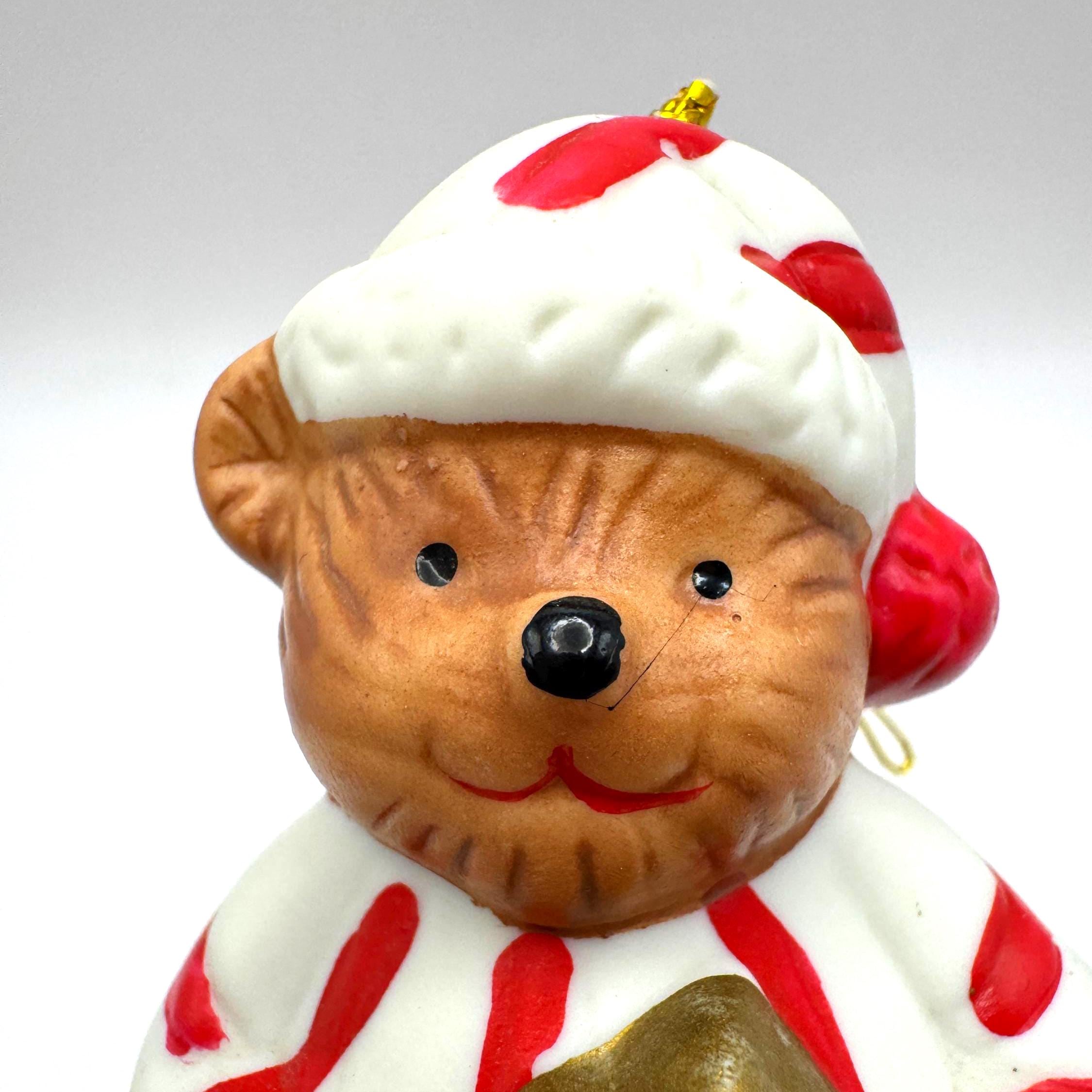 Bring a touch of nostalgic Christmas charm to your tree with this adorable 1985 Giftco Teddy bear bell ornament! This sweet little bear is hand-painted in a candy-cane striped coat with a cozy winter hat and a gold bell held close to his chest. Made in Taiwan, this mid-80s collectible features a cozy peppermint-striped nightgown, a matching nightcap, and a gold bell tucked in the bear's hands.