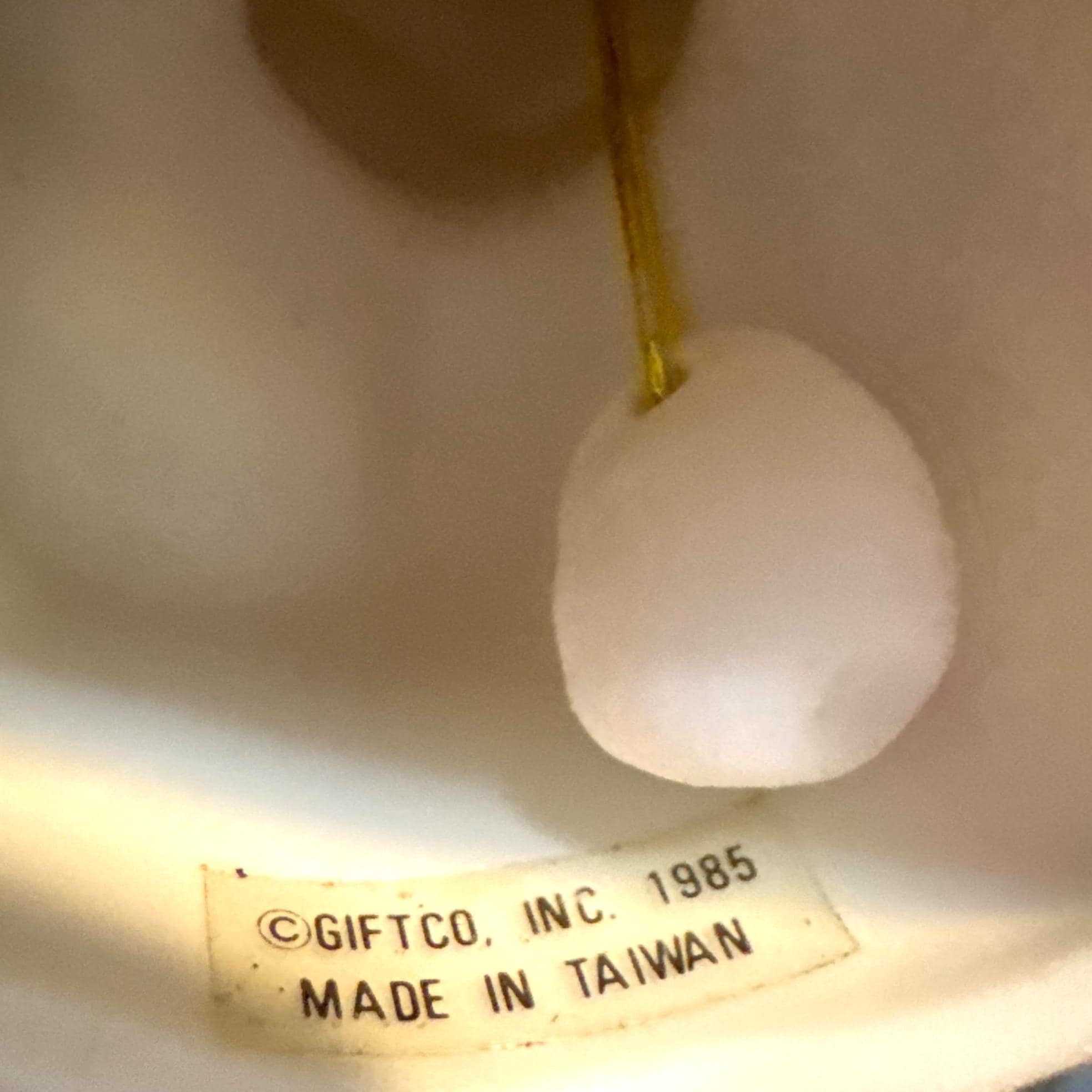 Hand-painted details include red striping, gold accents, and a warm tan bear face. Light vintage wear only-no chips or cracks. Original hanging string included. Label inside reads Giftco, Inc. 1985-made in Taiwan.