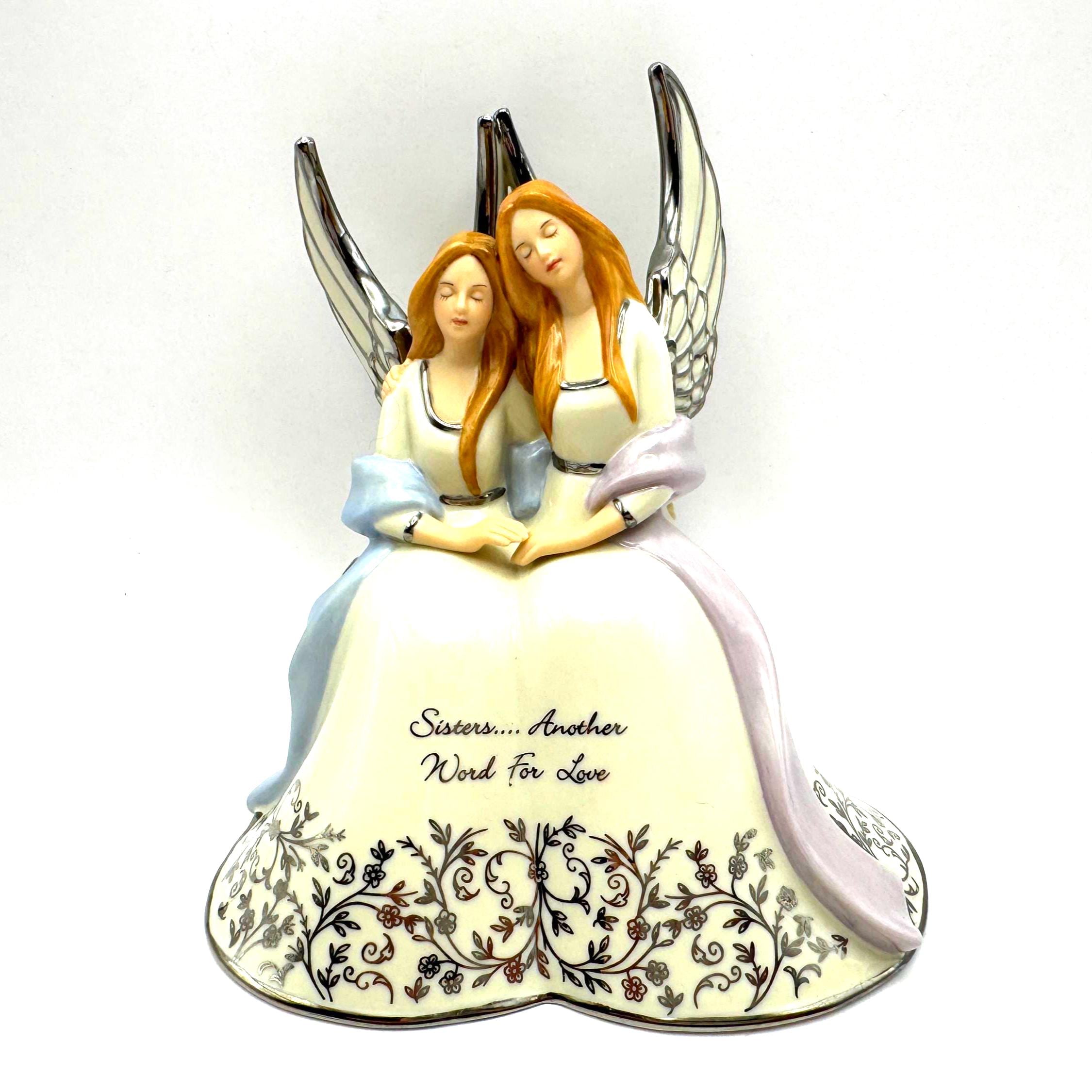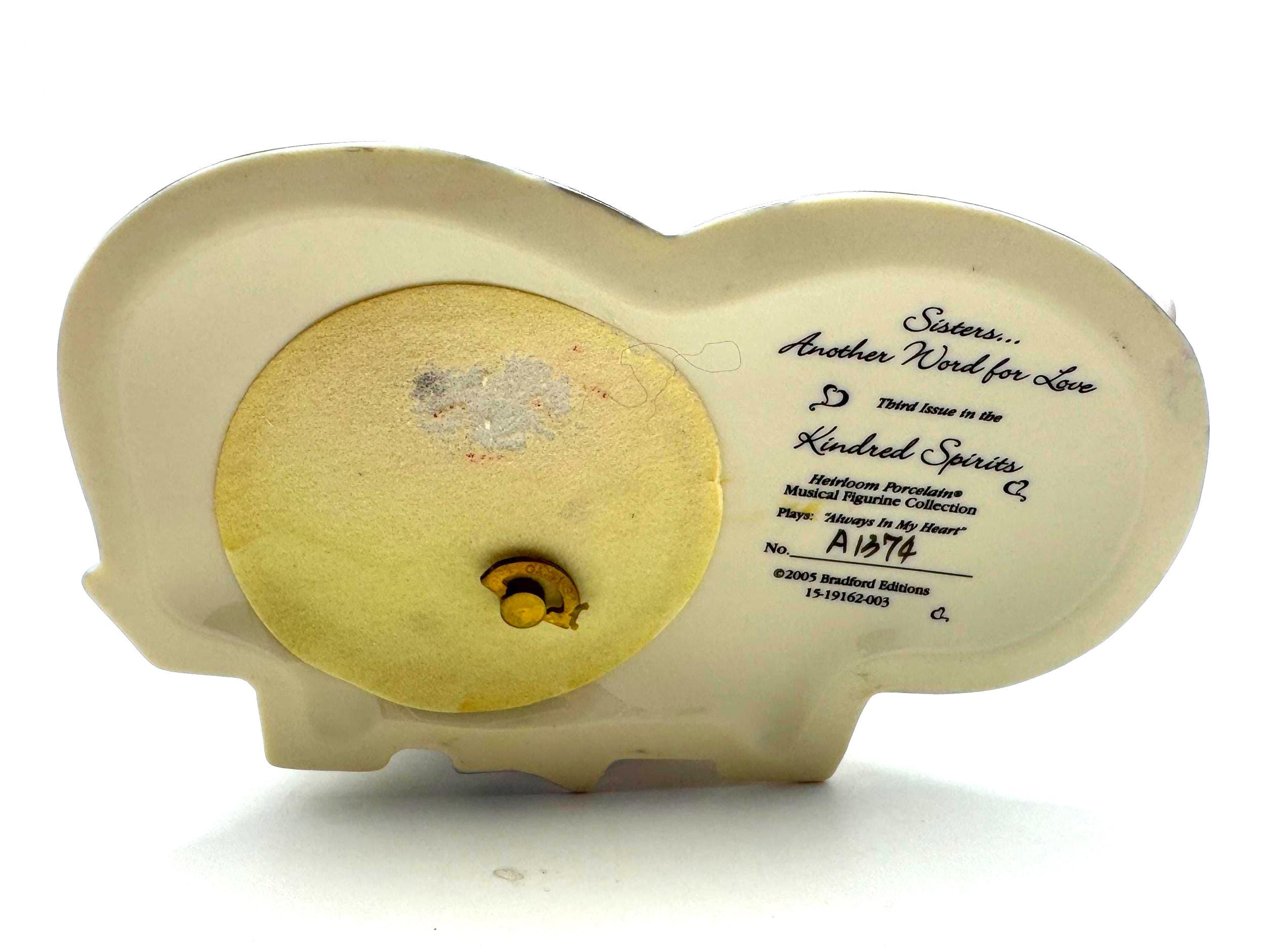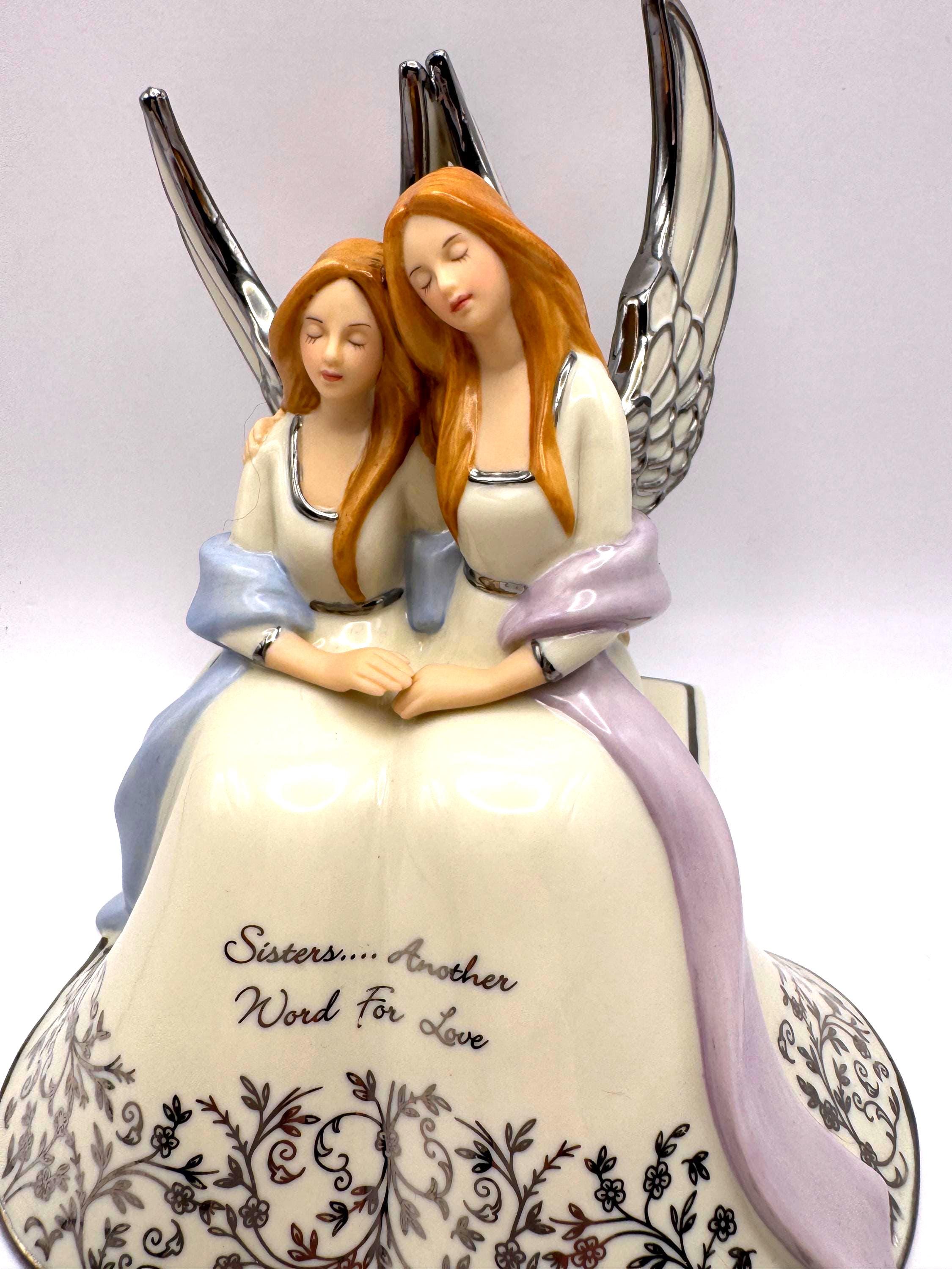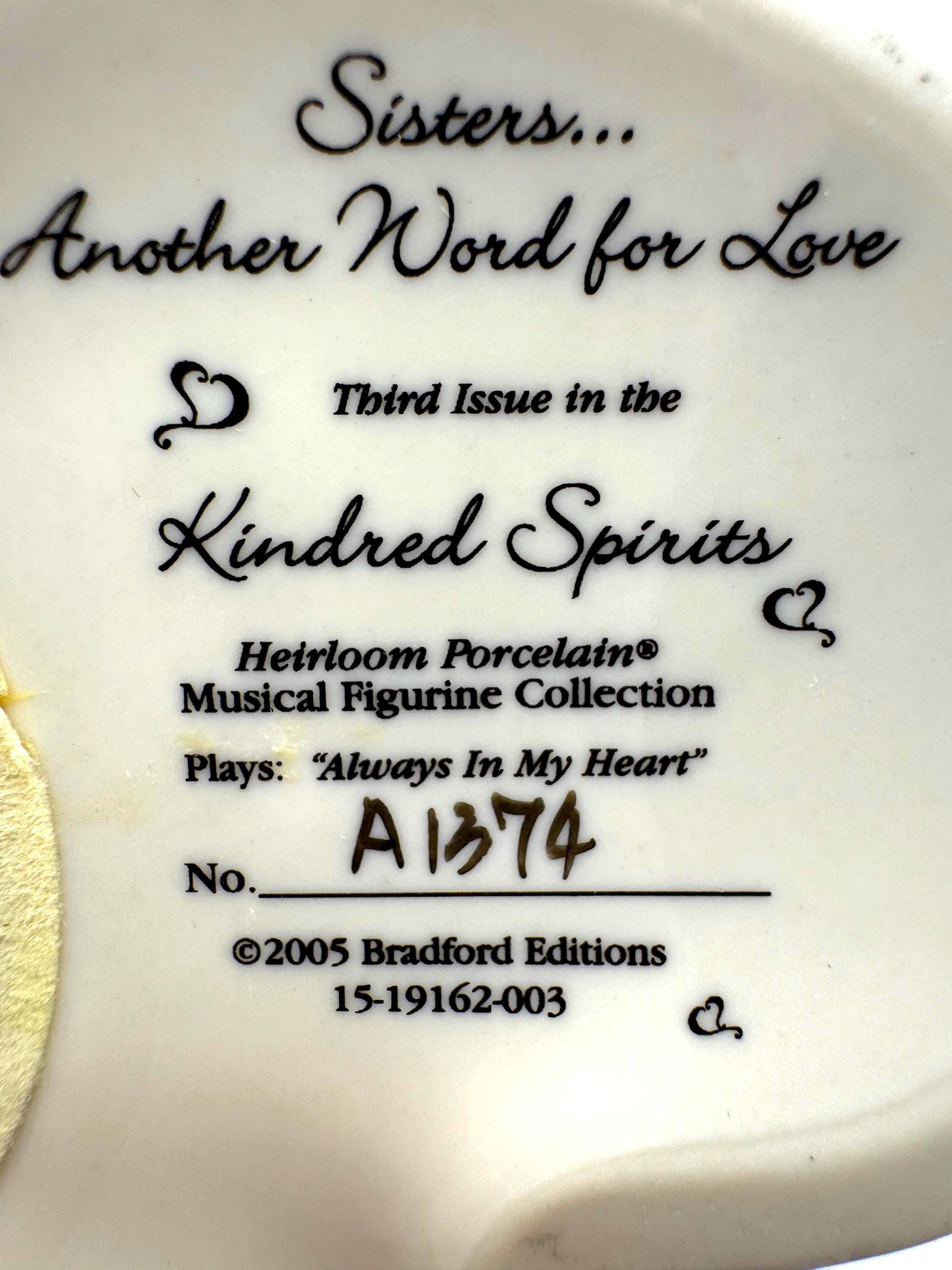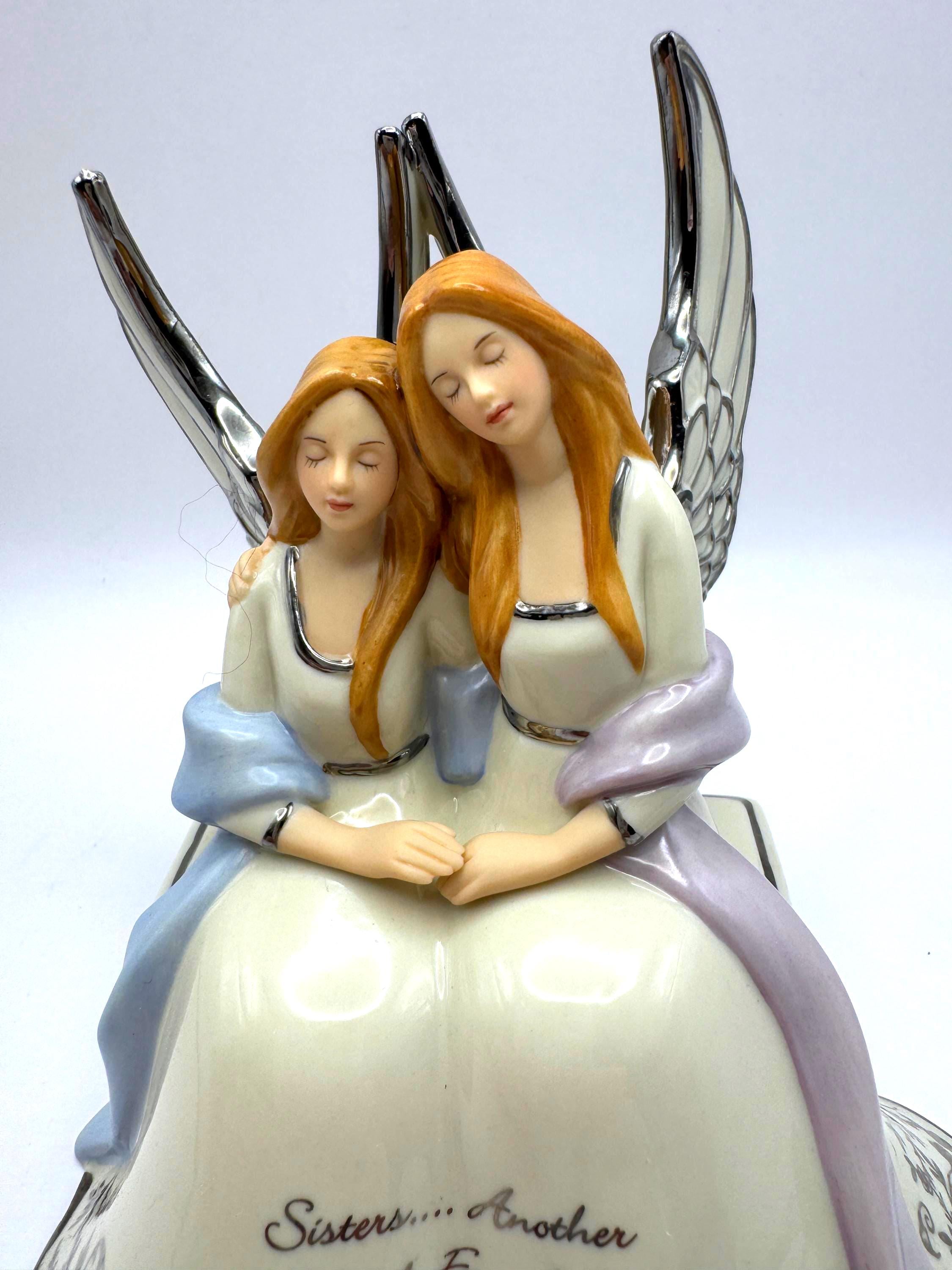 Celebrate the bond between sisters with this beautiful 2005 Bradford Editions, “Sisters… Another Word for Love” musical figurine. Part of the 'Kindred Spirits' Heirloom Porcelain Collection, this piece features two serene angels seated together with flowing pastel gowns, silver-tone wings, and a peaceful, heartwarming expression.