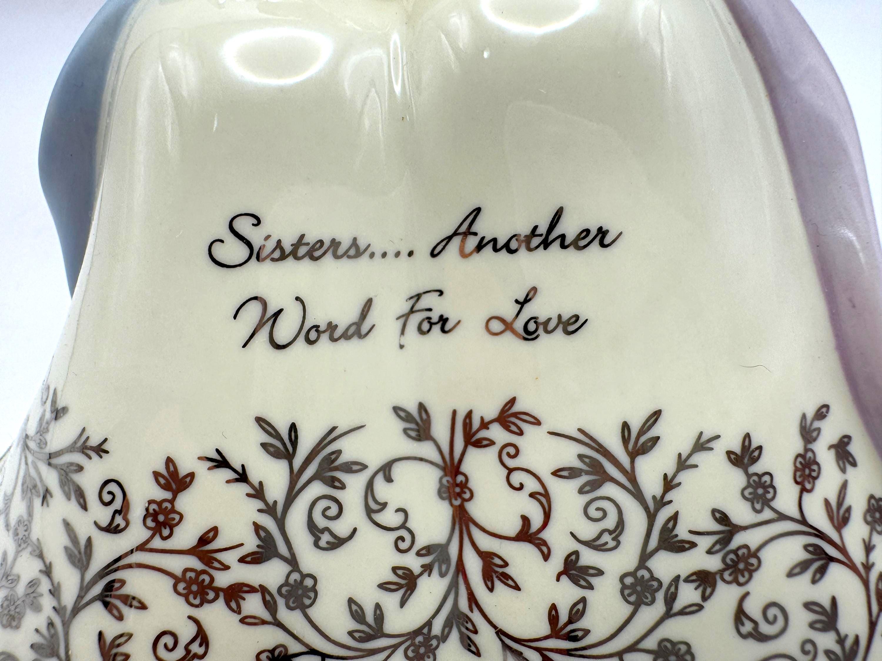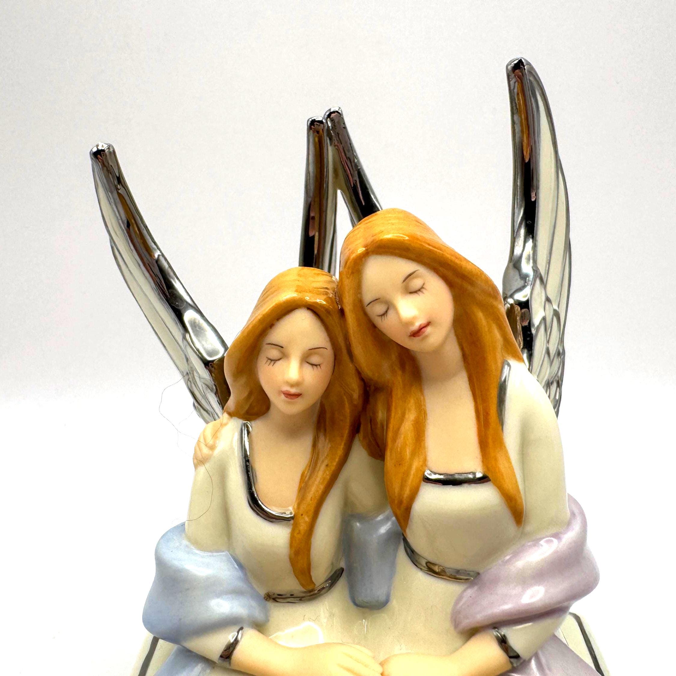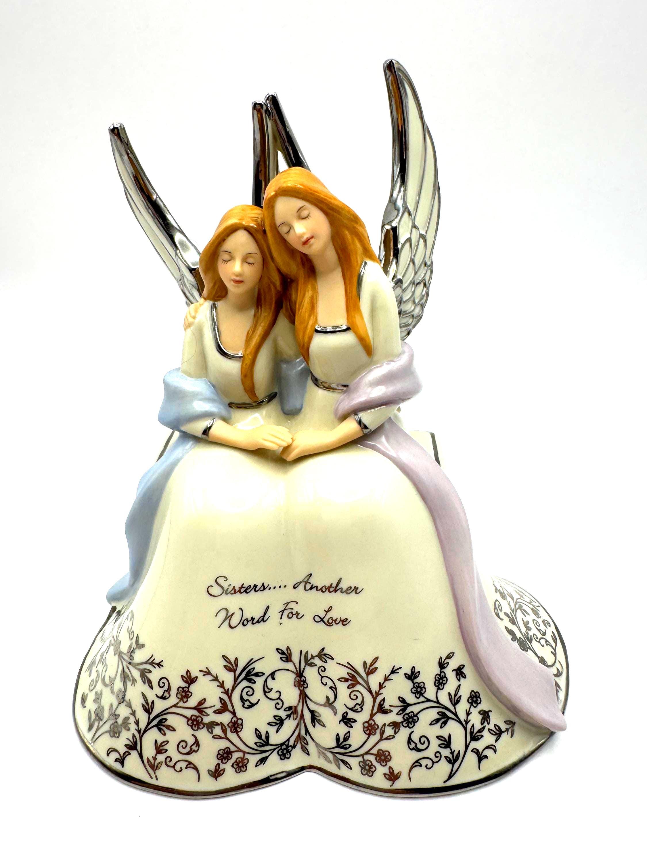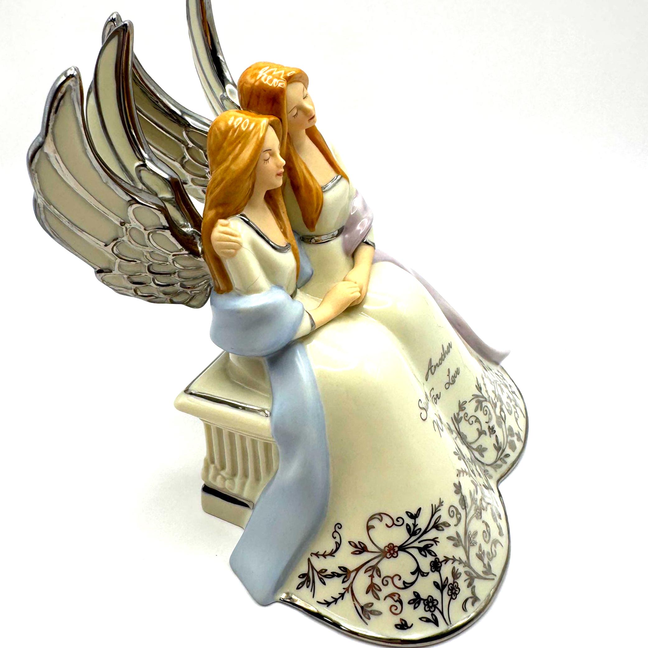 Celebrate the bond between sisters with this beautiful 2005 Bradford Editions, “Sisters… Another Word for Love” musical figurine. Part of the 'Kindred Spirits' Heirloom Porcelain Collection, this piece features two serene angels seated together with flowing pastel gowns, silver-tone wings, and a peaceful, heartwarming expression.