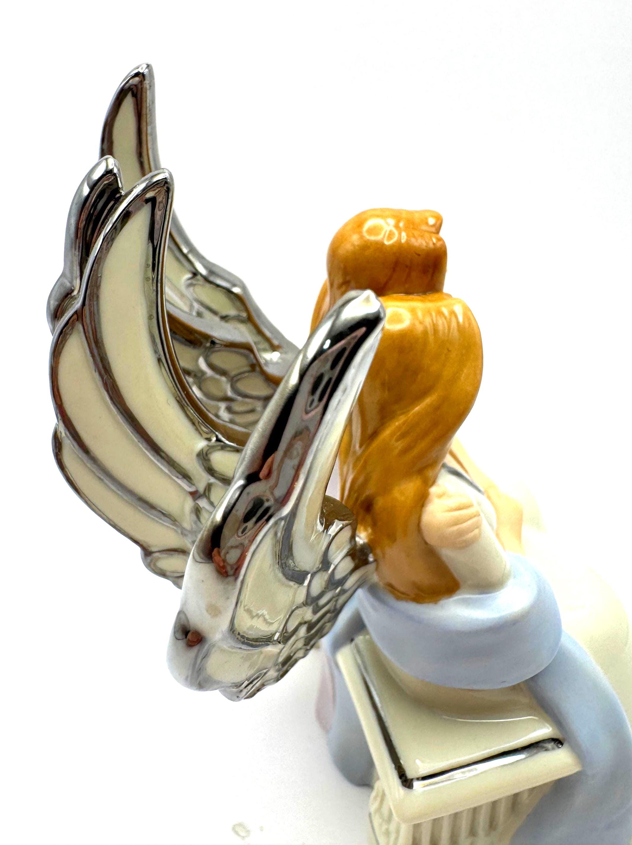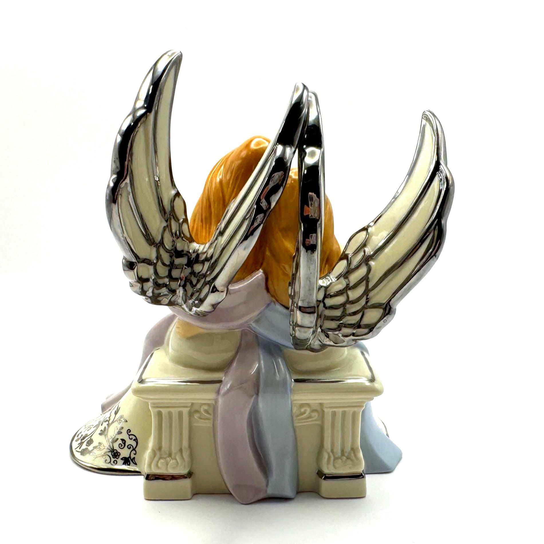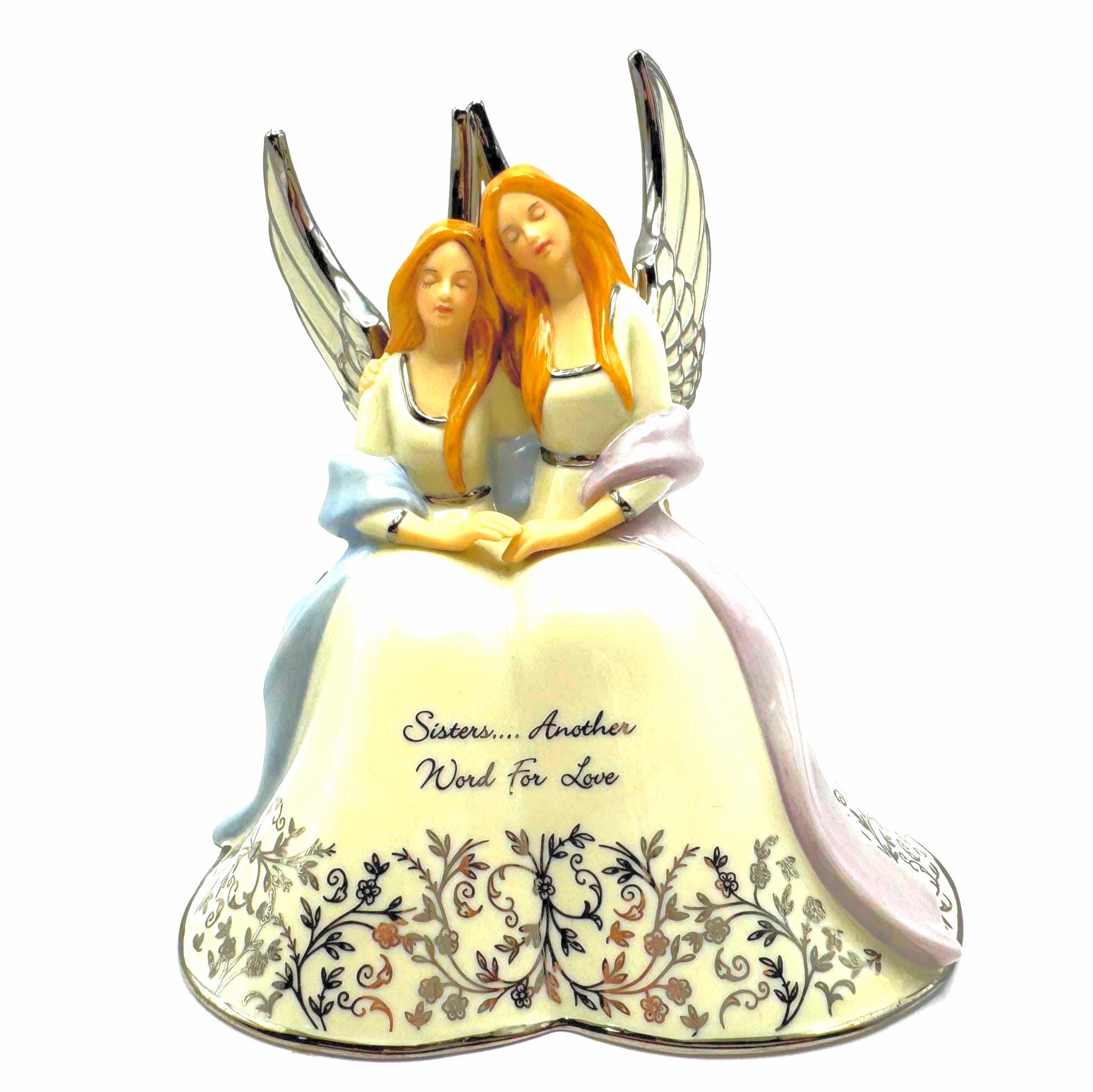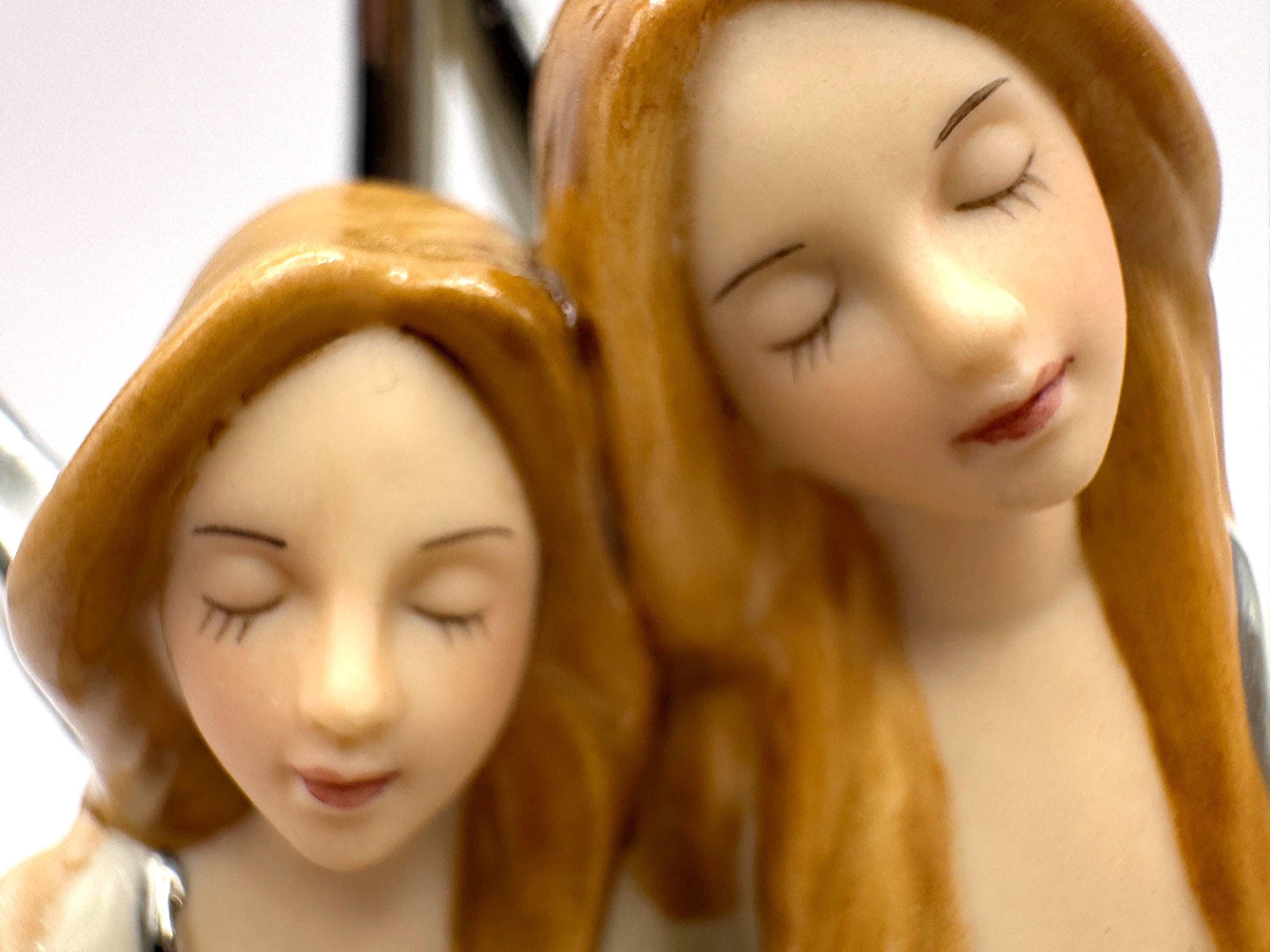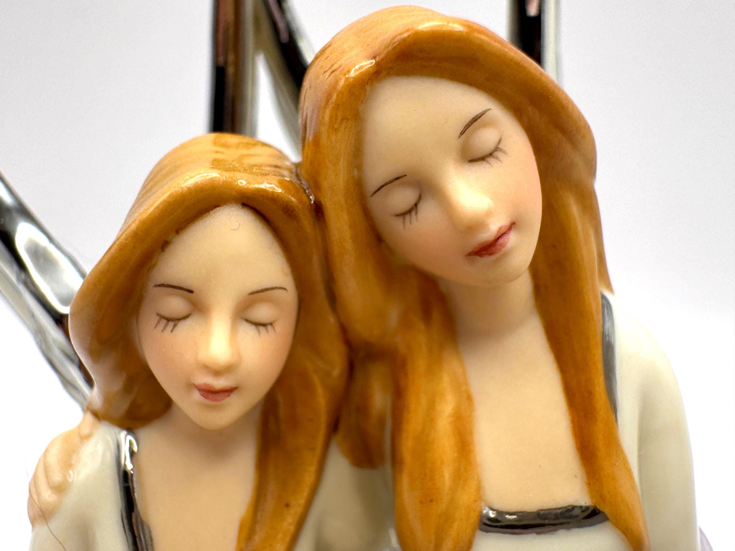 Celebrate the bond between sisters with this beautiful 2005 Bradford Editions, “Sisters… Another Word for Love” musical figurine. Part of the 'Kindred Spirits' Heirloom Porcelain Collection, this piece features two serene angels seated together with flowing pastel gowns, silver-tone wings, and a peaceful, heartwarming expression.