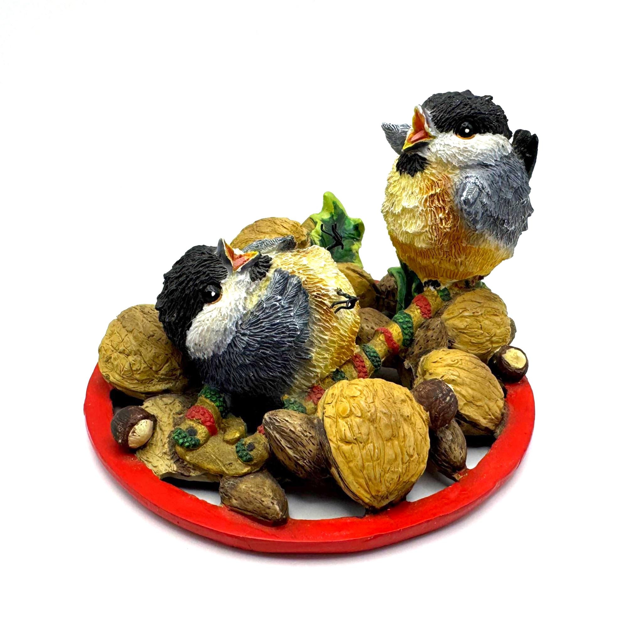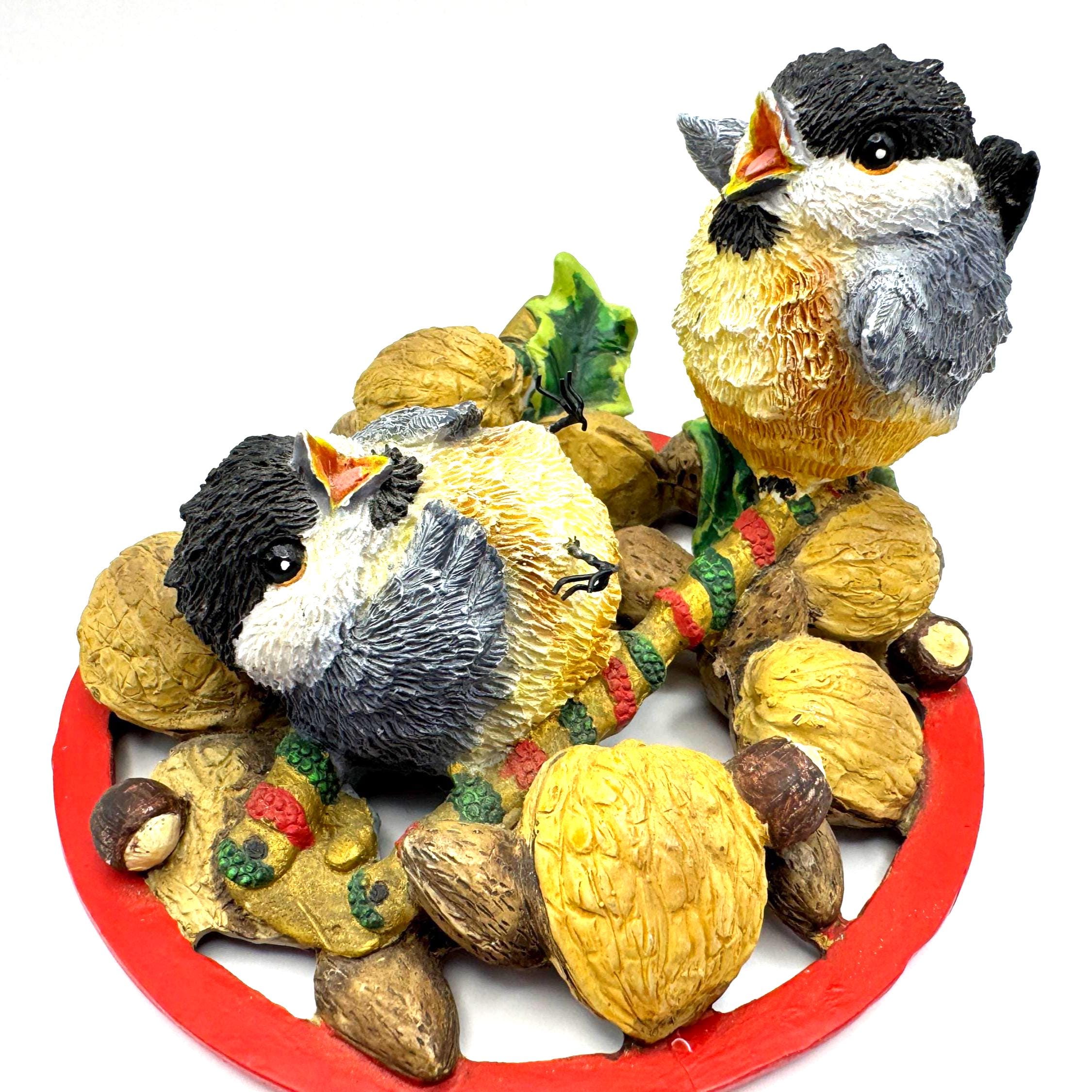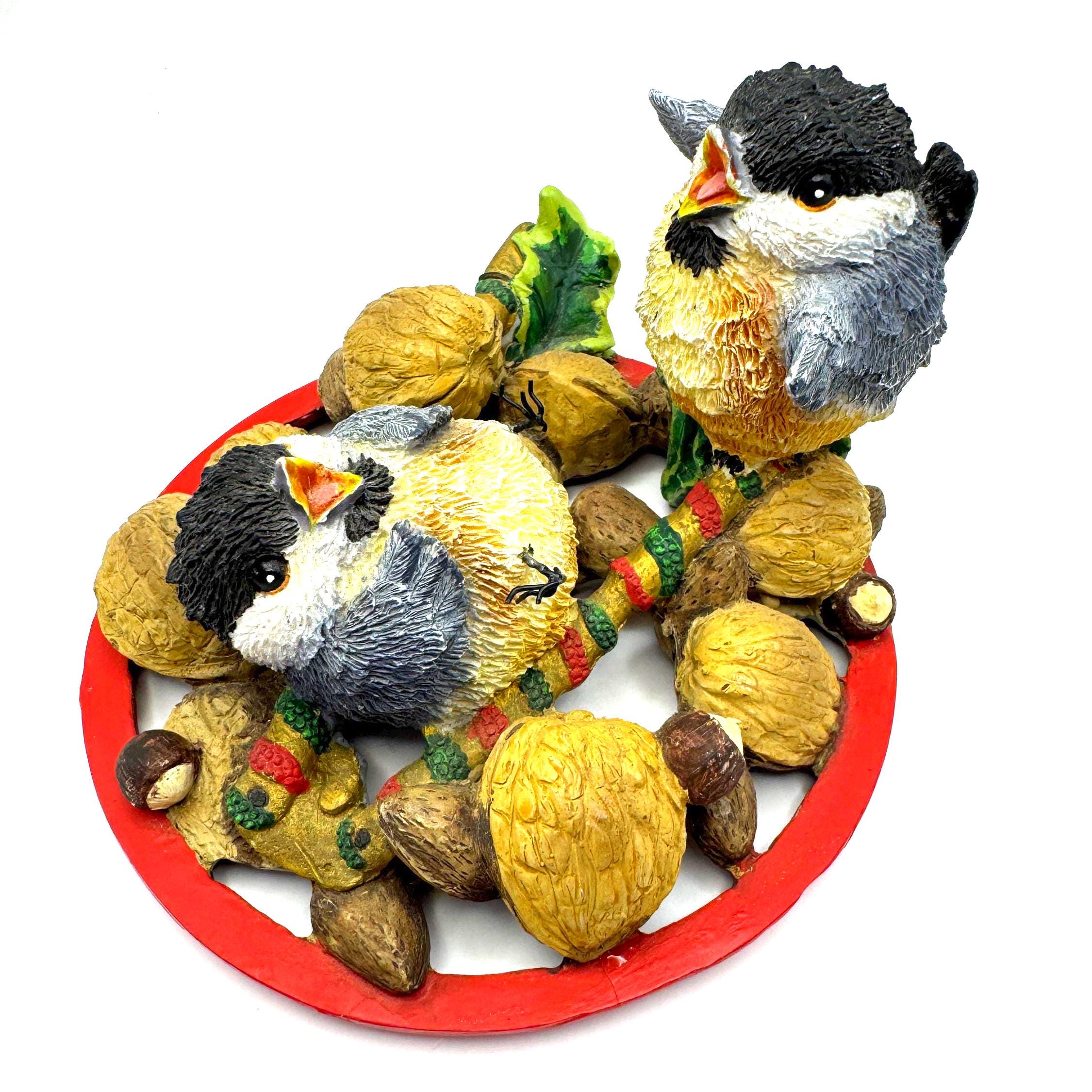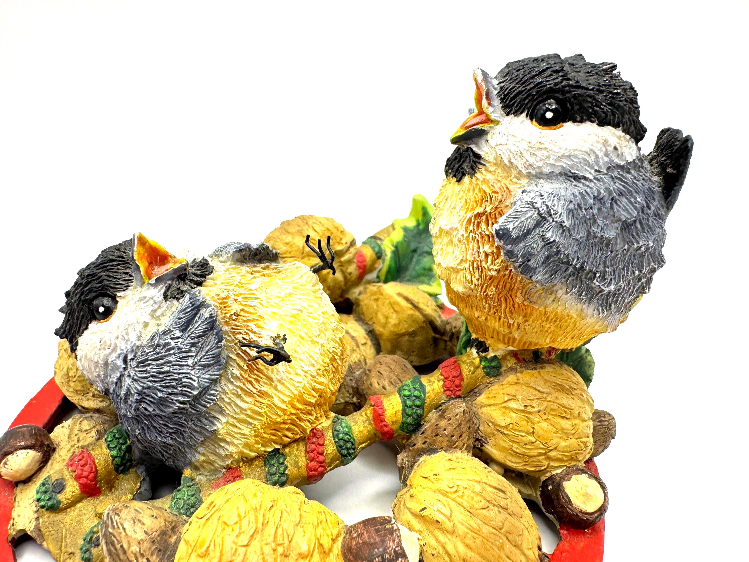 Add a charming woodland touch to your Christmas décor with this adorable resin figurine featuring two plump chickadees perched among acorns, walnuts, and a holiday nut cracker. The sculpting has great detail—fluffy feathers, bright tiny beaks, and a festive mix of natural tones with pops of red and green.