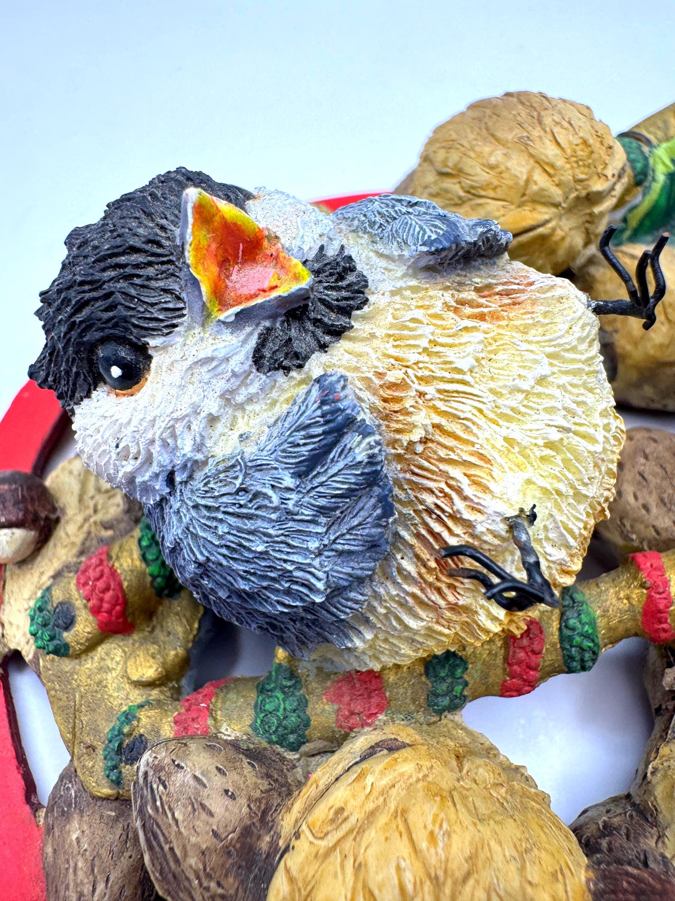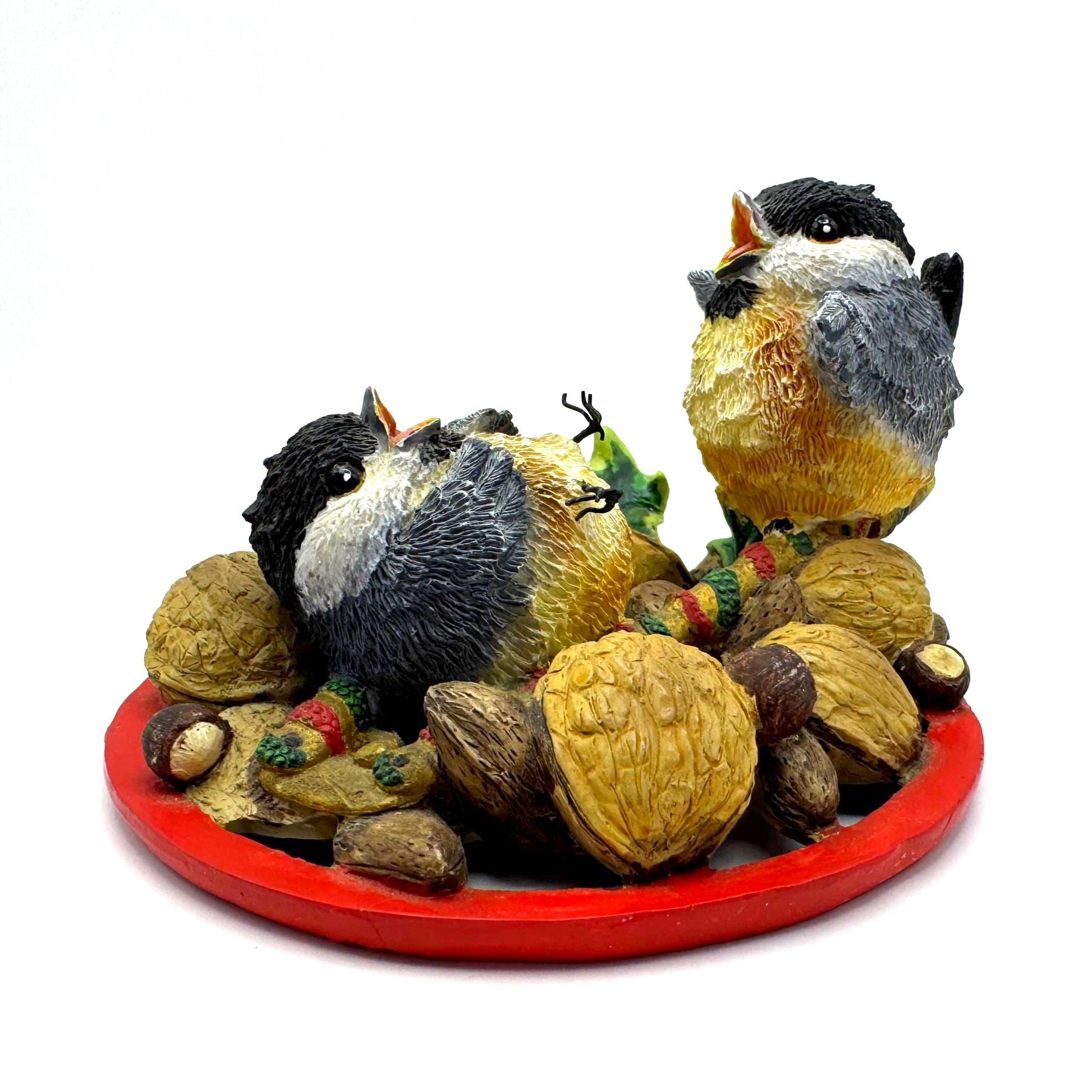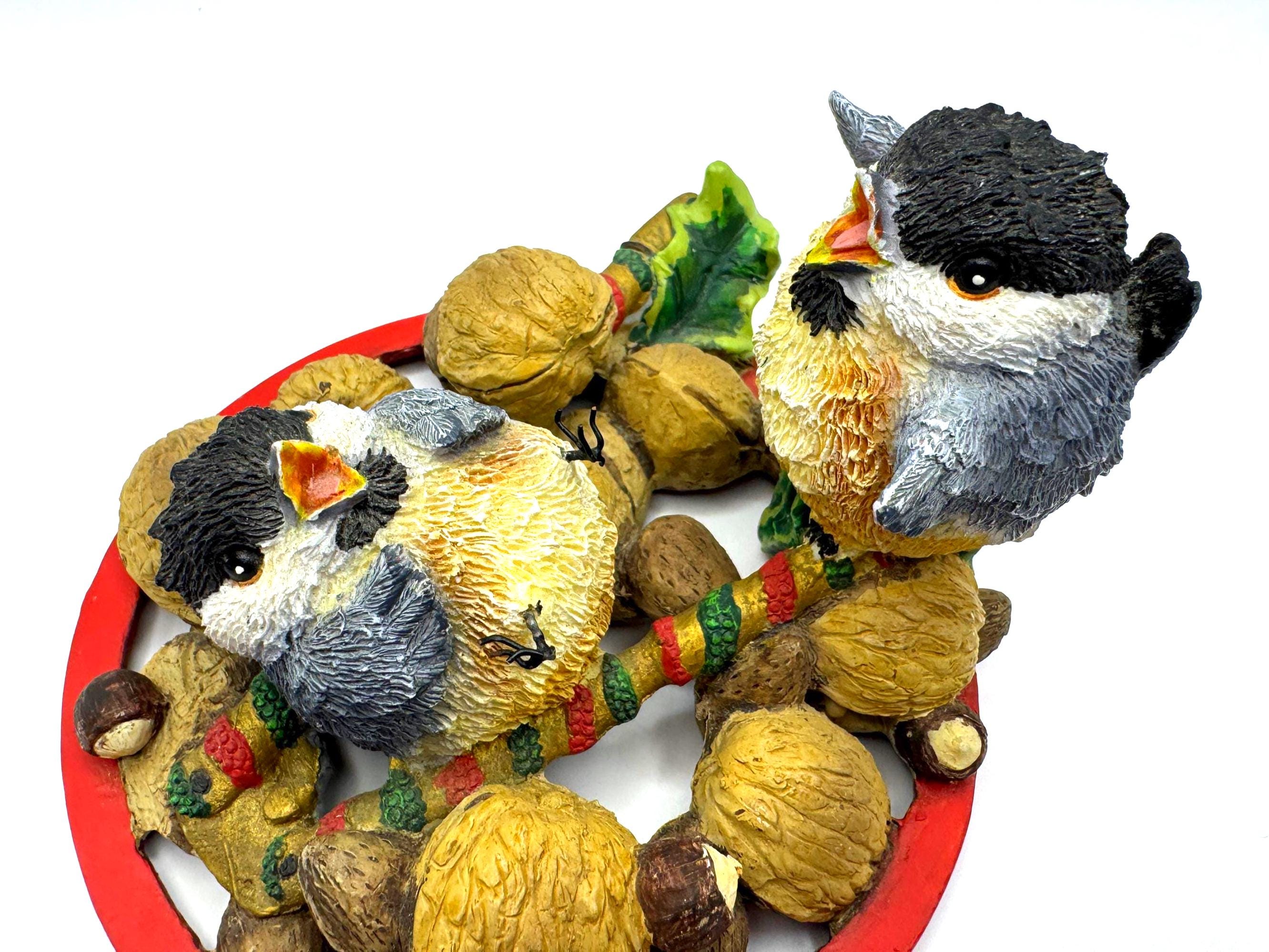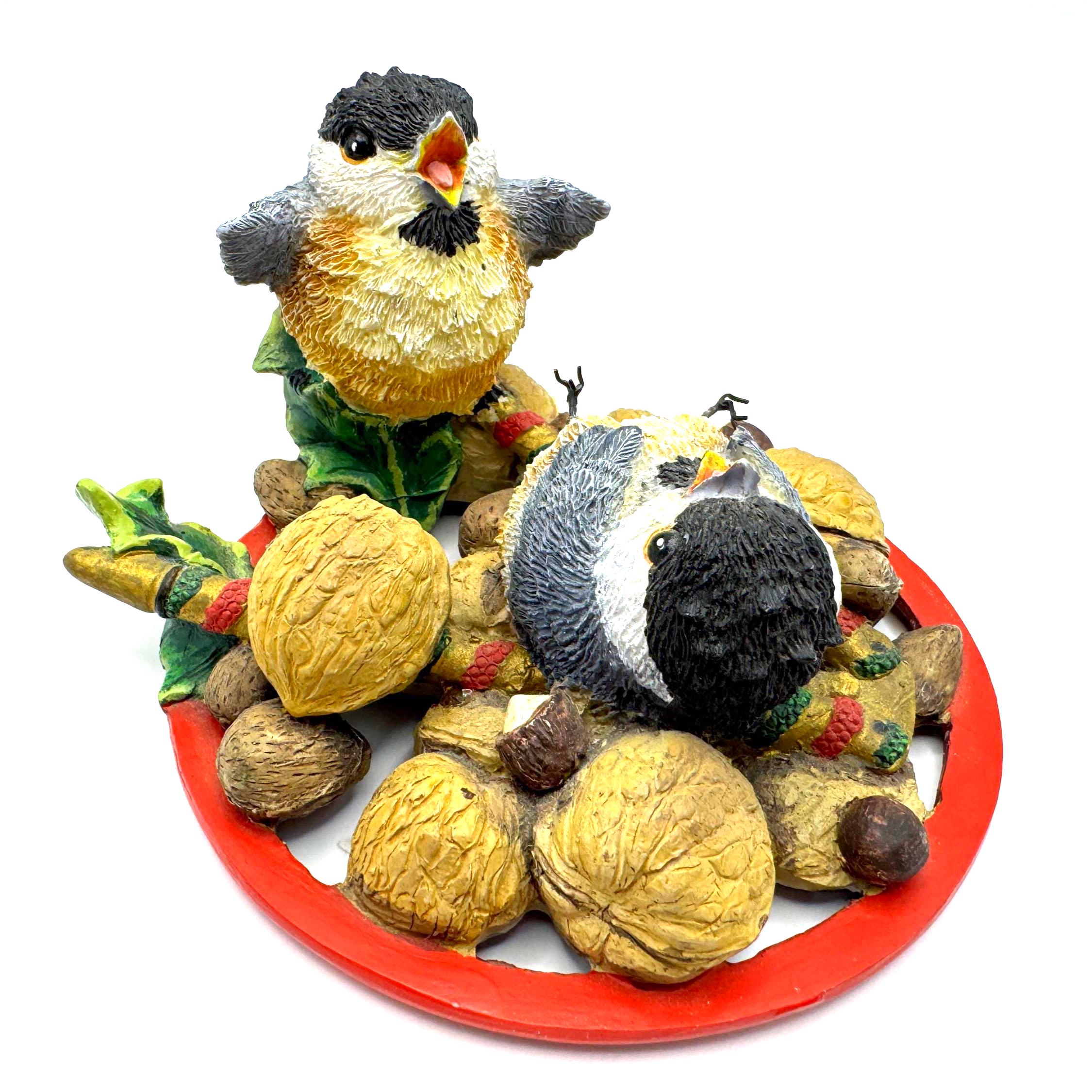 Add a charming woodland touch to your Christmas décor with this adorable resin figurine featuring two plump chickadees perched among acorns, walnuts, and a holiday nut cracker. The sculpting has great detail—fluffy feathers, bright tiny beaks, and a festive mix of natural tones with pops of red and green.