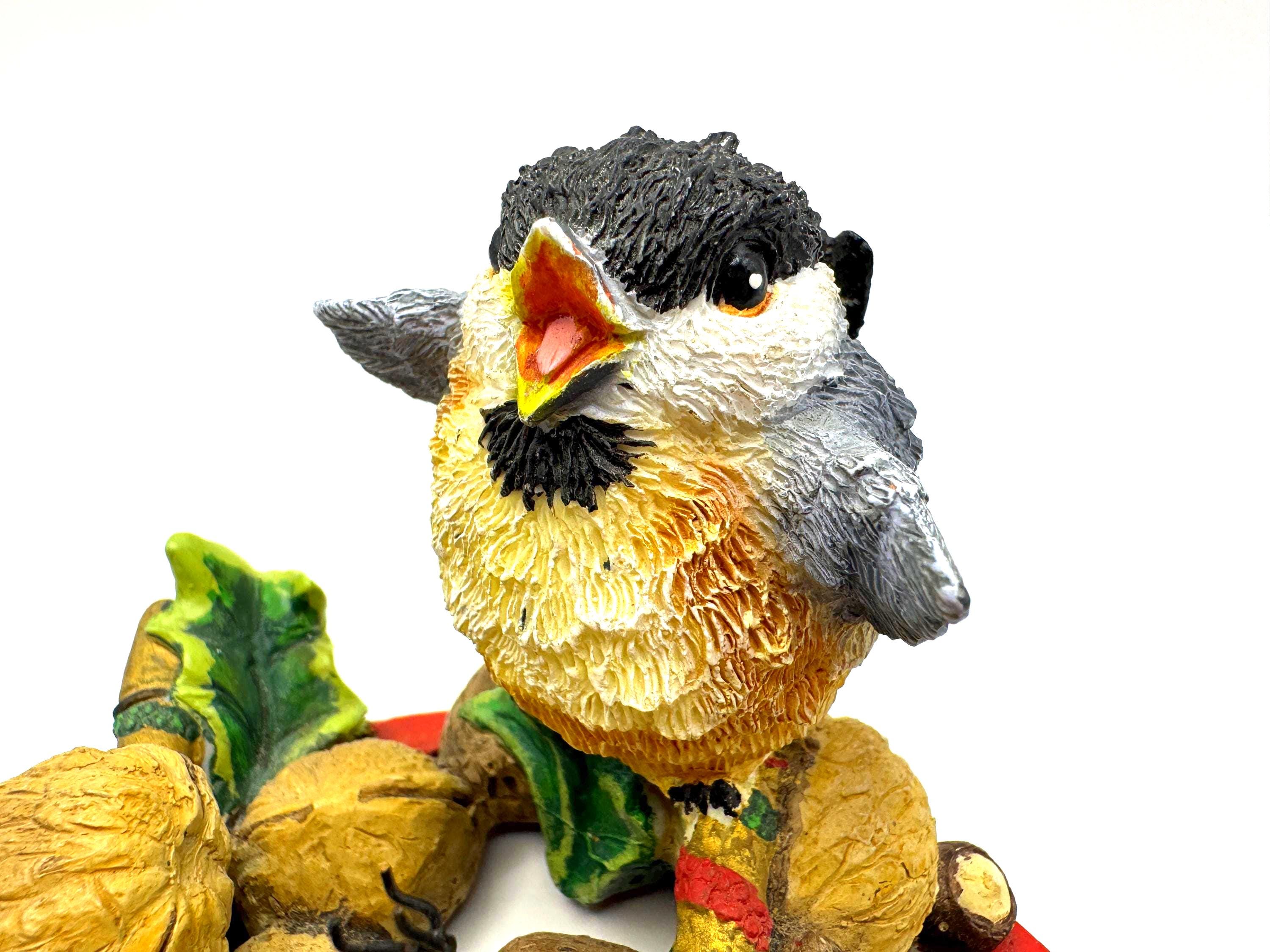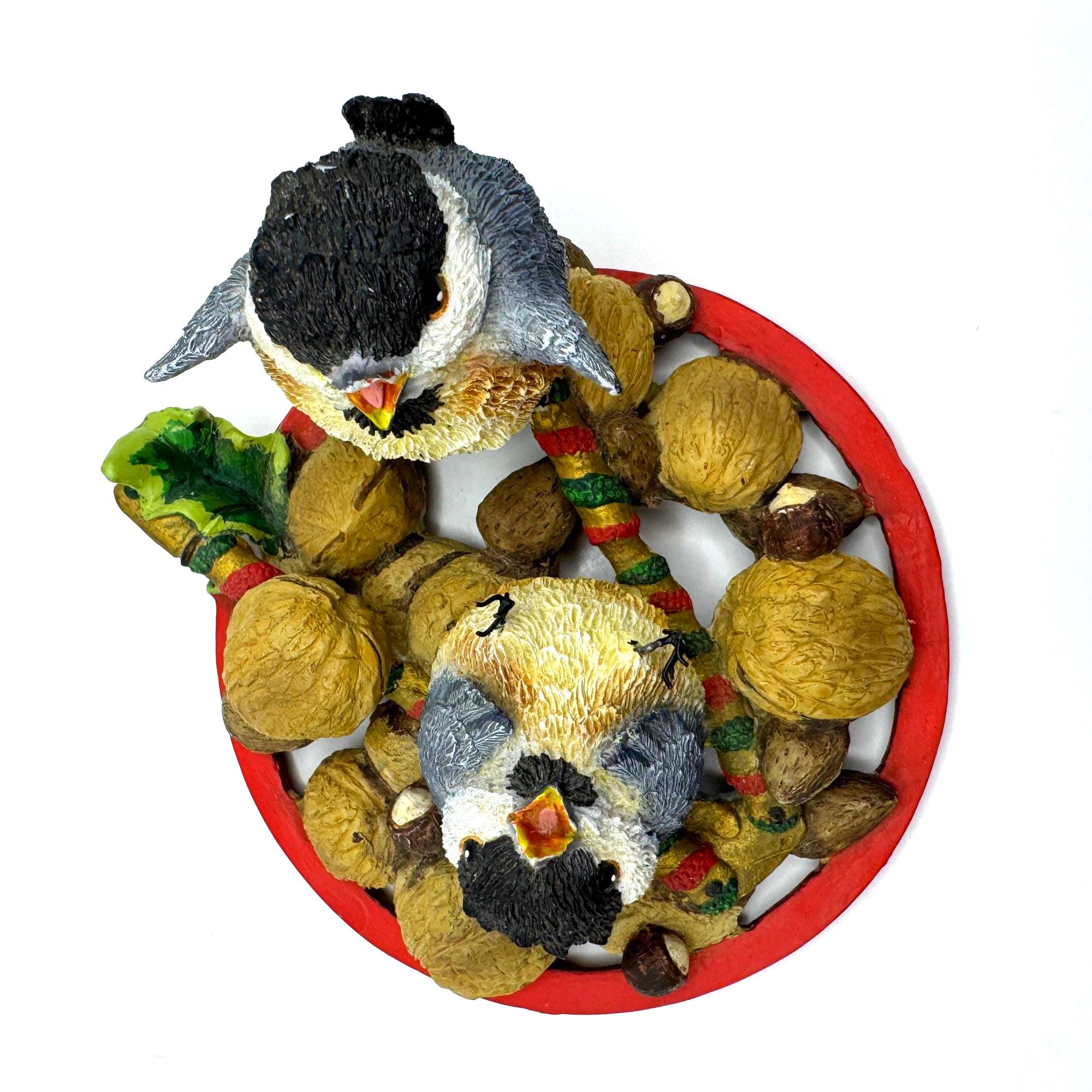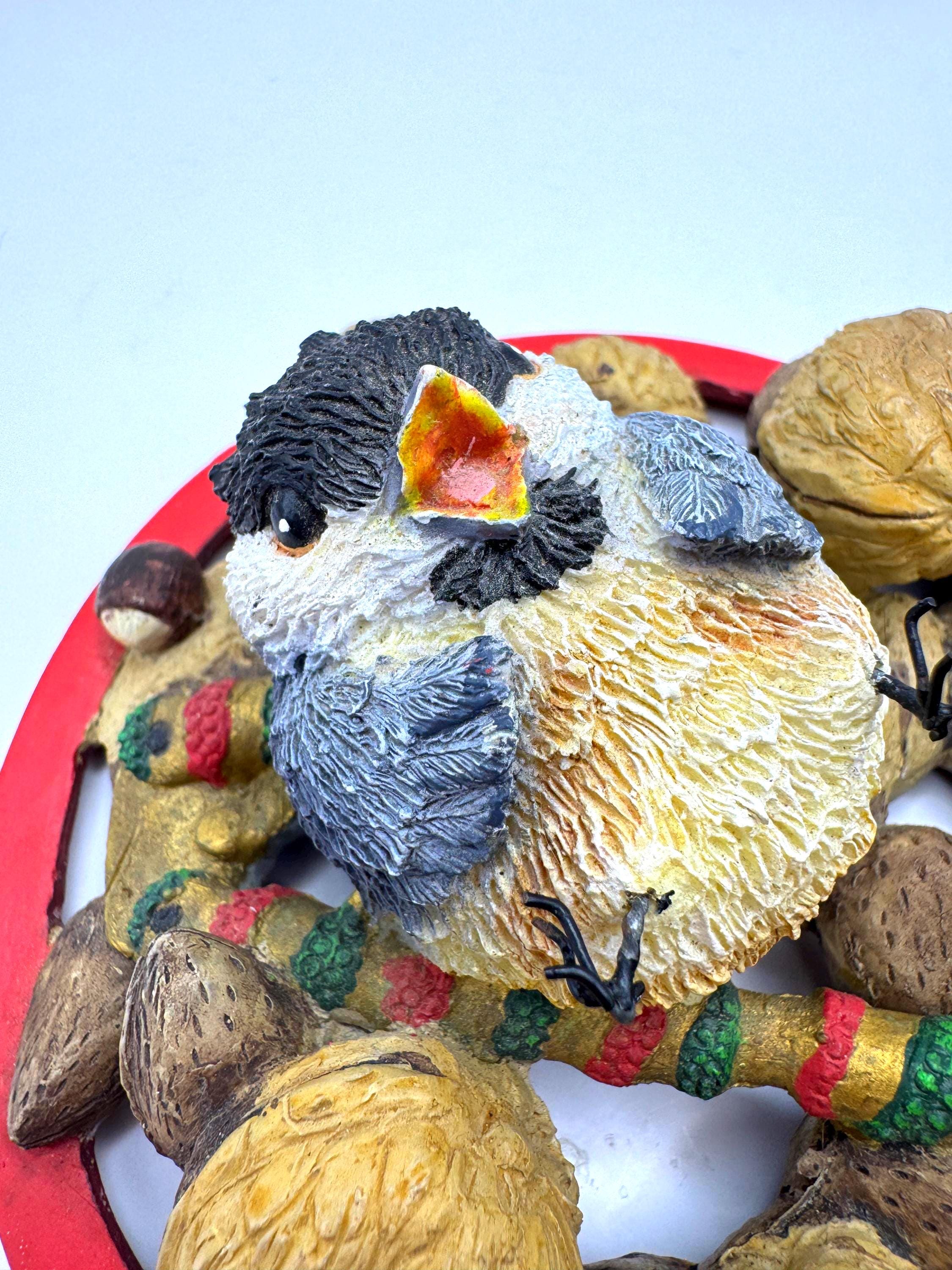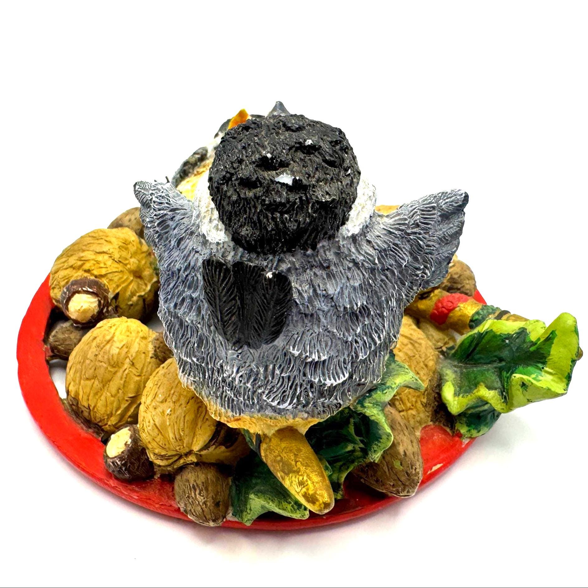 Add a charming woodland touch to your Christmas décor with this adorable resin figurine featuring two plump chickadees perched among acorns, walnuts, and a holiday nut cracker. The sculpting has great detail—fluffy feathers, bright tiny beaks, and a festive mix of natural tones with pops of red and green.