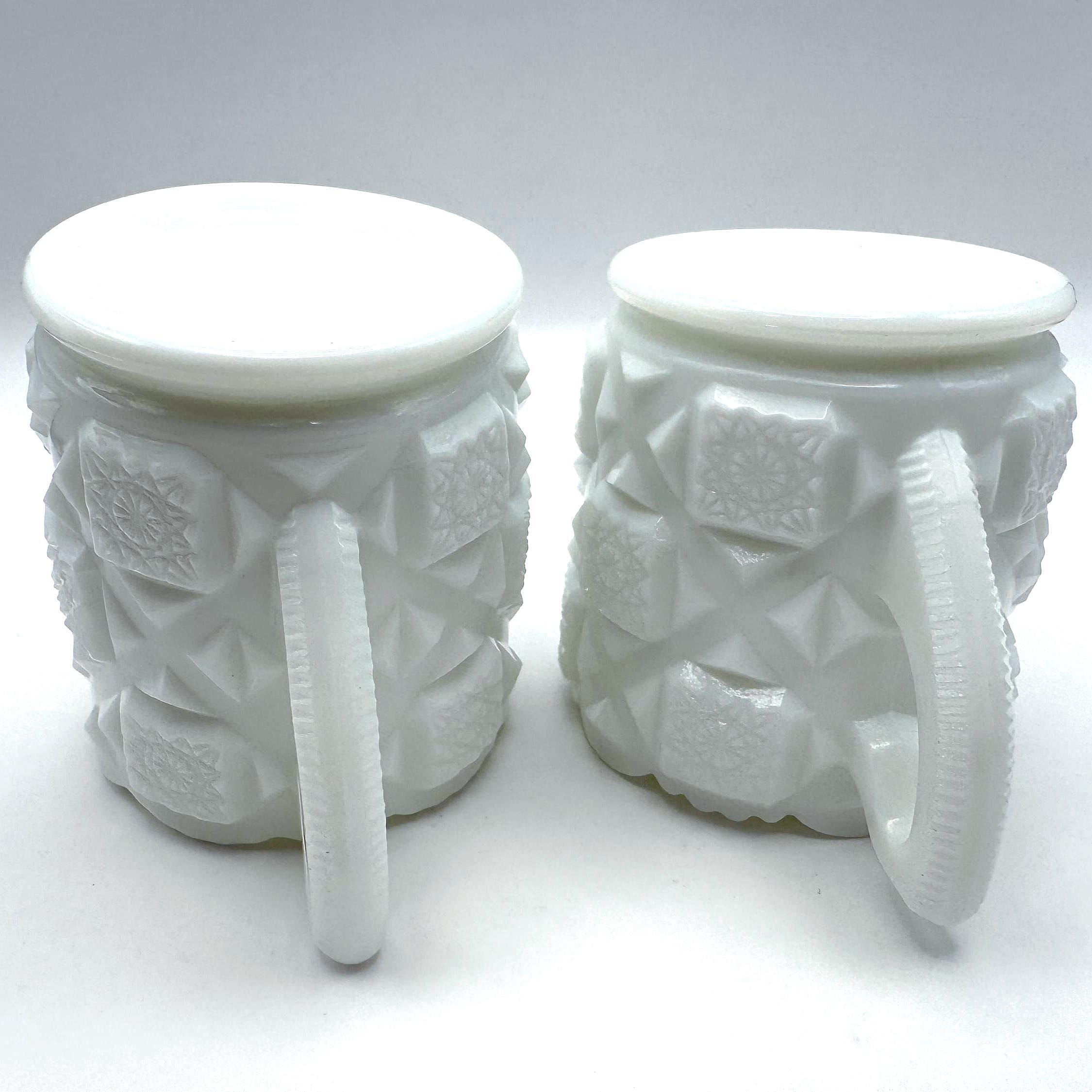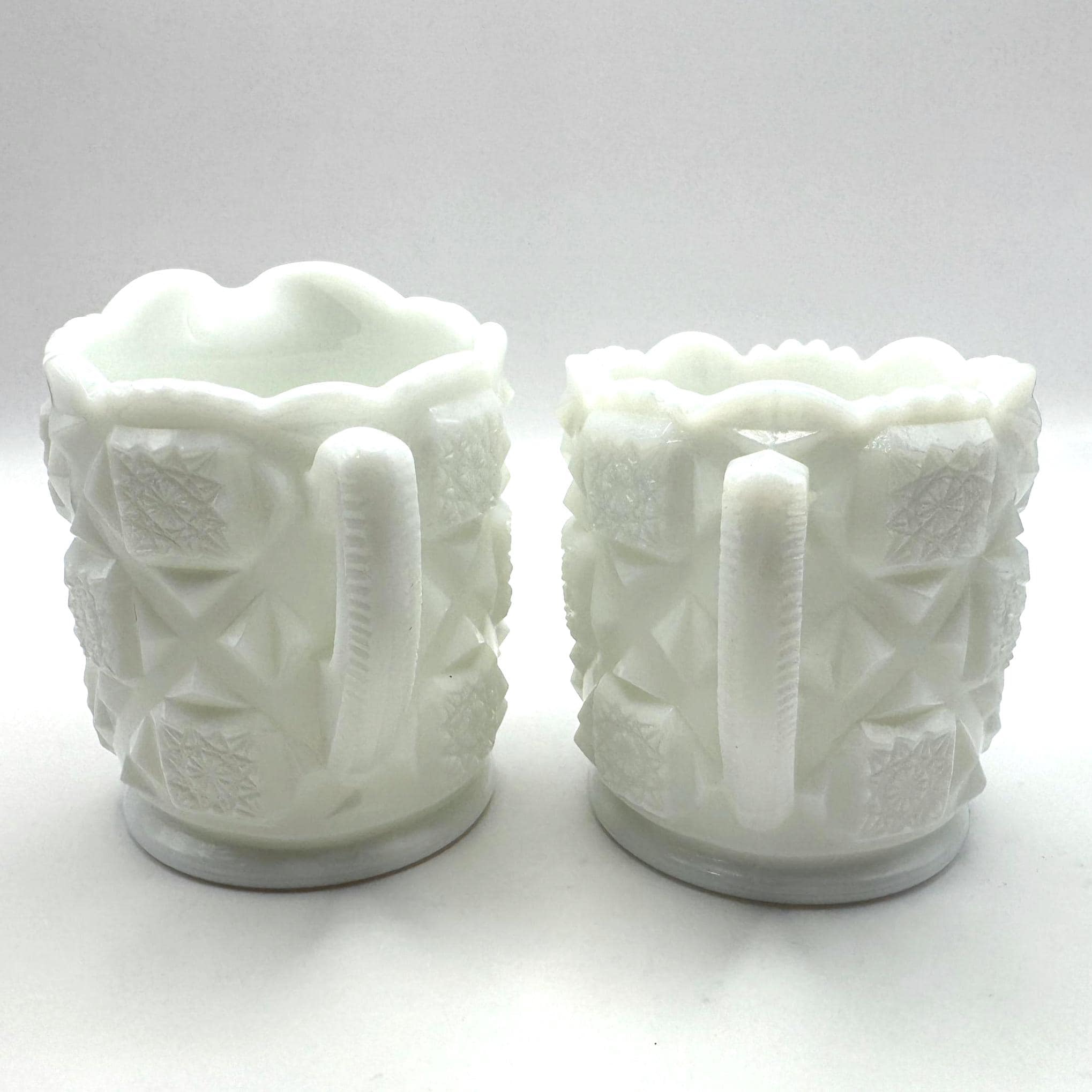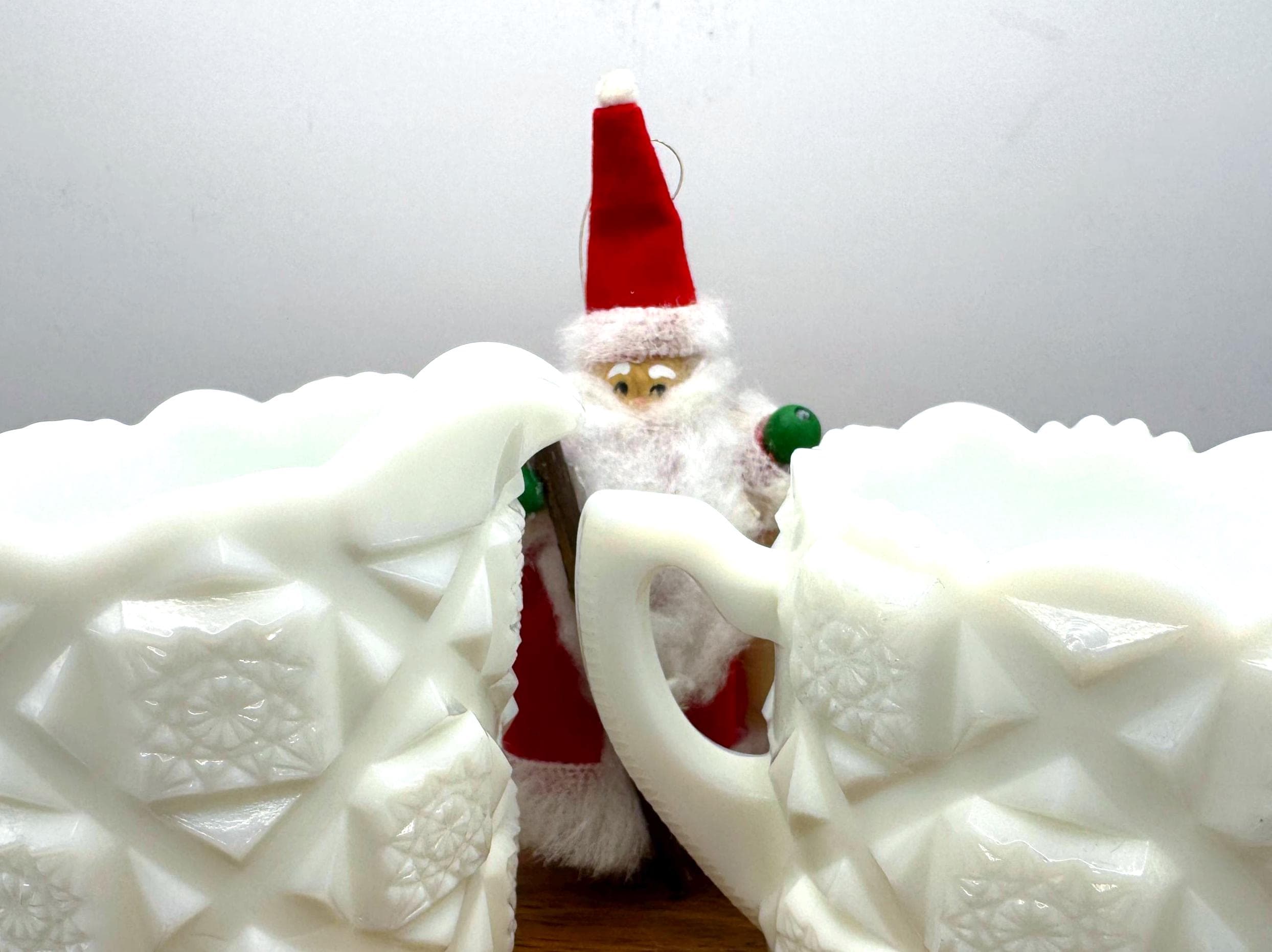 Both pieces have glossy white milk glass, crisp molded detail, sturdy handles, and scalloped rims that give them that cozy cottage-style look. The base carries the WG mark, confirming authentic Westmoreland production.