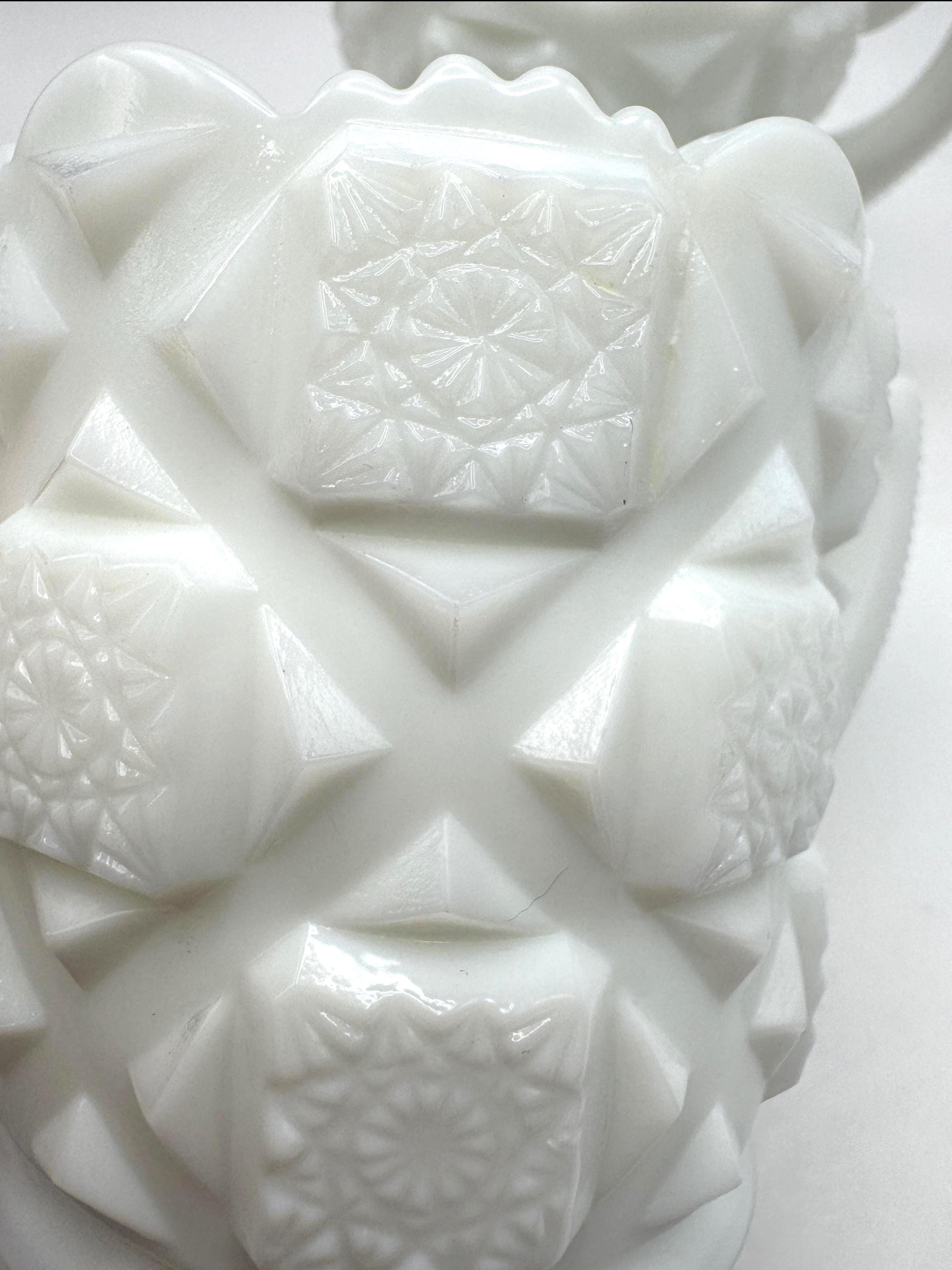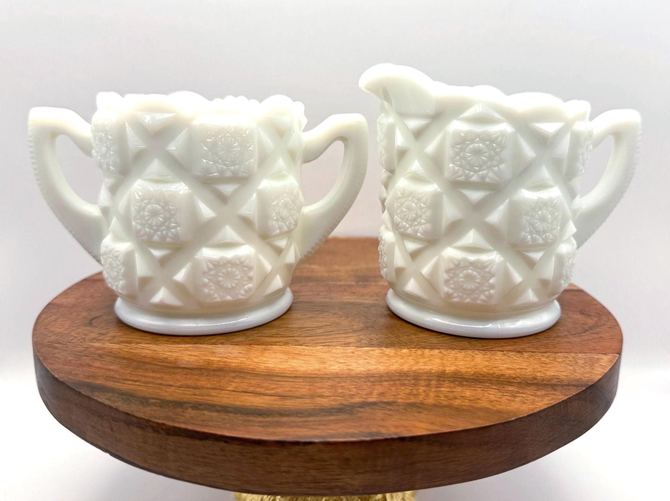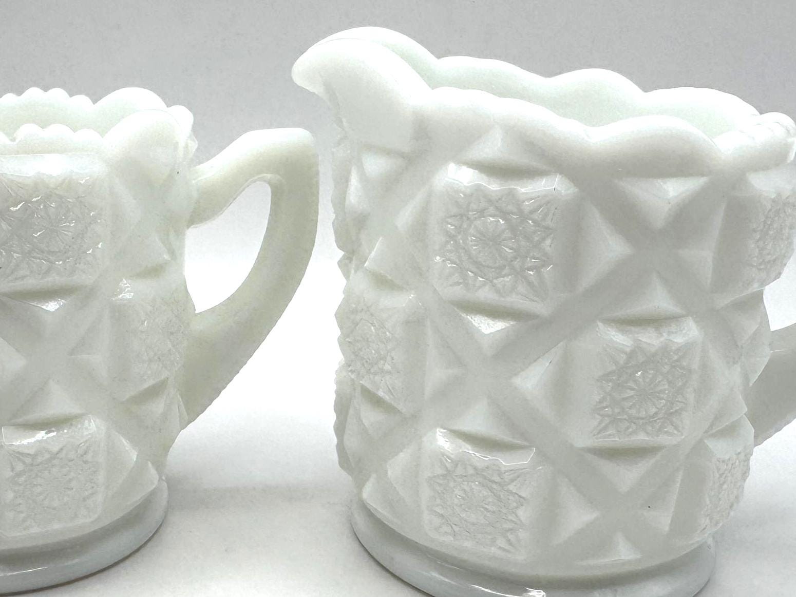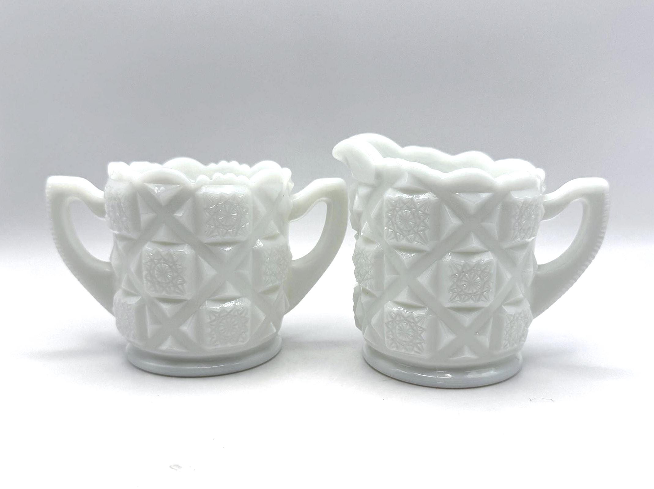 Charming vintage Westmoreland milk glass creamer and sugar set in the classic 'Old Quilt' (Quilted) pattern. This geometric design features raised squares with starburst centers and crisscross diamonds — one of Westmoreland’s most collectible textured patterns.