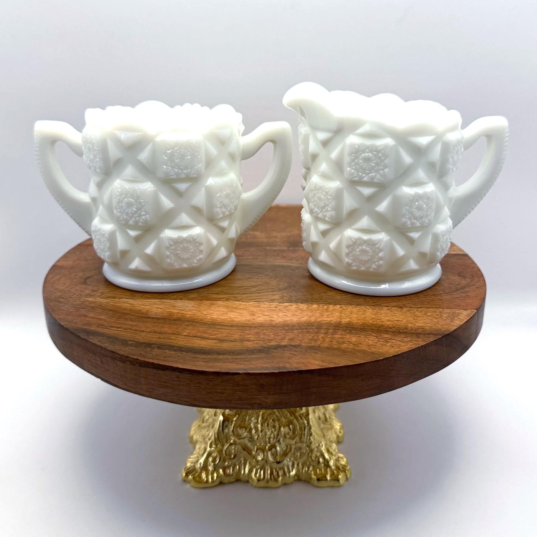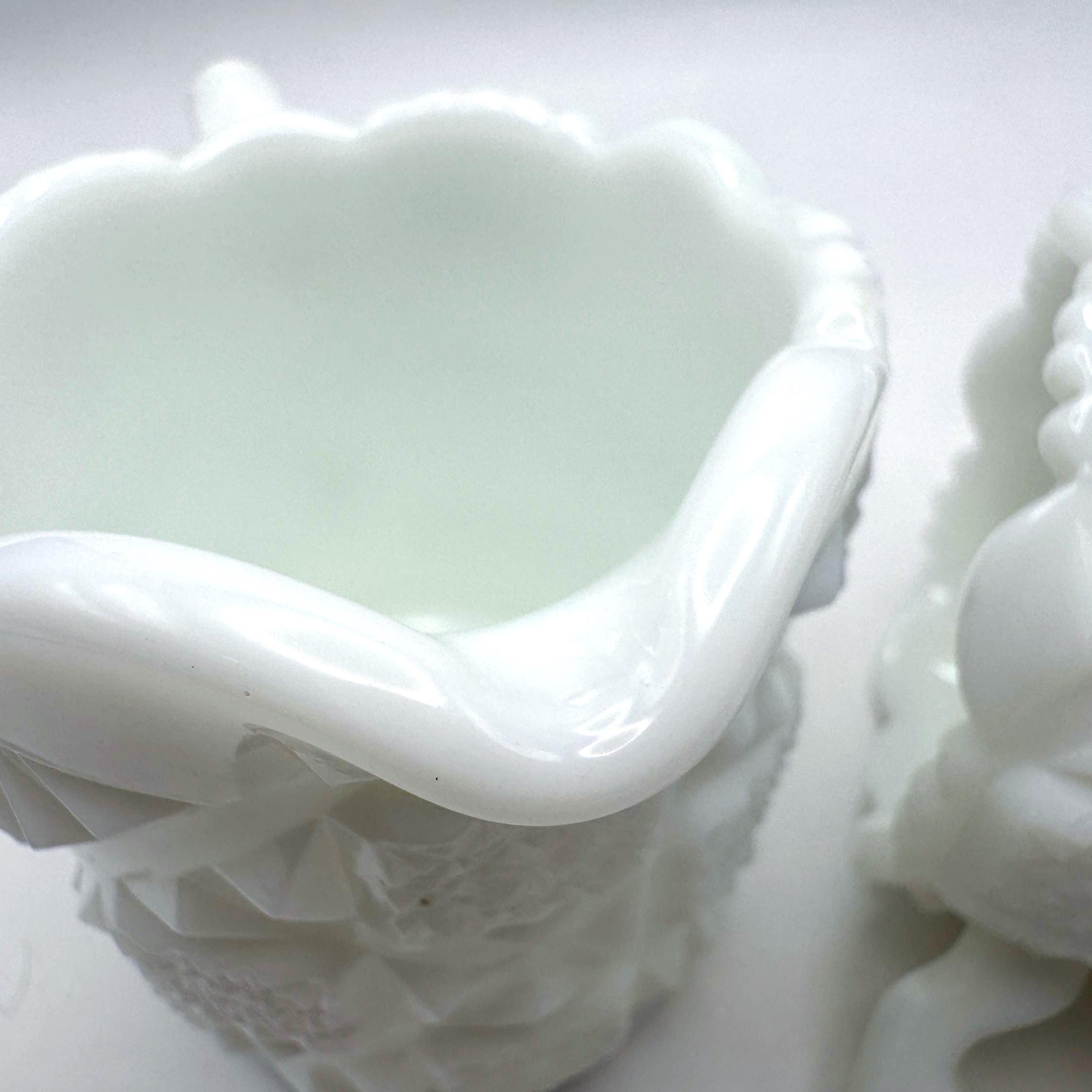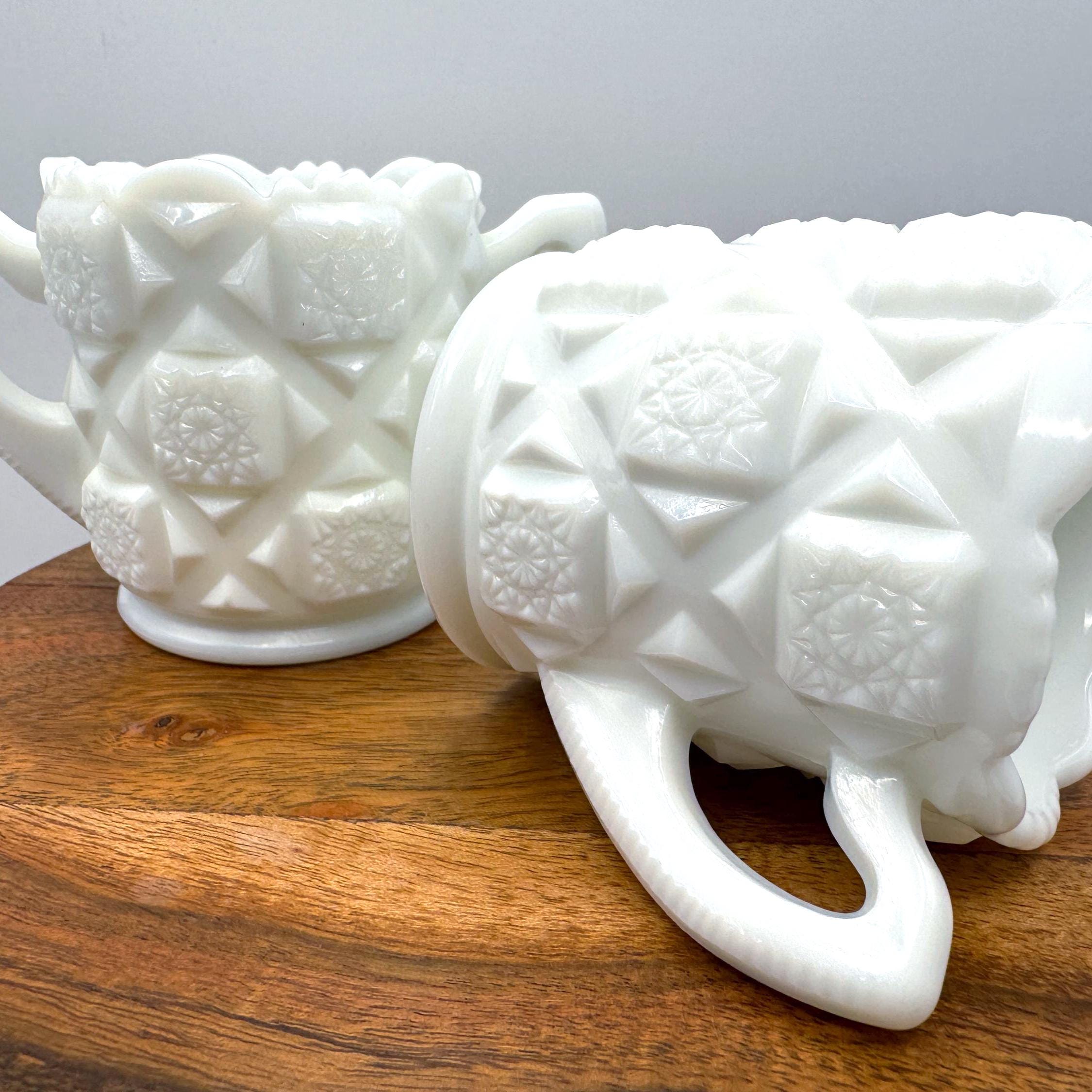 Charming vintage Westmoreland milk glass creamer and sugar set in the classic 'Old Quilt' (Quilted) pattern. This geometric design features raised squares with starburst centers and crisscross diamonds — one of Westmoreland’s most collectible textured patterns.
