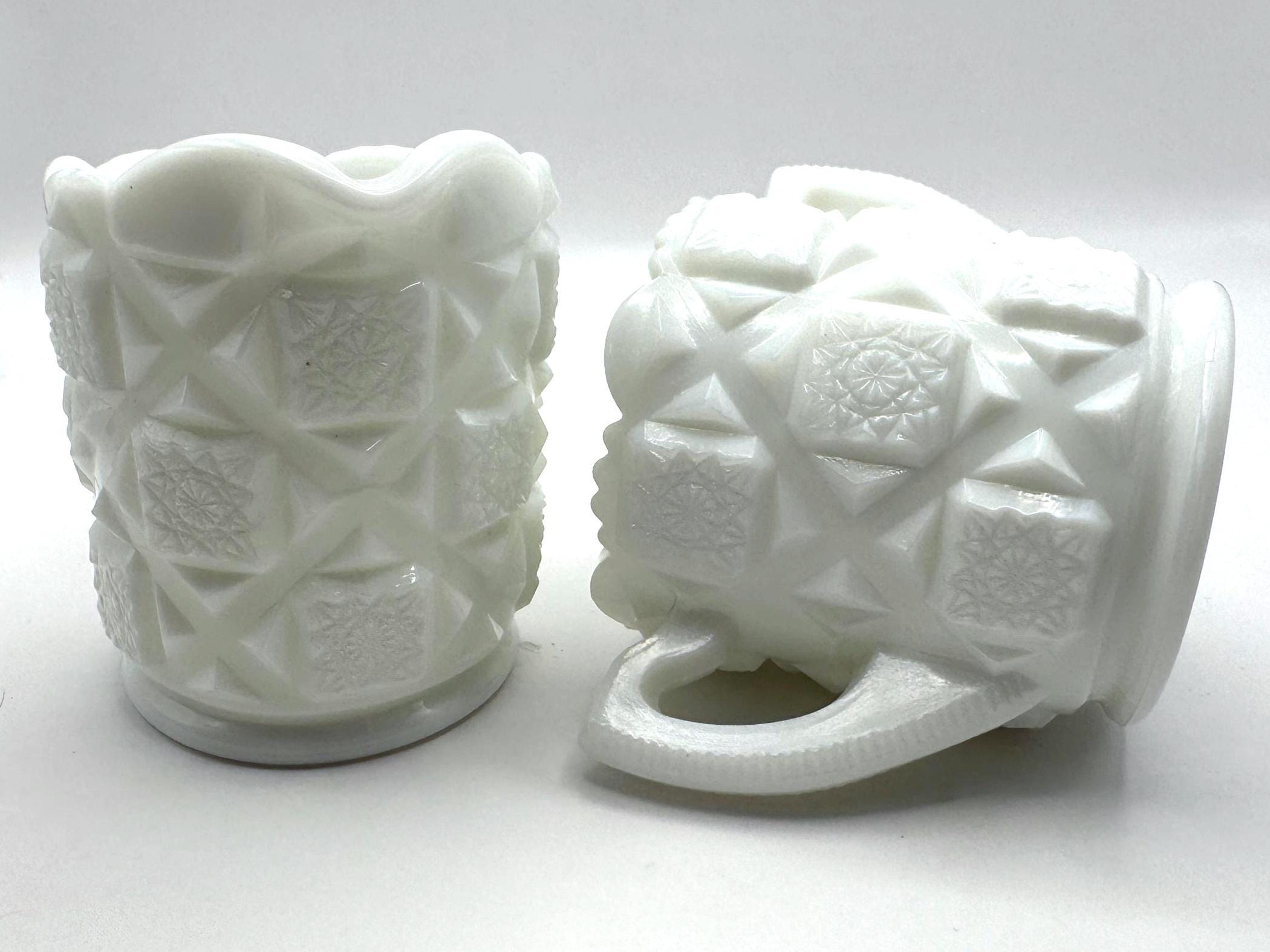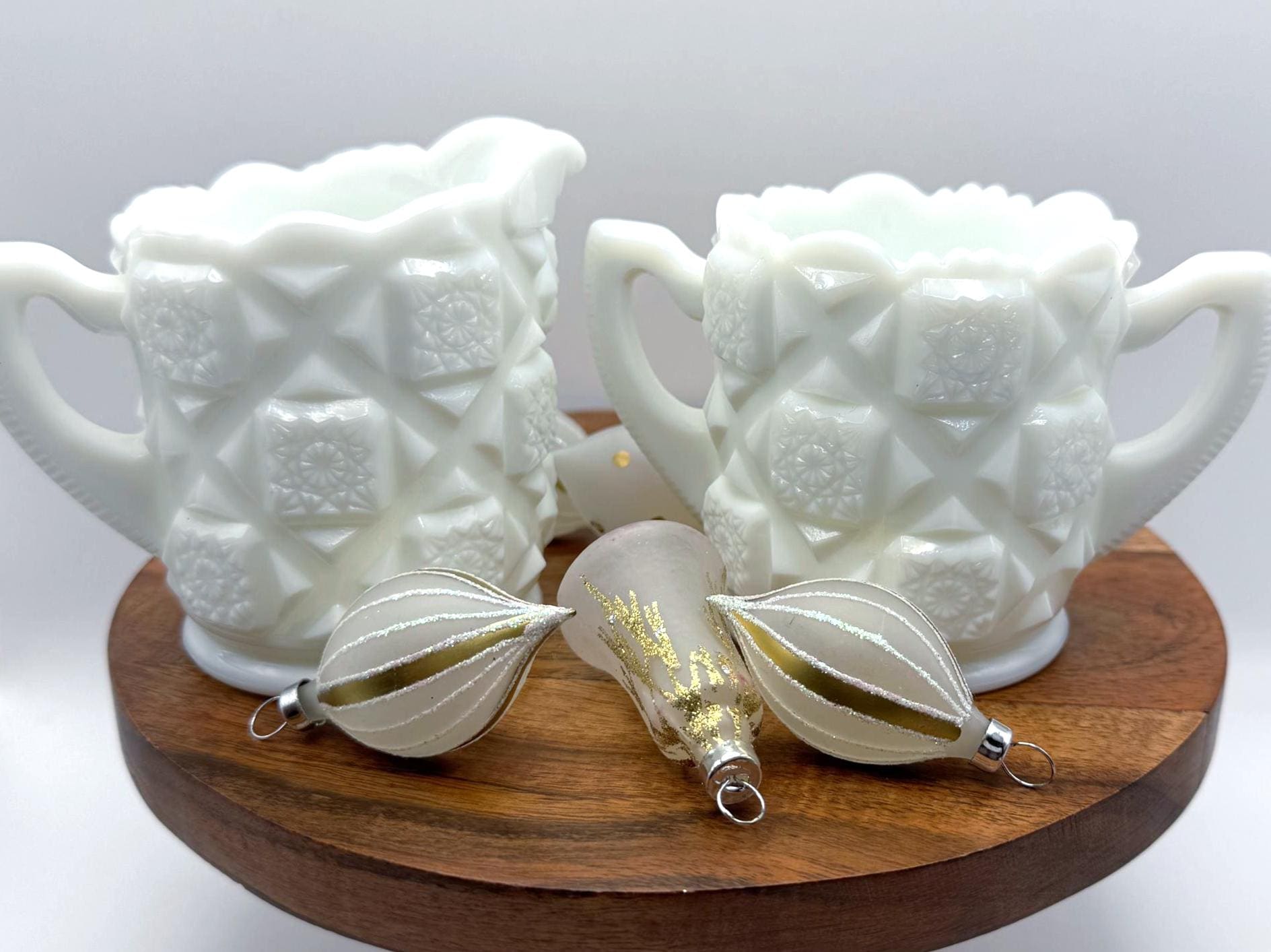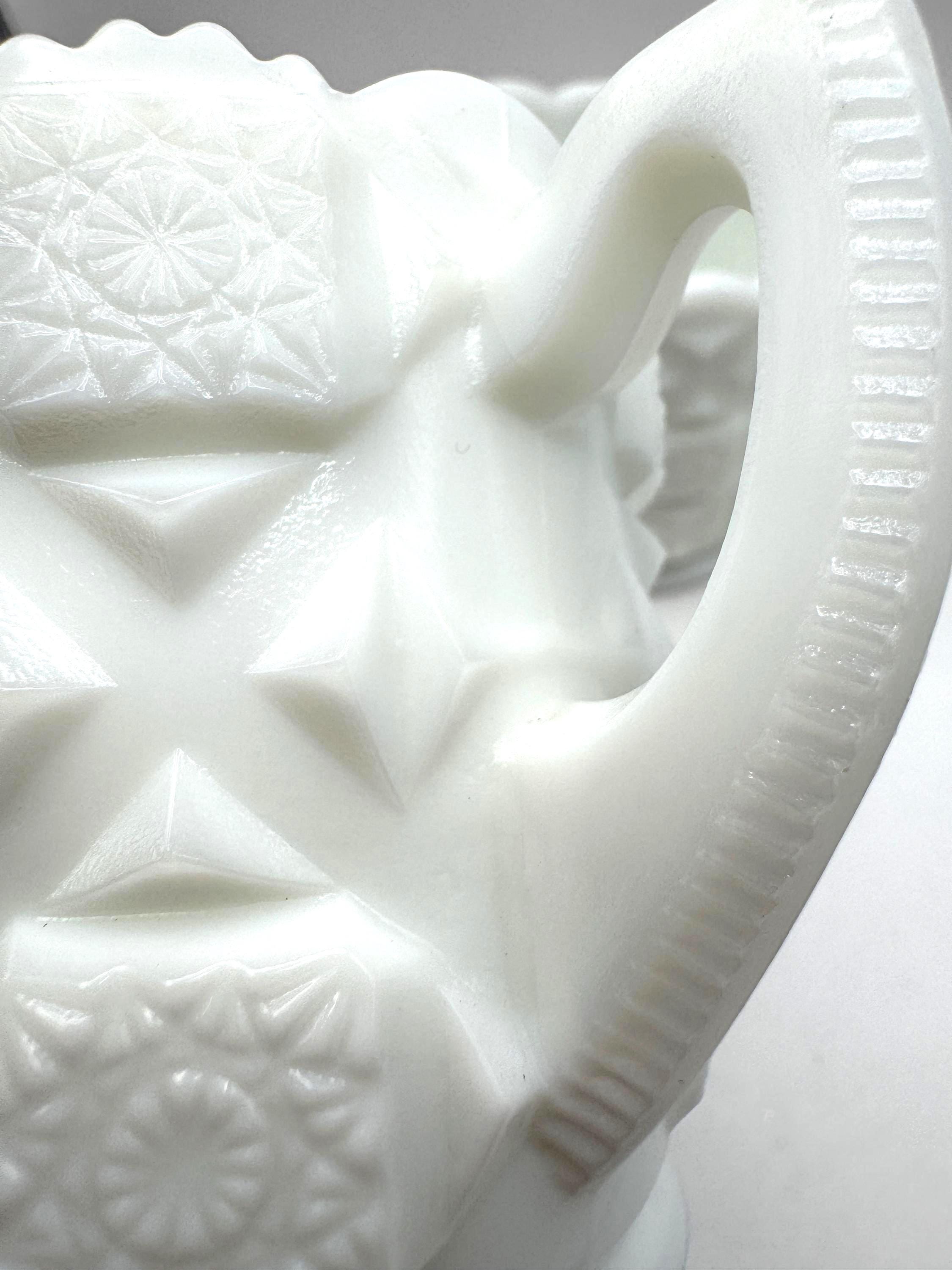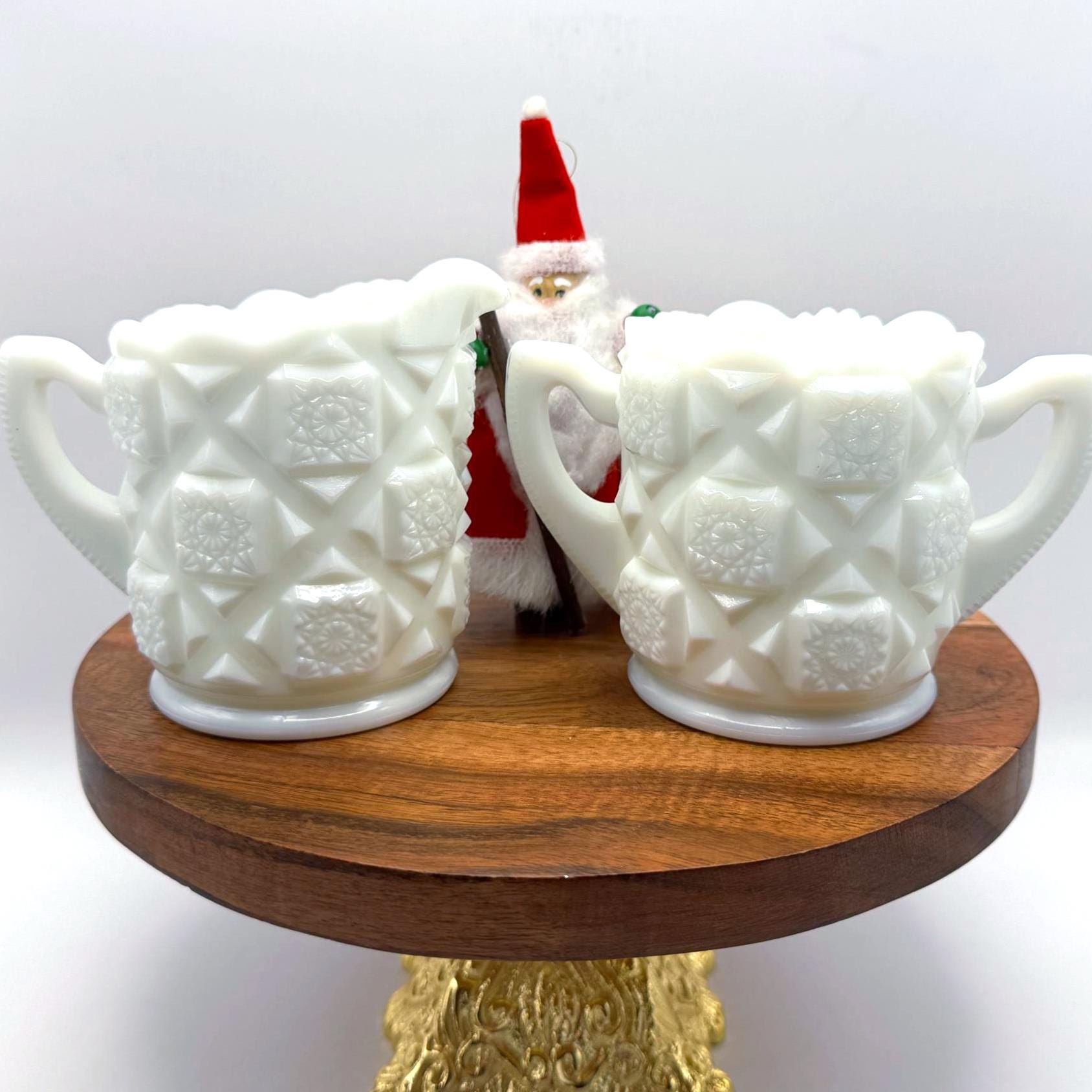 Charming vintage Westmoreland milk glass creamer and sugar set in the classic 'Old Quilt' (Quilted) pattern. This geometric design features raised squares with starburst centers and crisscross diamonds — one of Westmoreland’s most collectible textured patterns.