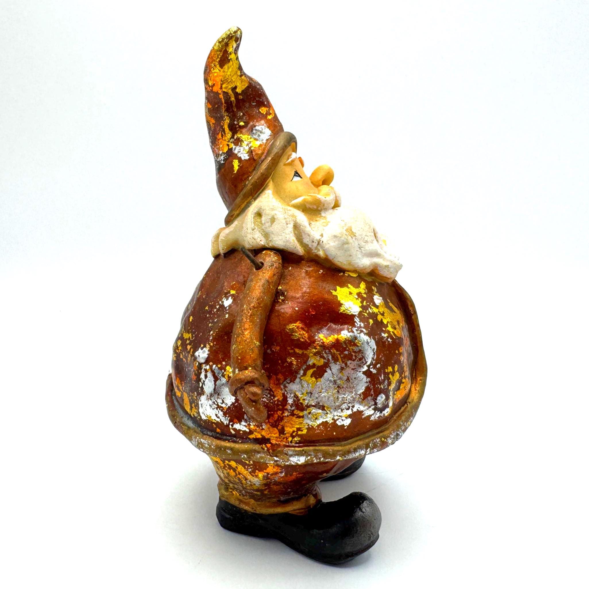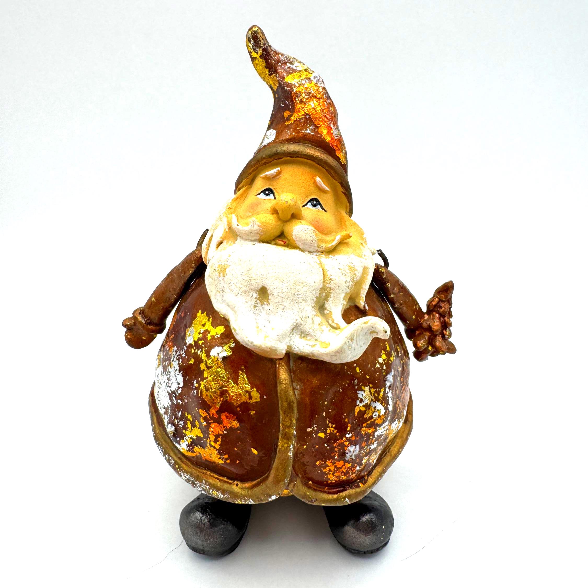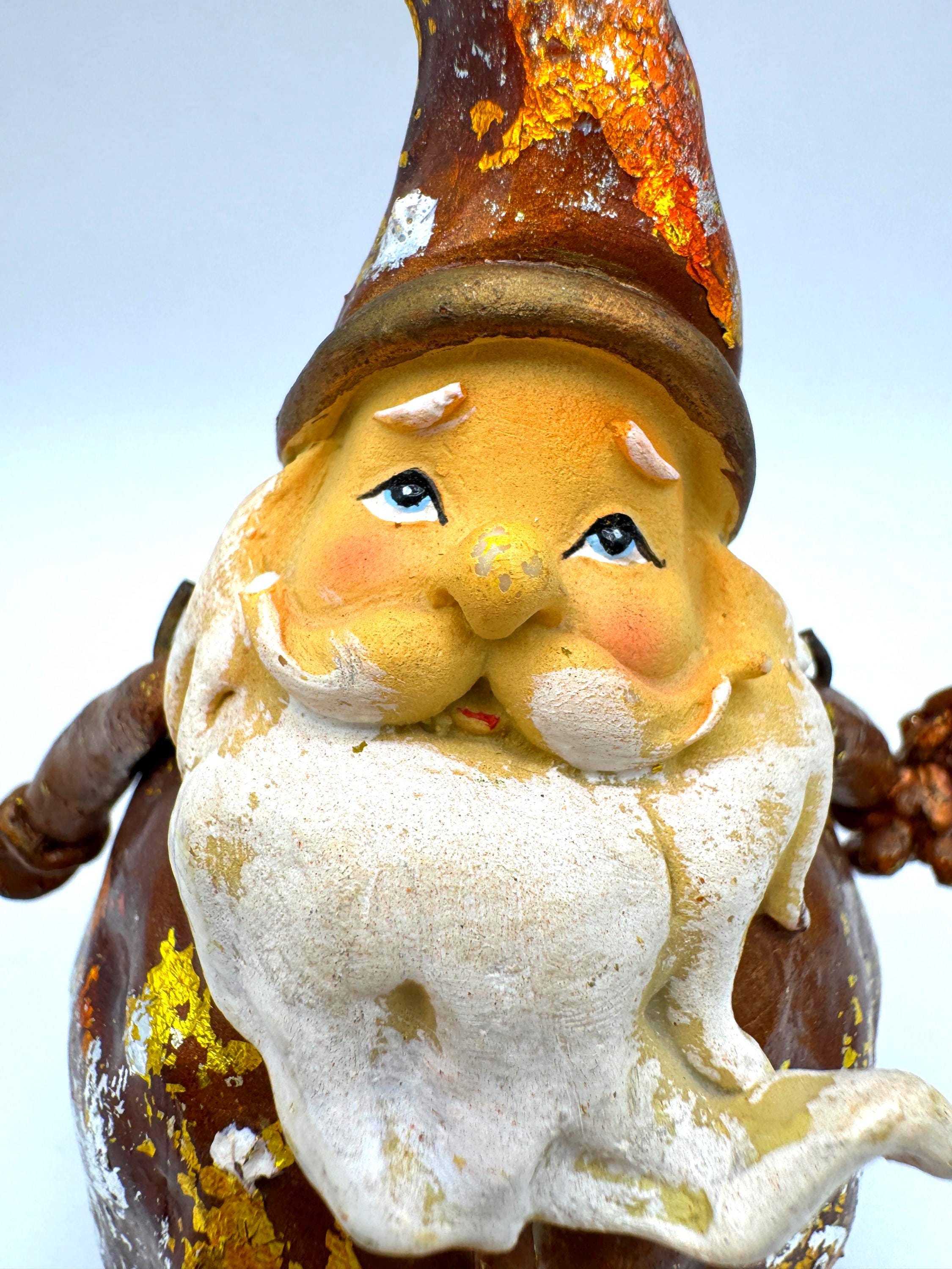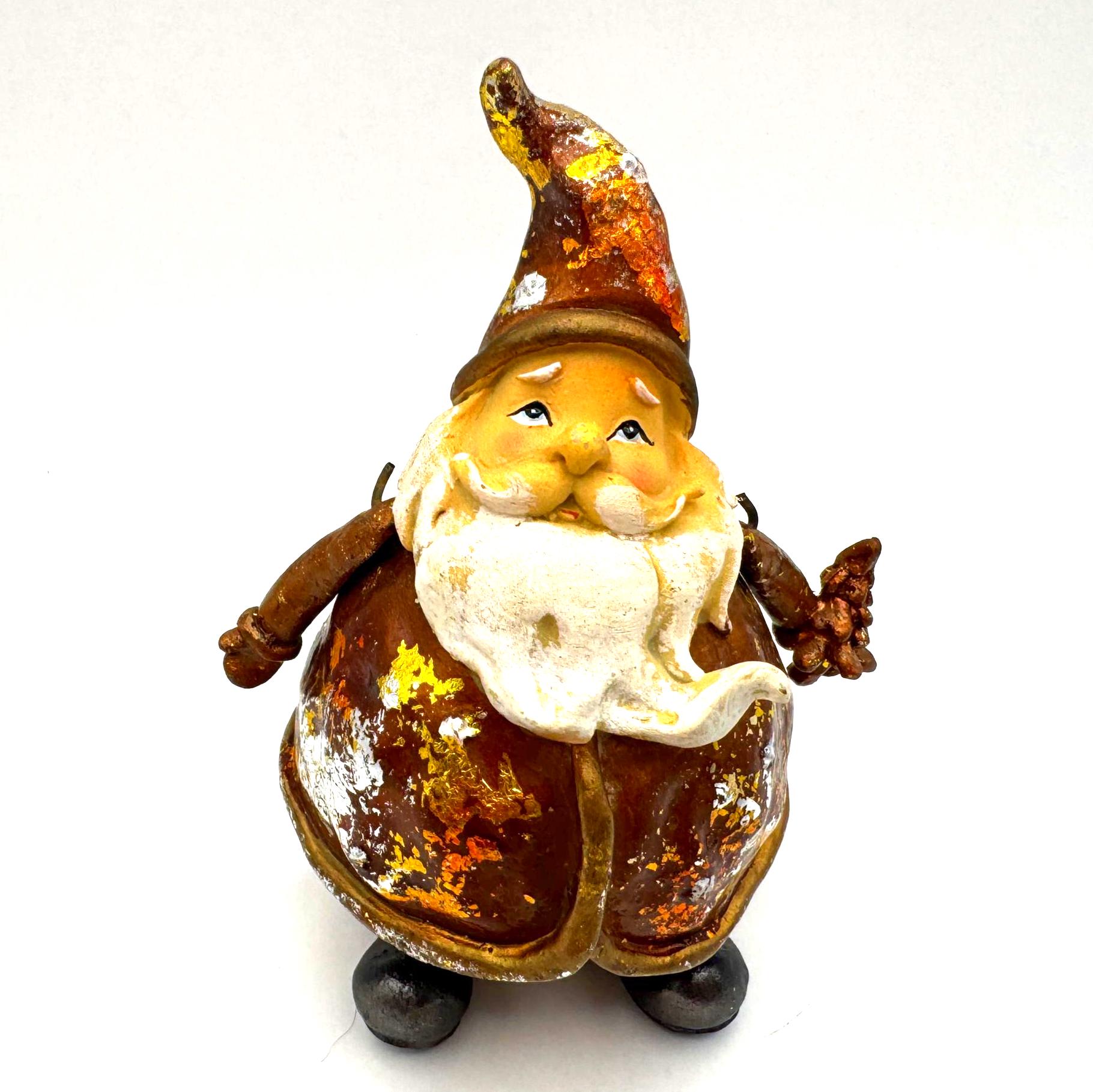 The finish features intentional rustic distressing with gold, silver, and brown foiled accents — the aged effect is part of his style. He also shows some genuine wear from age or handling, including scattered paint loss and flaking in a few areas. Together, the intentional distress and natural wear blend into a perfectly imperfect, farmhouse-style holiday piece.