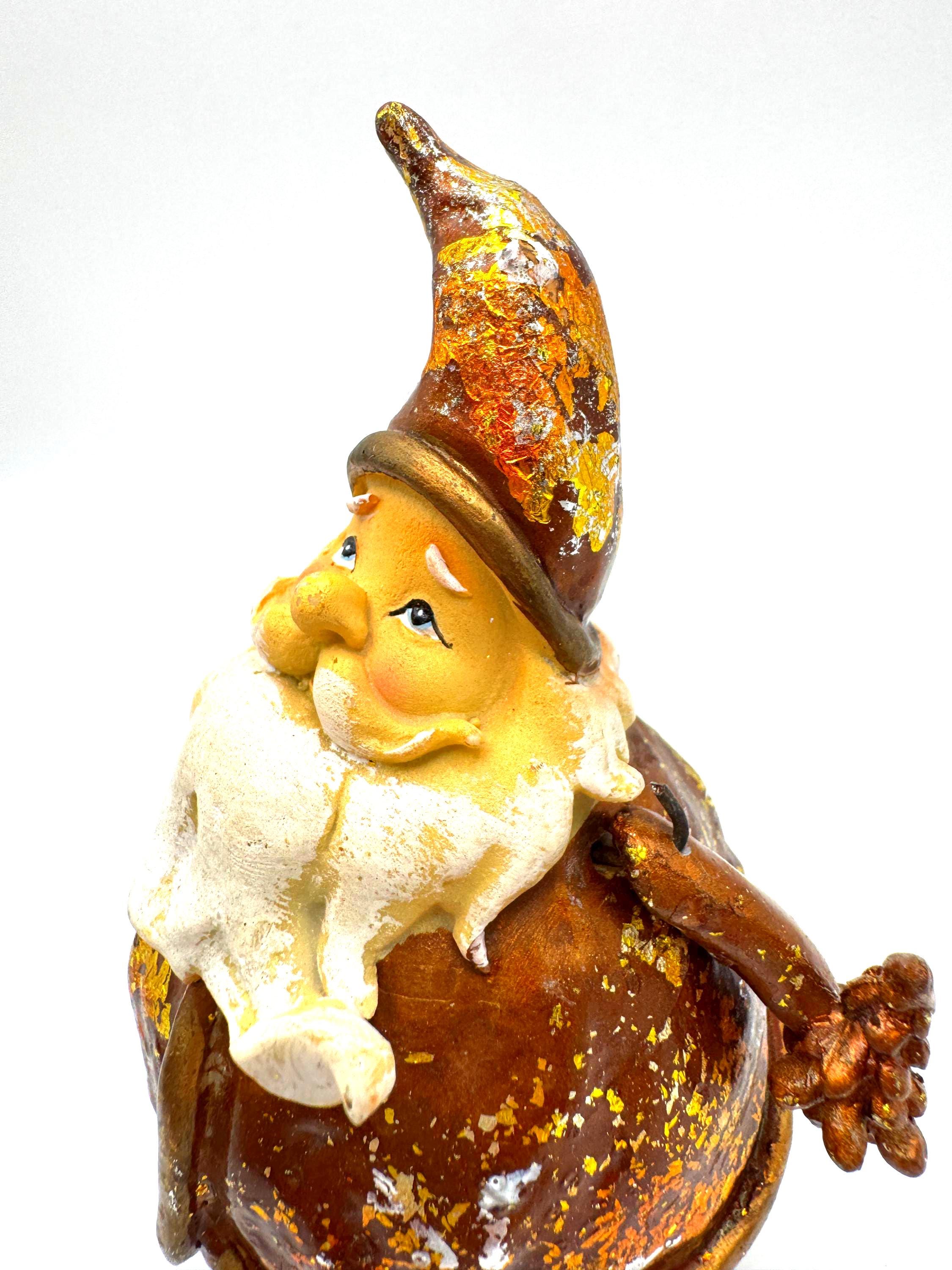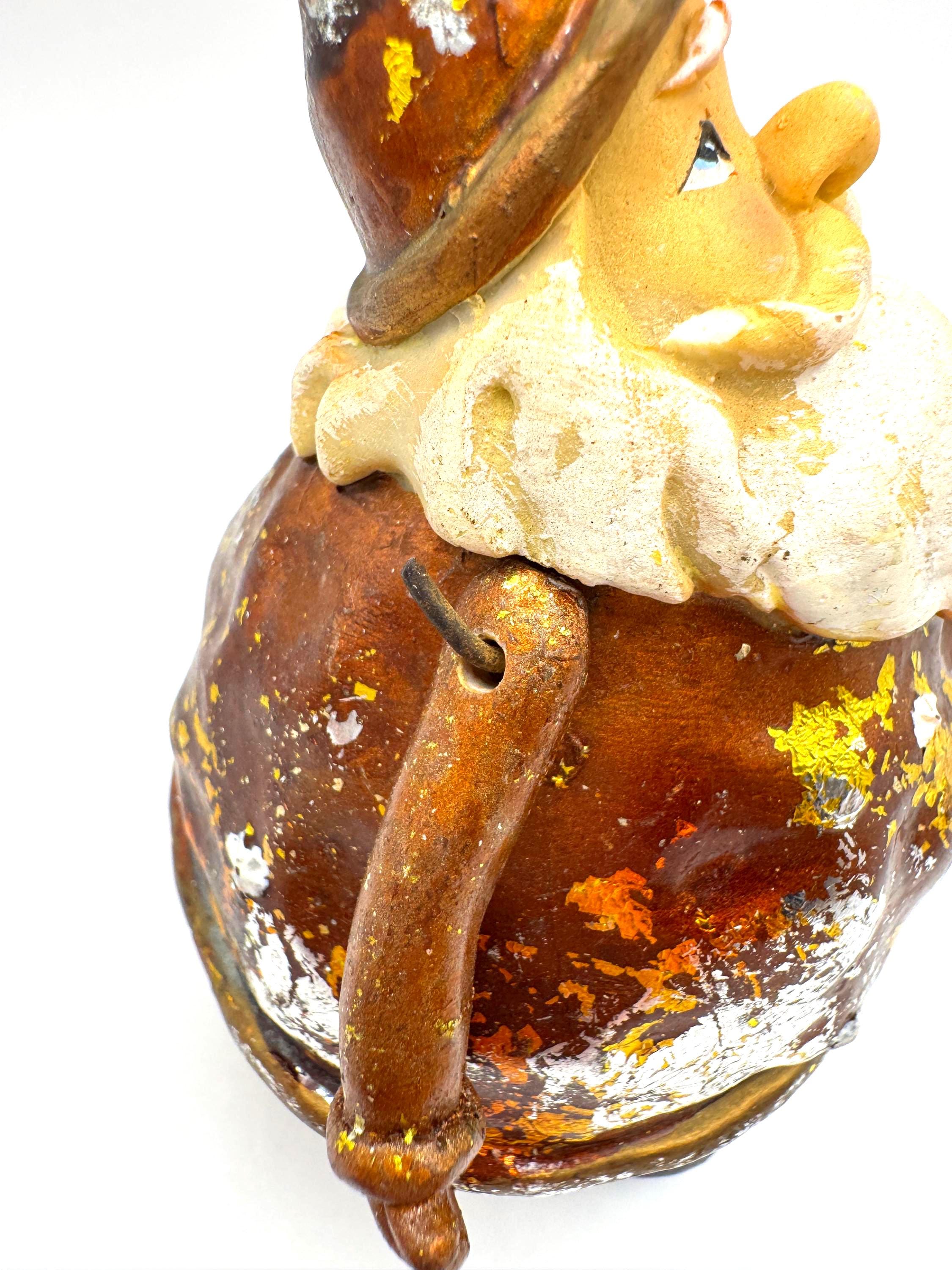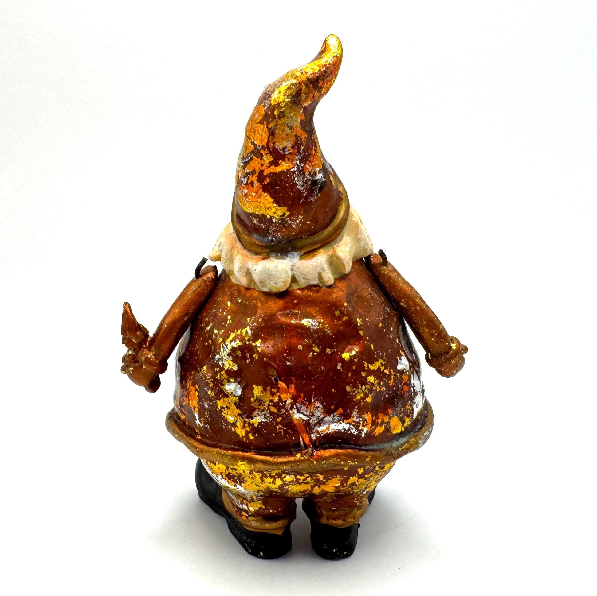 The finish features intentional rustic distressing with gold, silver, and brown foiled accents — the aged effect is part of his style. He also shows some genuine wear from age or handling, including scattered paint loss and flaking in a few areas. Together, the intentional distress and natural wear blend into a perfectly imperfect, farmhouse-style holiday piece.
