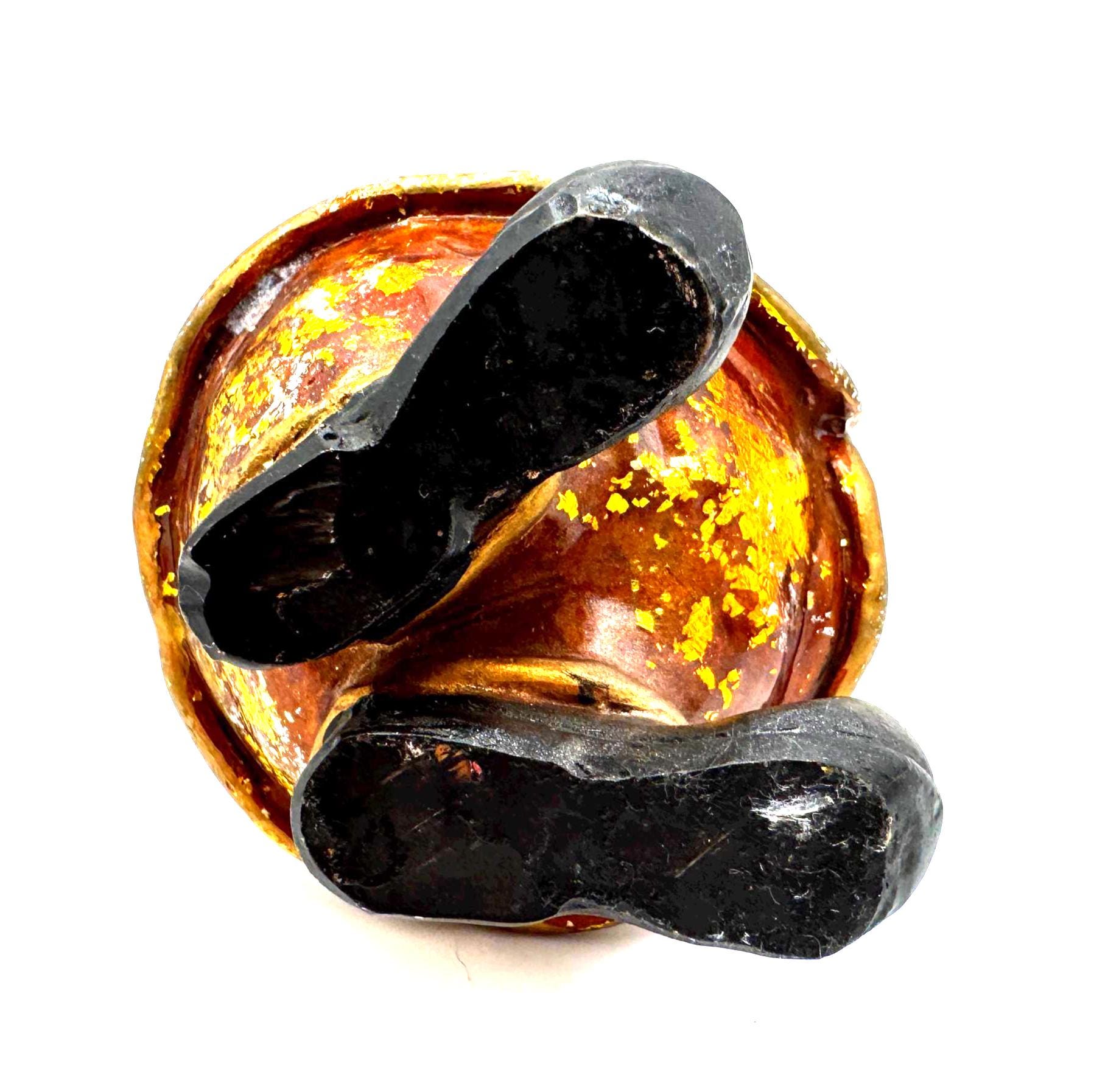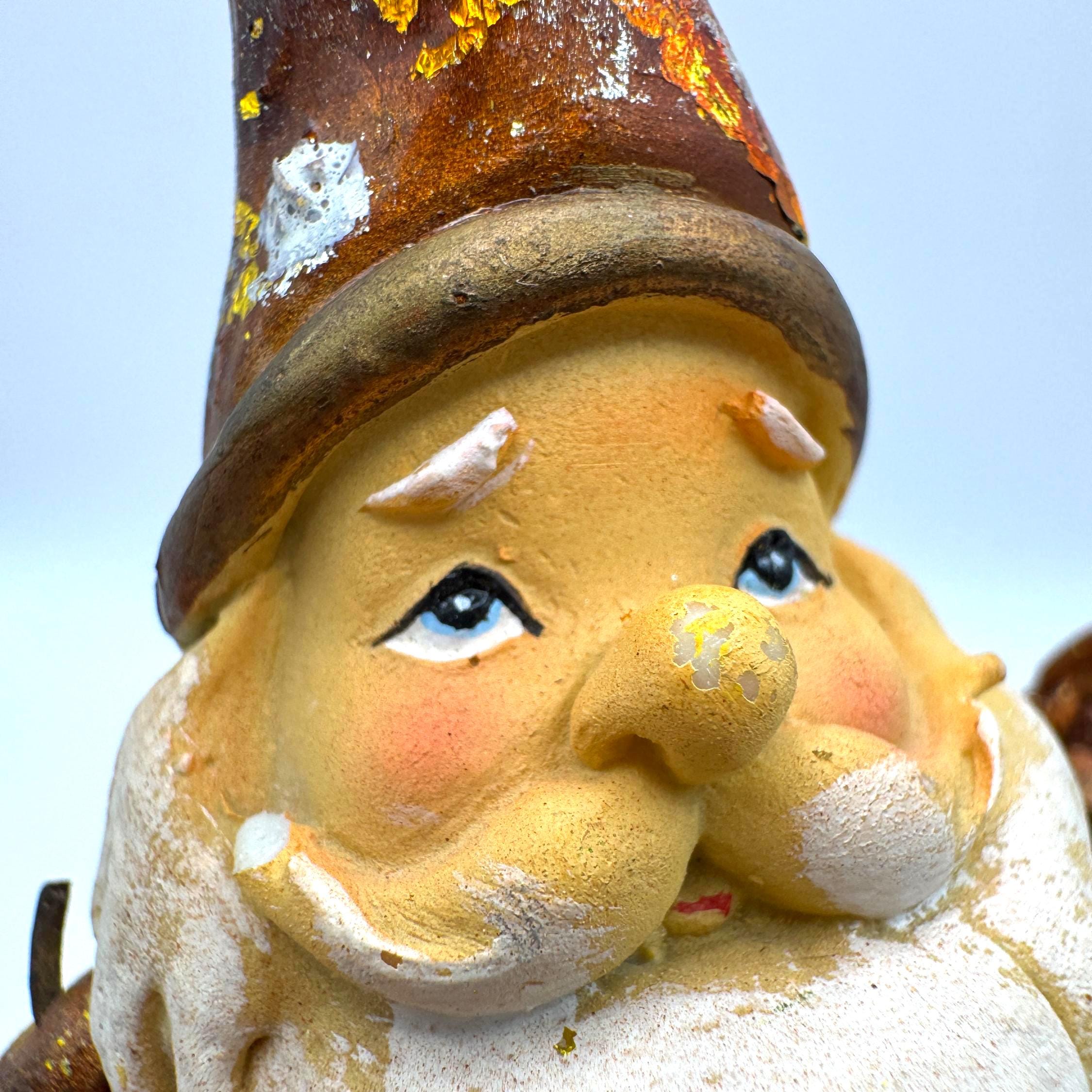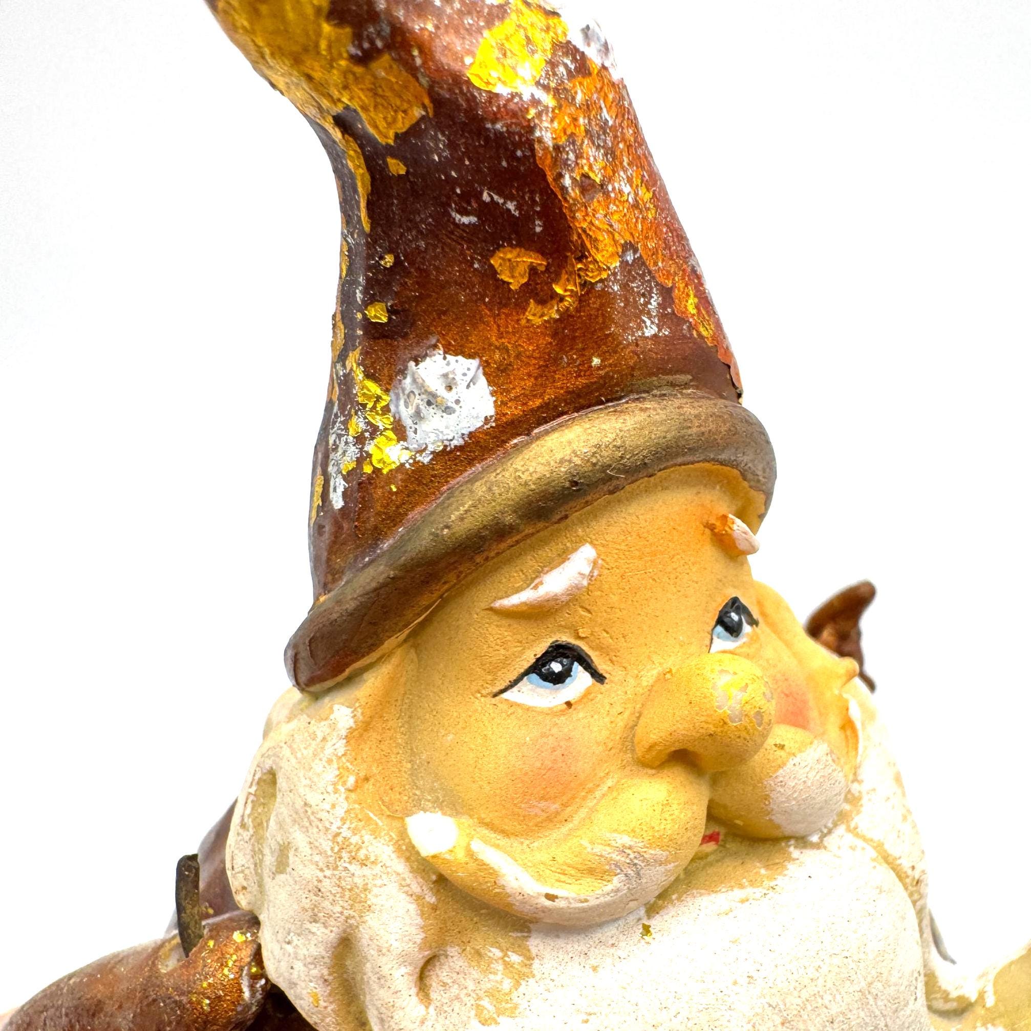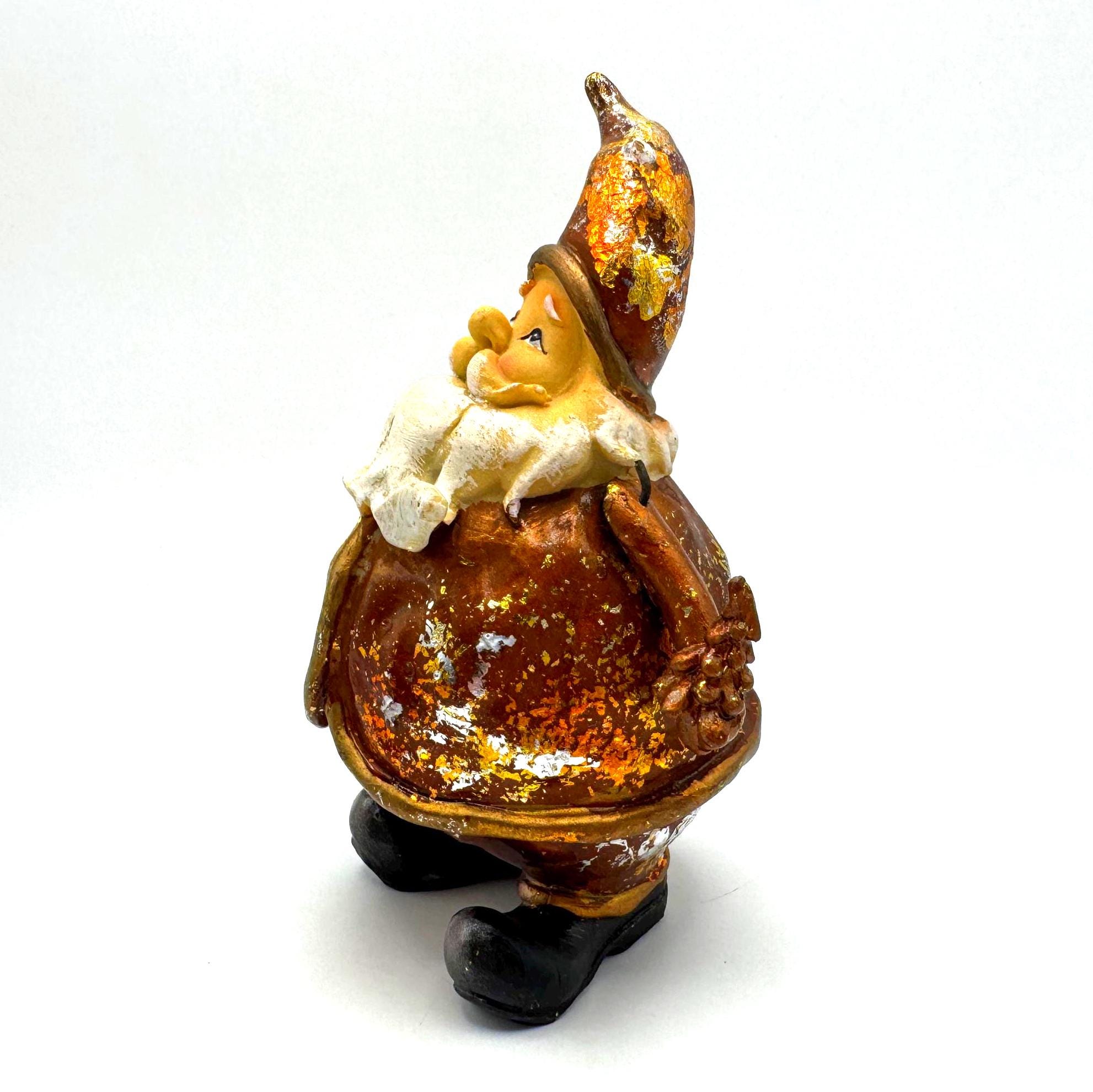 The finish features intentional rustic distressing with gold, silver, and brown foiled accents — the aged effect is part of his style. He also shows some genuine wear from age or handling, including scattered paint loss and flaking in a few areas. Together, the intentional distress and natural wear blend into a perfectly imperfect, farmhouse-style holiday piece.