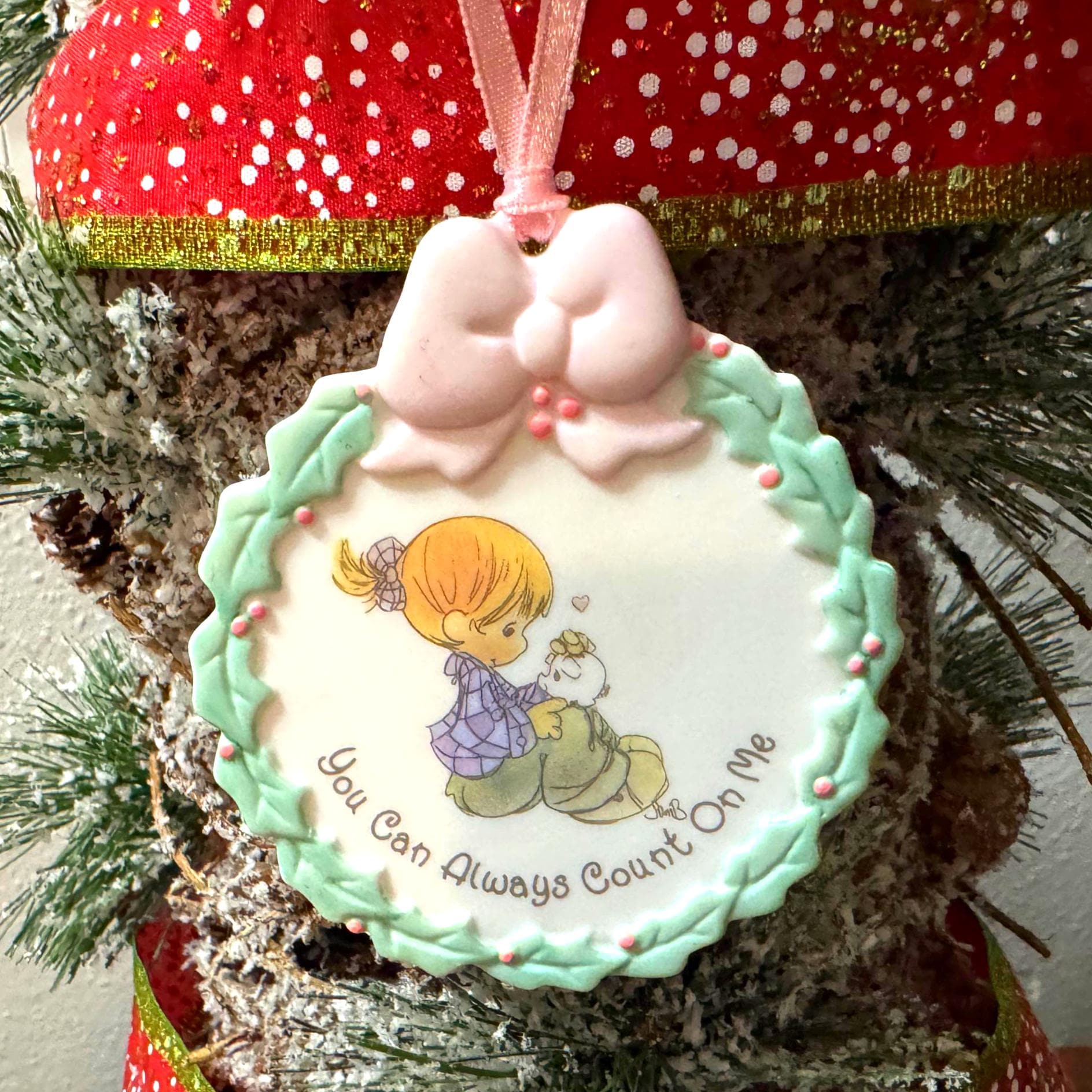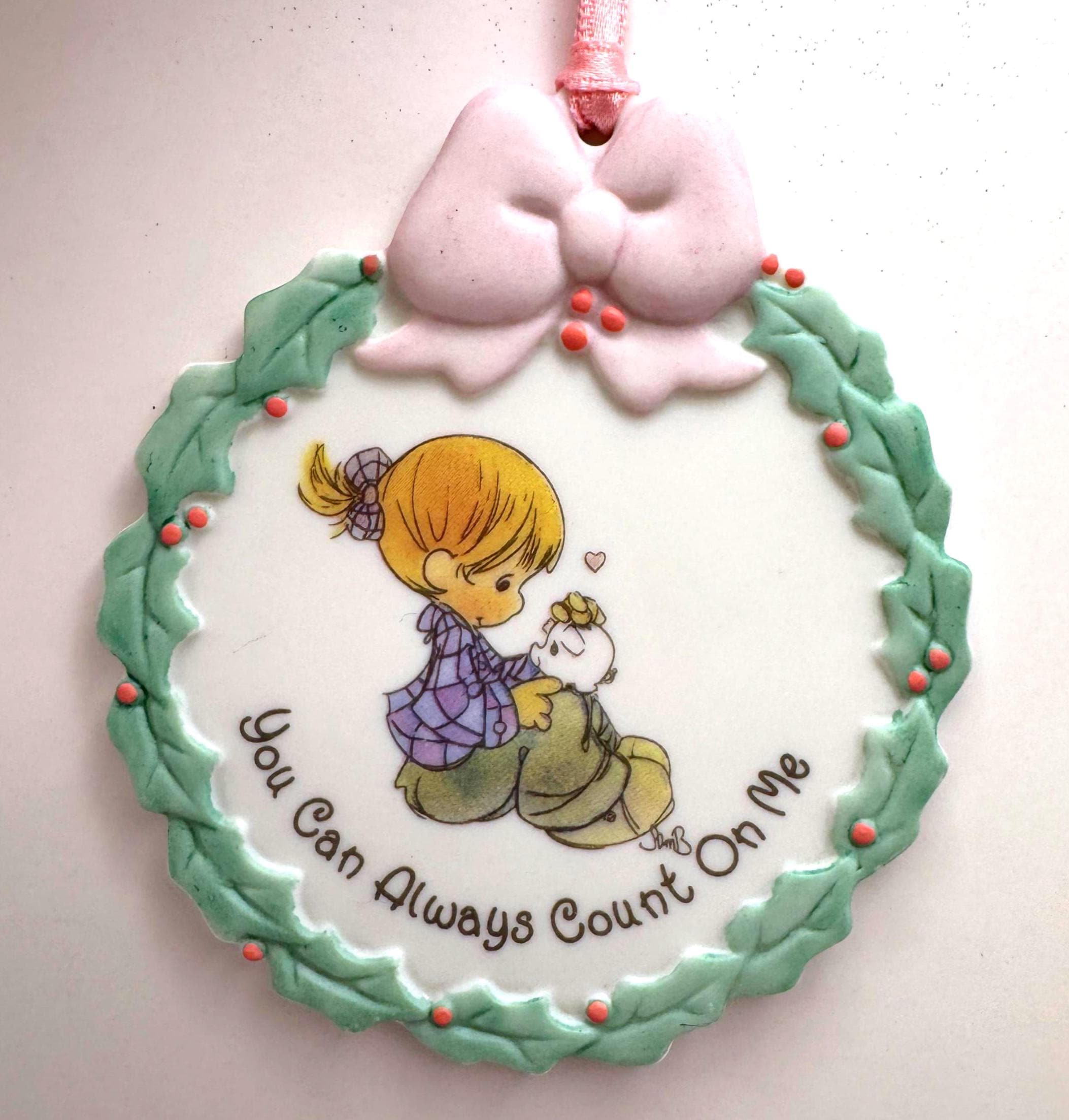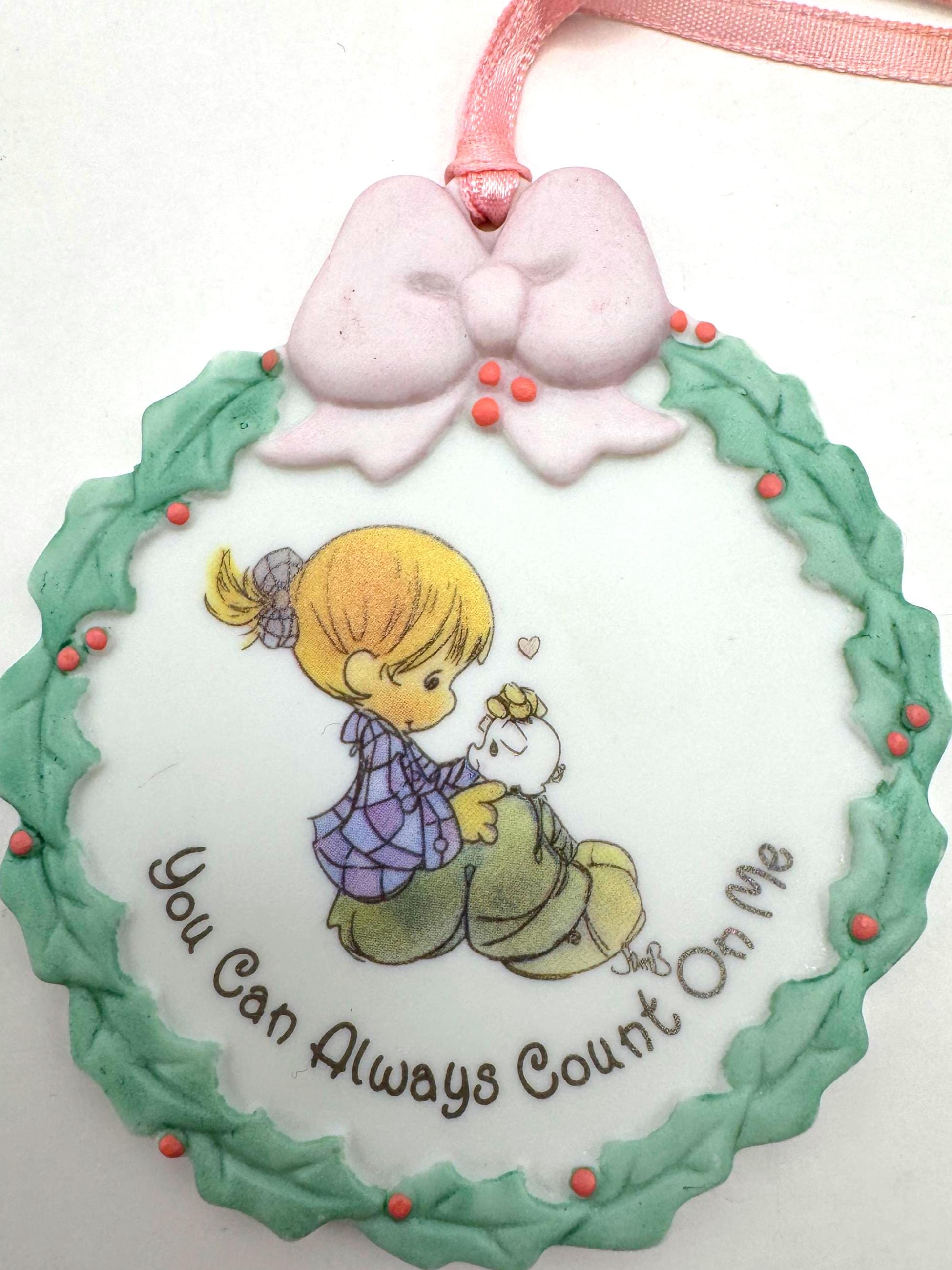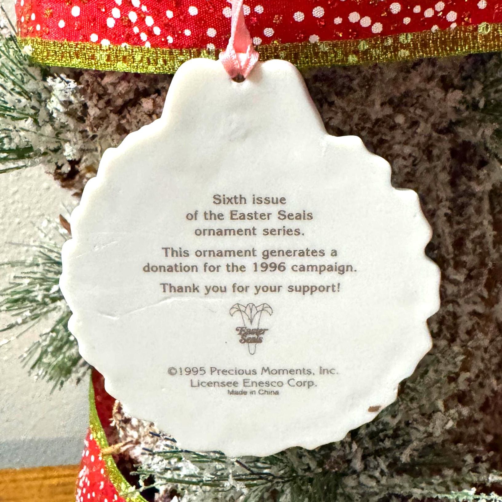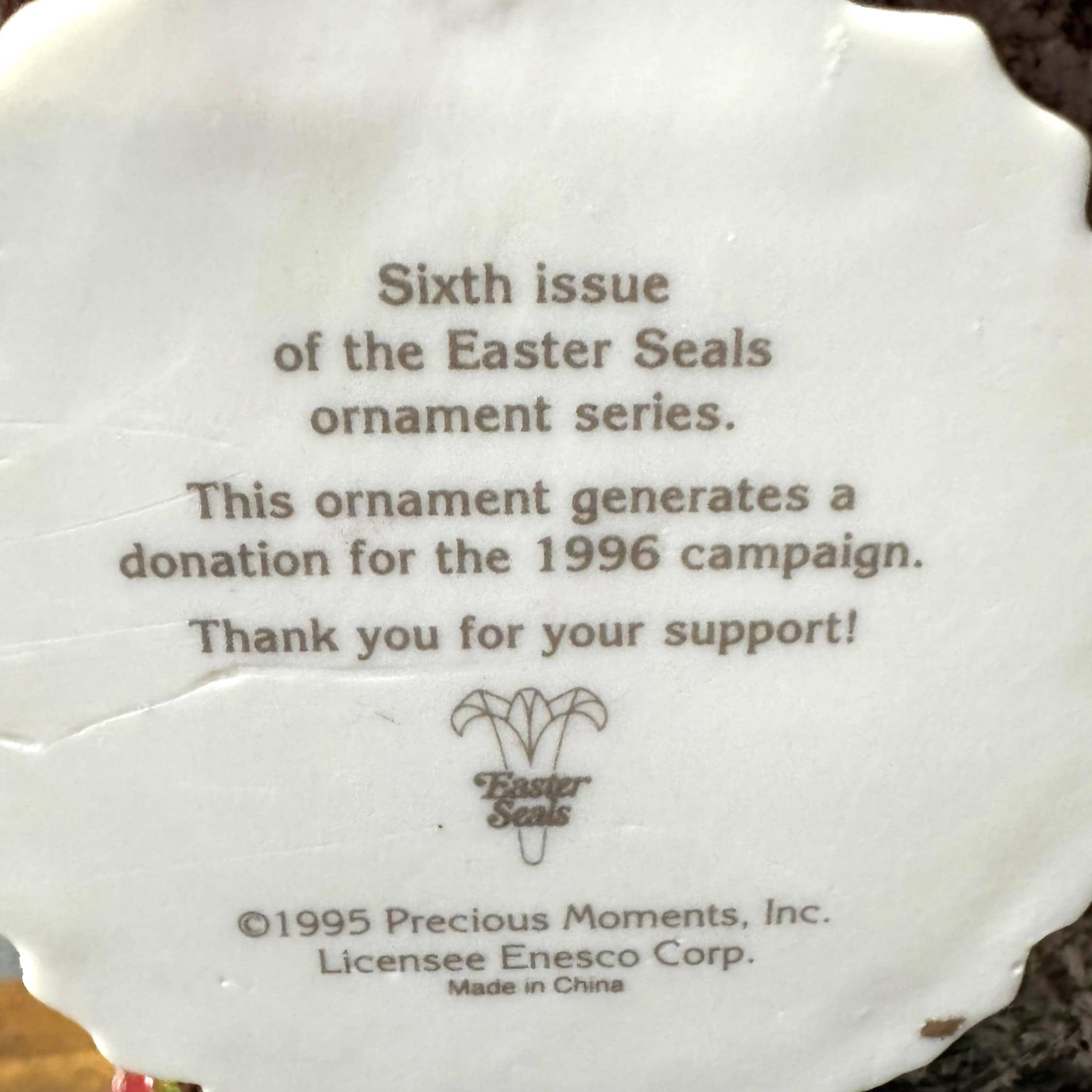 This darling 1996 Precious Moments Easter Seals ornament is the sixth issue in the charity ornament series created to support Easter Seals fundraising. It features a little girl cuddling her puppy with the phrase “You Can Always Count On Me.” Finished with soft pastel colors, holly detailing, and a pink bow at the top, it’s a sweet addition to any Christmas tree or PM collection.