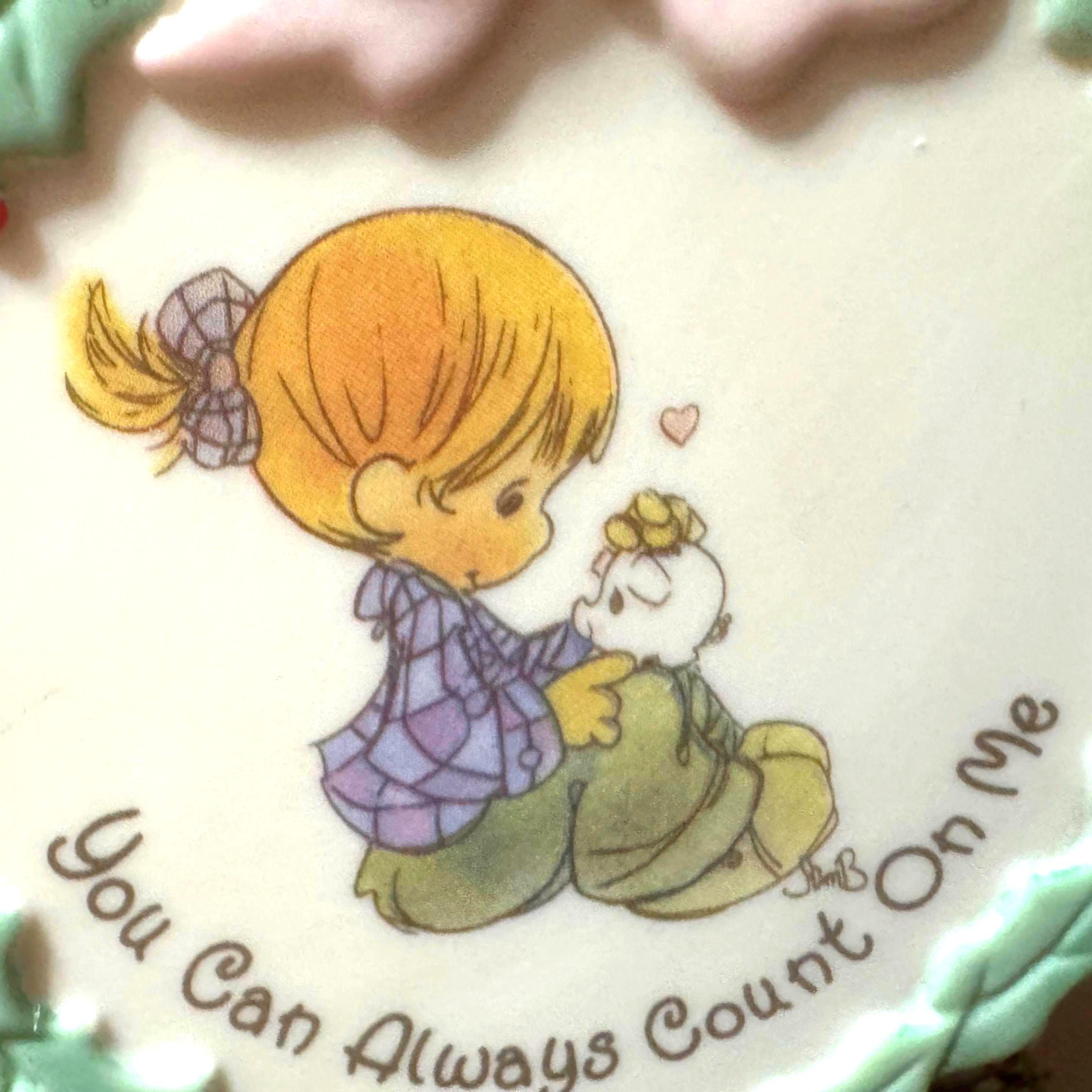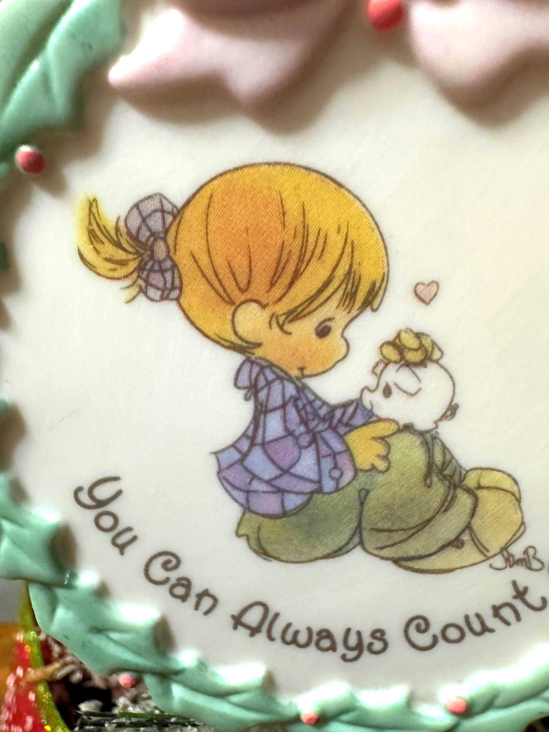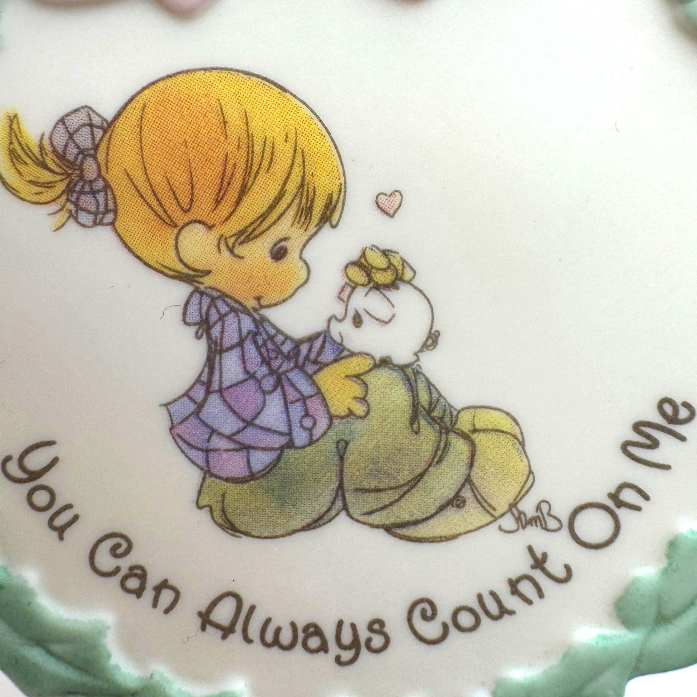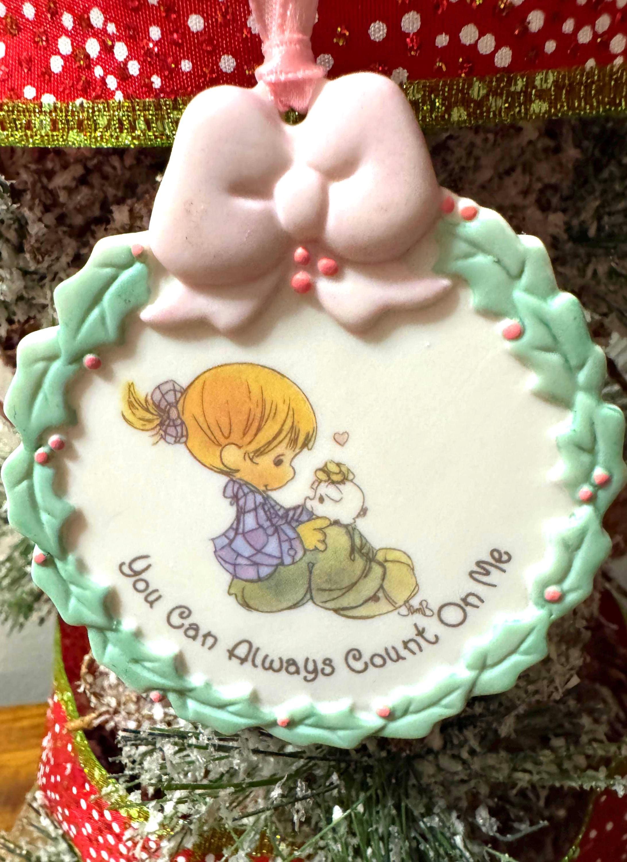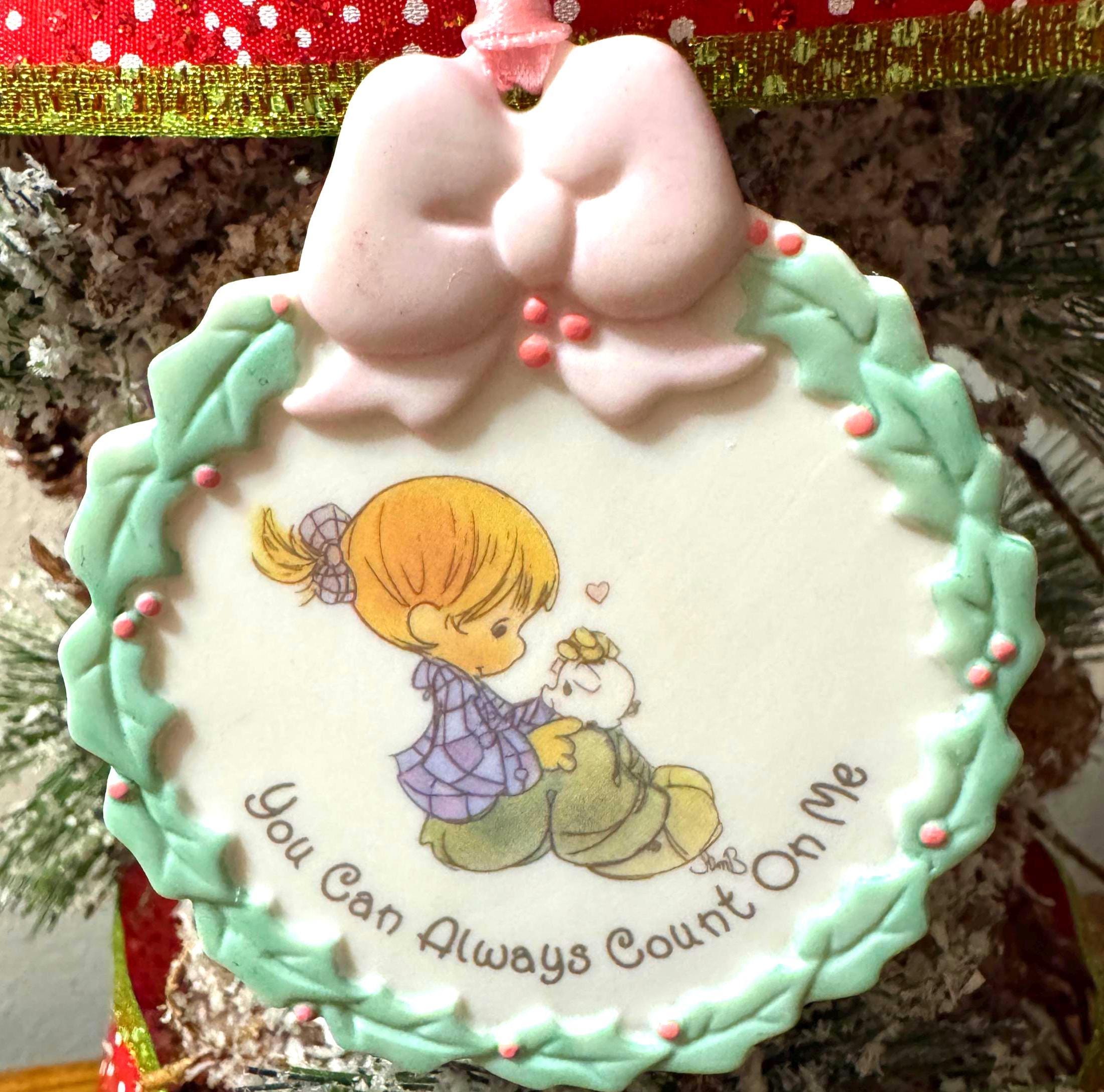 This darling 1996 Precious Moments Easter Seals ornament is the sixth issue in the charity ornament series created to support Easter Seals fundraising. It features a little girl cuddling her puppy with the phrase “You Can Always Count On Me.” Finished with soft pastel colors, holly detailing, and a pink bow at the top, it’s a sweet addition to any Christmas tree or PM collection.