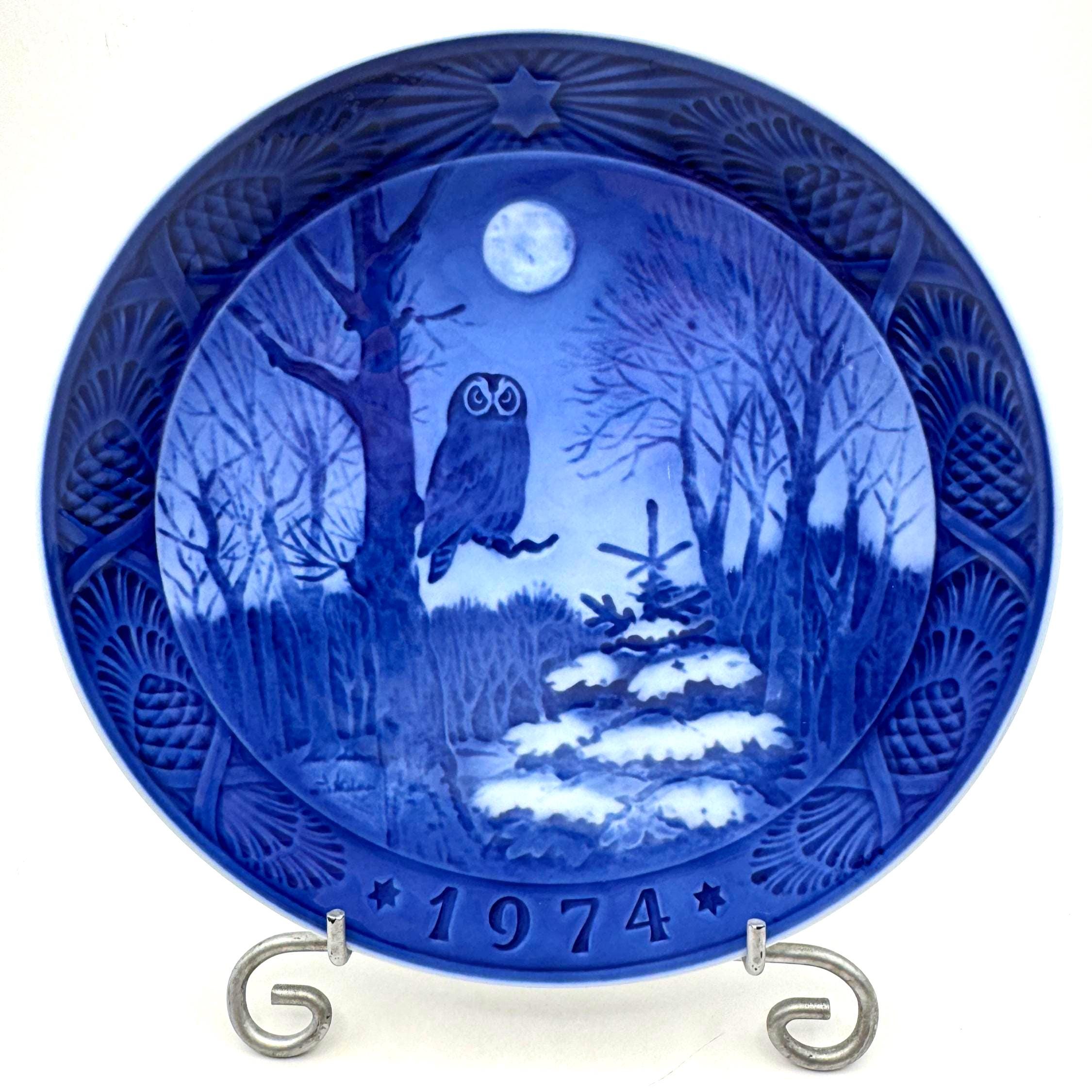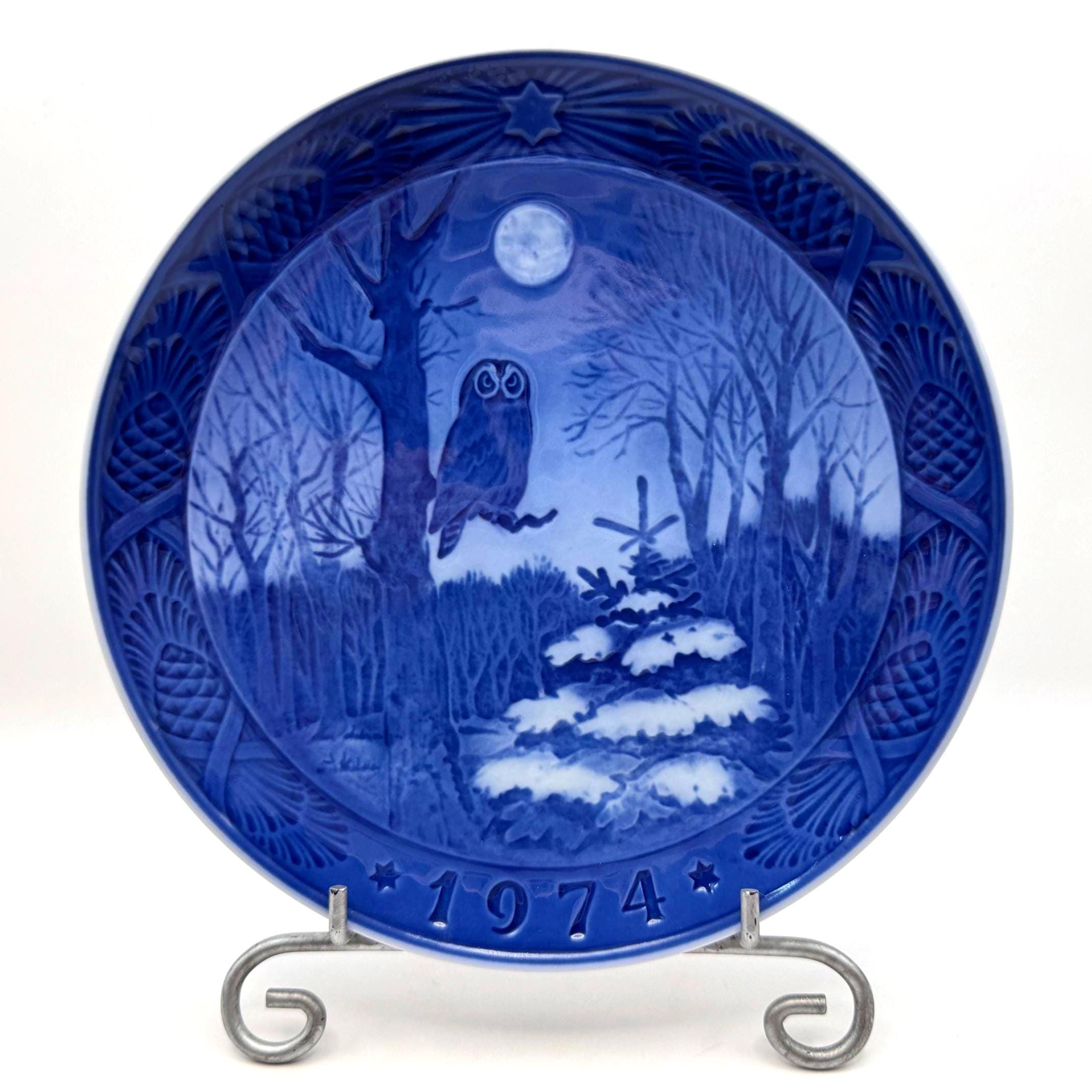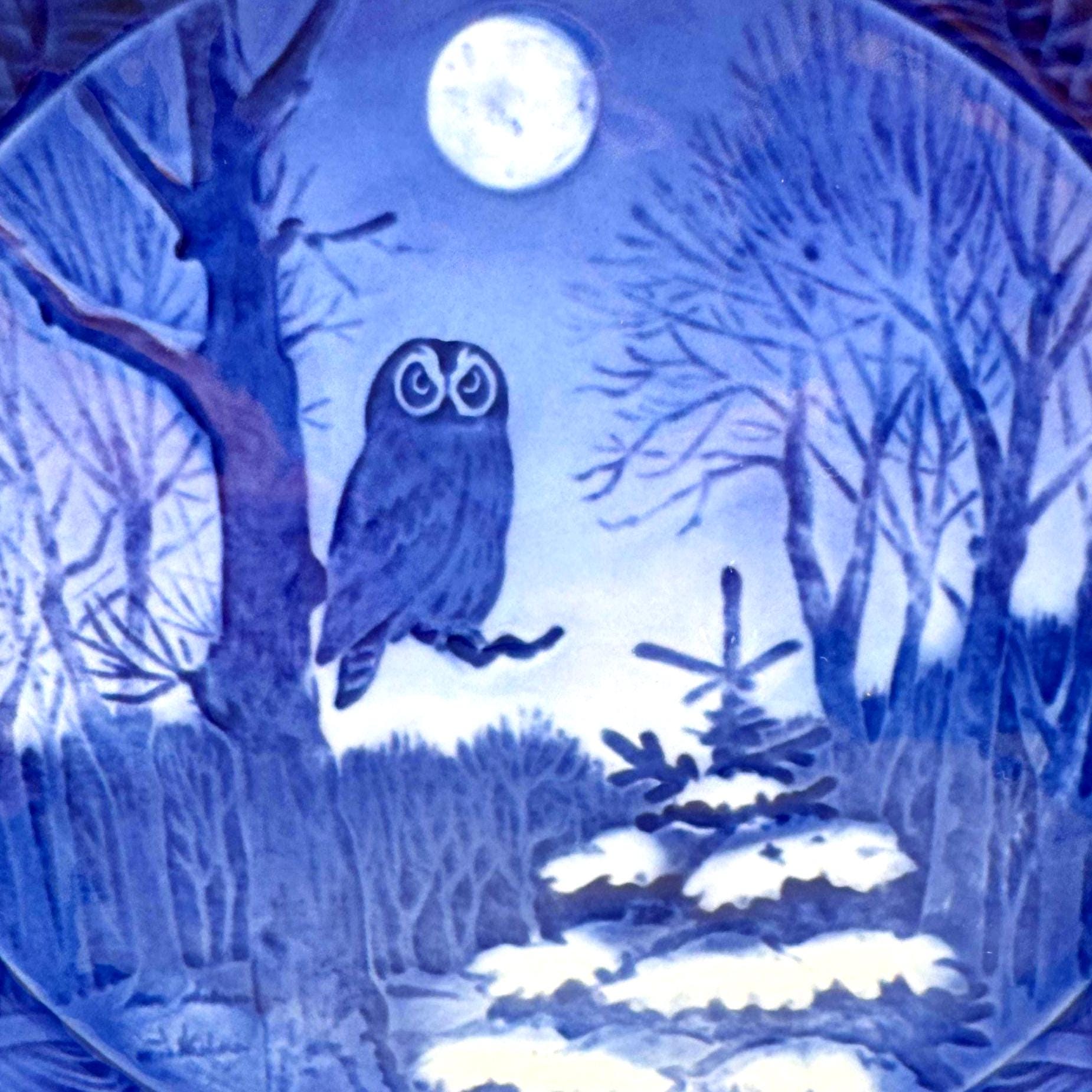 This 1974 Royal Copenhagen Christmas plate, “Vinterskumring” (Winter Twilight), features a beautifully detailed winter forest scene under a glowing full moon. An owl sits quietly on a snow-dusted tree, surrounded by serene woodland shadows — a classic example of Kaj Lange’s atmospheric blue-and-white storytelling.