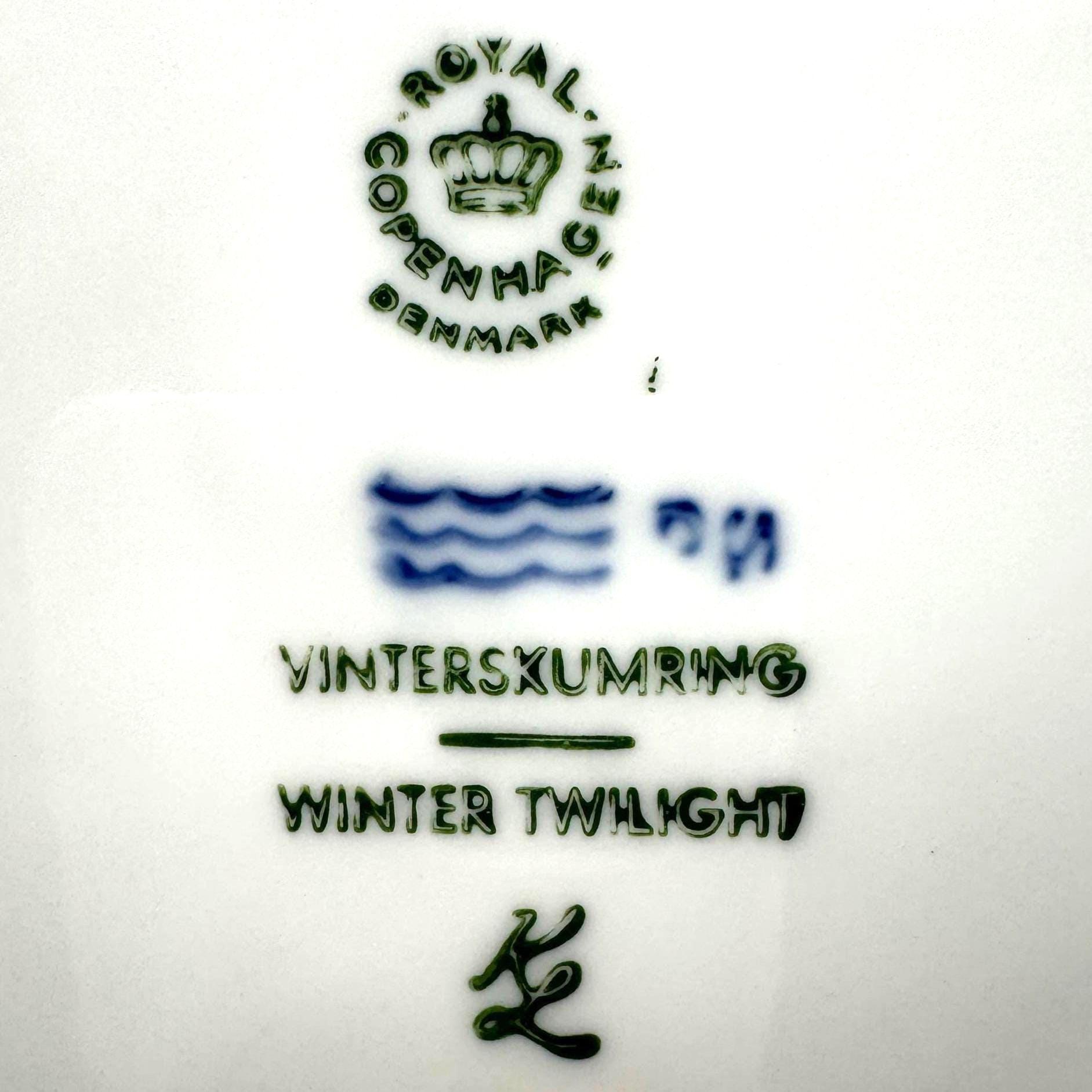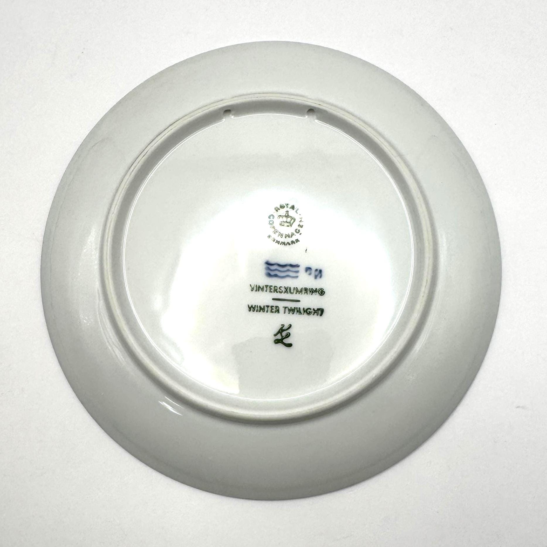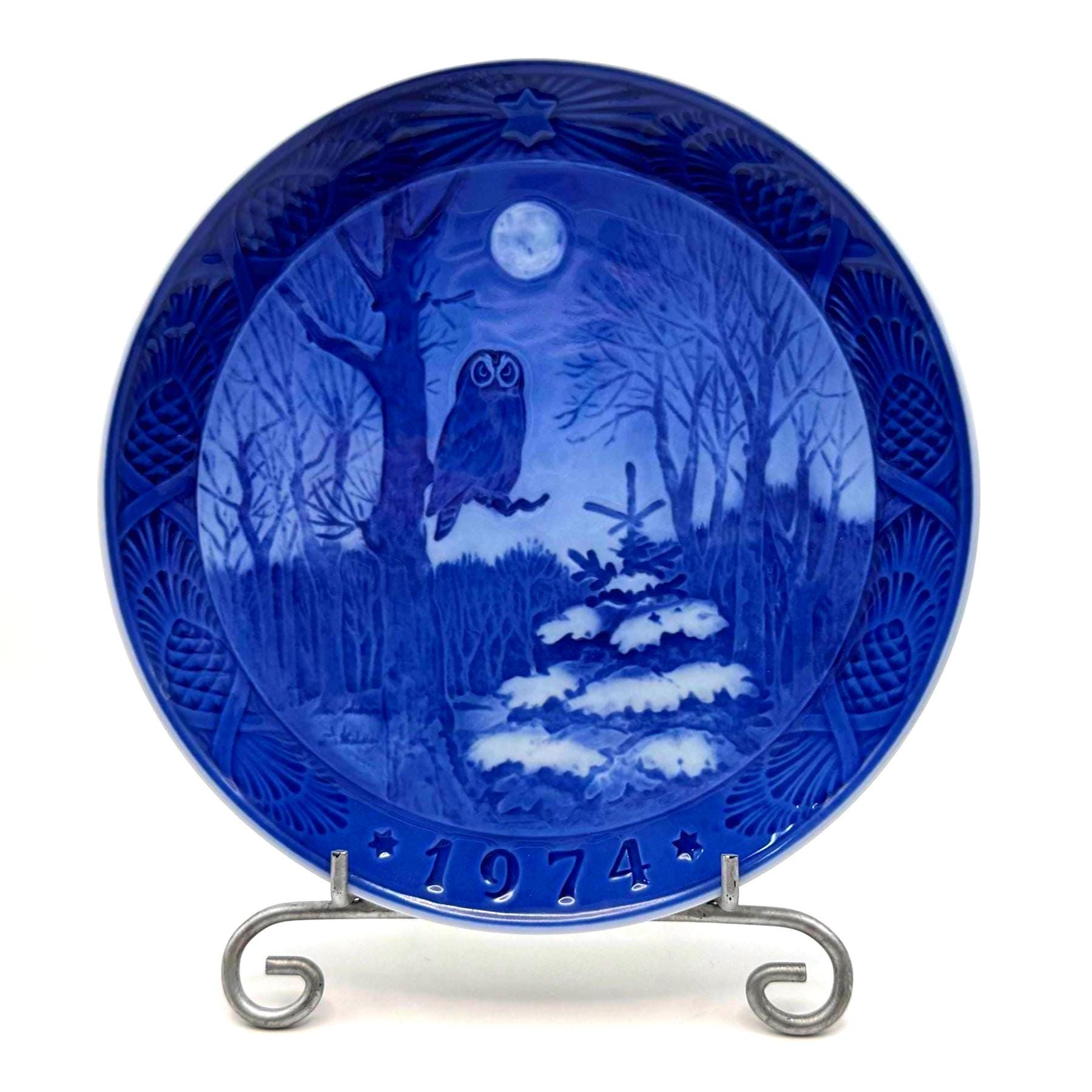 This 1974 Royal Copenhagen Christmas plate, “Vinterskumring” (Winter Twilight), features a beautifully detailed winter forest scene under a glowing full moon. An owl sits quietly on a snow-dusted tree, surrounded by serene woodland shadows — a classic example of Kaj Lange’s atmospheric blue-and-white storytelling.
