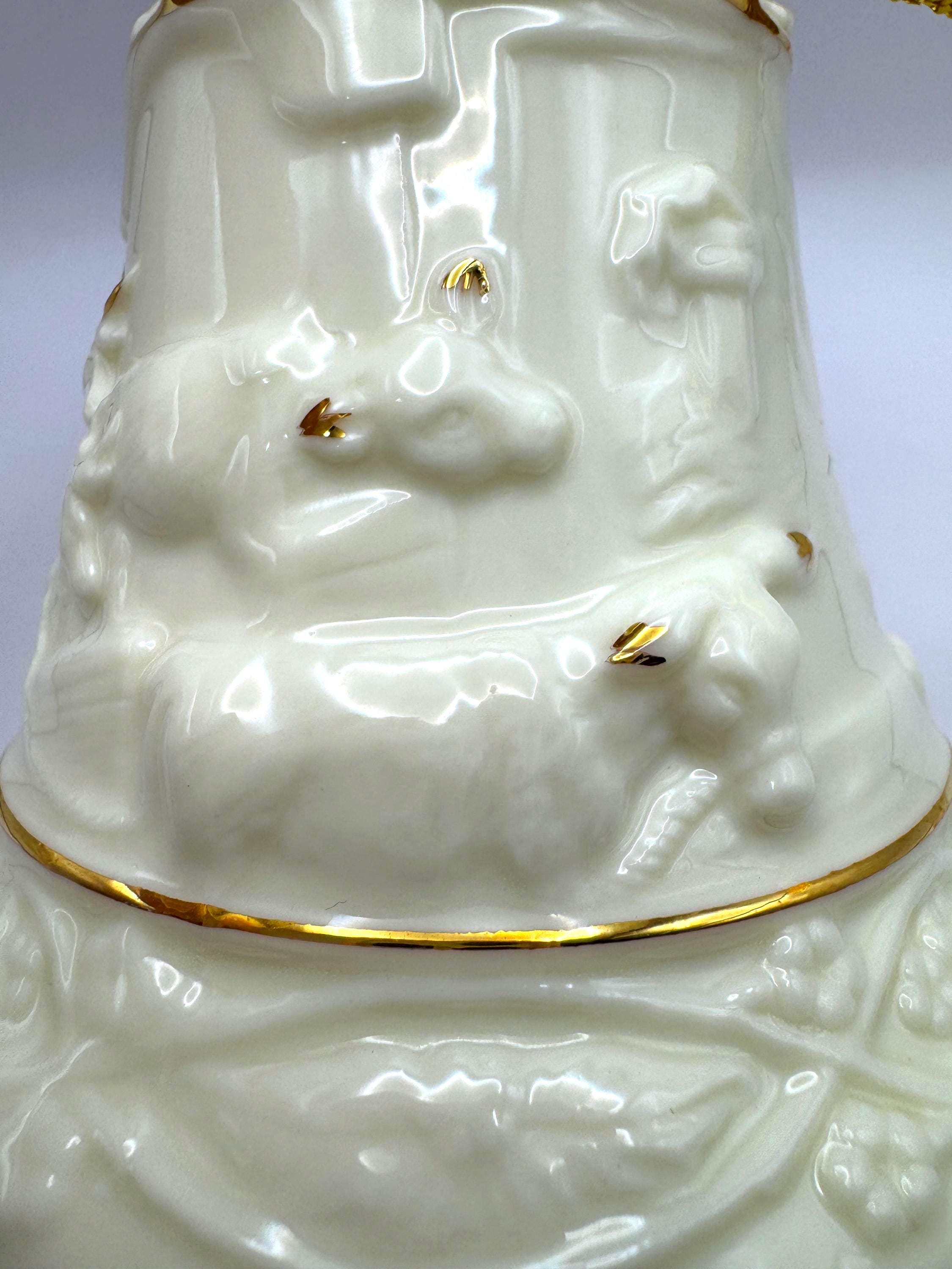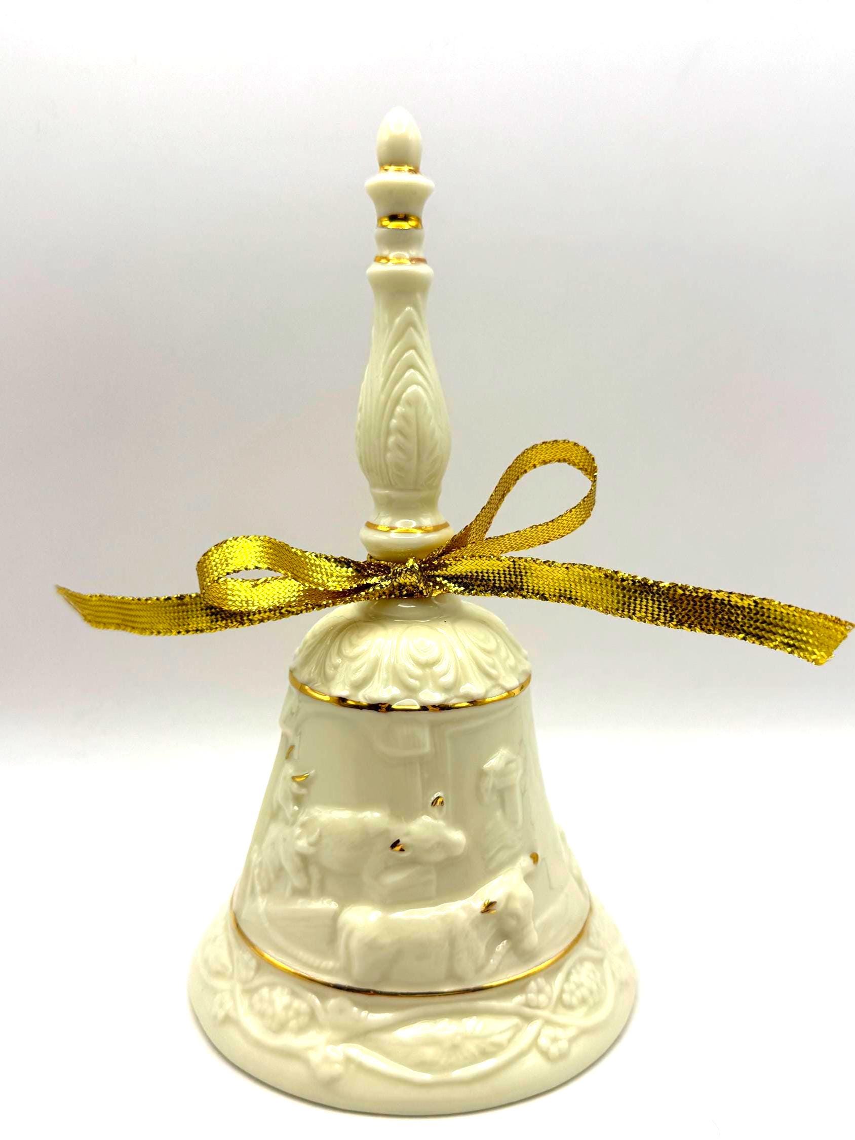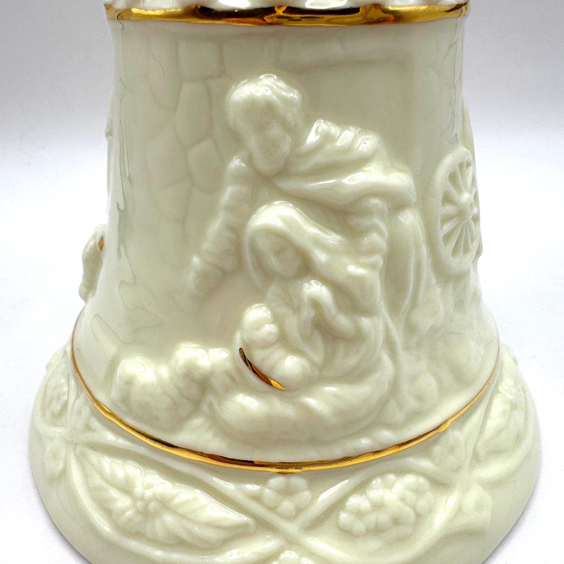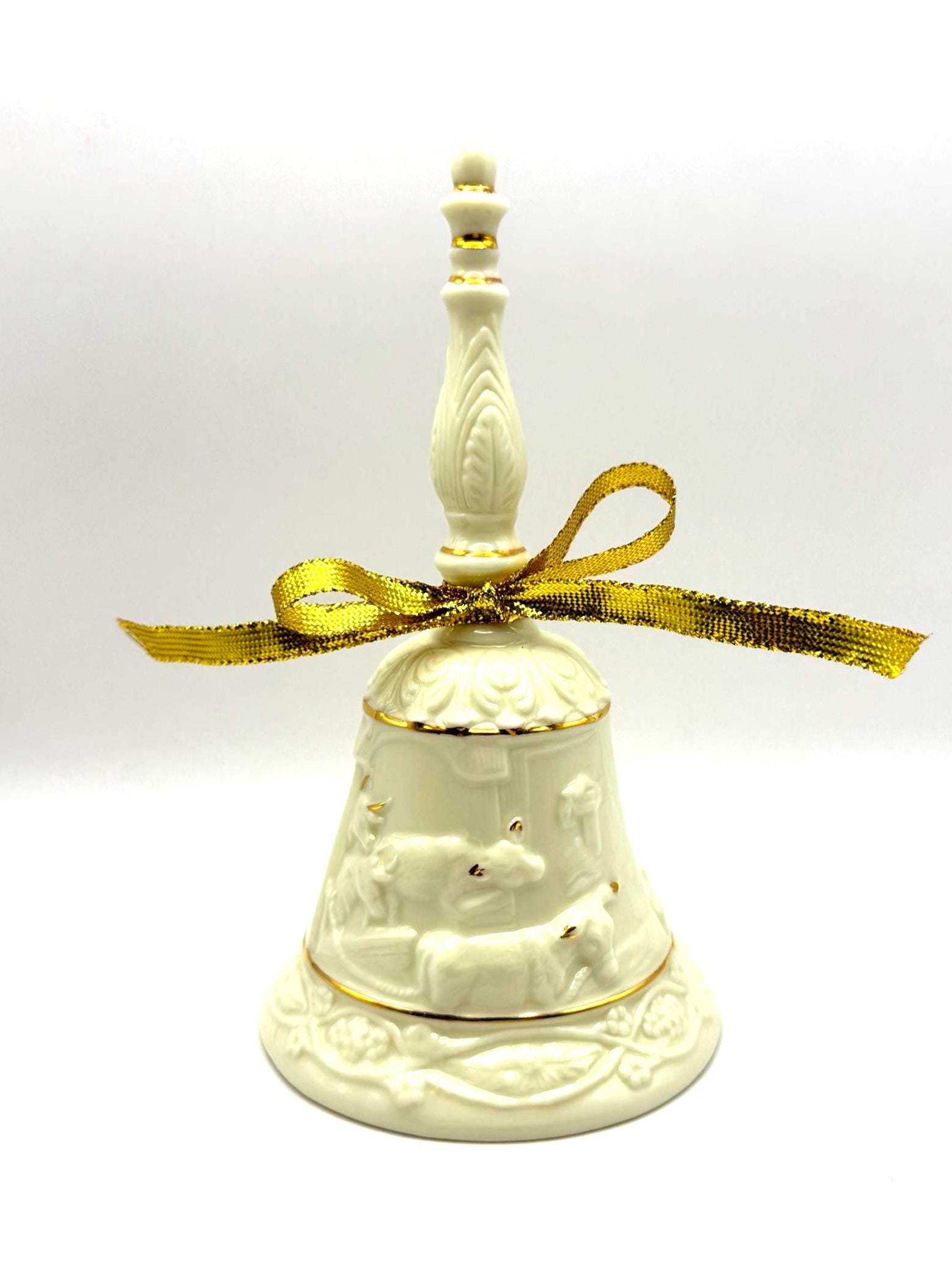 This beautiful vintage porcelain Christmas bell features a detailed raised Nativity scene with Mary, Joseph, Baby Jesus, and gentle animals surrounding the manger. The relief artwork wraps around the entire bell, highlighted with hand-painted gold accents and a glossy ivory finish. A gold ribbon is tied at the top for display, and the porcelain clapper is still intact.