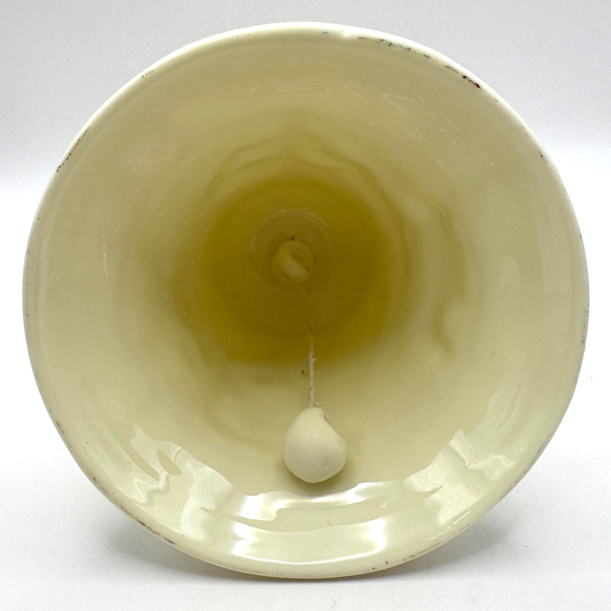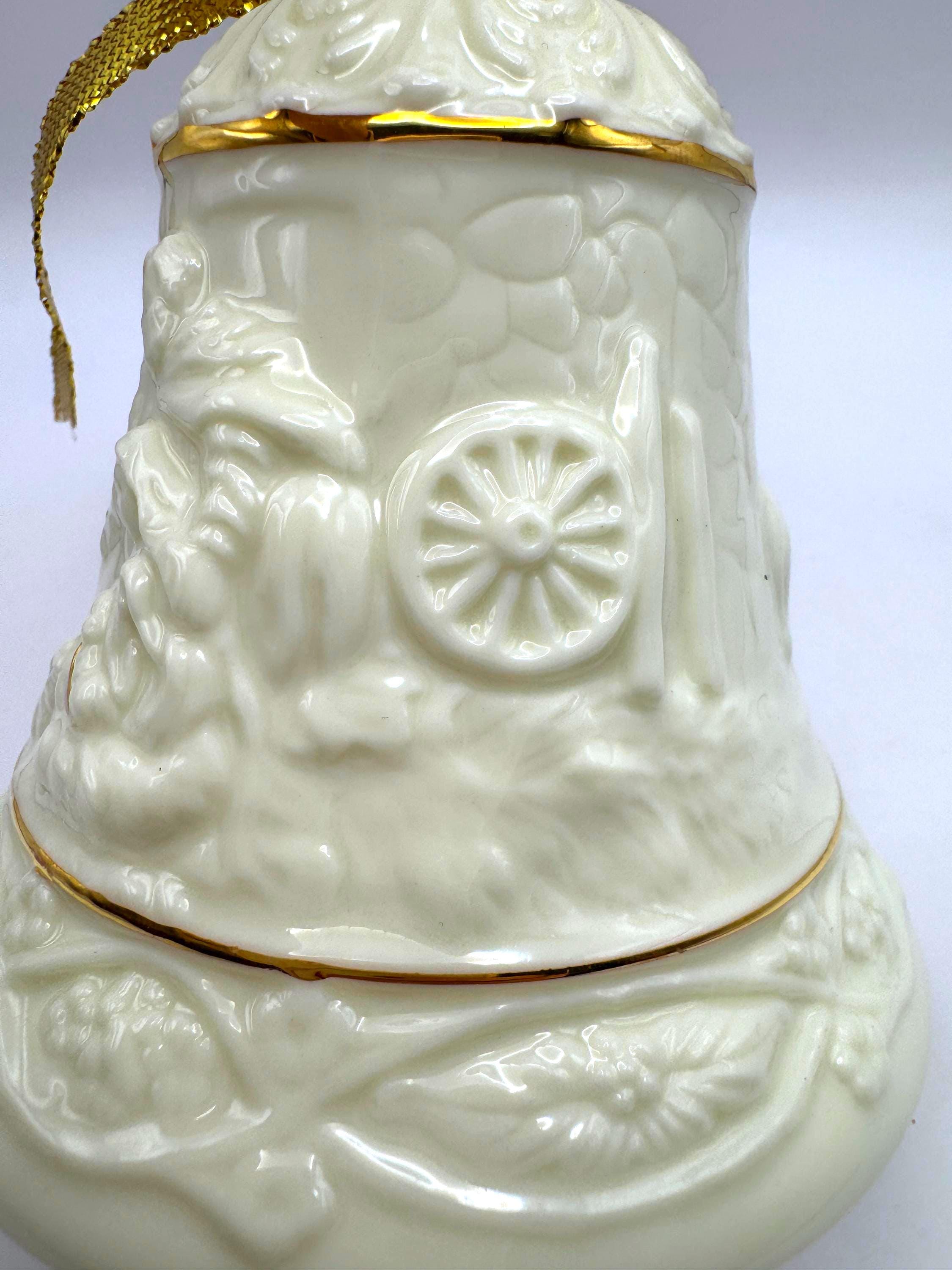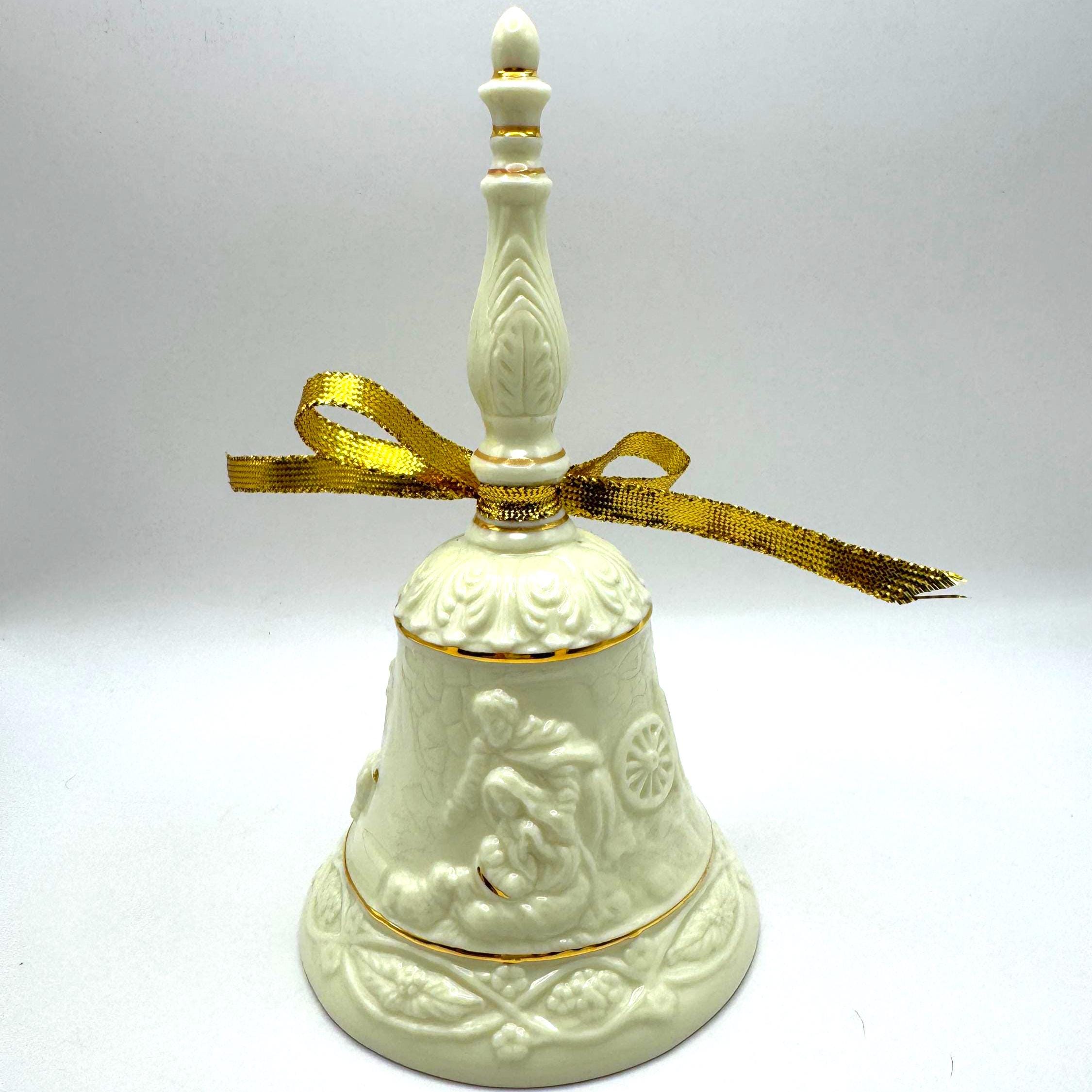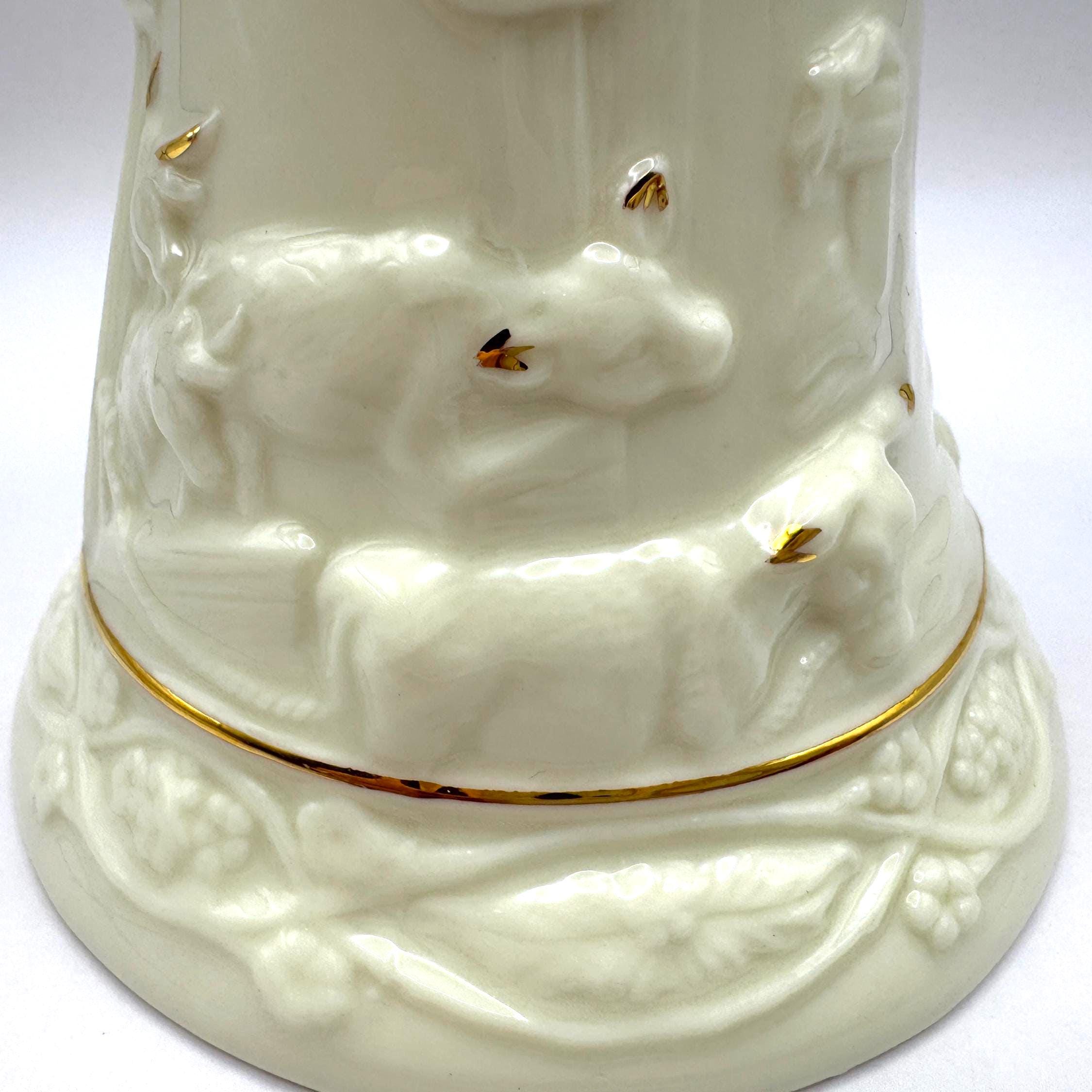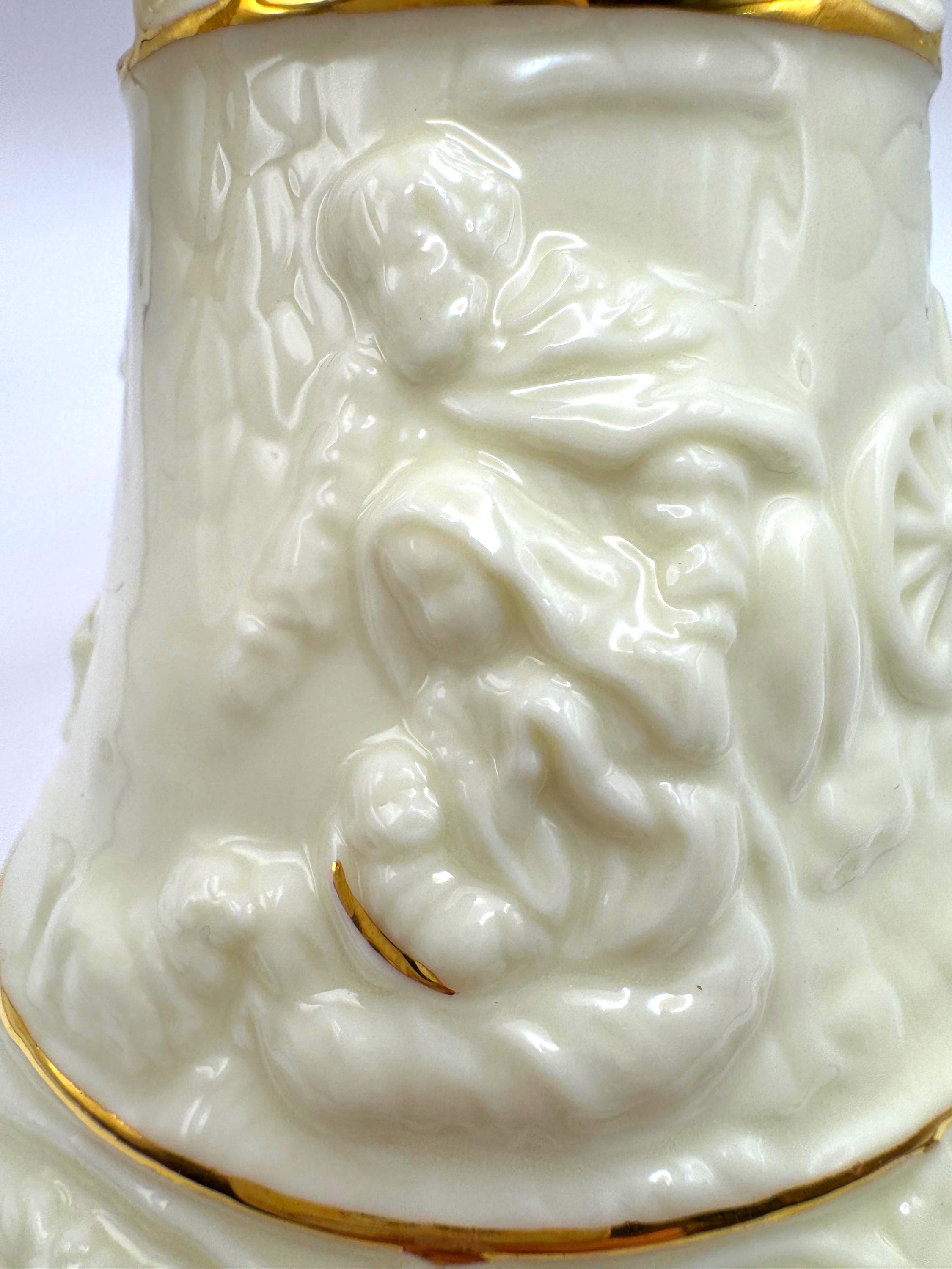 This beautiful vintage porcelain Christmas bell features a detailed raised Nativity scene with Mary, Joseph, Baby Jesus, and gentle animals surrounding the manger. The relief artwork wraps around the entire bell, highlighted with hand-painted gold accents and a glossy ivory finish. A gold ribbon is tied at the top for display, and the porcelain clapper is still intact.