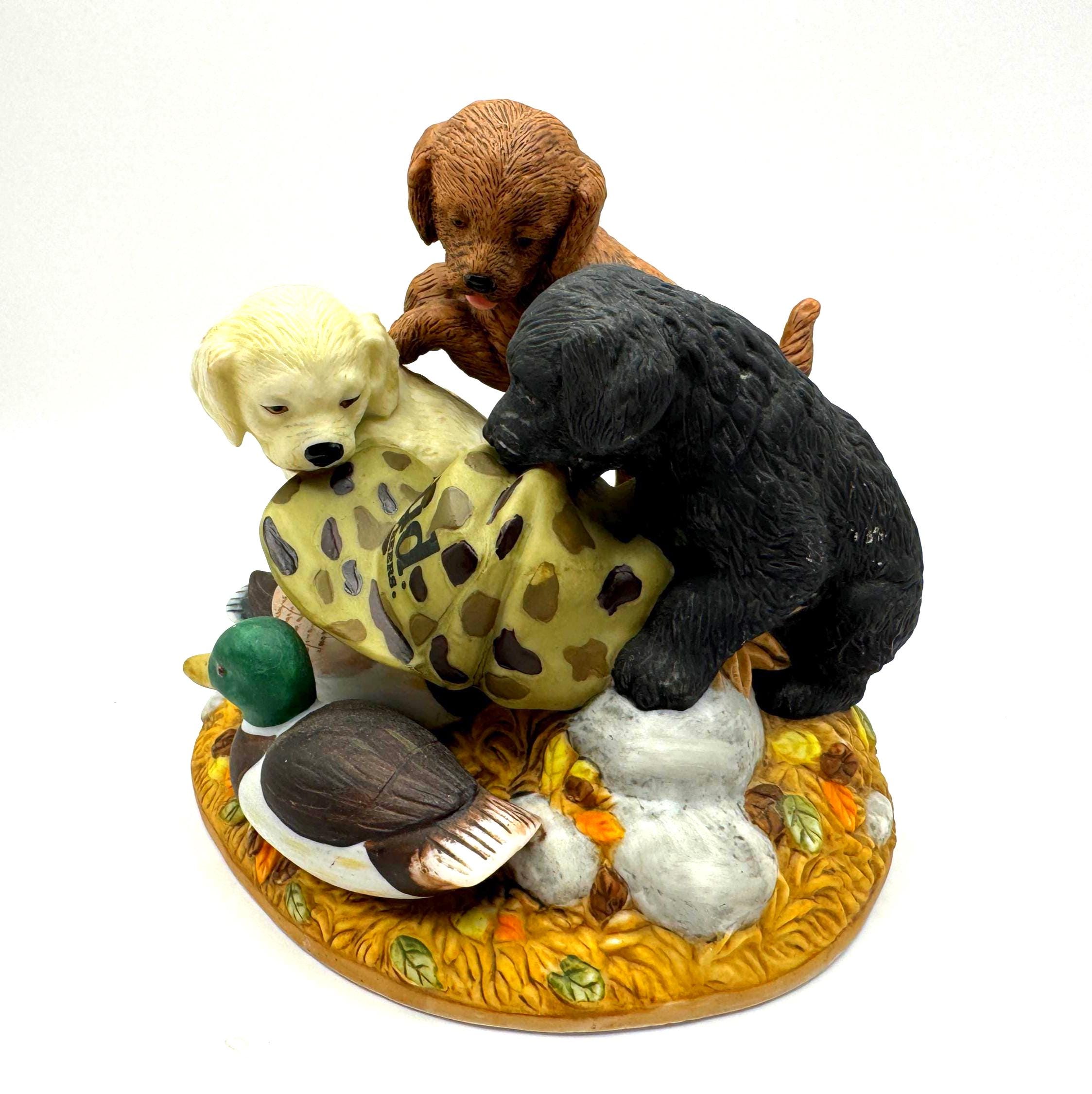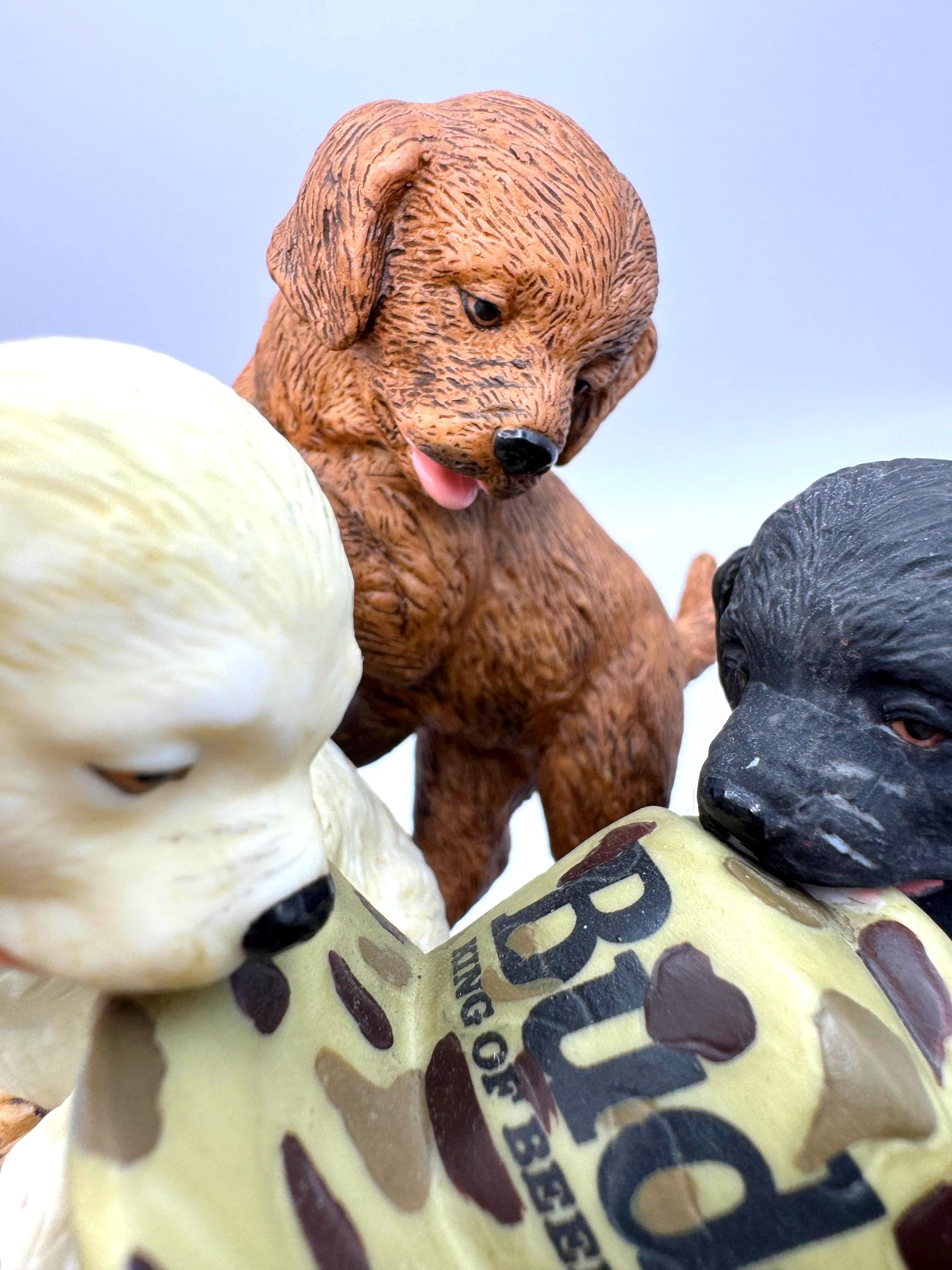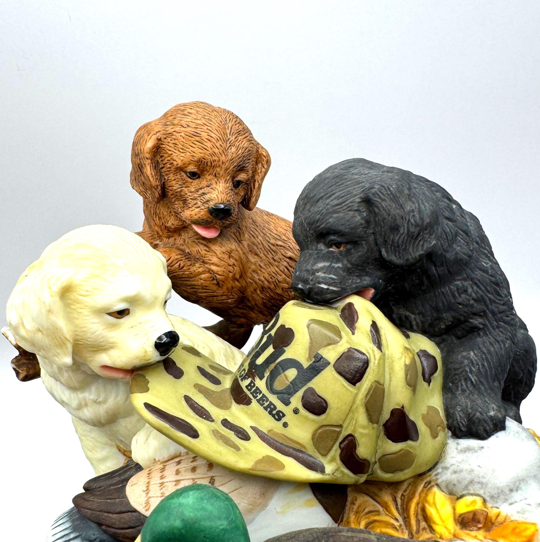 Bring a little mischief and charm into your home with this 1994 Anheuser-Busch “Something’s Brewing” figurine featuring three playful Labrador puppies investigating a camo Budweiser hat and a duck decoy. It’s humorous, nostalgic, and perfect for collectors of breweriana, dog figurines, and Bud memorabilia.