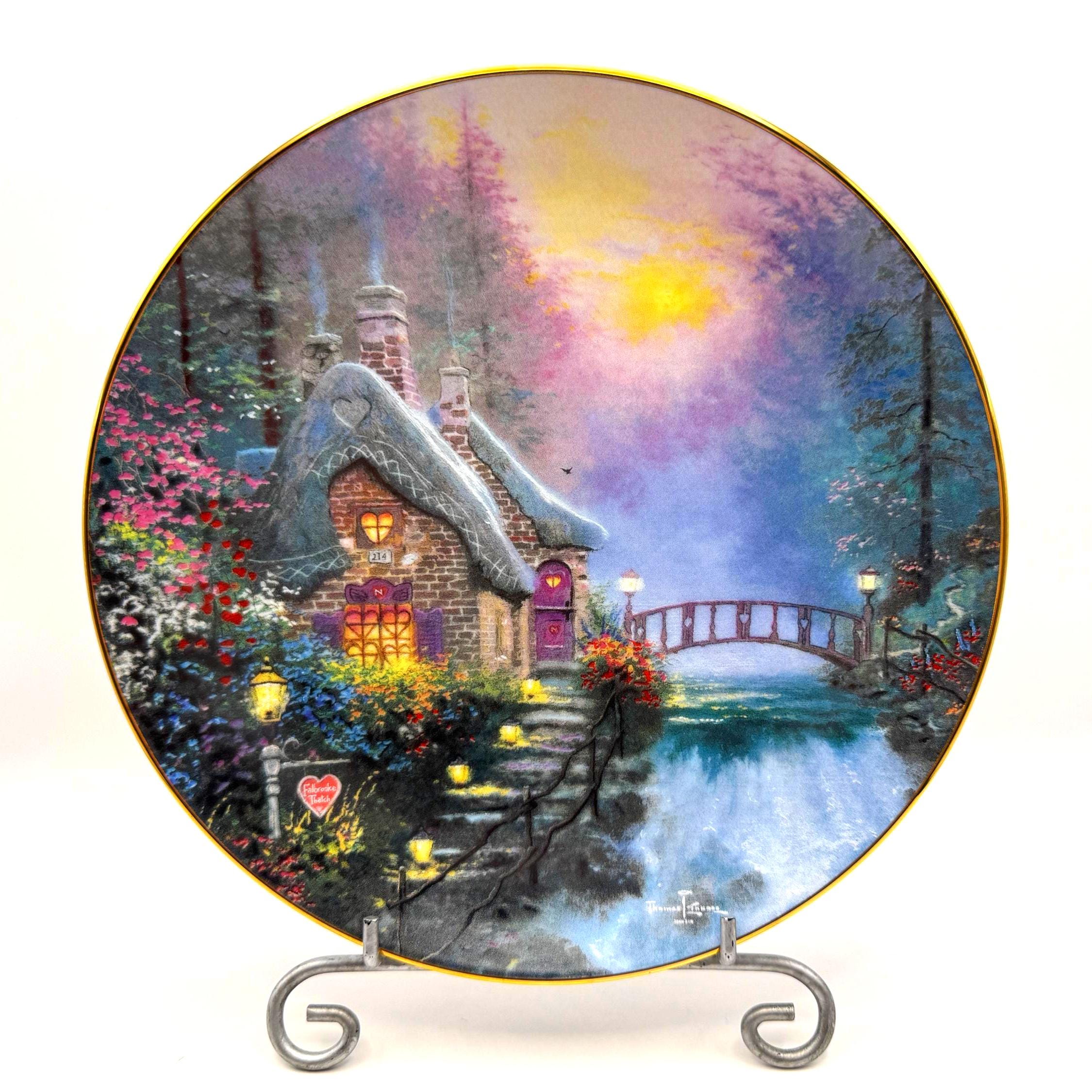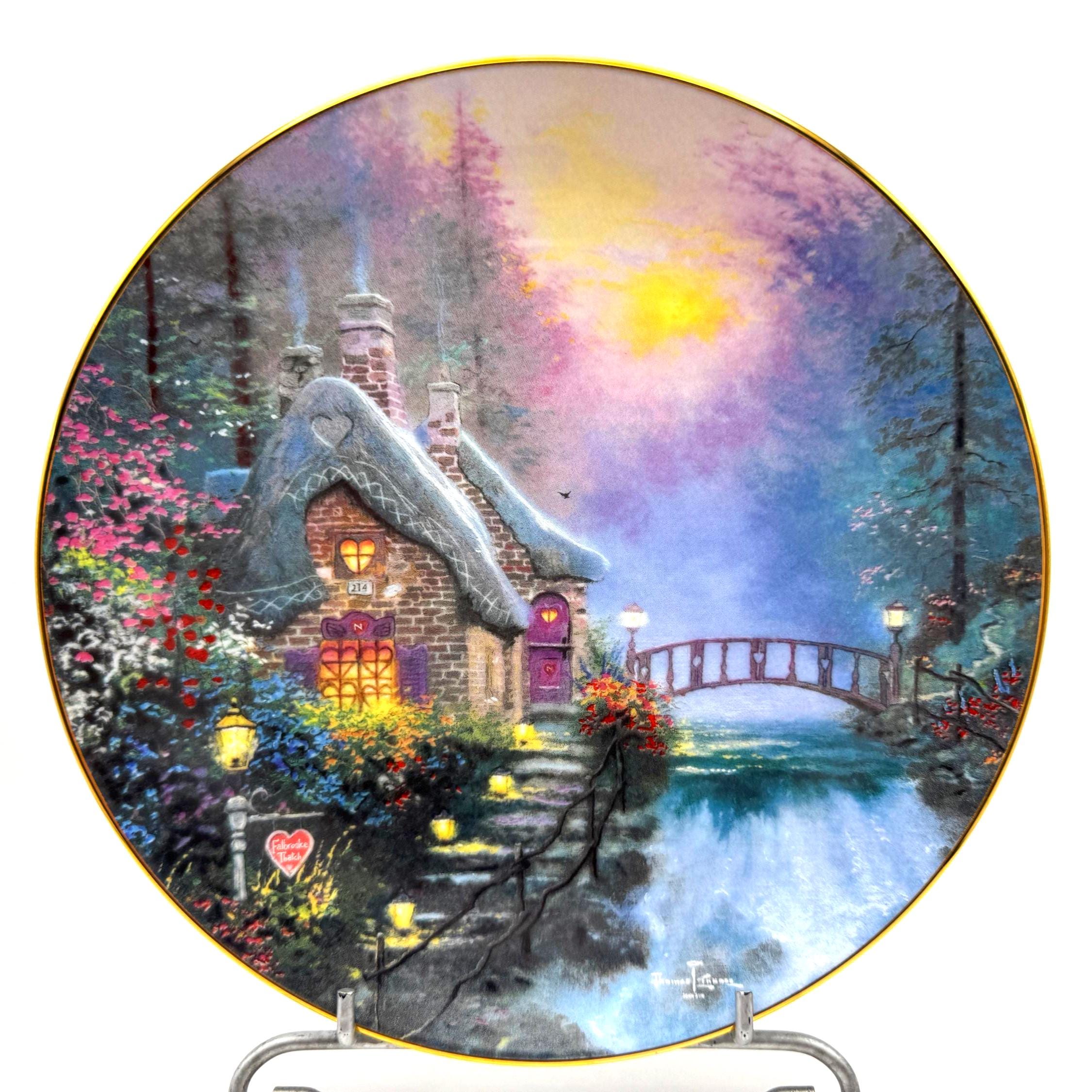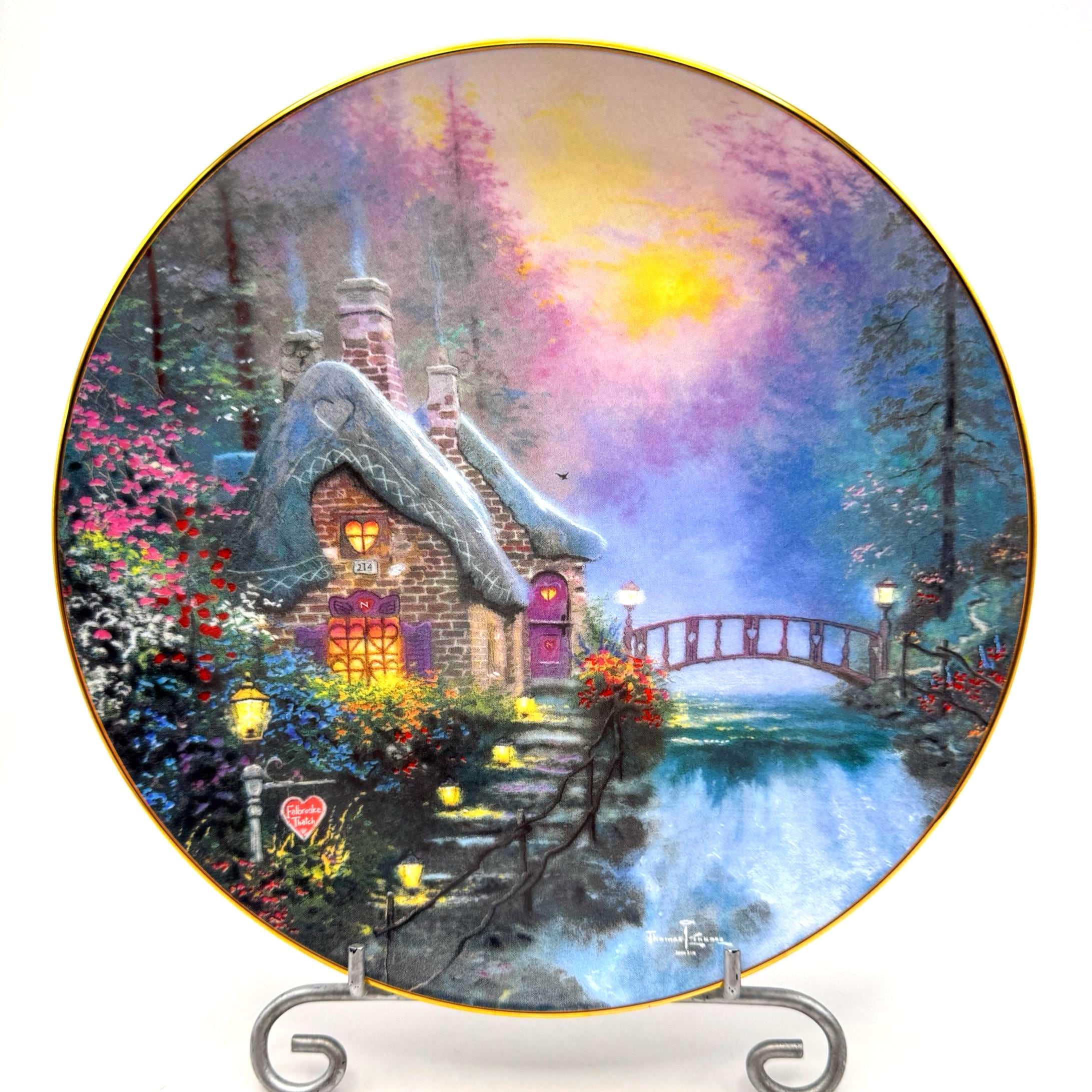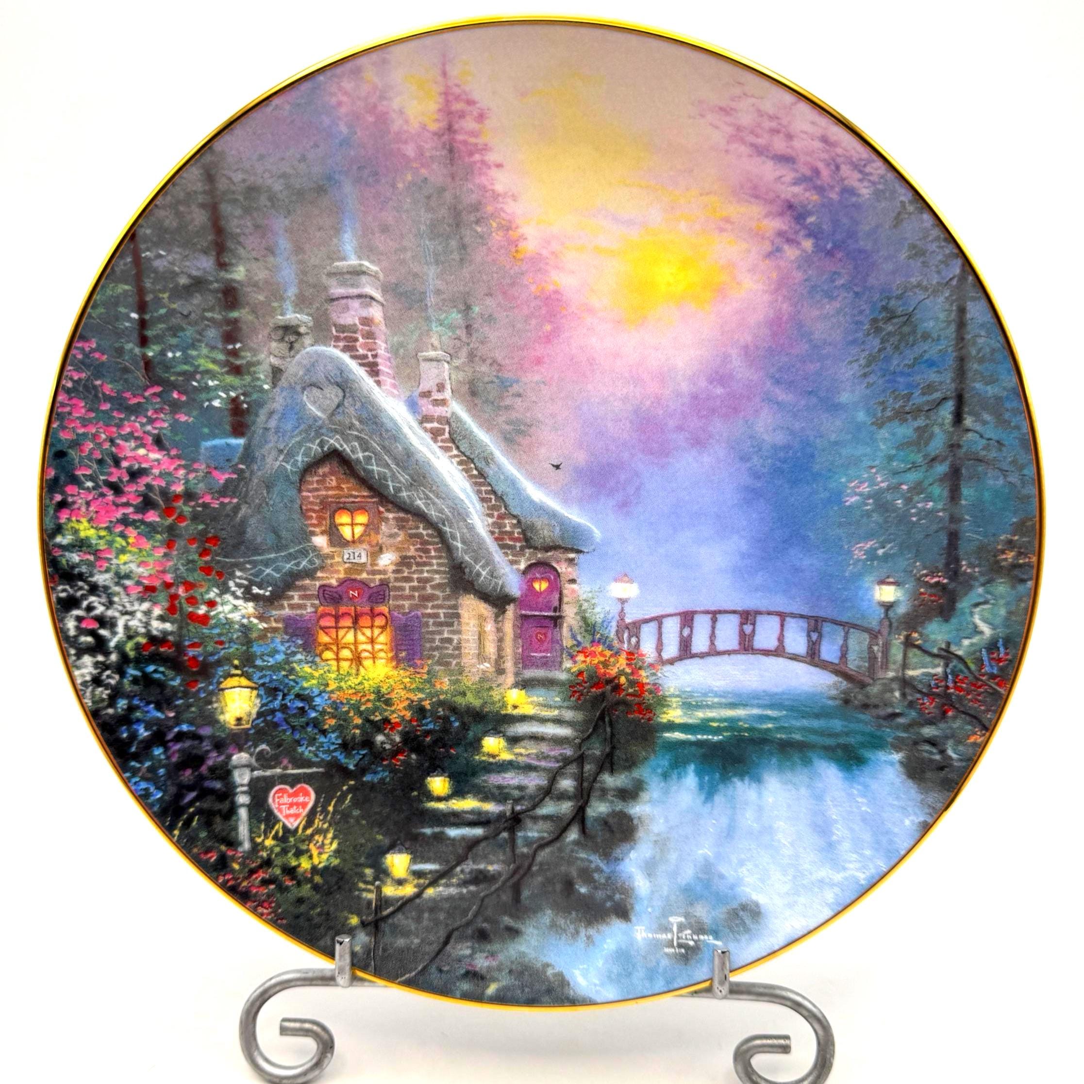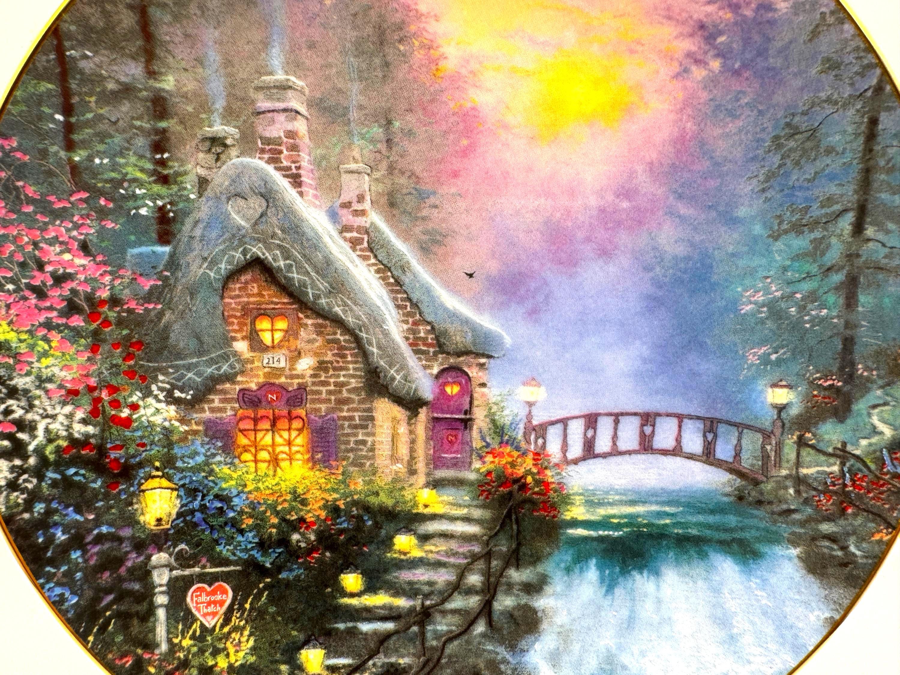Bring a touch of classic Kinkade charm to your home with this Thomas Kinkade “Falbrooke Cottage” collector plate, issued by Edwin M. Knowles. This is the first plate in the Enchanted Cottages series and features Kinkade’s dreamy cottage scene, complete with warm glowing windows, lush gardens, a stone bridge, and that signature golden light.