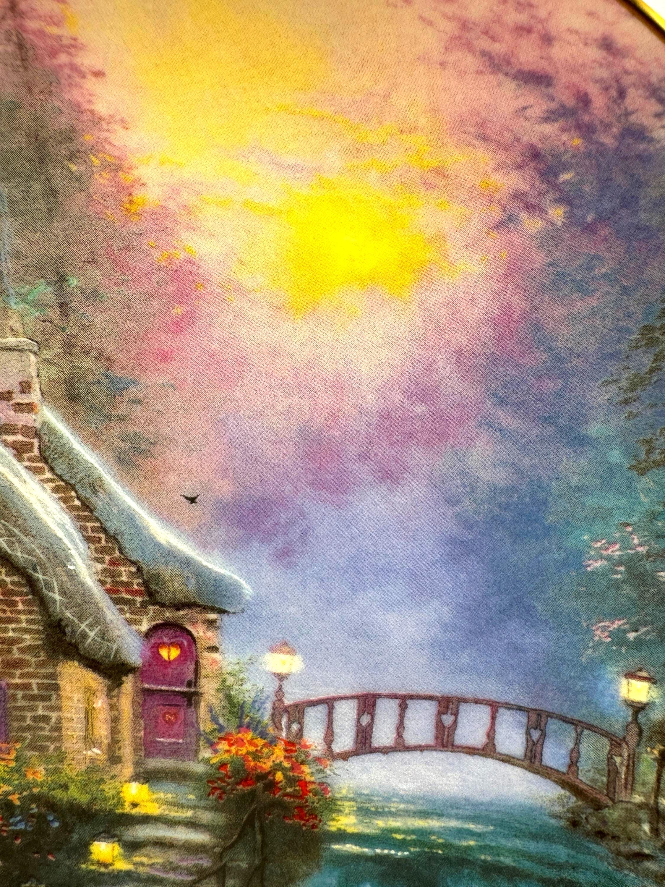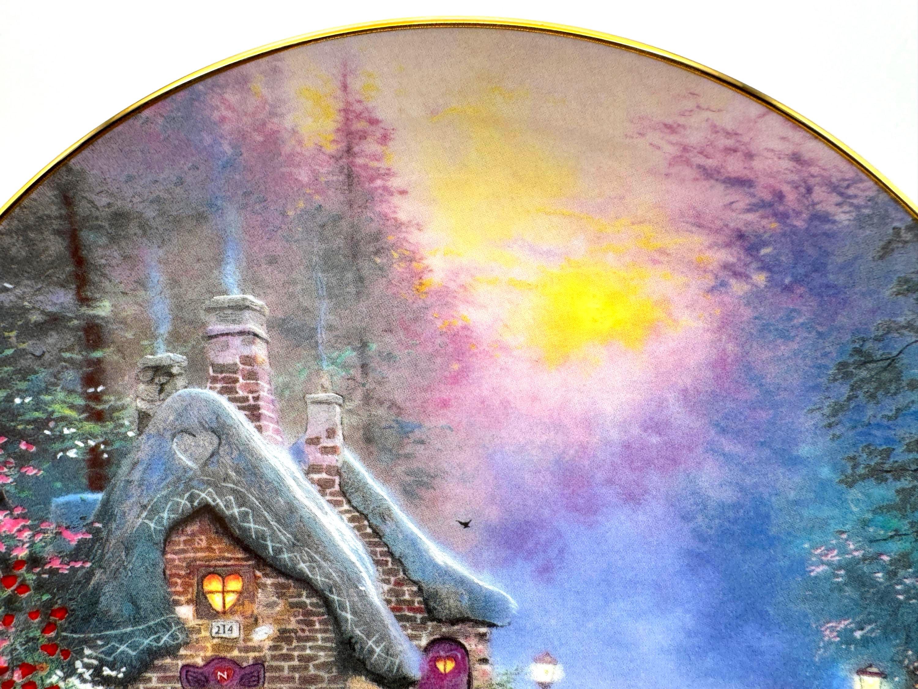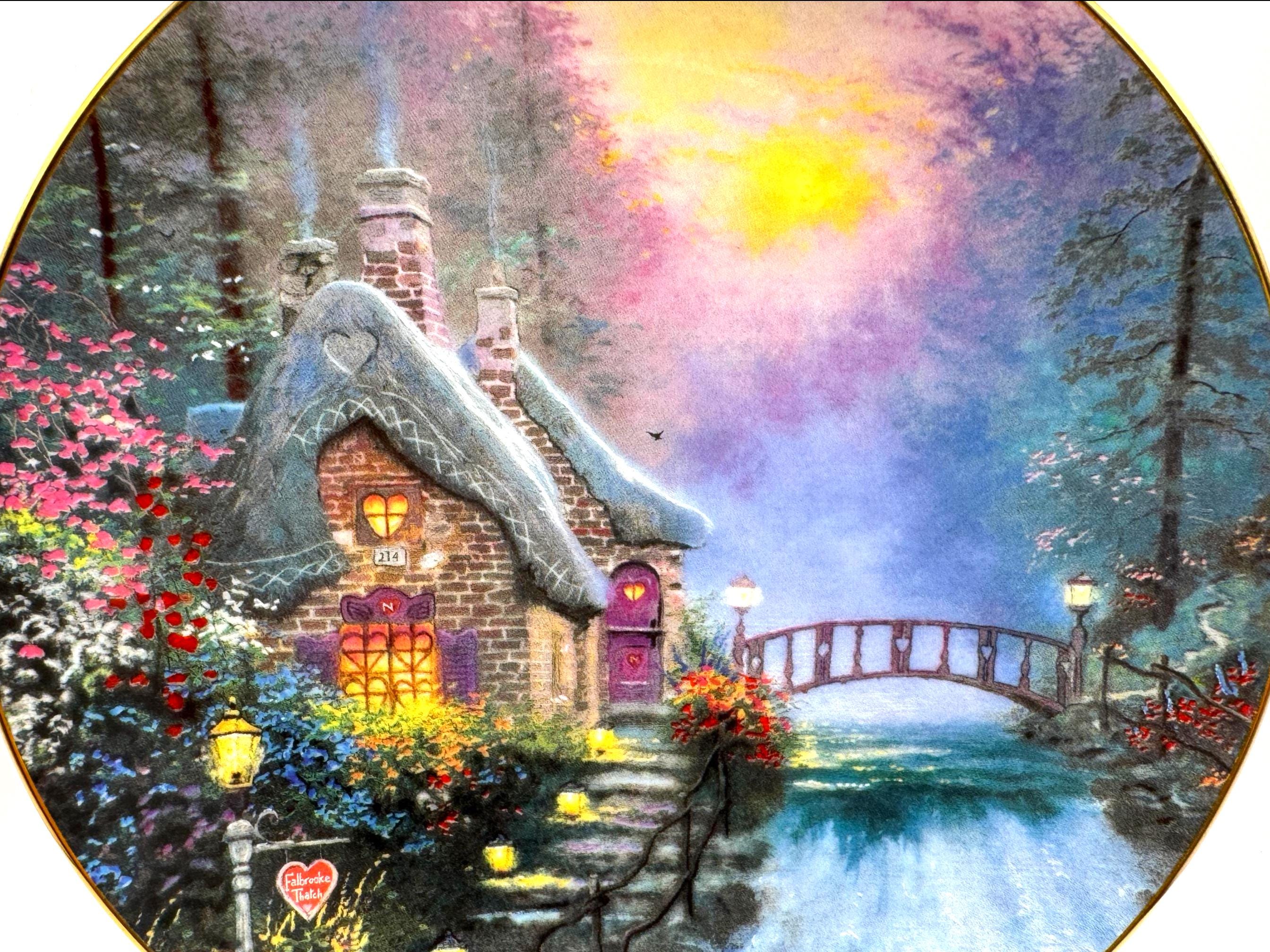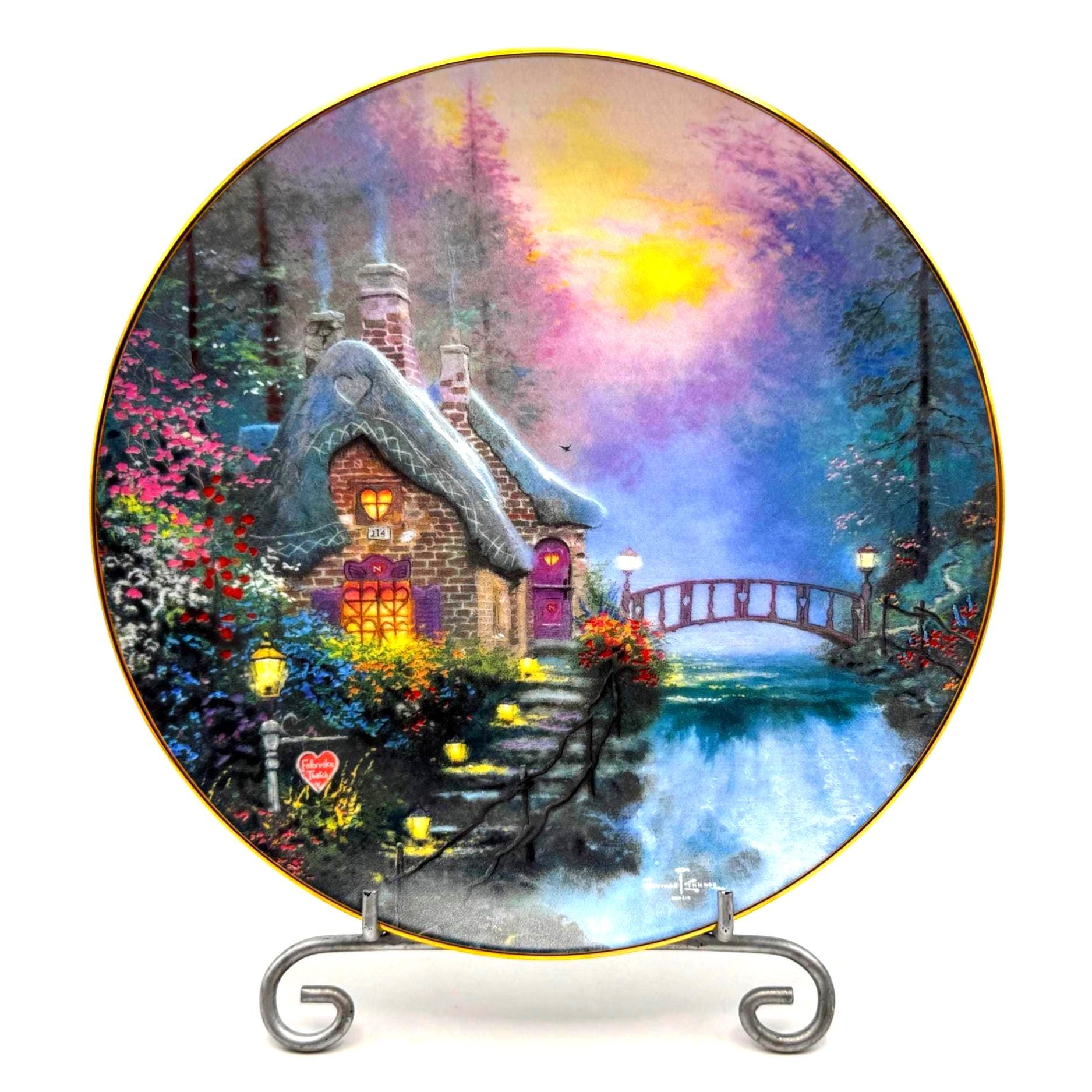Bring a touch of classic Kinkade charm to your home with this Thomas Kinkade “Falbrooke Cottage” collector plate, issued by Edwin M. Knowles. This is the first plate in the Enchanted Cottages series and features Kinkade’s dreamy cottage scene, complete with warm glowing windows, lush gardens, a stone bridge, and that signature golden light.