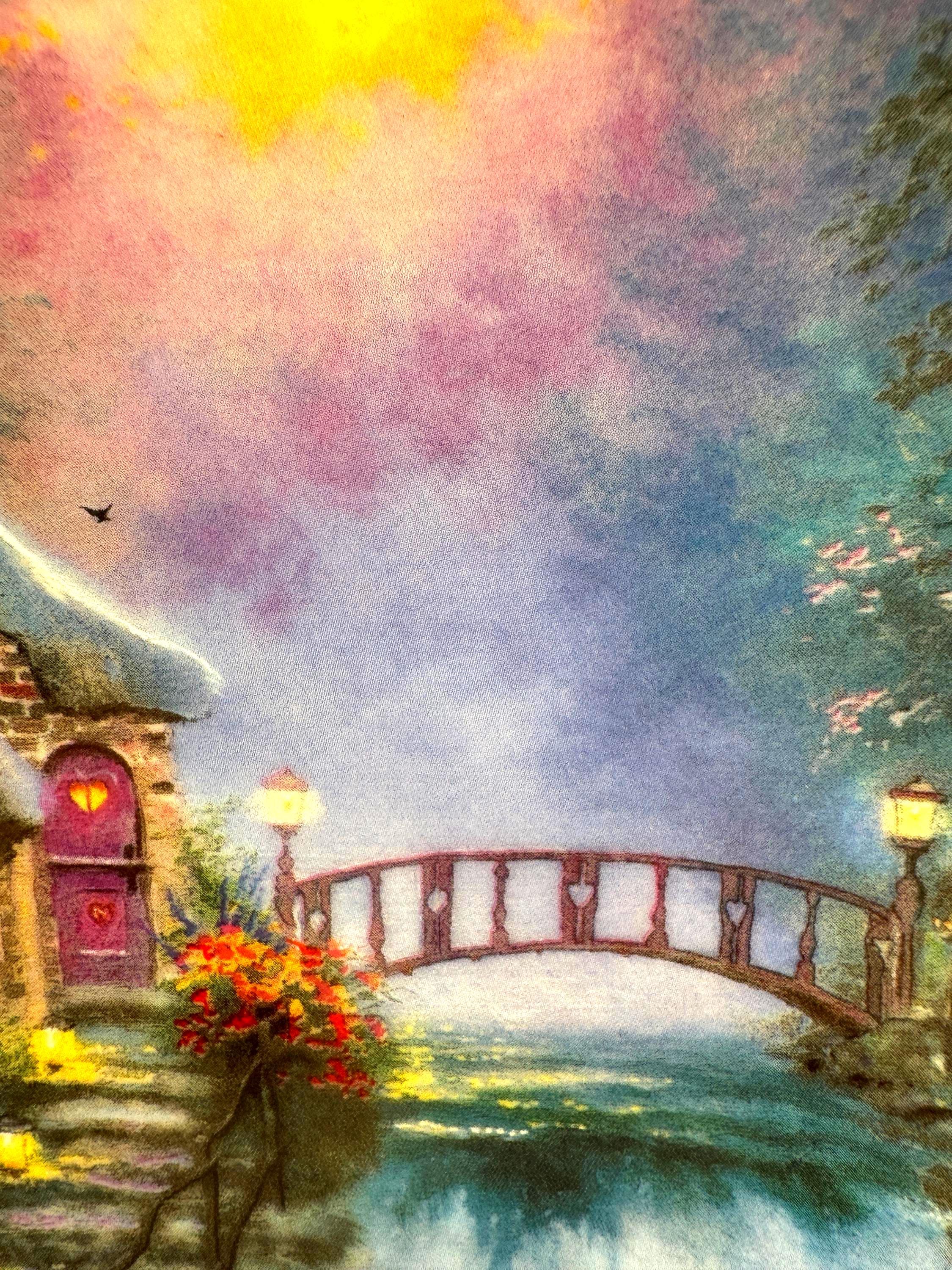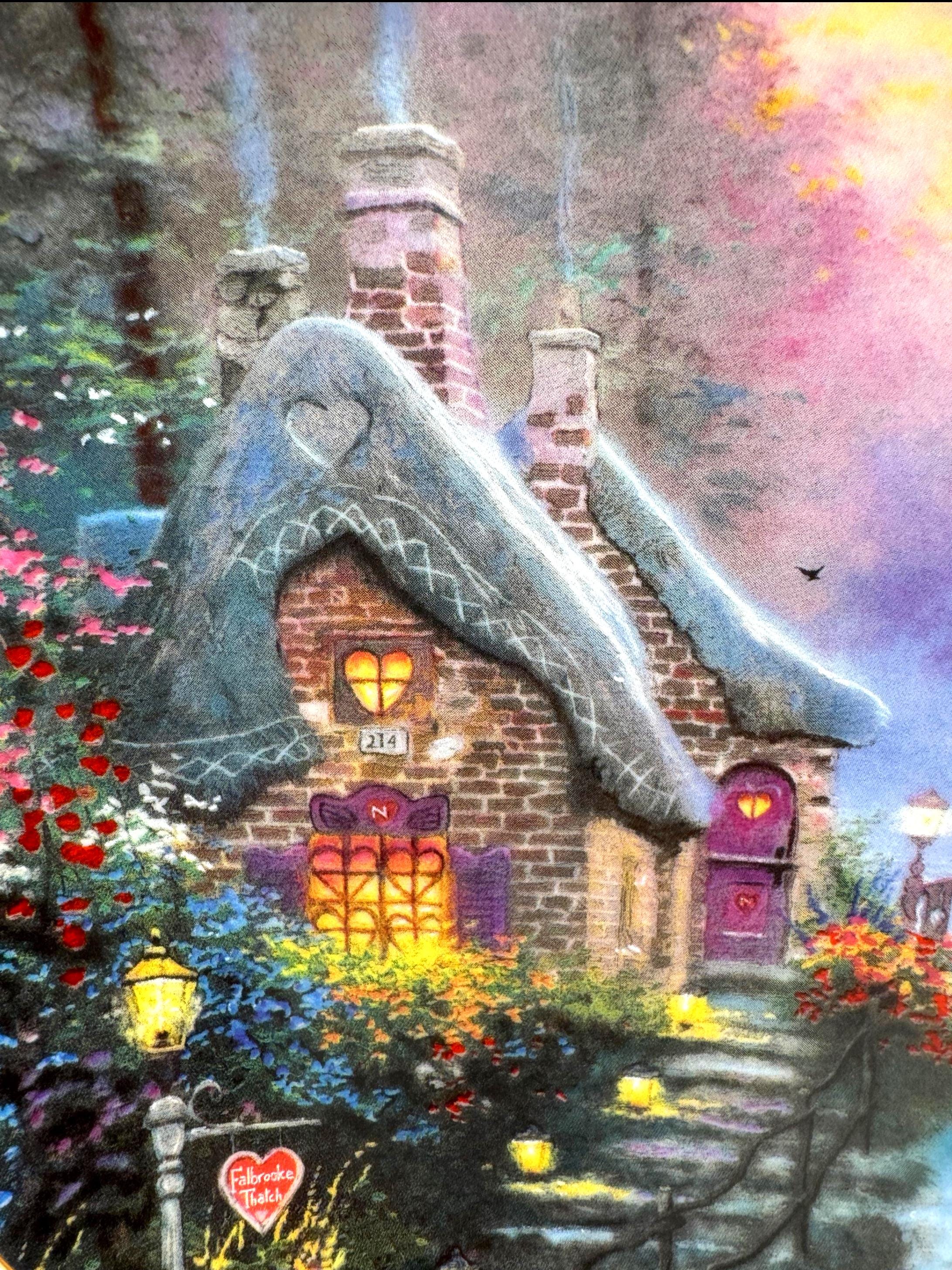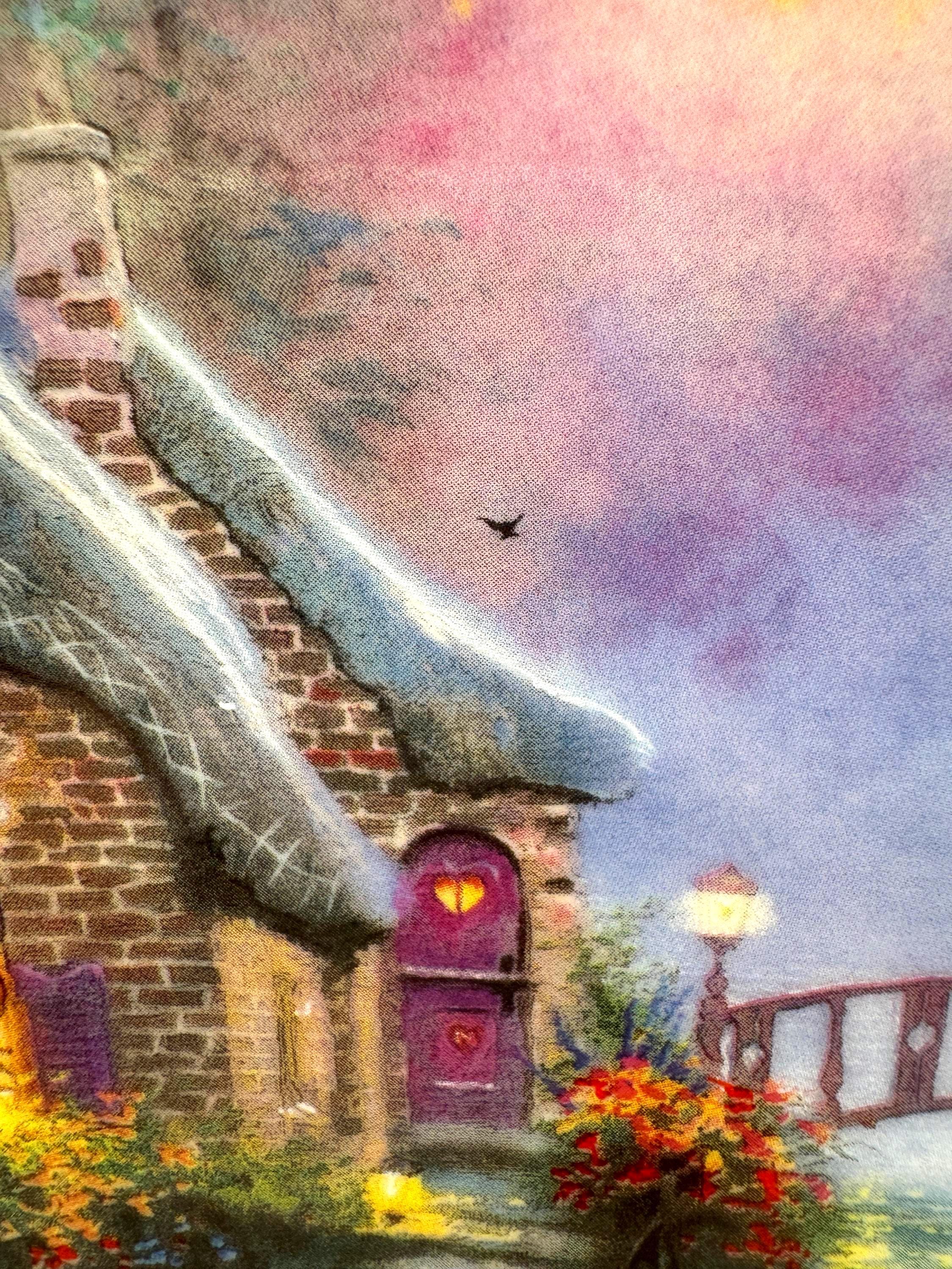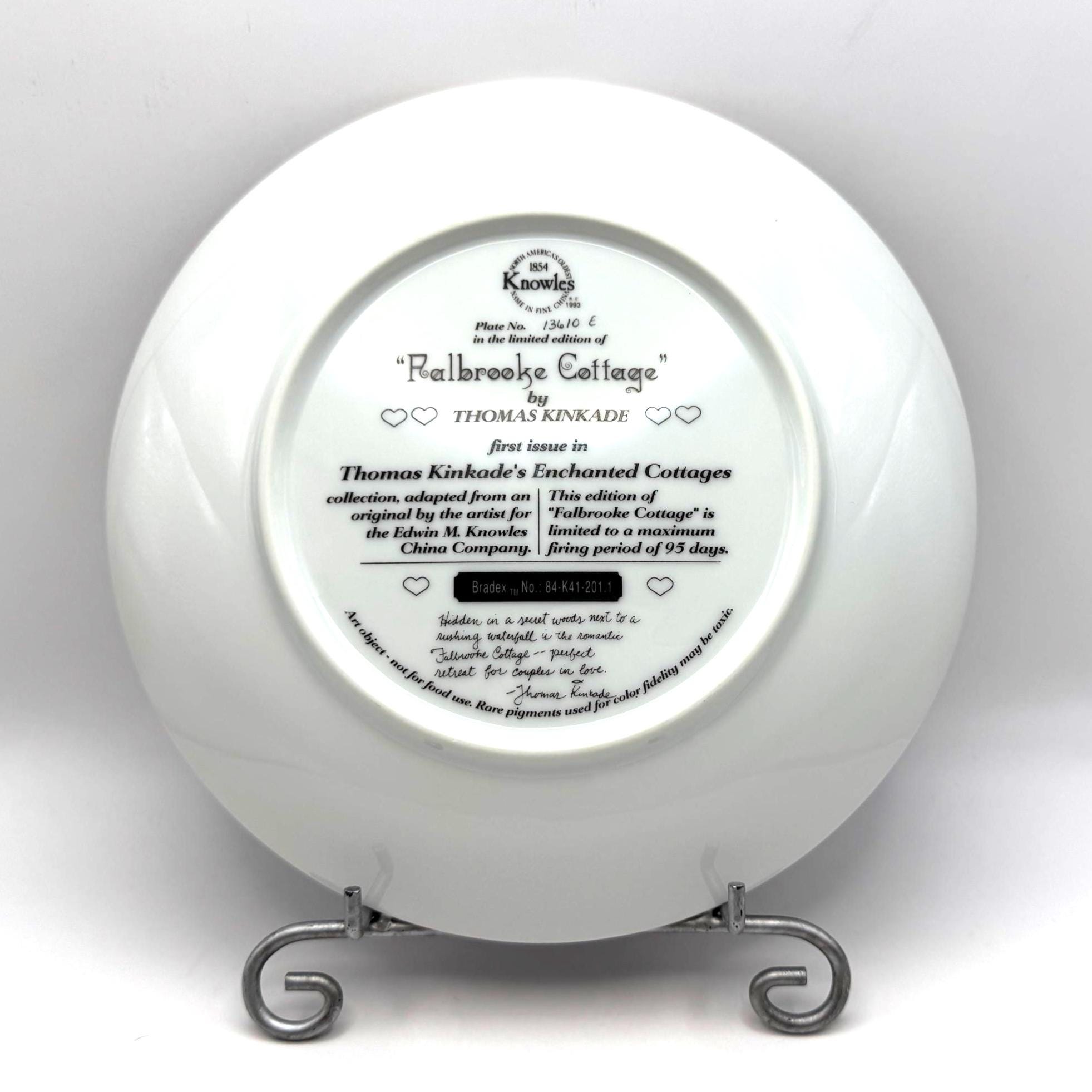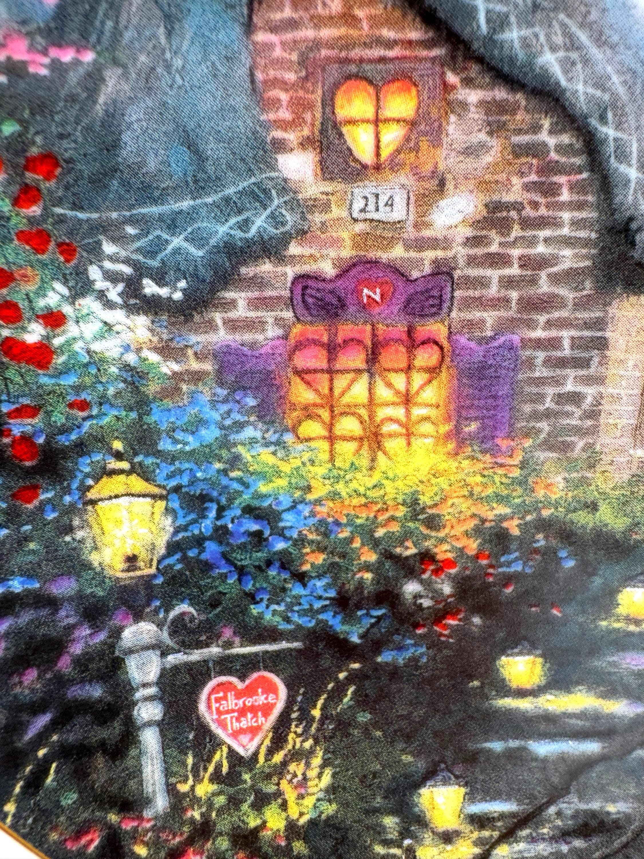 Bring a touch of classic Kinkade charm to your home with this Thomas Kinkade “Falbrooke Cottage” collector plate, issued by Edwin M. Knowles. This is the first plate in the Enchanted Cottages series and features Kinkade’s dreamy cottage scene, complete with warm glowing windows, lush gardens, a stone bridge, and that signature golden light.