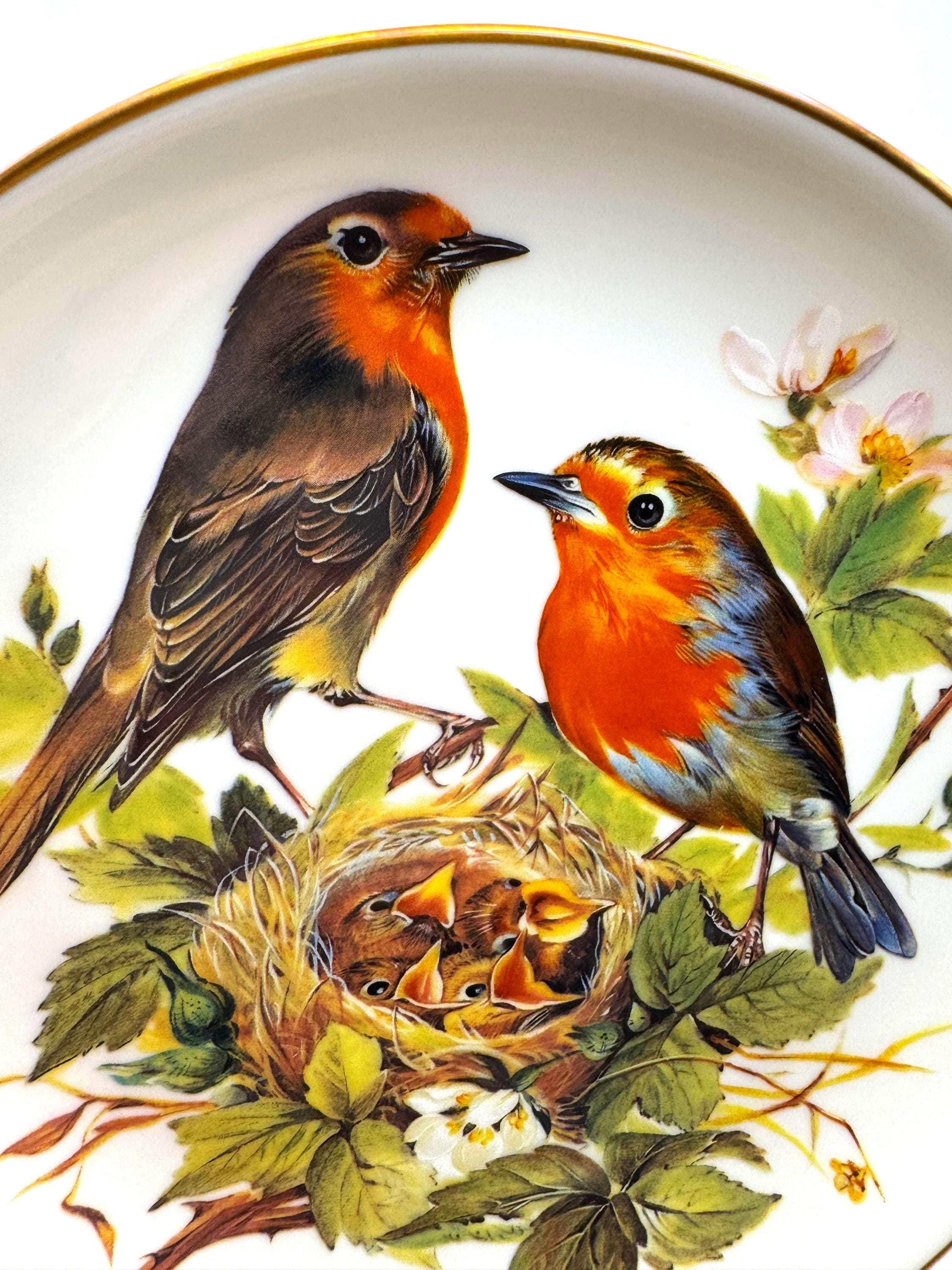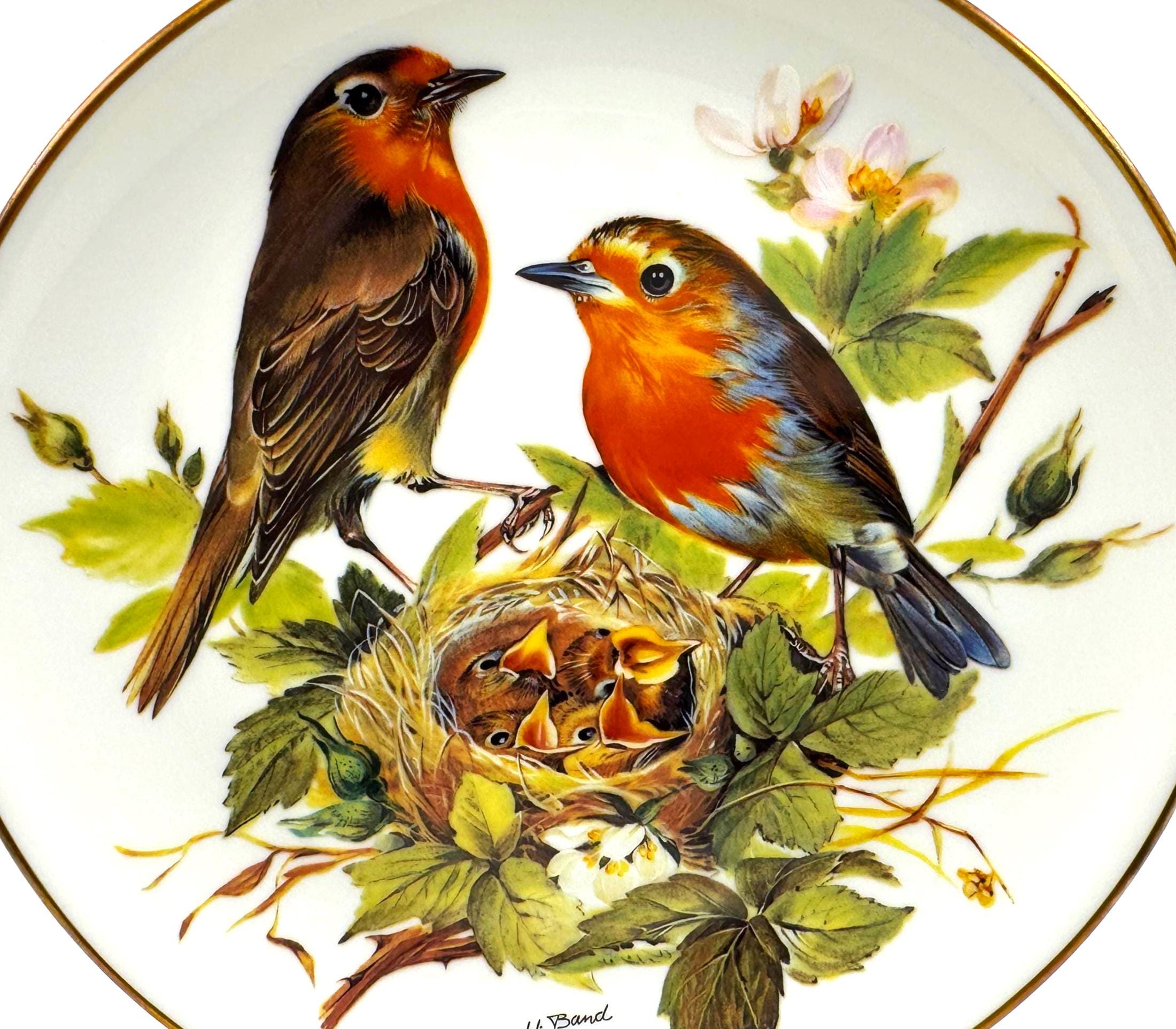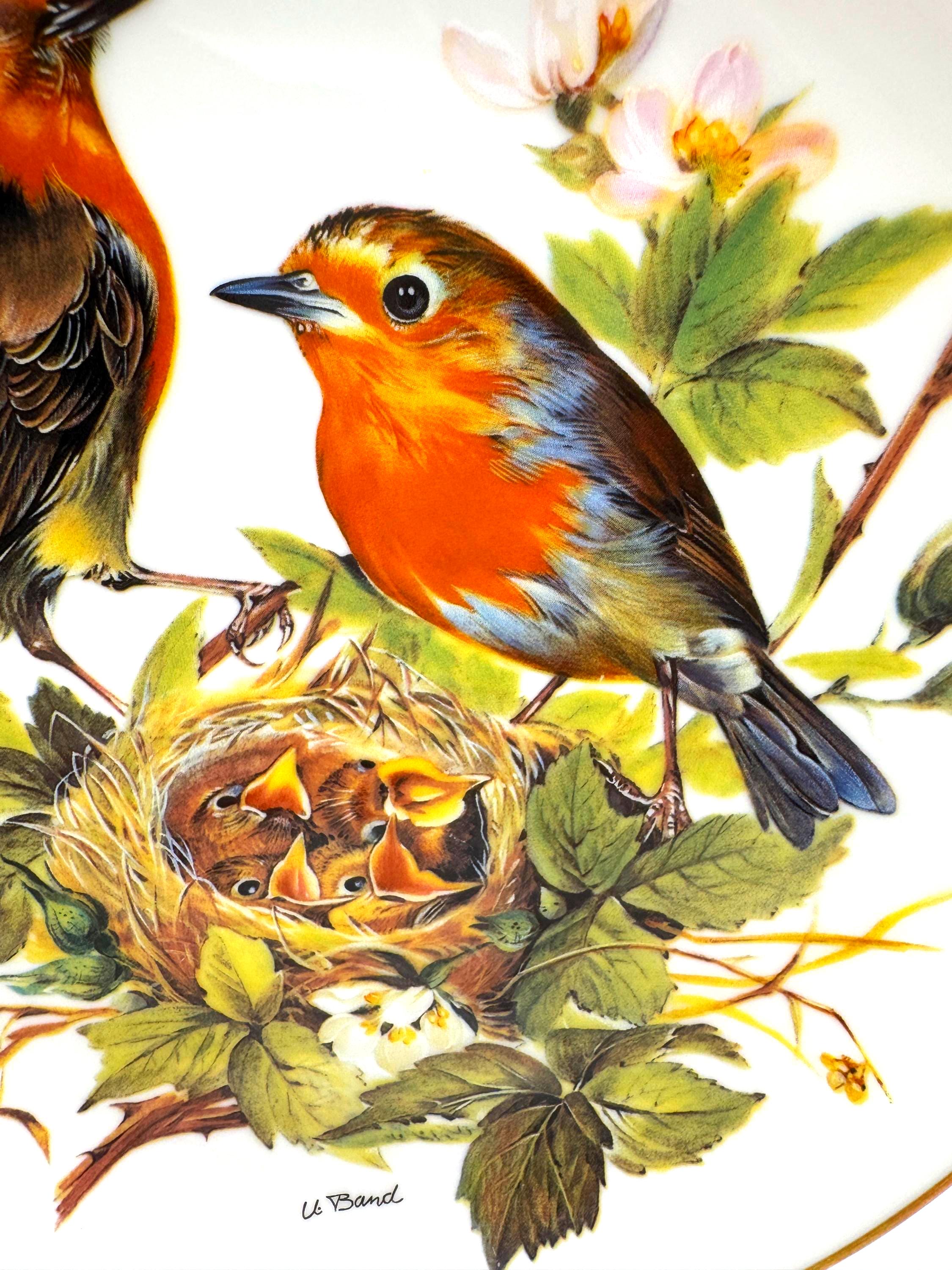 Beautifully illustrated by wildlife artist Ursula Band, this piece features two European Redbreasts tending their nest, portrayed with rich color, fine detail, and a hand-finished gold rim. A perfect display plate for bird lovers, vintage collectors, or anyone who enjoys nature-themed art.