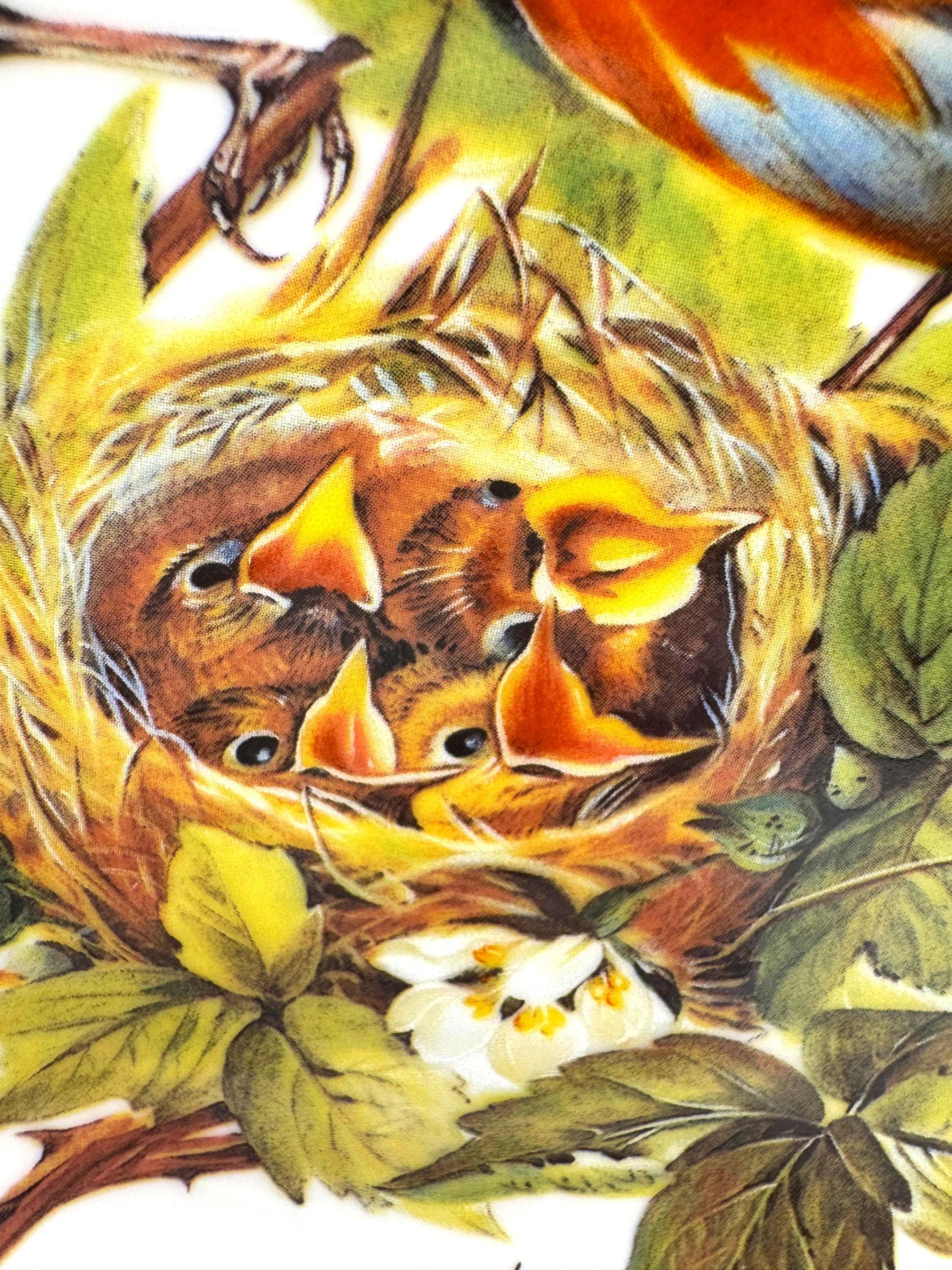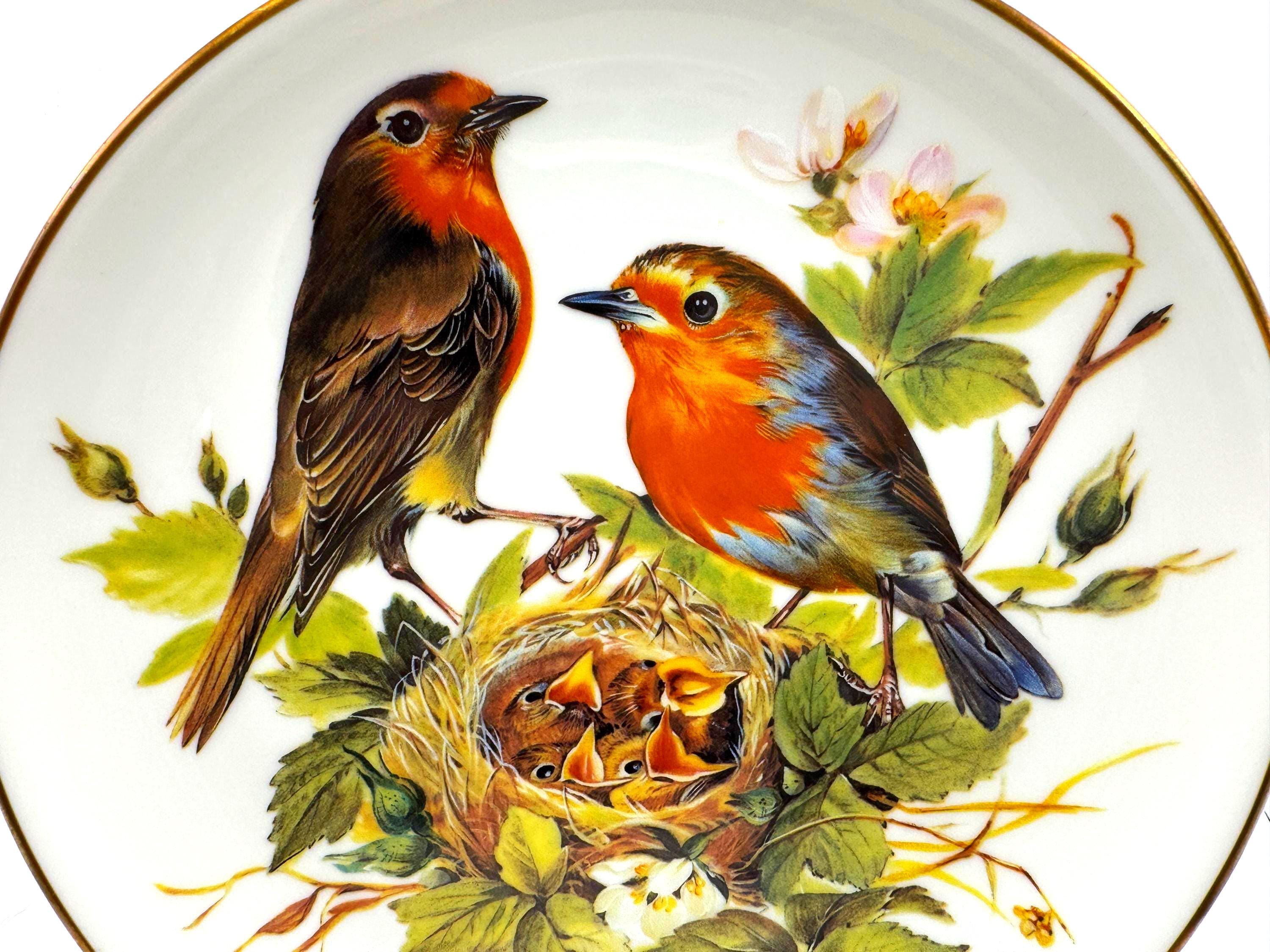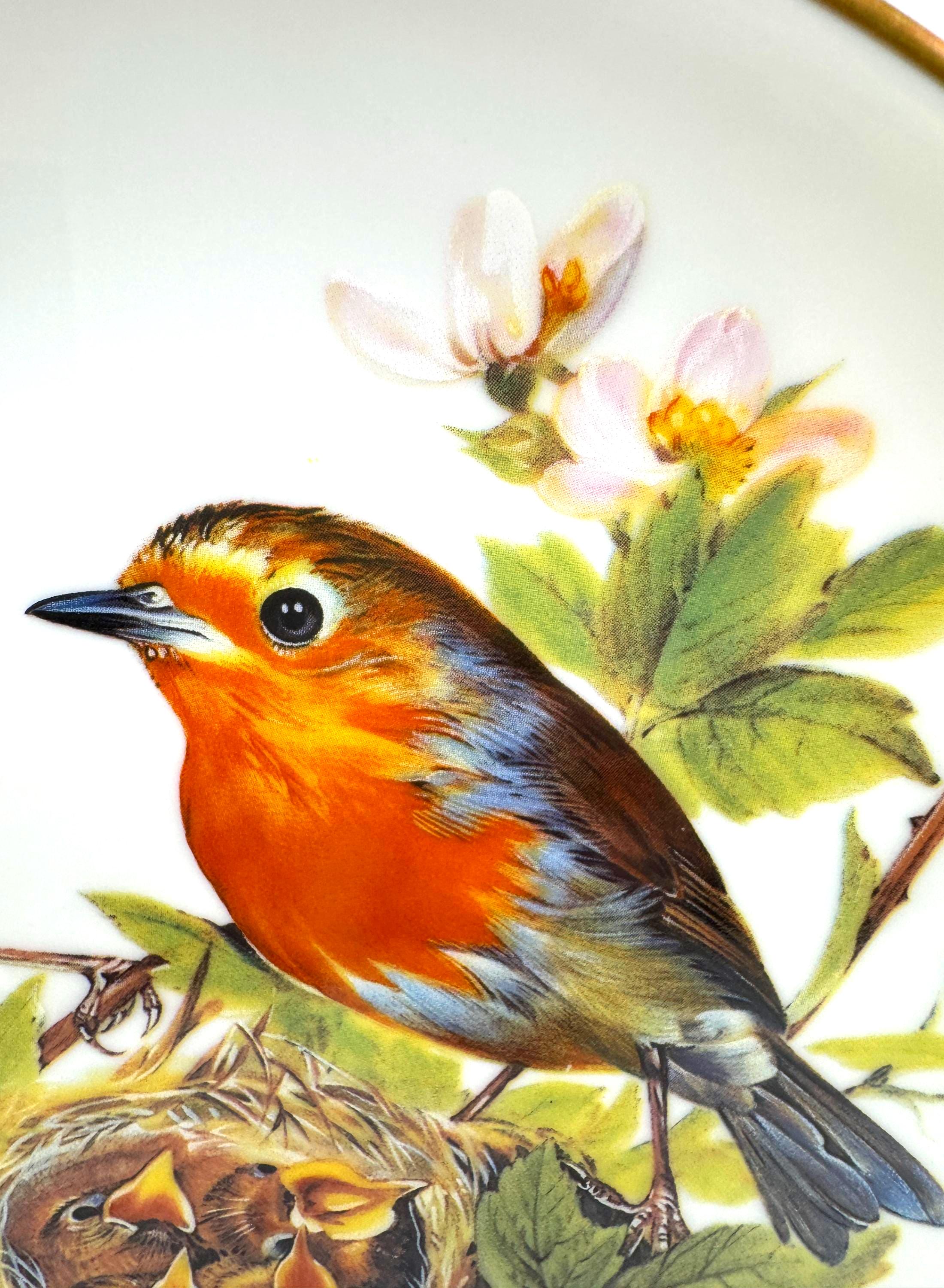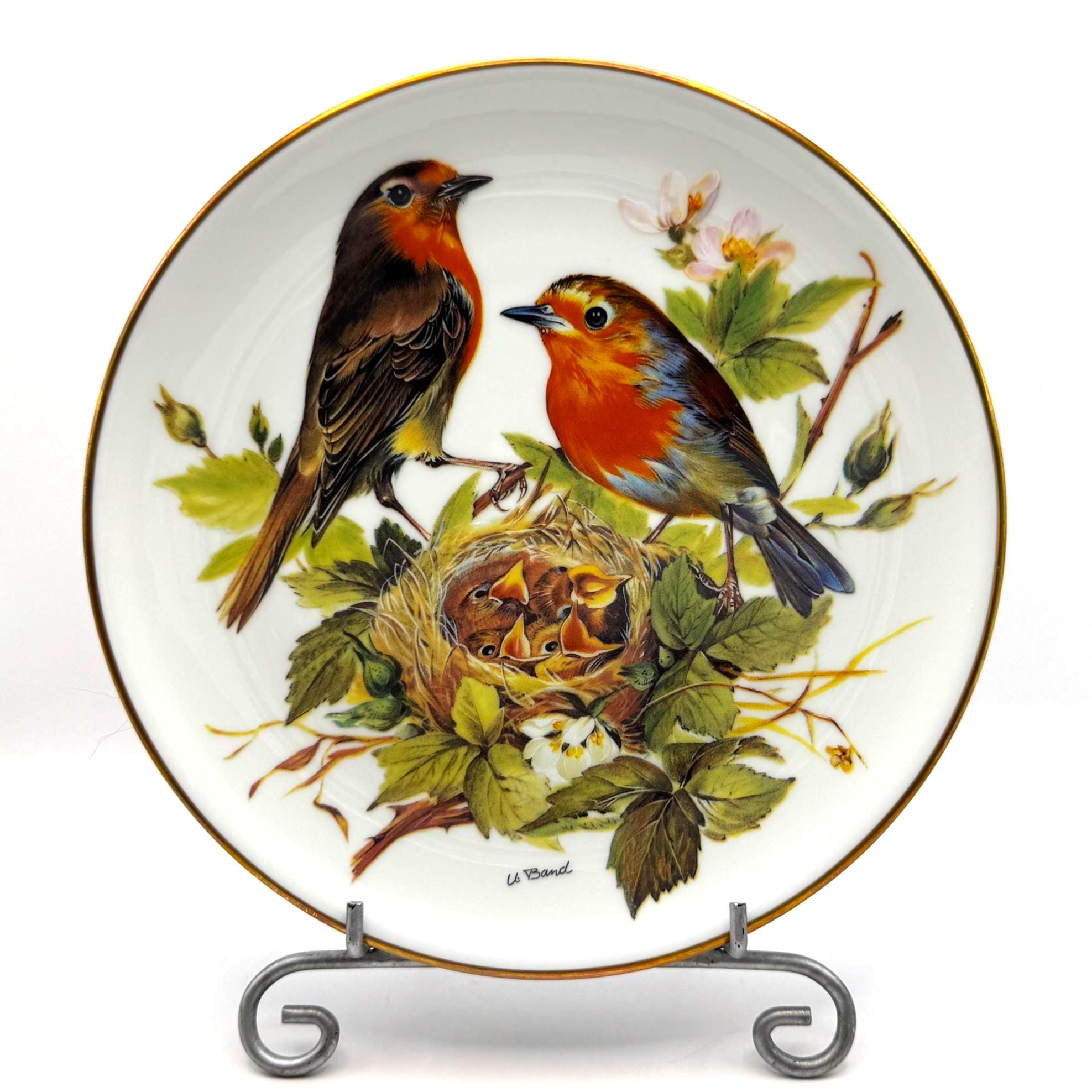 Beautifully illustrated by wildlife artist Ursula Band, this piece features two European Redbreasts tending their nest, portrayed with rich color, fine detail, and a hand-finished gold rim. A perfect display plate for bird lovers, vintage collectors, or anyone who enjoys nature-themed art.